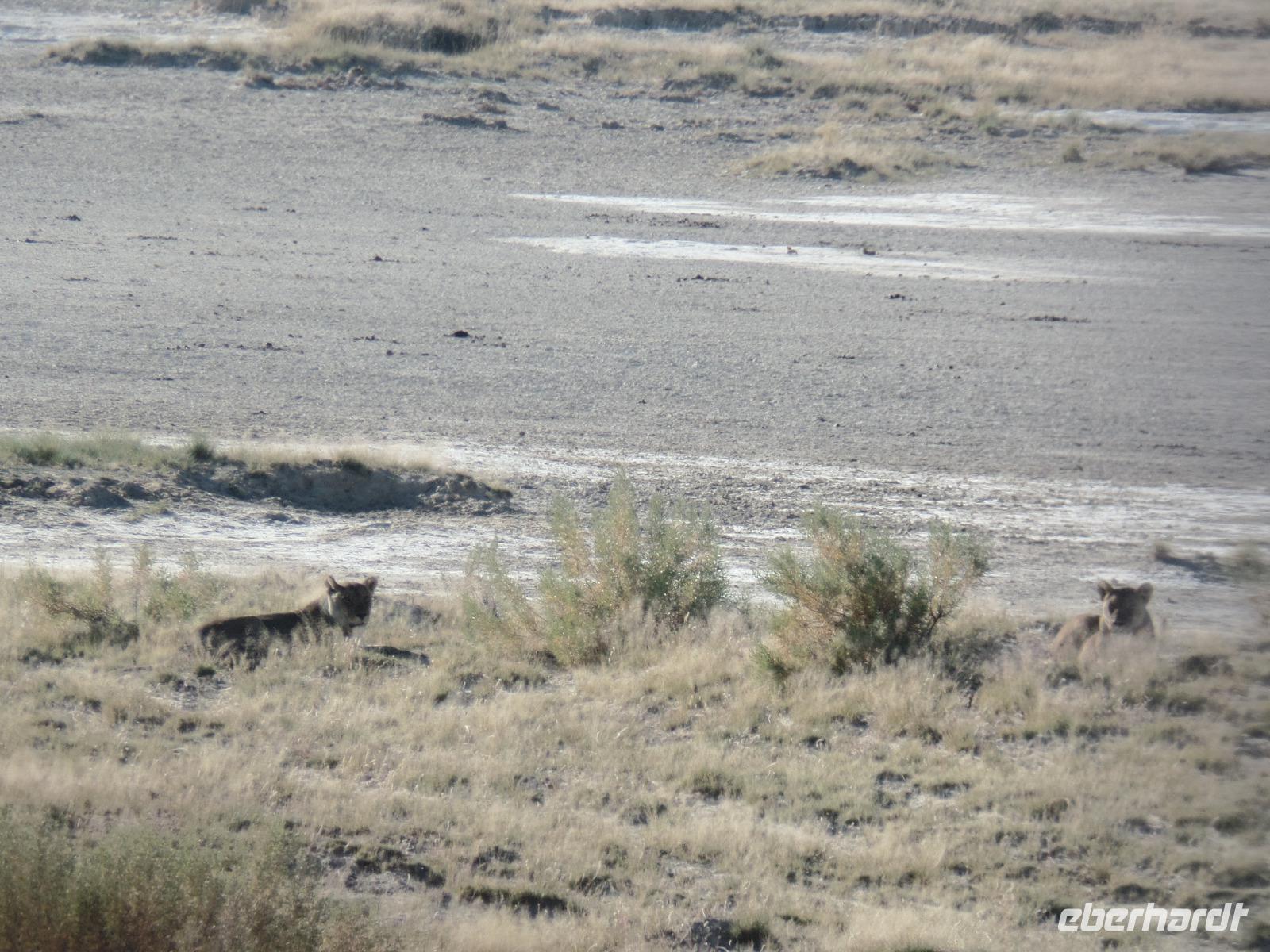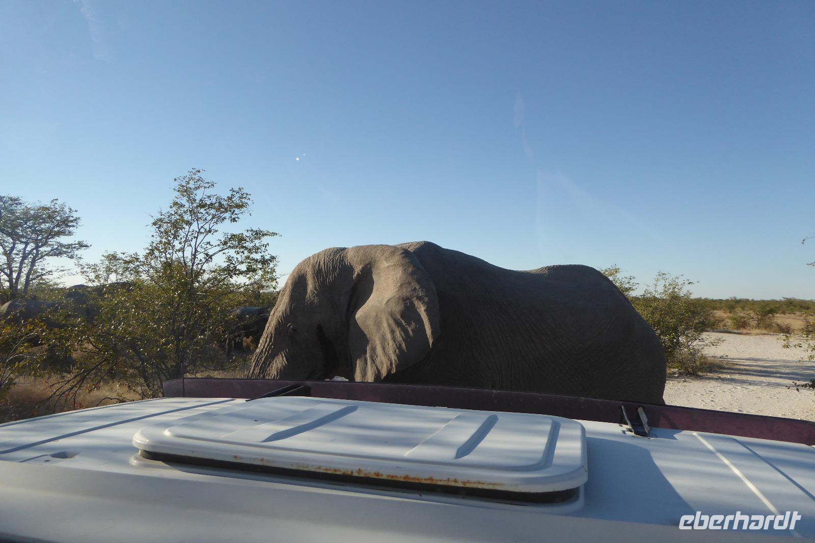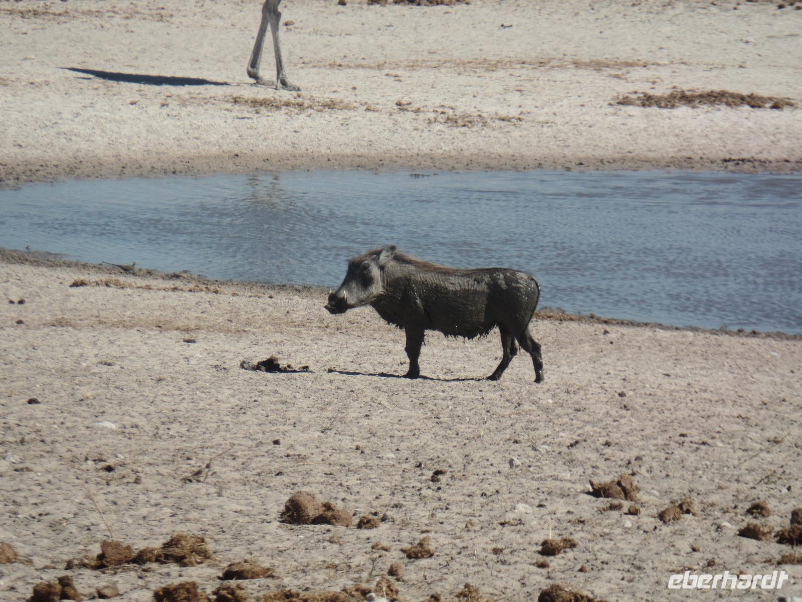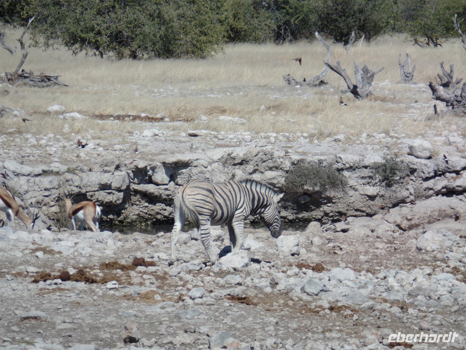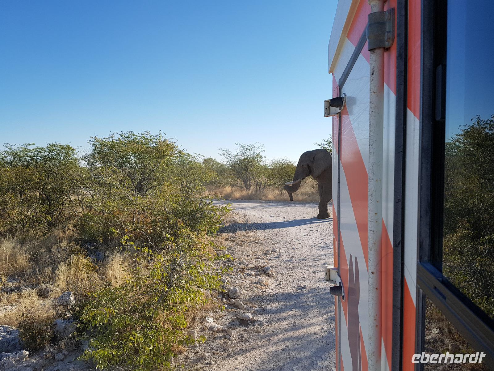 So wie gestern verbrachten wir die Mittagstunden beim gemütlichen Picknick in einem schattigen Camp direkt im Park. Hier konnte man sich was zum Essen bestellen oder zum Wasserloch laufen, um Tiere zu beobachten. Eberhardt Travel lud heute alle Gäste zum Eis ein. War eine gute Idee, oder? Am frühenNachmittag fuhren wir direkt am Rand von dem Herzstück des Parks, die 100 Kilometer lange Etosha-Pfanne. Eine große, weiße Fläche, wie der Name aus der Sansprache bedeutet, breitet sich ins Unendliche aus. Die weiße, nichtgreifbare Weite zieht uns alle magisch in ihren Bann.