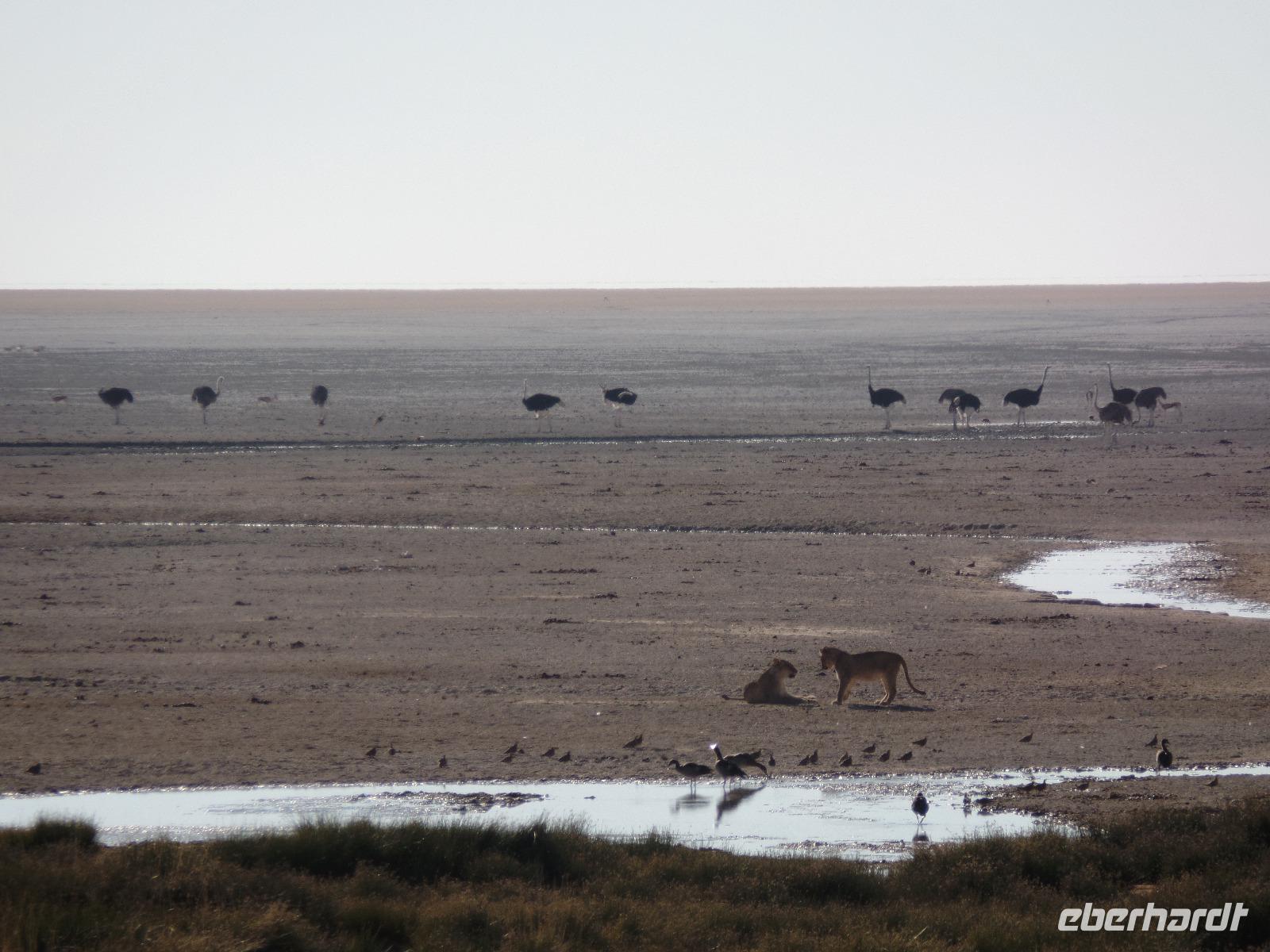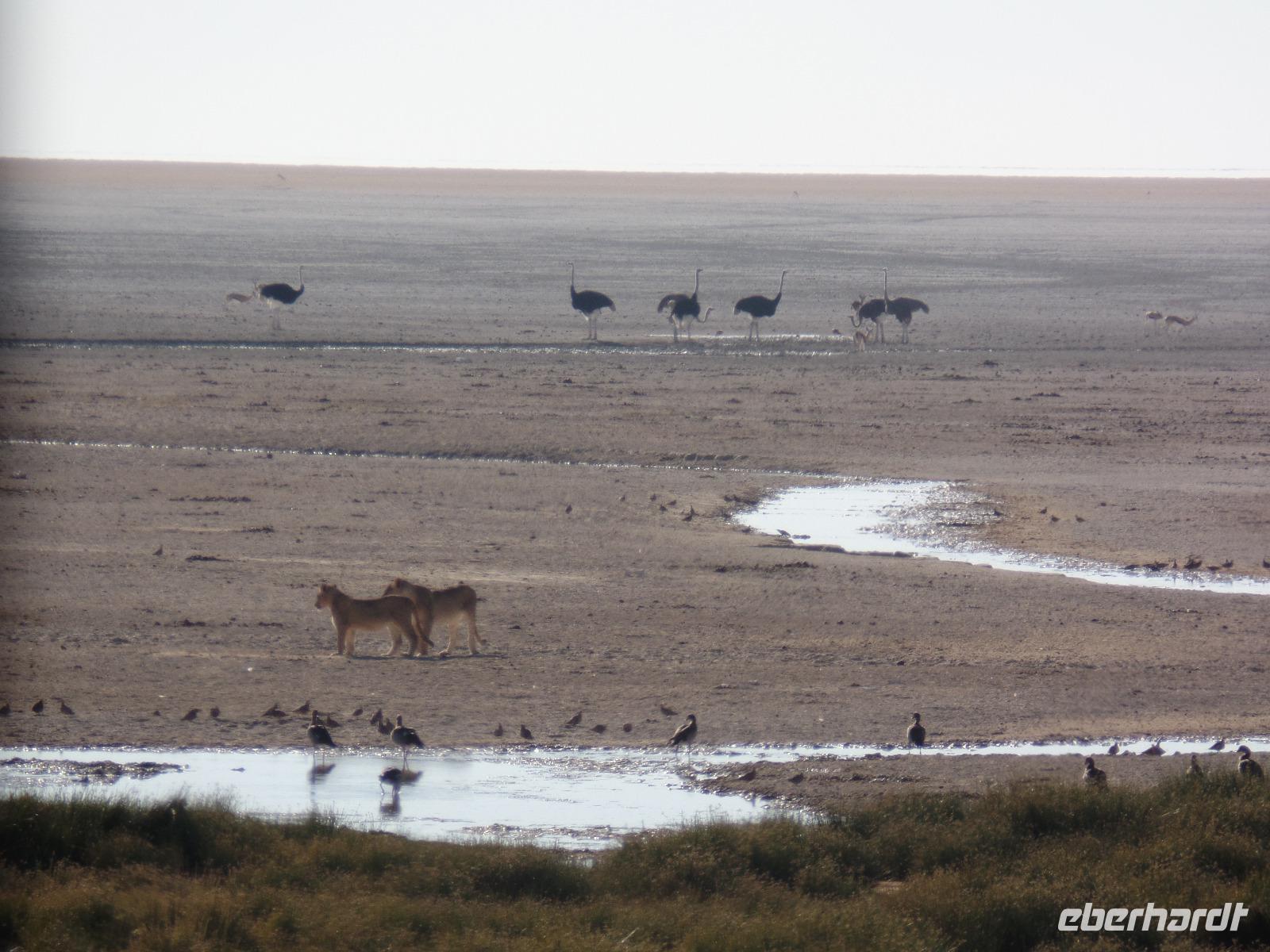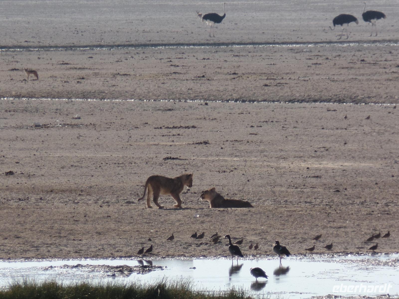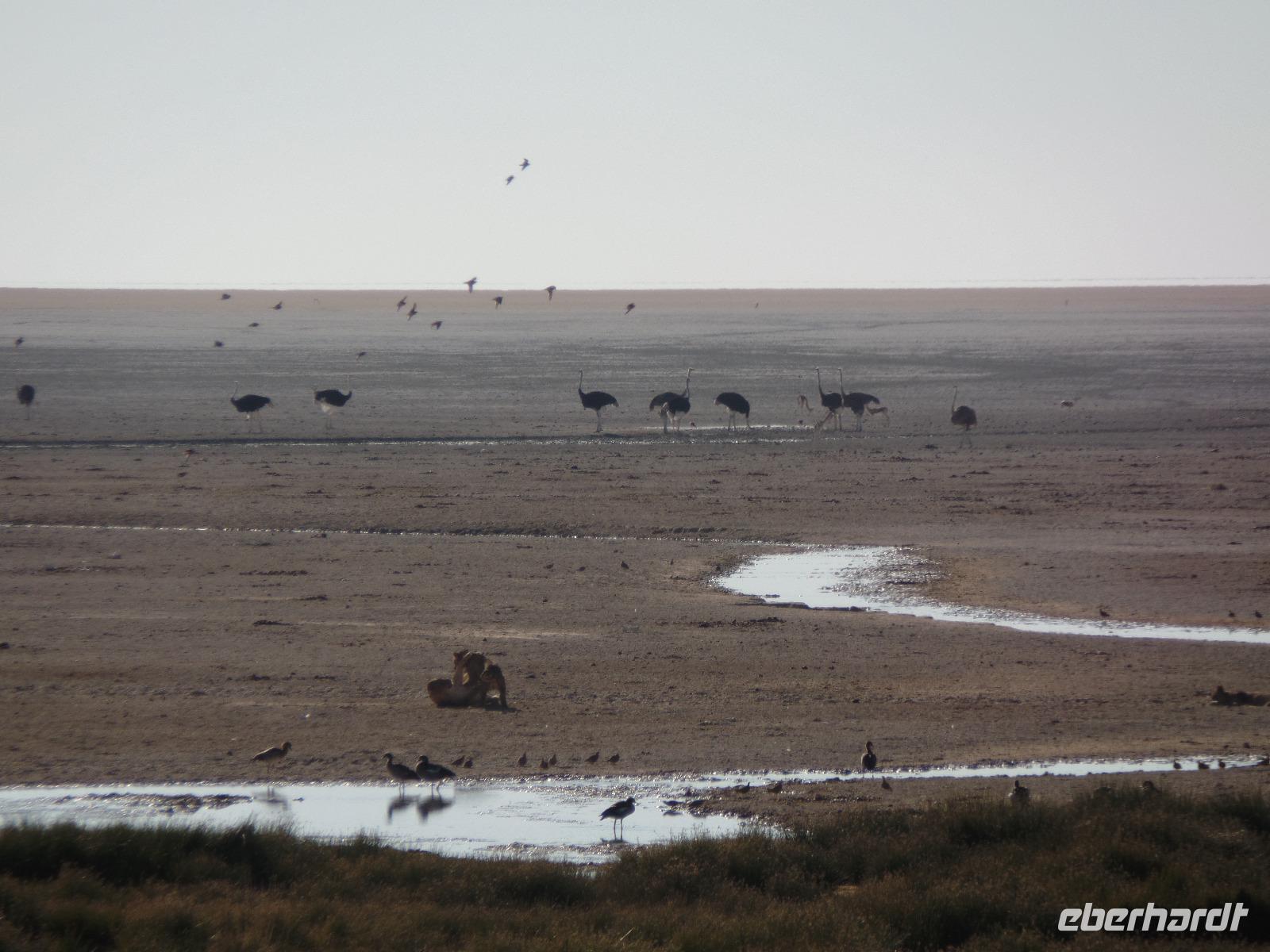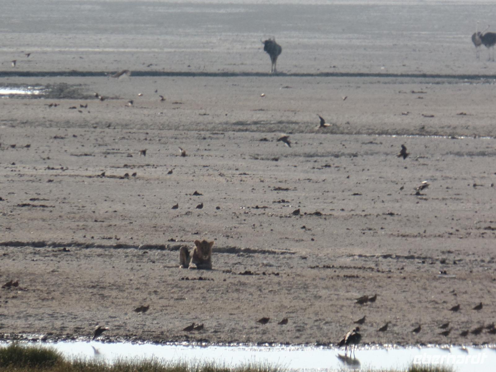 Ernst hat immer so ein Bauchgefühl und mit Hilfe auch von einer WhatsApp Gruppe wusste er manchmal, wo die besten Chancen waren und die Tiere sich aufhielten. Woran wir alle nicht glaubten war, dass wir Löwen begegnen. Doch sie waren da!! Für uns!! In Ruhe! König der Löwe!! Unsere Augen wollten es nicht glauben. Unfassbar, dass wir so etwas schönes erleben durften. Mit voller Dankbarkeit;) Wir konnten sie in Ruhe beobachten und die Zeit ging so langsam, dass wir eine Ewigkeit bei ihnen verbrachten. Es sind tolle Bilder entstanden Weiter fuhren wir zu einem Wasserloch wo ganz Afrika war. Ja, wirklich!! Wenn ich sage, ganz Afrika, meine ich: alle gemeinsam und friedlich die Giraffen, die Elefanten, die Onyx und Strauße, die Springböcke, Zebras, Gnus, der Schakal und 2 ganz lustige Warzenschweine. So friedlich müsste auch unsere Welt aussehen, wenn man die Nachrichten manchmal im Fernsehen sieht. Wunderschön!! Ab und zu kam auch ein Adler geflogen und so war die Natur in Ordnung. Und nicht nur Tiere sahen wir in Etosha, wie Elenantilope, Wasserbock. Kudu oder Schwarzgesicht-Impala wir sahen auch viele Vögel in den 2 Tagen: Sekretär, Schreiseeadler, Graureiher, Swainsonfrankolin sowie Riesentrappe und selbstverständlich den Strauß.