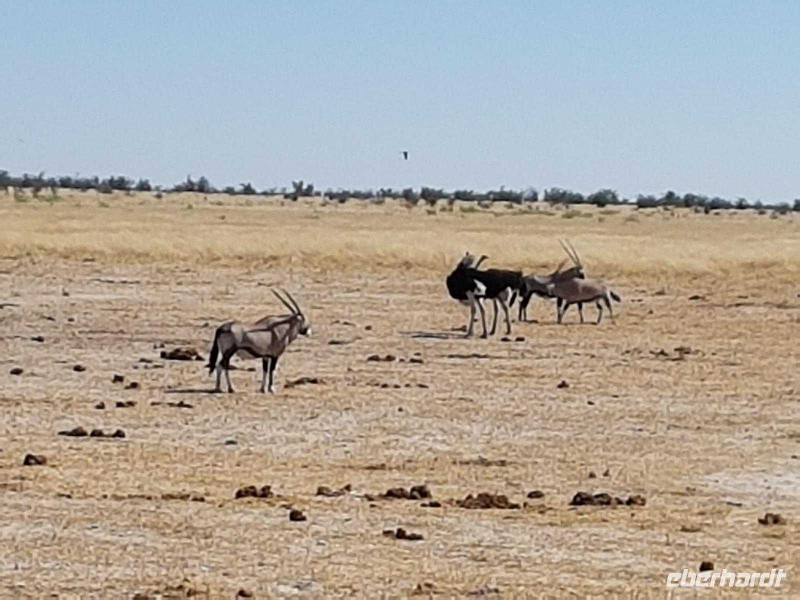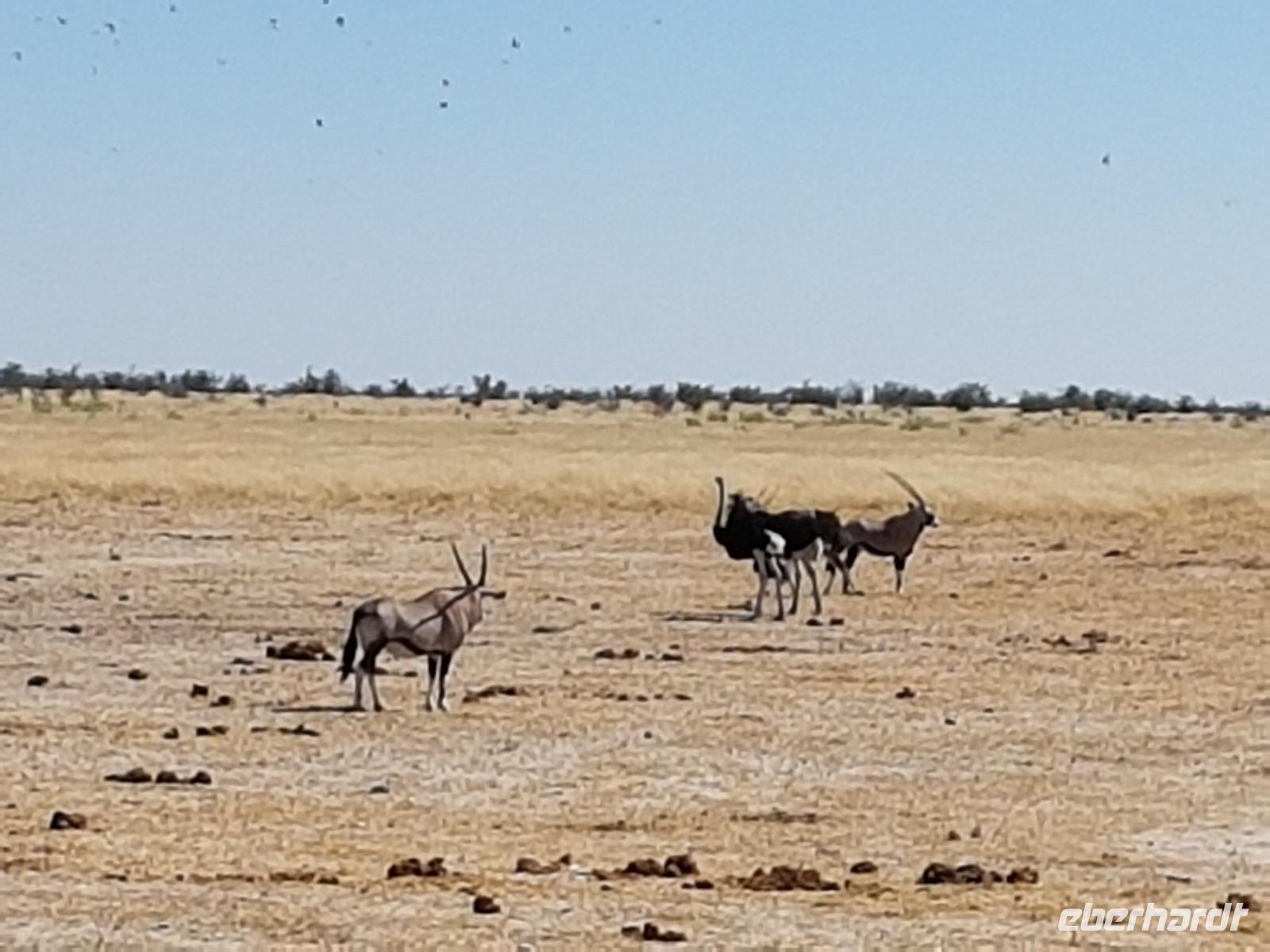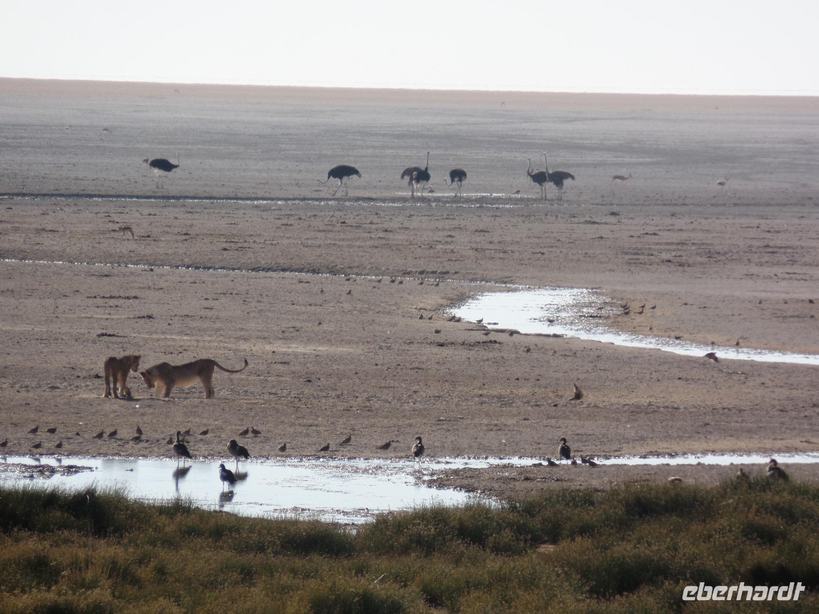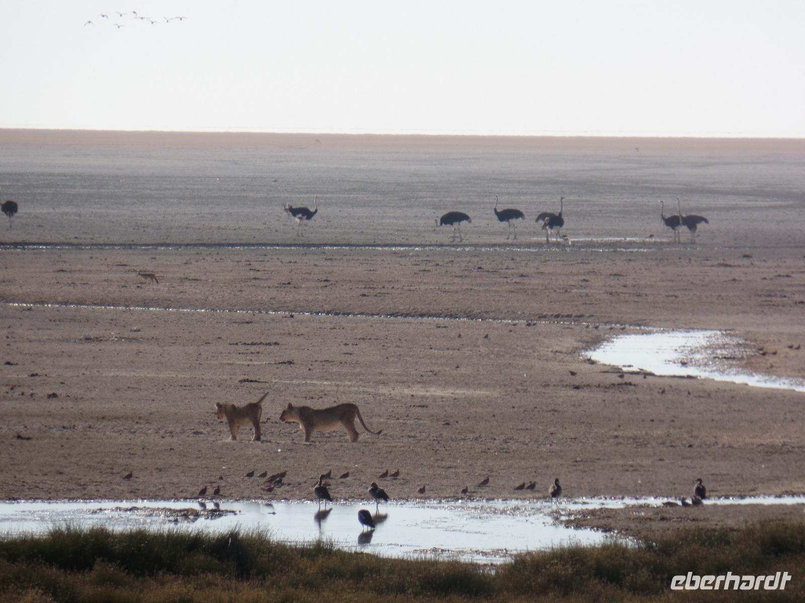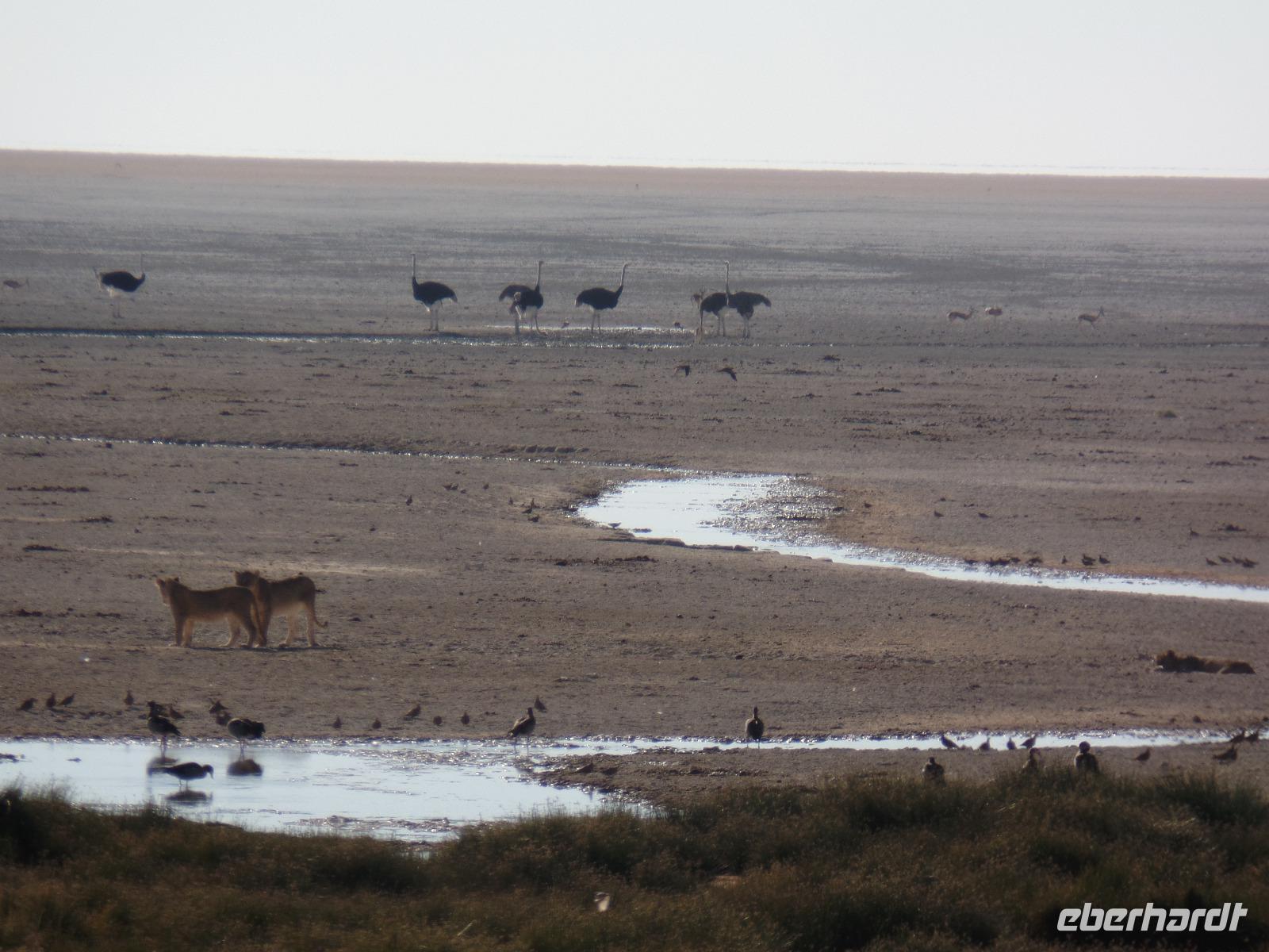 Ernst hat immer so ein Bauchgefühl und mit Hilfe auch von einer WhatsApp Gruppe wusste er manchmal, wo die besten Chancen waren und die Tiere sich aufhielten. Woran wir alle nicht glaubten war, dass wir Löwen begegnen. Doch sie waren da!! Für uns!! In Ruhe! König der Löwe!! Unsere Augen wollten es nicht glauben. Unfassbar, dass wir so etwas schönes erleben durften. Mit voller Dankbarkeit;) Wir konnten sie in Ruhe beobachten und die Zeit ging so langsam, dass wir eine Ewigkeit bei ihnen verbrachten. Es sind tolle Bilder entstanden Weiter fuhren wir zu einem Wasserloch wo ganz Afrika war. Ja, wirklich!! Wenn ich sage, ganz Afrika, meine ich: alle gemeinsam und friedlich die Giraffen, die Elefanten, die Onyx und Strauße, die Springböcke, Zebras, Gnus, der Schakal und 2 ganz lustige Warzenschweine. So friedlich müsste auch unsere Welt aussehen, wenn man die Nachrichten manchmal im Fernsehen sieht. Wunderschön!! Ab und zu kam auch ein Adler geflogen und so war die Natur in Ordnung. Und nicht nur Tiere sahen wir in Etosha, wie Elenantilope, Wasserbock. Kudu oder Schwarzgesicht-Impala wir sahen auch viele Vögel in den 2 Tagen: Sekretär, Schreiseeadler, Graureiher, Swainsonfrankolin sowie Riesentrappe und selbstverständlich den Strauß.