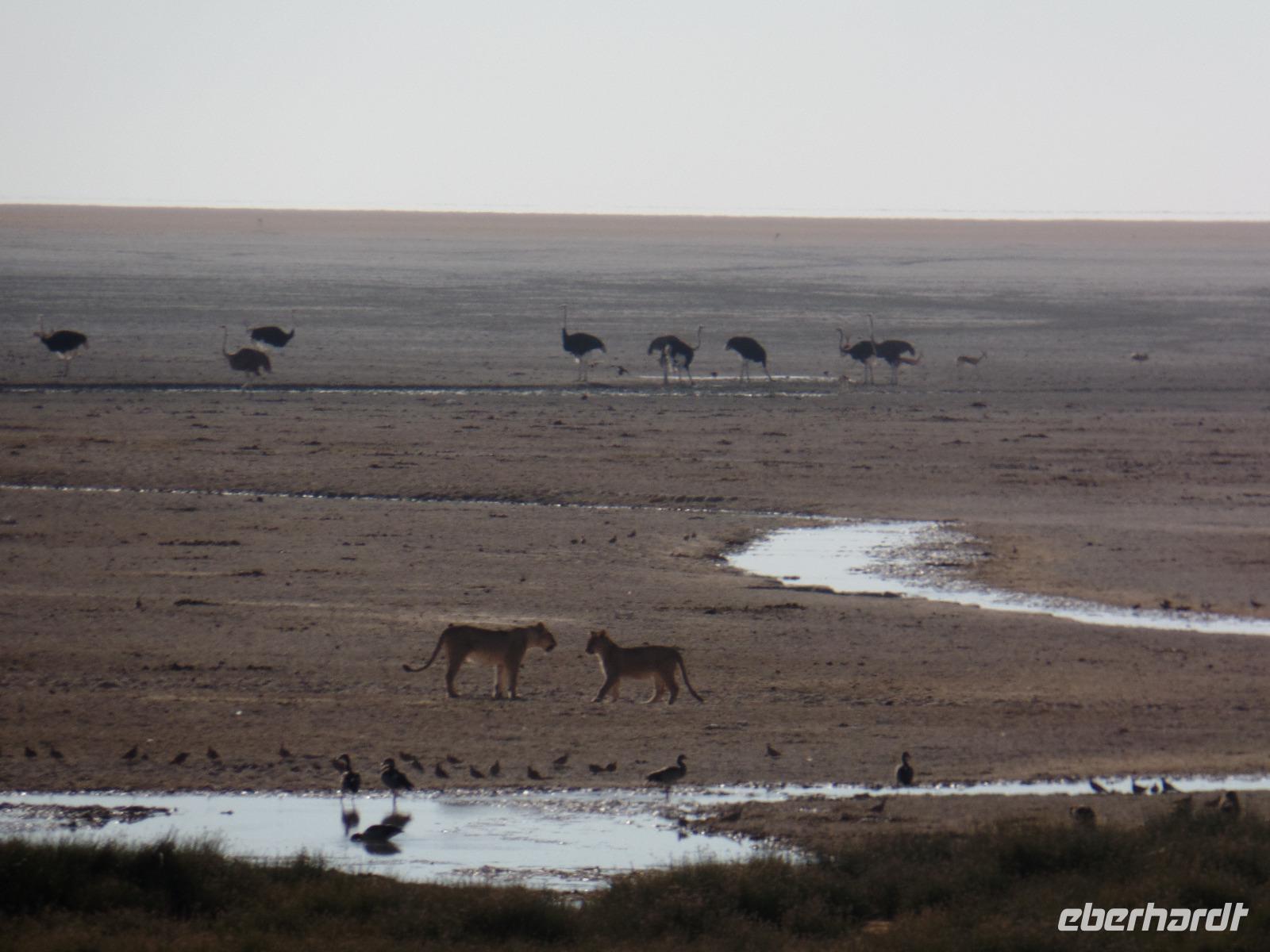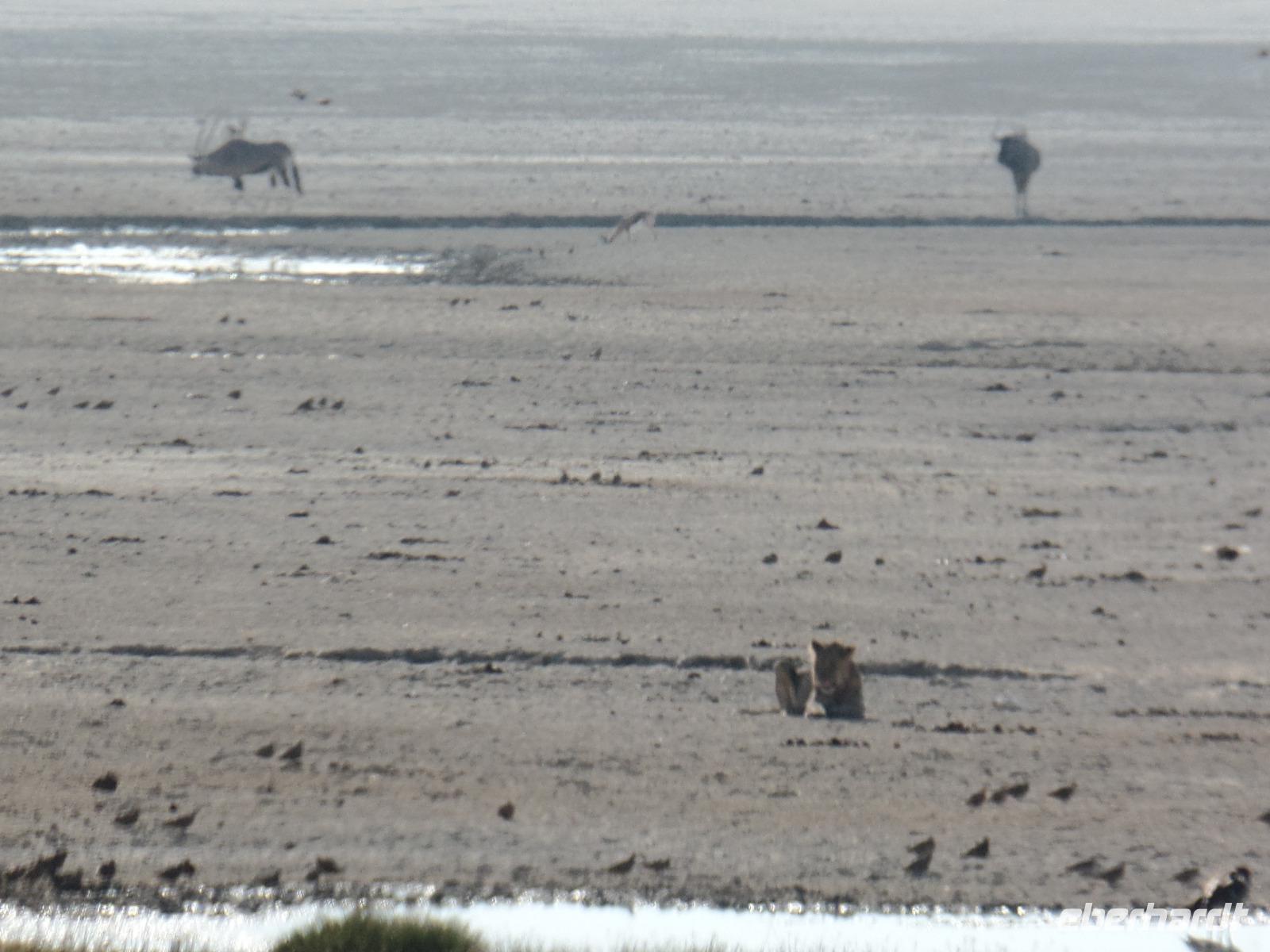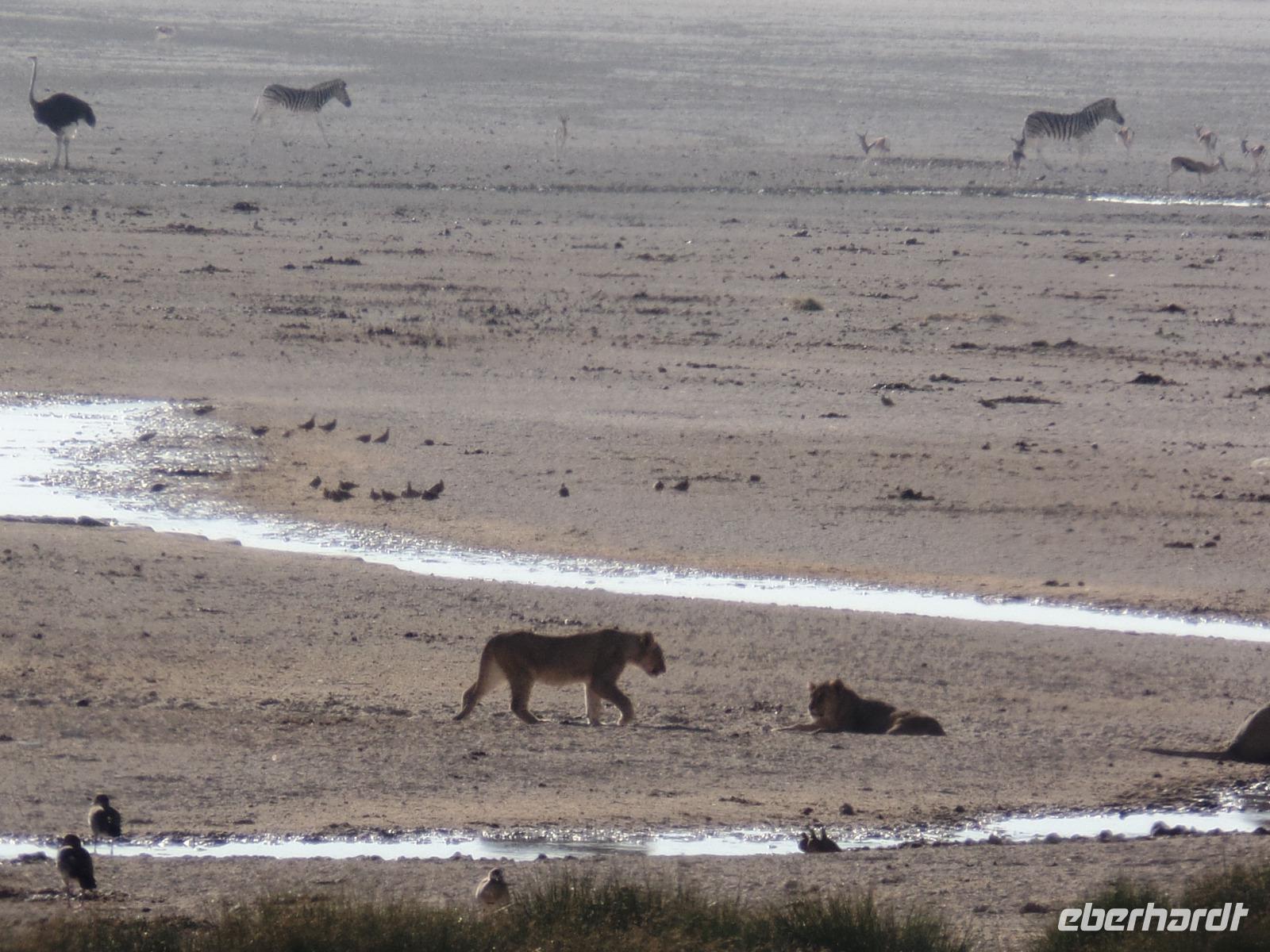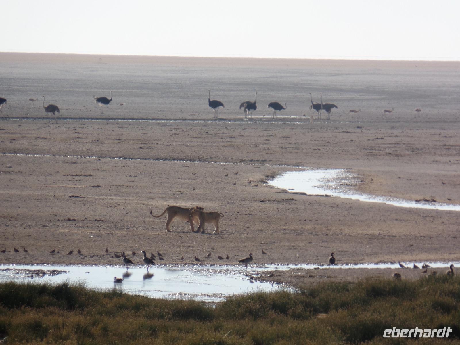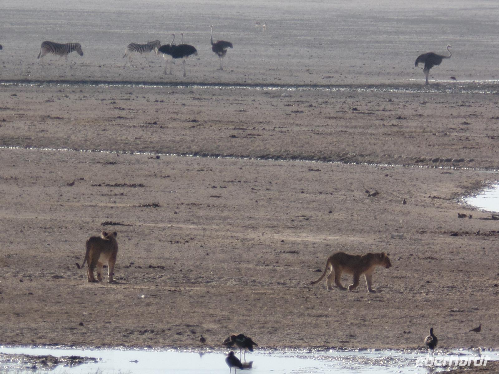 Ernst hat immer so ein Bauchgefühl und mit Hilfe auch von einer WhatsApp Gruppe wusste er manchmal, wo die besten Chancen waren und die Tiere sich aufhielten. Woran wir alle nicht glaubten war, dass wir Löwen begegnen. Doch sie waren da!! Für uns!! In Ruhe! König der Löwe!! Unsere Augen wollten es nicht glauben. Unfassbar, dass wir so etwas schönes erleben durften. Mit voller Dankbarkeit;) Wir konnten sie in Ruhe beobachten und die Zeit ging so langsam, dass wir eine Ewigkeit bei ihnen verbrachten. Es sind tolle Bilder entstanden Weiter fuhren wir zu einem Wasserloch wo ganz Afrika war. Ja, wirklich!! Wenn ich sage, ganz Afrika, meine ich: alle gemeinsam und friedlich die Giraffen, die Elefanten, die Onyx und Strauße, die Springböcke, Zebras, Gnus, der Schakal und 2 ganz lustige Warzenschweine. So friedlich müsste auch unsere Welt aussehen, wenn man die Nachrichten manchmal im Fernsehen sieht. Wunderschön!! Ab und zu kam auch ein Adler geflogen und so war die Natur in Ordnung. Und nicht nur Tiere sahen wir in Etosha, wie Elenantilope, Wasserbock. Kudu oder Schwarzgesicht-Impala wir sahen auch viele Vögel in den 2 Tagen: Sekretär, Schreiseeadler, Graureiher, Swainsonfrankolin sowie Riesentrappe und selbstverständlich den Strauß.