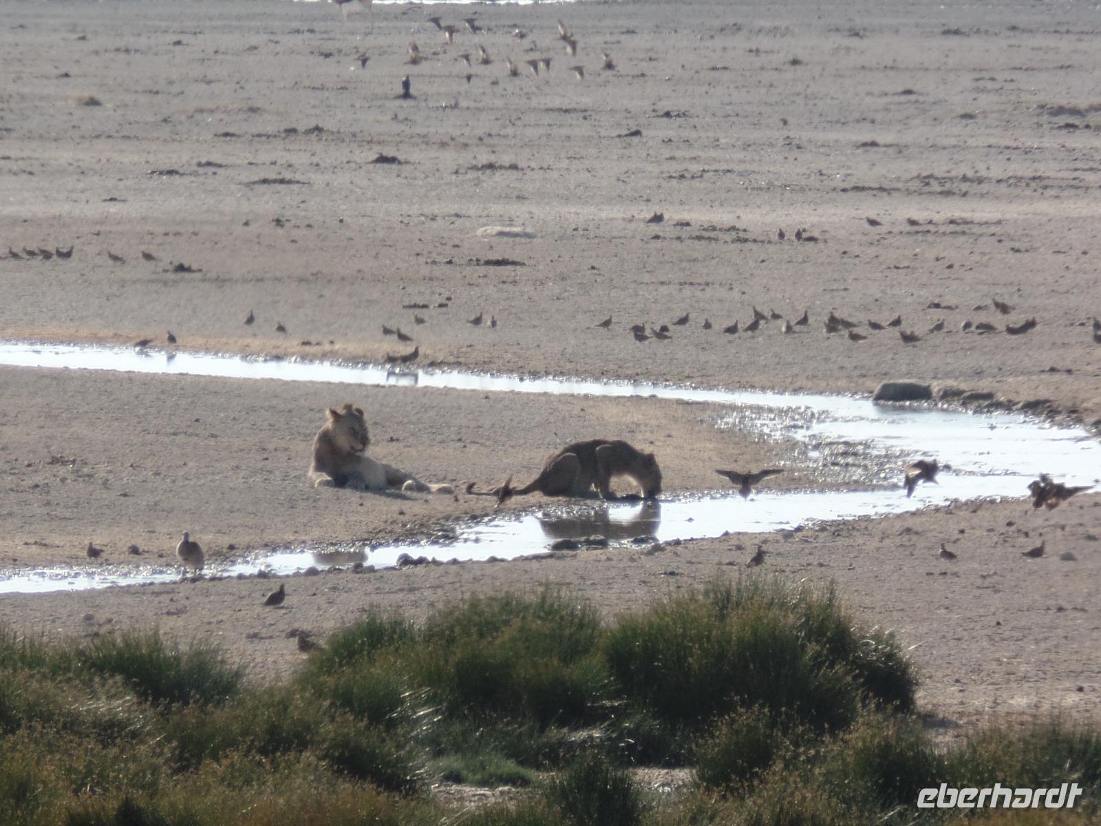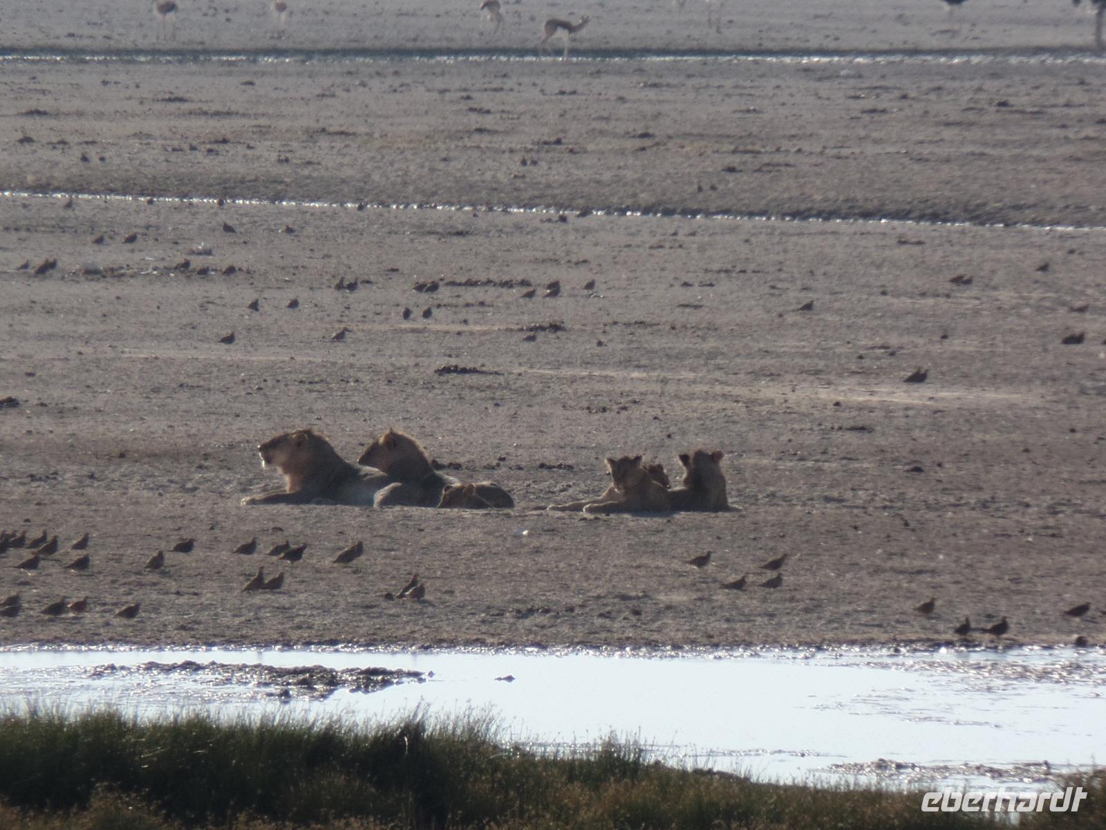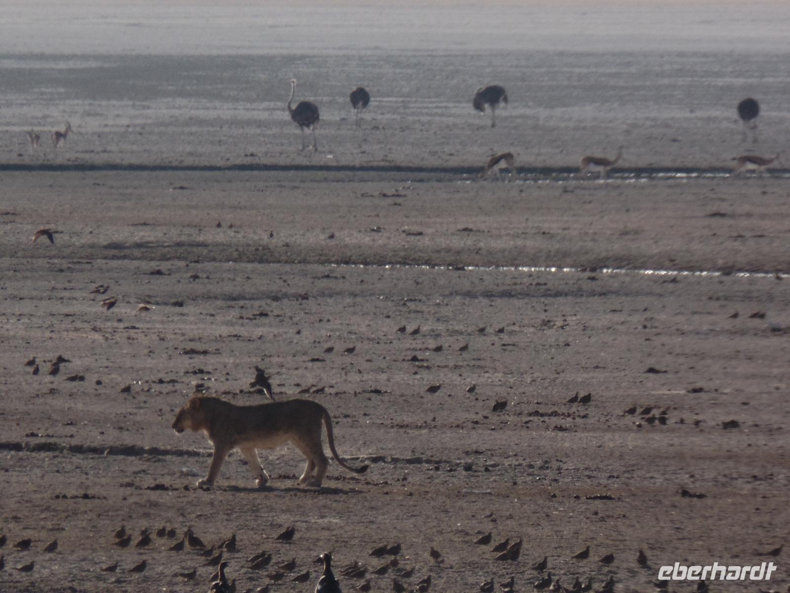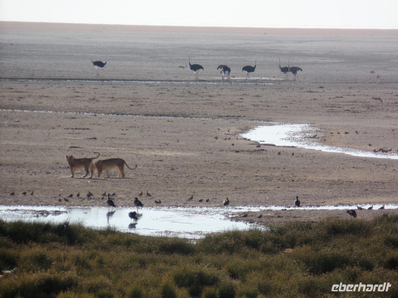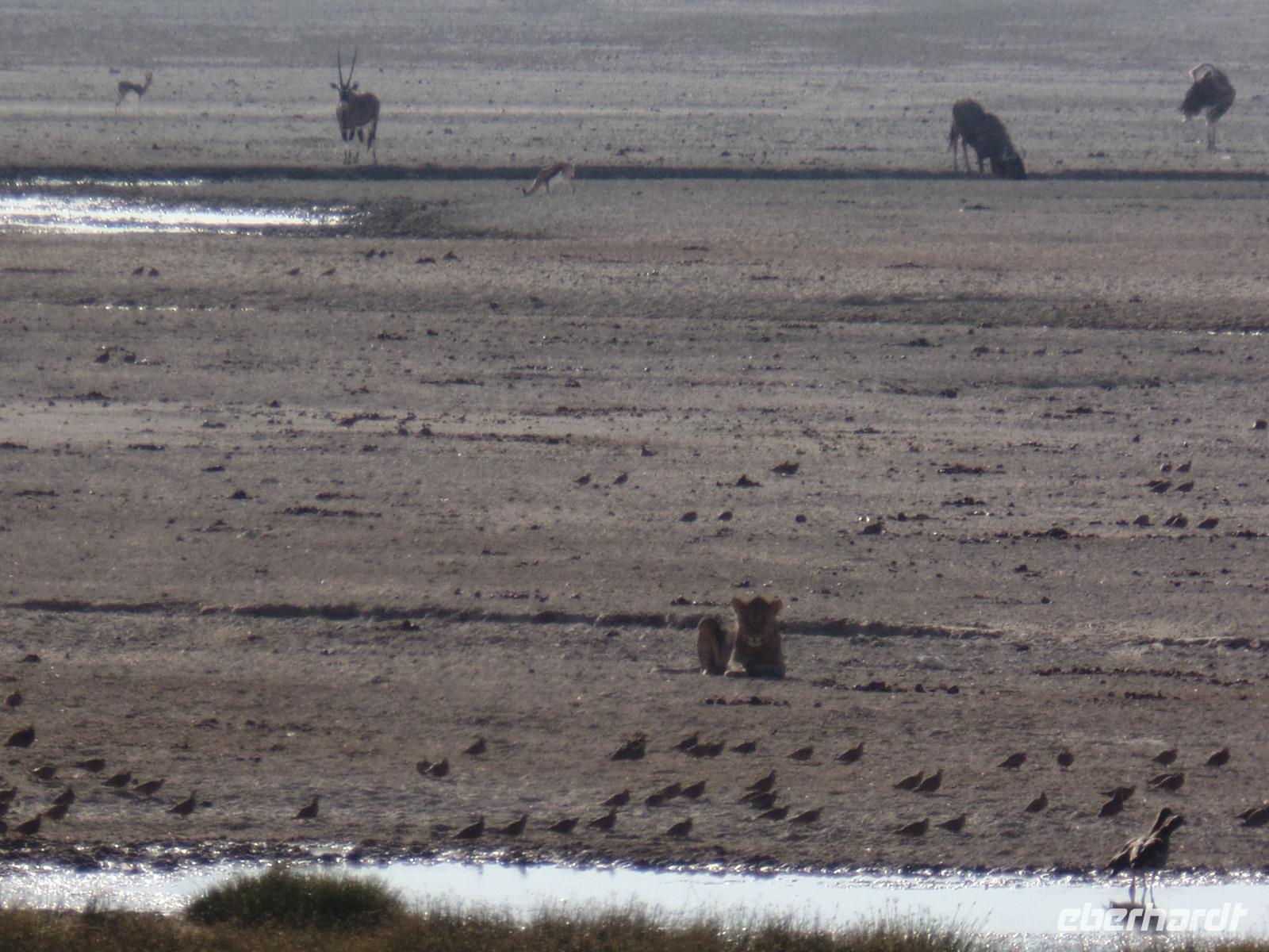 Ernst hat immer so ein Bauchgefühl und mit Hilfe auch von einer WhatsApp Gruppe wusste er manchmal, wo die besten Chancen waren und die Tiere sich aufhielten. Woran wir alle nicht glaubten war, dass wir Löwen begegnen. Doch sie waren da!! Für uns!! In Ruhe! König der Löwe!! Unsere Augen wollten es nicht glauben. Unfassbar, dass wir so etwas schönes erleben durften. Mit voller Dankbarkeit;) Wir konnten sie in Ruhe beobachten und die Zeit ging so langsam, dass wir eine Ewigkeit bei ihnen verbrachten. Es sind tolle Bilder entstanden Weiter fuhren wir zu einem Wasserloch wo ganz Afrika war. Ja, wirklich!! Wenn ich sage, ganz Afrika, meine ich: alle gemeinsam und friedlich die Giraffen, die Elefanten, die Onyx und Strauße, die Springböcke, Zebras, Gnus, der Schakal und 2 ganz lustige Warzenschweine. So friedlich müsste auch unsere Welt aussehen, wenn man die Nachrichten manchmal im Fernsehen sieht. Wunderschön!! Ab und zu kam auch ein Adler geflogen und so war die Natur in Ordnung. Und nicht nur Tiere sahen wir in Etosha, wie Elenantilope, Wasserbock. Kudu oder Schwarzgesicht-Impala wir sahen auch viele Vögel in den 2 Tagen: Sekretär, Schreiseeadler, Graureiher, Swainsonfrankolin sowie Riesentrappe und selbstverständlich den Strauß.