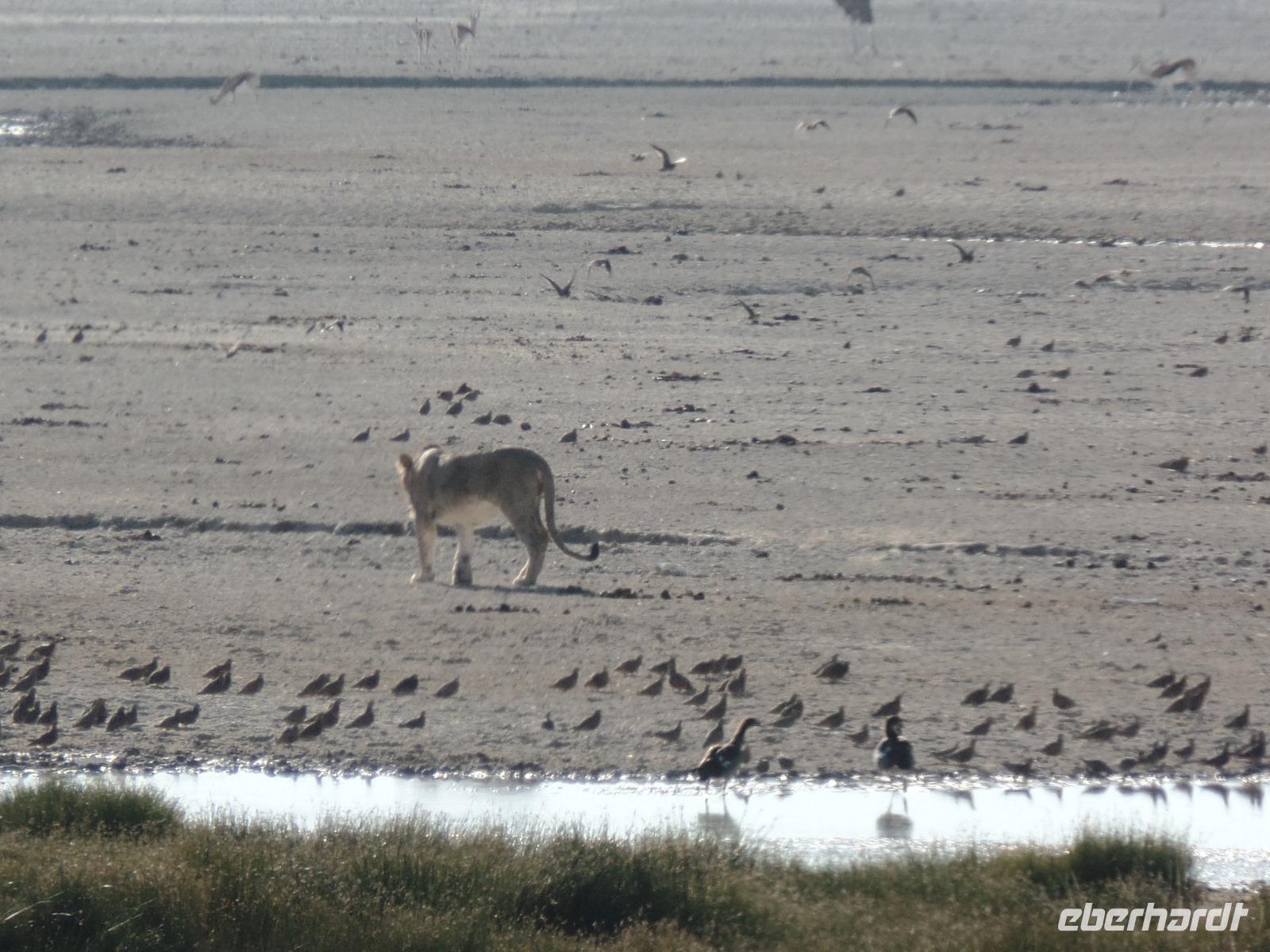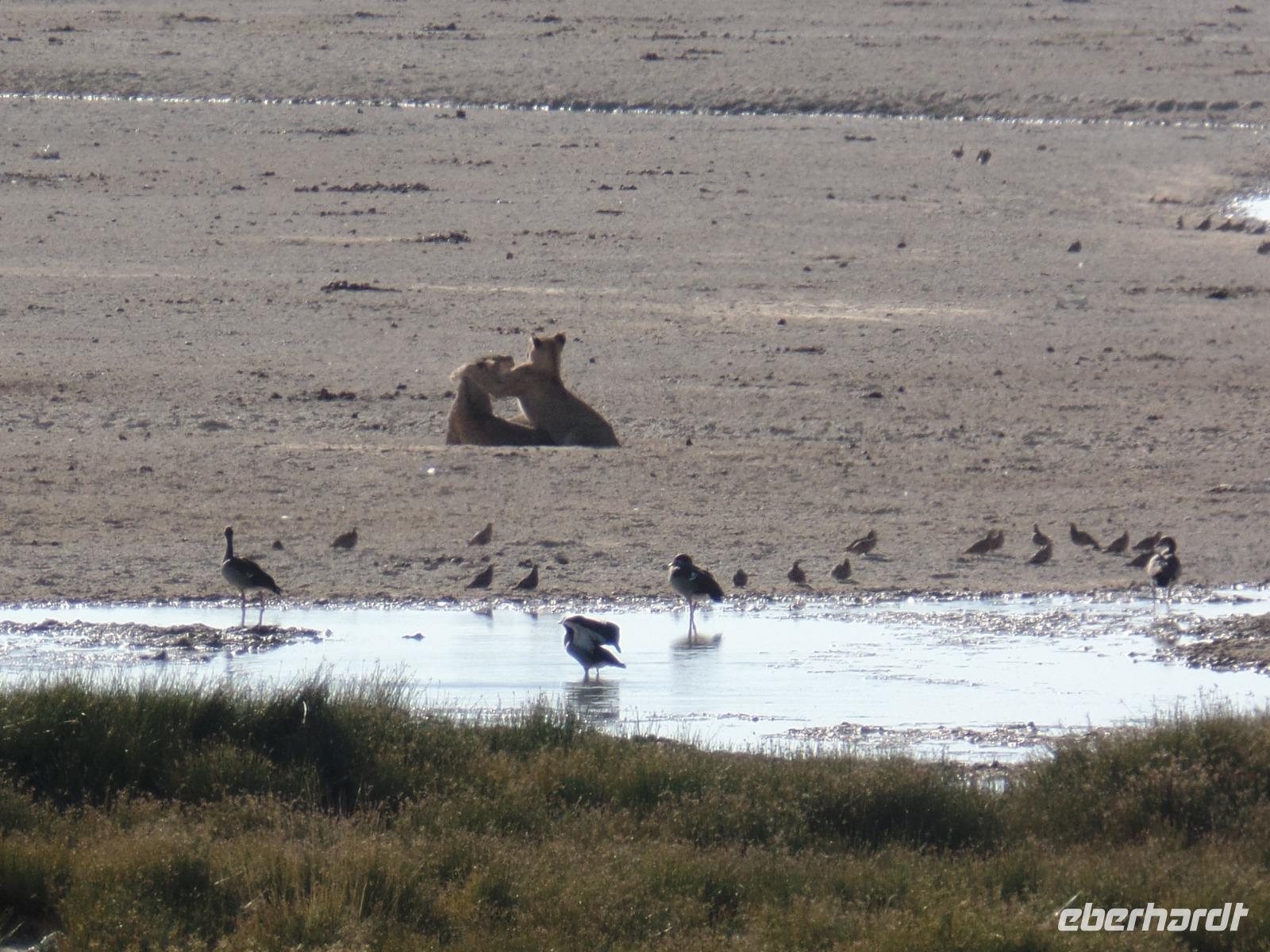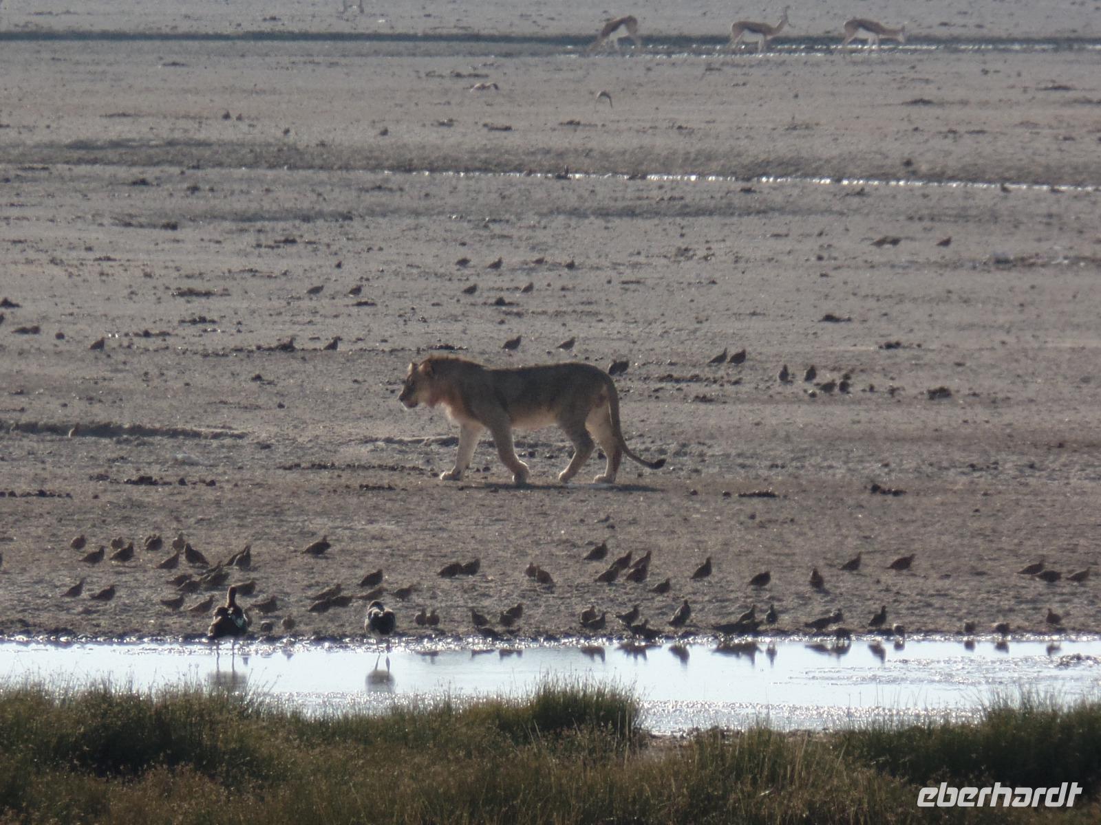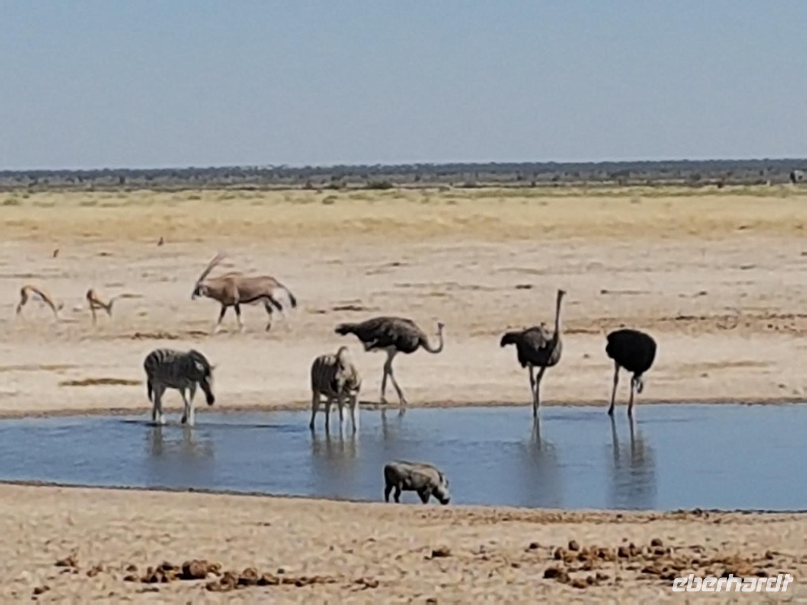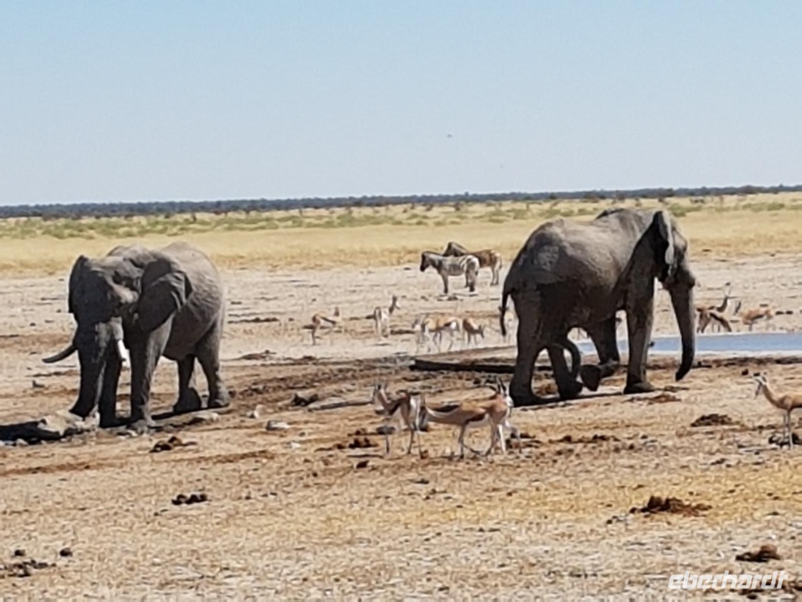 Ernst hat immer so ein Bauchgefühl und mit Hilfe auch von einer WhatsApp Gruppe wusste er manchmal, wo die besten Chancen waren und die Tiere sich aufhielten. Woran wir alle nicht glaubten war, dass wir Löwen begegnen. Doch sie waren da!! Für uns!! In Ruhe! König der Löwe!! Unsere Augen wollten es nicht glauben. Unfassbar, dass wir so etwas schönes erleben durften. Mit voller Dankbarkeit;) Wir konnten sie in Ruhe beobachten und die Zeit ging so langsam, dass wir eine Ewigkeit bei ihnen verbrachten. Es sind tolle Bilder entstanden Weiter fuhren wir zu einem Wasserloch wo ganz Afrika war. Ja, wirklich!! Wenn ich sage, ganz Afrika, meine ich: alle gemeinsam und friedlich die Giraffen, die Elefanten, die Onyx und Strauße, die Springböcke, Zebras, Gnus, der Schakal und 2 ganz lustige Warzenschweine. So friedlich müsste auch unsere Welt aussehen, wenn man die Nachrichten manchmal im Fernsehen sieht. Wunderschön!! Ab und zu kam auch ein Adler geflogen und so war die Natur in Ordnung. Und nicht nur Tiere sahen wir in Etosha, wie Elenantilope, Wasserbock. Kudu oder Schwarzgesicht-Impala wir sahen auch viele Vögel in den 2 Tagen: Sekretär, Schreiseeadler, Graureiher, Swainsonfrankolin sowie Riesentrappe und selbstverständlich den Strauß.
