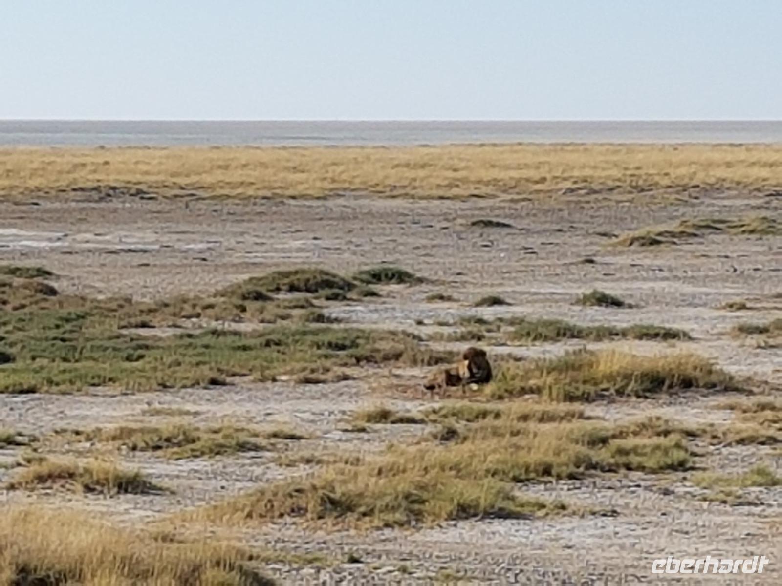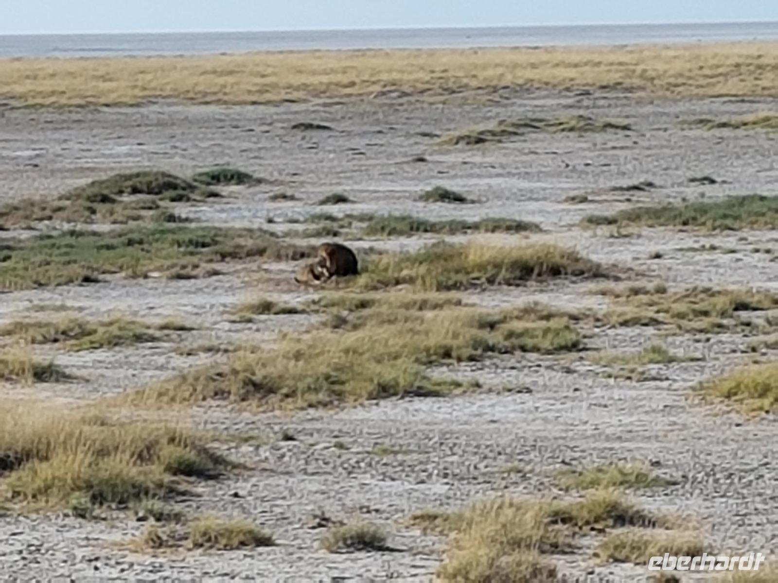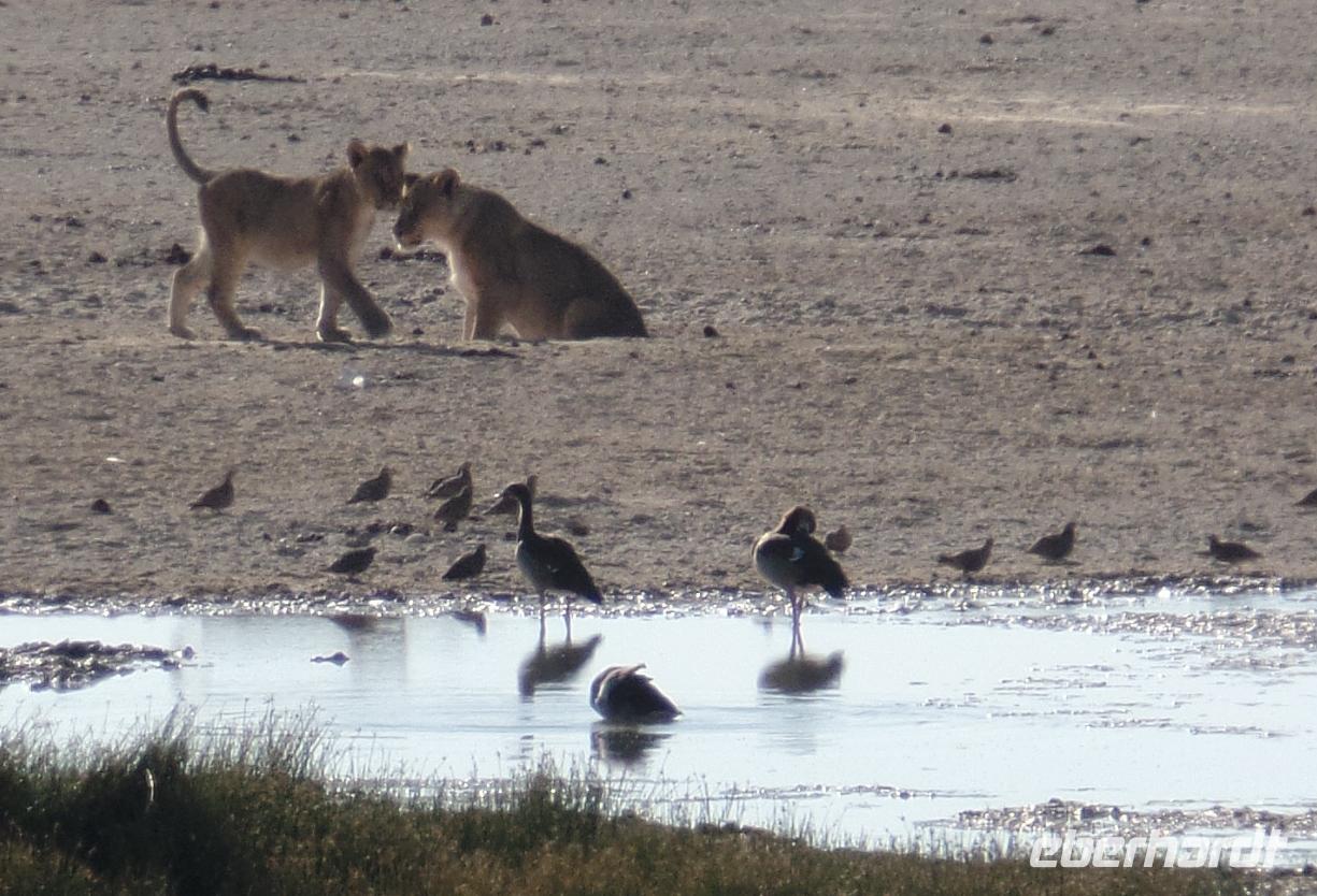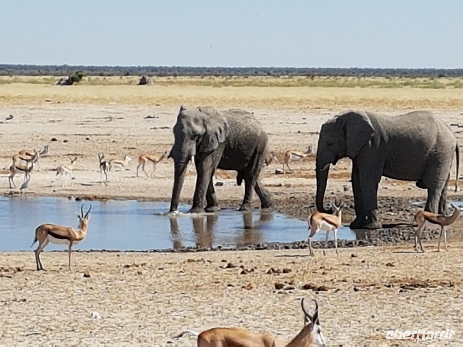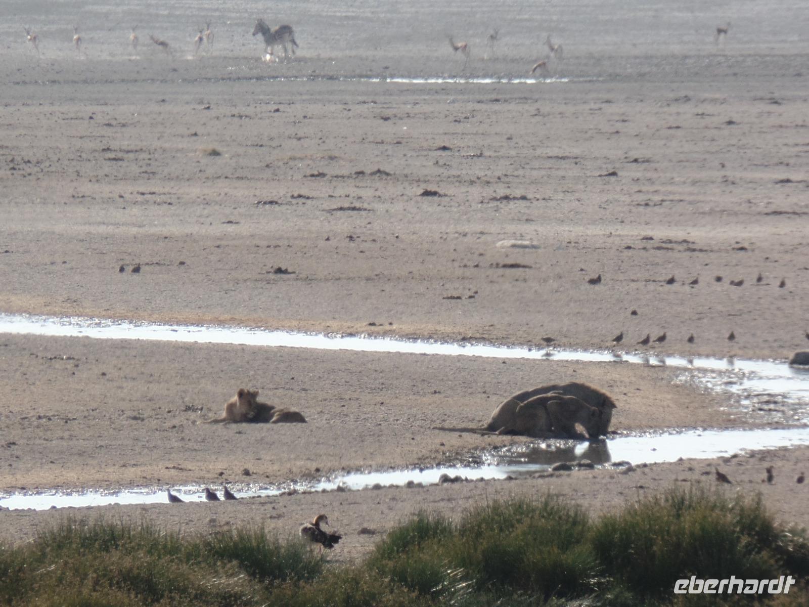 Ernst hat immer so ein Bauchgefühl und mit Hilfe auch von einer WhatsApp Gruppe wusste er manchmal, wo die besten Chancen waren und die Tiere sich aufhielten. Woran wir alle nicht glaubten war, dass wir Löwen begegnen. Doch sie waren da!! Für uns!! In Ruhe! König der Löwe!! Unsere Augen wollten es nicht glauben. Unfassbar, dass wir so etwas schönes erleben durften. Mit voller Dankbarkeit;) Wir konnten sie in Ruhe beobachten und die Zeit ging so langsam, dass wir eine Ewigkeit bei ihnen verbrachten. Es sind tolle Bilder entstanden Weiter fuhren wir zu einem Wasserloch wo ganz Afrika war. Ja, wirklich!! Wenn ich sage, ganz Afrika, meine ich: alle gemeinsam und friedlich die Giraffen, die Elefanten, die Onyx und Strauße, die Springböcke, Zebras, Gnus, der Schakal und 2 ganz lustige Warzenschweine. So friedlich müsste auch unsere Welt aussehen, wenn man die Nachrichten manchmal im Fernsehen sieht. Wunderschön!! Ab und zu kam auch ein Adler geflogen und so war die Natur in Ordnung. Und nicht nur Tiere sahen wir in Etosha, wie Elenantilope, Wasserbock. Kudu oder Schwarzgesicht-Impala wir sahen auch viele Vögel in den 2 Tagen: Sekretär, Schreiseeadler, Graureiher, Swainsonfrankolin sowie Riesentrappe und selbstverständlich den Strauß.