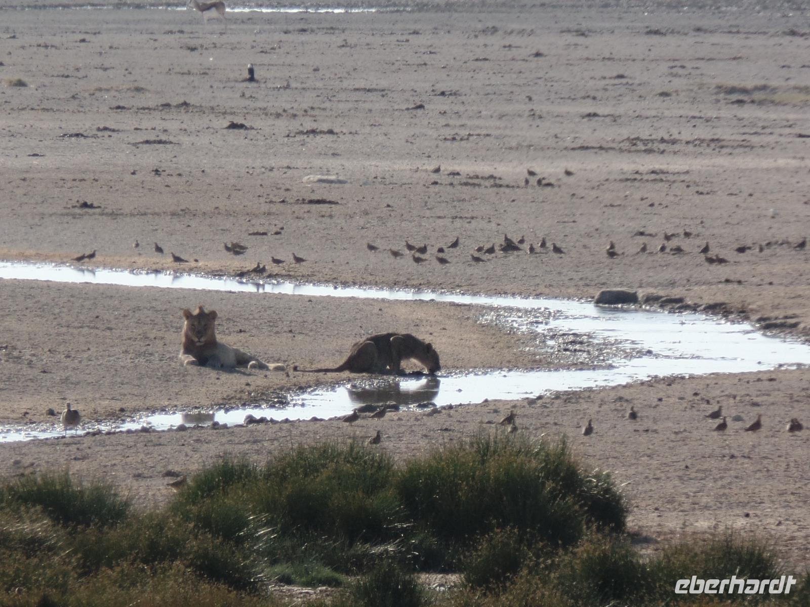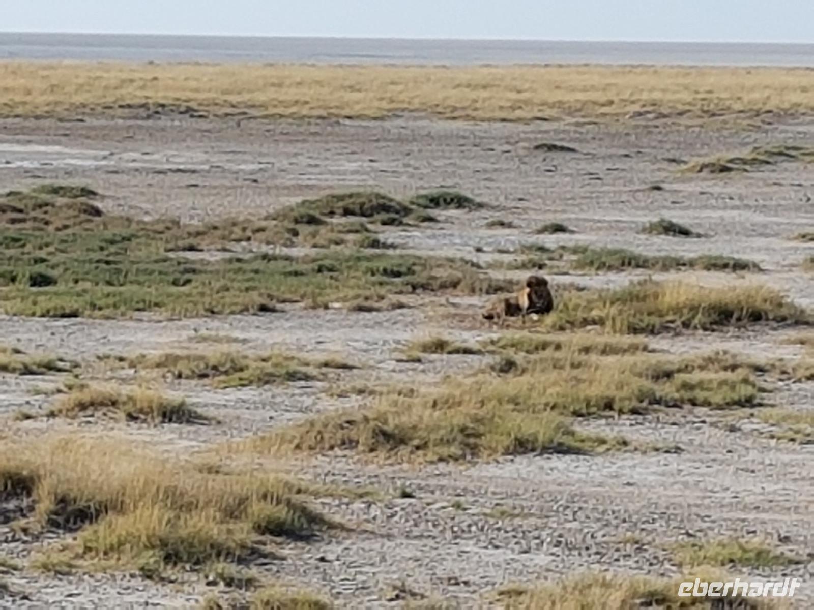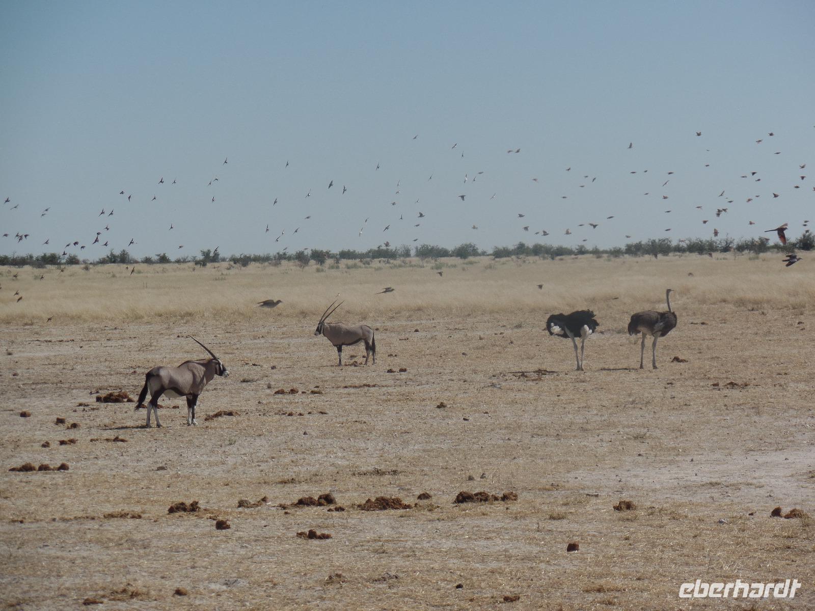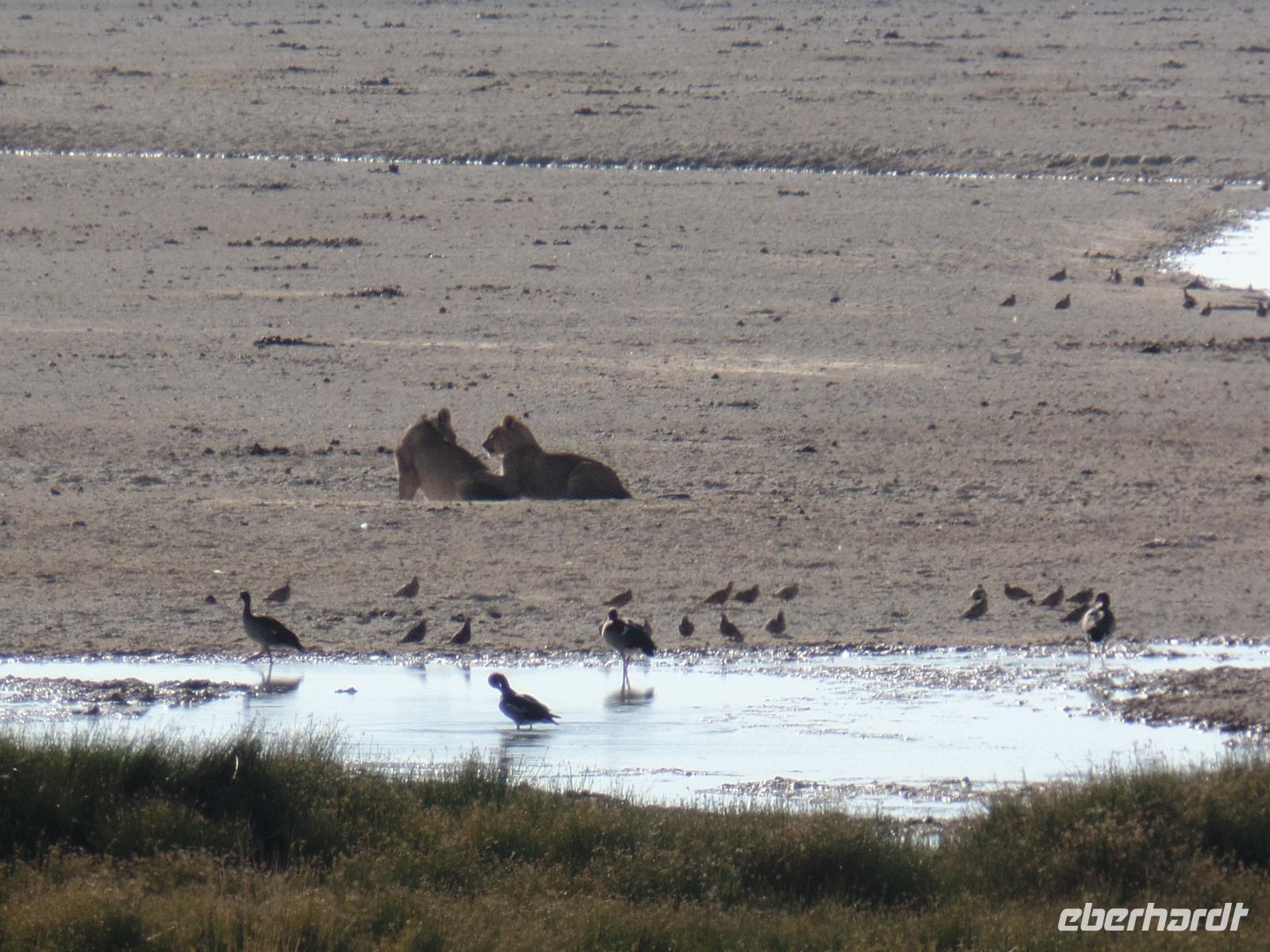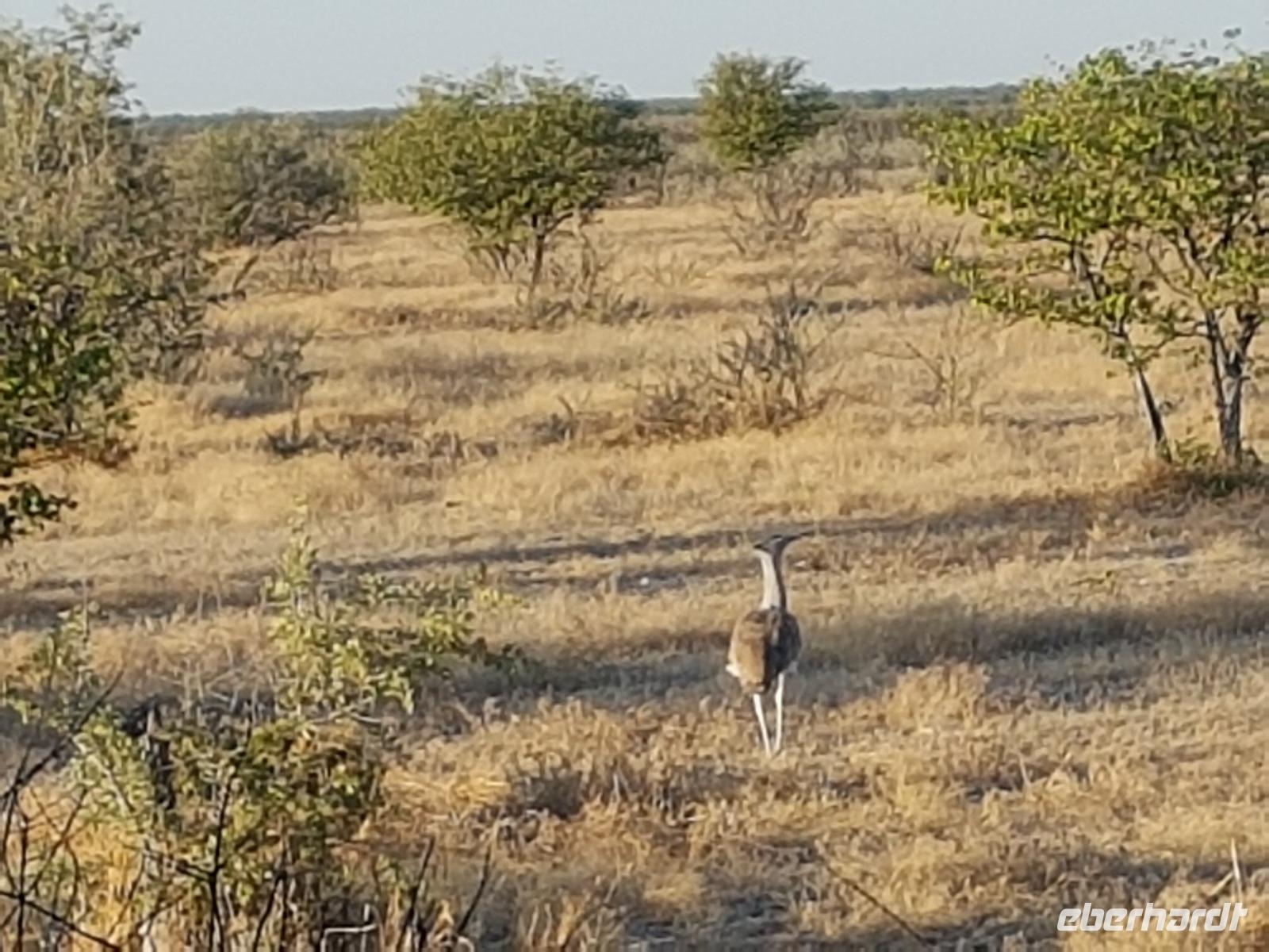 Ernst hat immer so ein Bauchgefühl und mit Hilfe auch von einer WhatsApp Gruppe wusste er manchmal, wo die besten Chancen waren und die Tiere sich aufhielten. Woran wir alle nicht glaubten war, dass wir Löwen begegnen. Doch sie waren da!! Für uns!! In Ruhe! König der Löwe!! Unsere Augen wollten es nicht glauben. Unfassbar, dass wir so etwas schönes erleben durften. Mit voller Dankbarkeit;) Wir konnten sie in Ruhe beobachten und die Zeit ging so langsam, dass wir eine Ewigkeit bei ihnen verbrachten. Es sind tolle Bilder entstanden Weiter fuhren wir zu einem Wasserloch wo ganz Afrika war. Ja, wirklich!! Wenn ich sage, ganz Afrika, meine ich: alle gemeinsam und friedlich die Giraffen, die Elefanten, die Onyx und Strauße, die Springböcke, Zebras, Gnus, der Schakal und 2 ganz lustige Warzenschweine. So friedlich müsste auch unsere Welt aussehen, wenn man die Nachrichten manchmal im Fernsehen sieht. Wunderschön!! Ab und zu kam auch ein Adler geflogen und so war die Natur in Ordnung. Und nicht nur Tiere sahen wir in Etosha, wie Elenantilope, Wasserbock. Kudu oder Schwarzgesicht-Impala wir sahen auch viele Vögel in den 2 Tagen: Sekretär, Schreiseeadler, Graureiher, Swainsonfrankolin sowie Riesentrappe und selbstverständlich den Strauß.