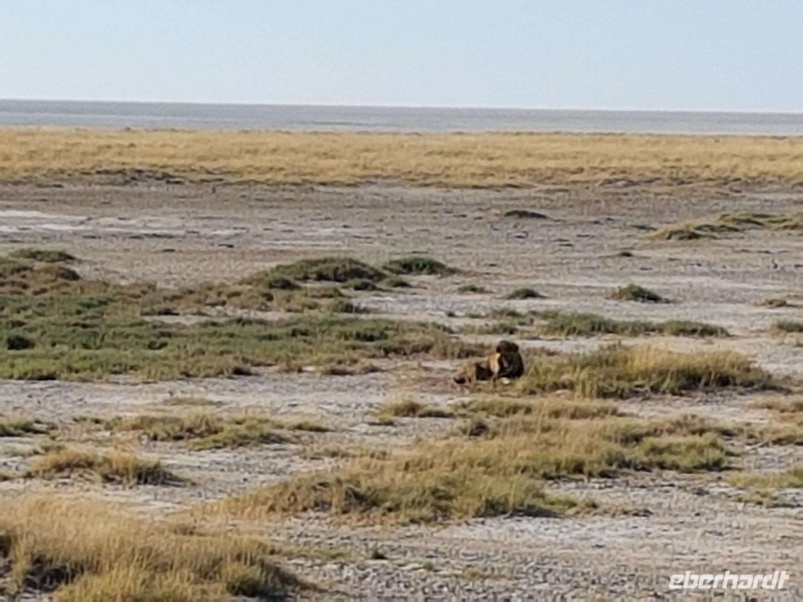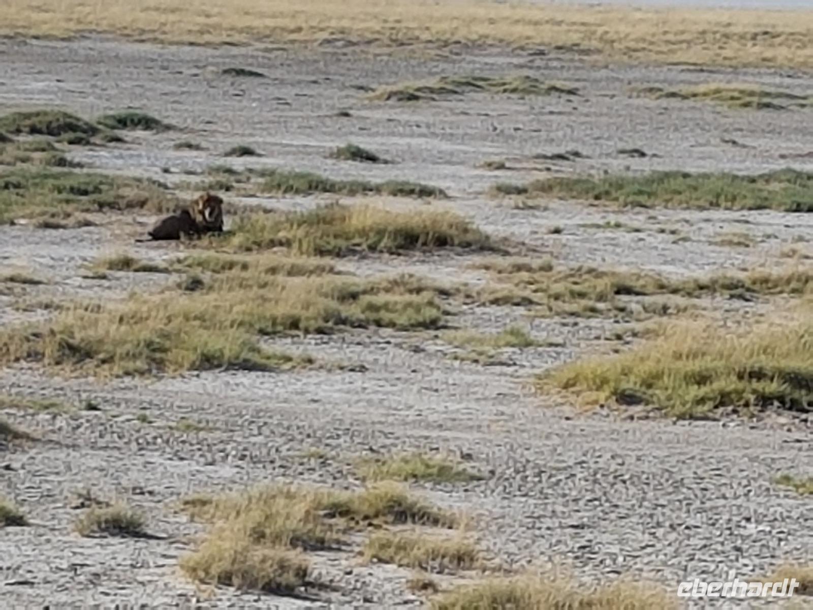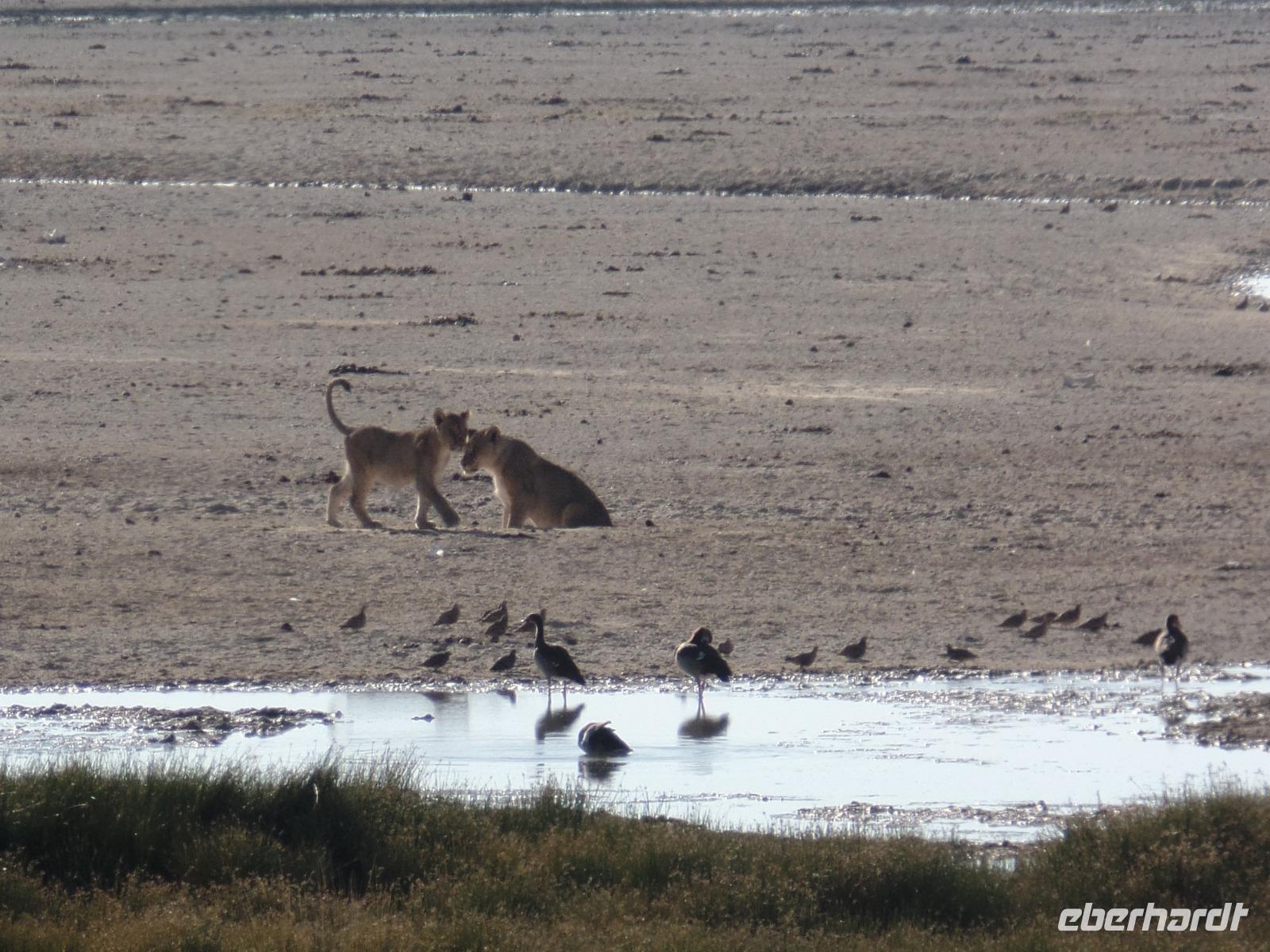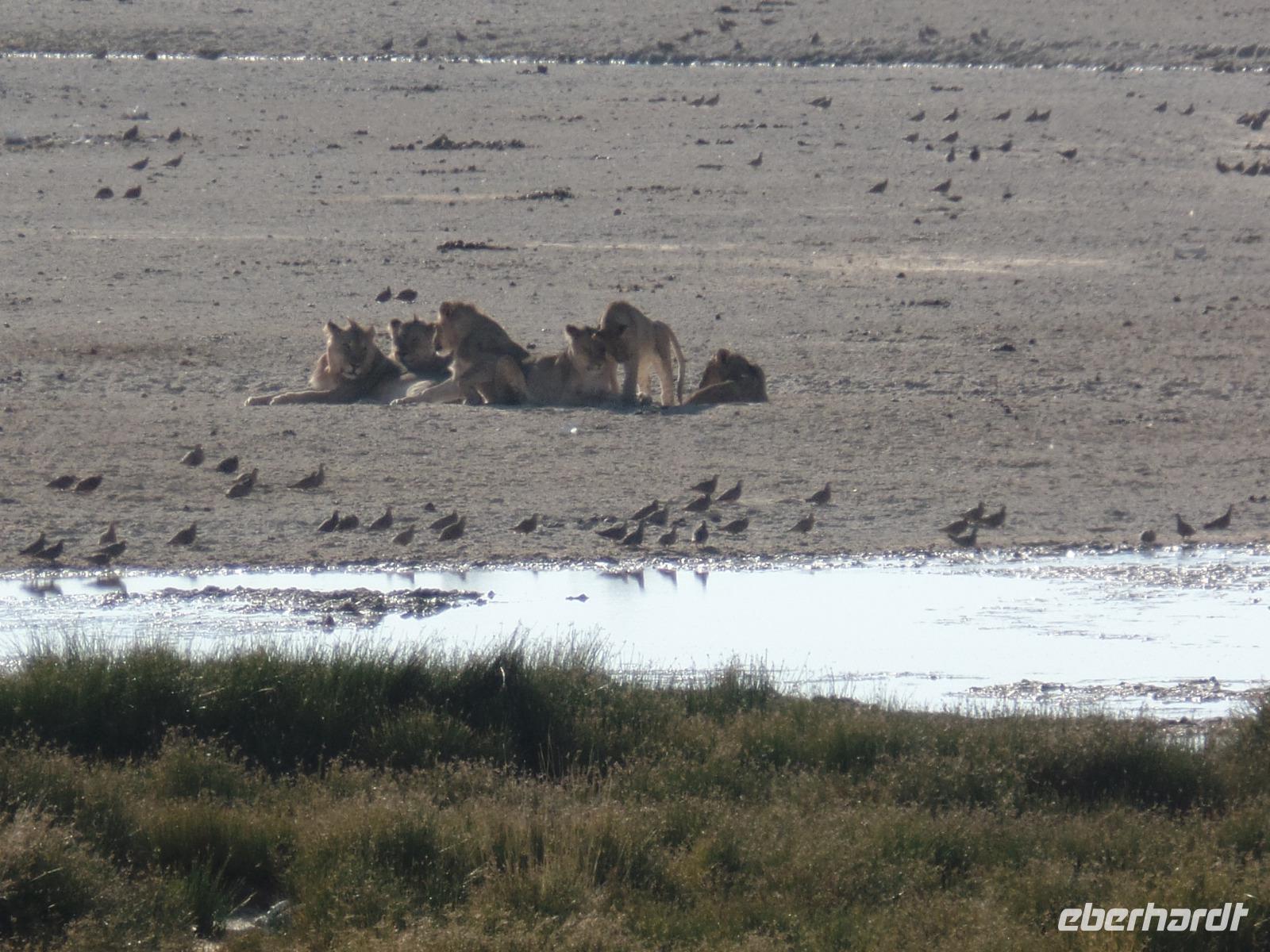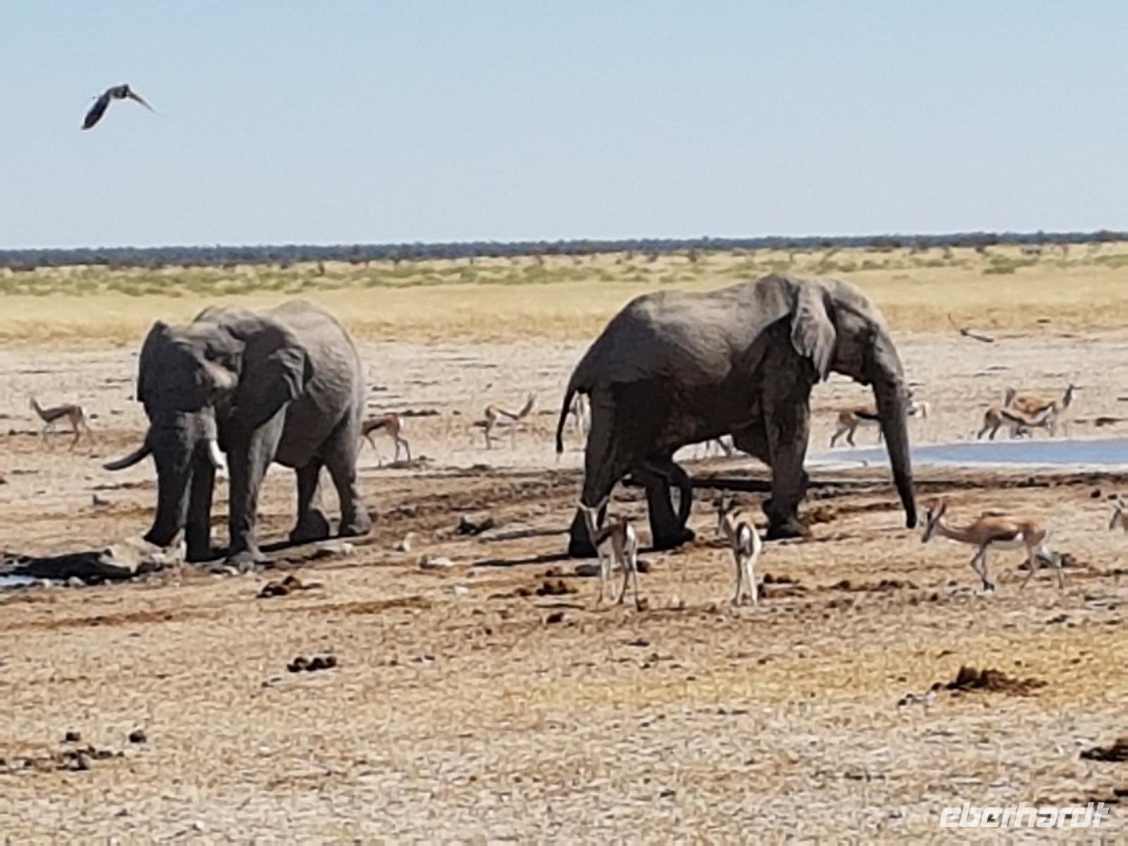 Ernst hat immer so ein Bauchgefühl und mit Hilfe auch von einer WhatsApp Gruppe wusste er manchmal, wo die besten Chancen waren und die Tiere sich aufhielten. Woran wir alle nicht glaubten war, dass wir Löwen begegnen. Doch sie waren da!! Für uns!! In Ruhe! König der Löwe!! Unsere Augen wollten es nicht glauben. Unfassbar, dass wir so etwas schönes erleben durften. Mit voller Dankbarkeit;) Wir konnten sie in Ruhe beobachten und die Zeit ging so langsam, dass wir eine Ewigkeit bei ihnen verbrachten. Es sind tolle Bilder entstanden Weiter fuhren wir zu einem Wasserloch wo ganz Afrika war. Ja, wirklich!! Wenn ich sage, ganz Afrika, meine ich: alle gemeinsam und friedlich die Giraffen, die Elefanten, die Onyx und Strauße, die Springböcke, Zebras, Gnus, der Schakal und 2 ganz lustige Warzenschweine. So friedlich müsste auch unsere Welt aussehen, wenn man die Nachrichten manchmal im Fernsehen sieht. Wunderschön!! Ab und zu kam auch ein Adler geflogen und so war die Natur in Ordnung. Und nicht nur Tiere sahen wir in Etosha, wie Elenantilope, Wasserbock. Kudu oder Schwarzgesicht-Impala wir sahen auch viele Vögel in den 2 Tagen: Sekretär, Schreiseeadler, Graureiher, Swainsonfrankolin sowie Riesentrappe und selbstverständlich den Strauß.