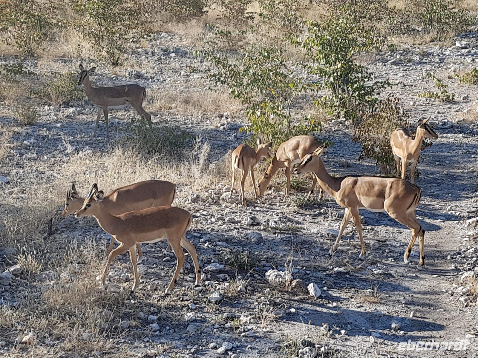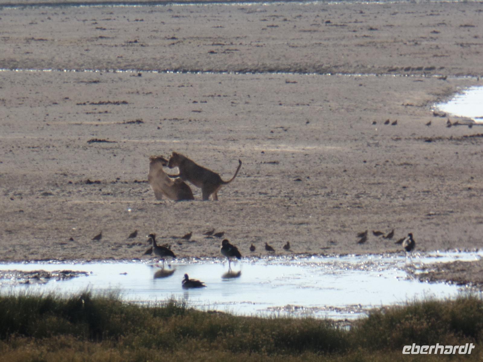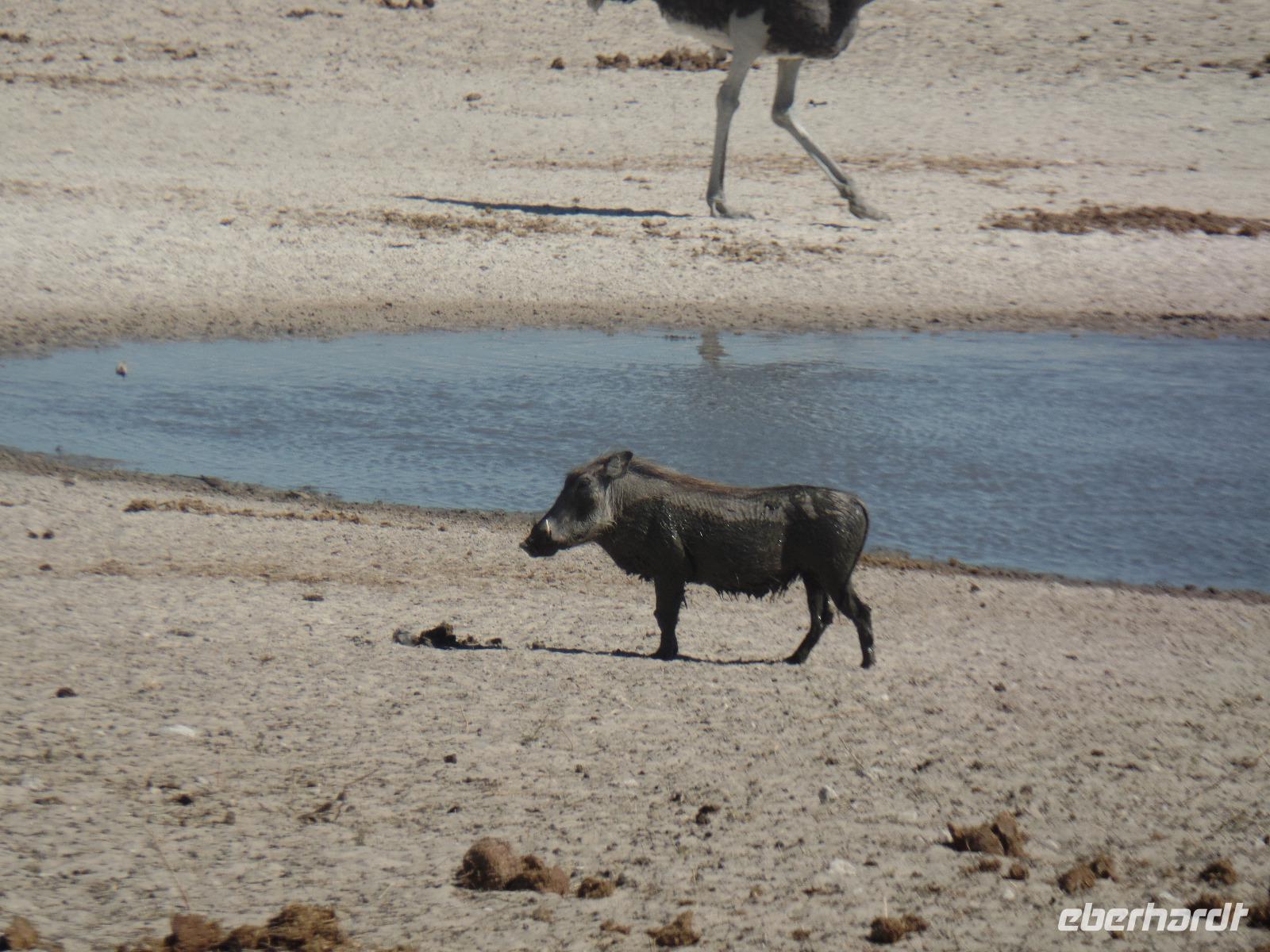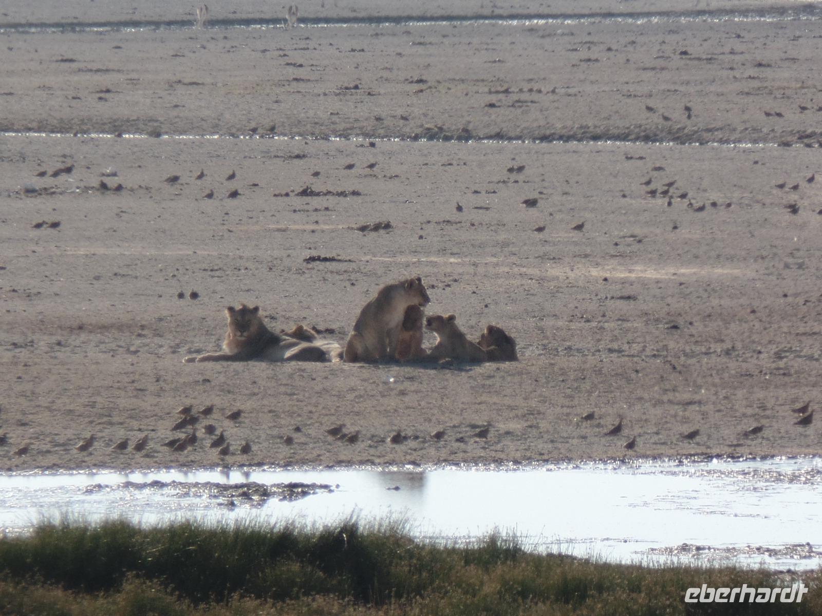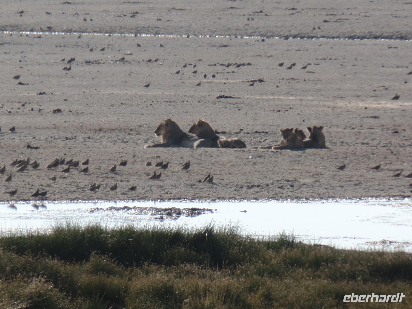 Ernst hat immer so ein Bauchgefühl und mit Hilfe auch von einer WhatsApp Gruppe wusste er manchmal, wo die besten Chancen waren und die Tiere sich aufhielten. Woran wir alle nicht glaubten war, dass wir Löwen begegnen. Doch sie waren da!! Für uns!! In Ruhe! König der Löwe!! Unsere Augen wollten es nicht glauben. Unfassbar, dass wir so etwas schönes erleben durften. Mit voller Dankbarkeit;) Wir konnten sie in Ruhe beobachten und die Zeit ging so langsam, dass wir eine Ewigkeit bei ihnen verbrachten. Es sind tolle Bilder entstanden Weiter fuhren wir zu einem Wasserloch wo ganz Afrika war. Ja, wirklich!! Wenn ich sage, ganz Afrika, meine ich: alle gemeinsam und friedlich die Giraffen, die Elefanten, die Onyx und Strauße, die Springböcke, Zebras, Gnus, der Schakal und 2 ganz lustige Warzenschweine. So friedlich müsste auch unsere Welt aussehen, wenn man die Nachrichten manchmal im Fernsehen sieht. Wunderschön!! Ab und zu kam auch ein Adler geflogen und so war die Natur in Ordnung. Und nicht nur Tiere sahen wir in Etosha, wie Elenantilope, Wasserbock. Kudu oder Schwarzgesicht-Impala wir sahen auch viele Vögel in den 2 Tagen: Sekretär, Schreiseeadler, Graureiher, Swainsonfrankolin sowie Riesentrappe und selbstverständlich den Strauß.