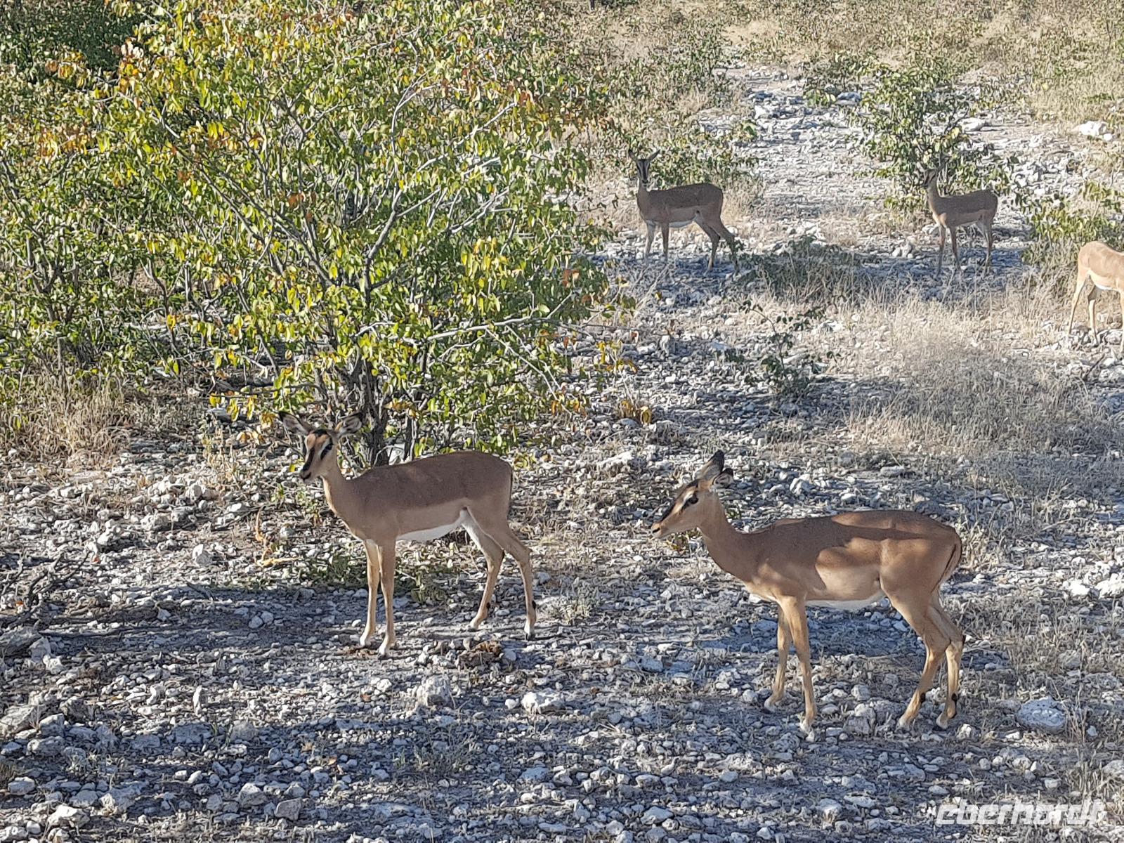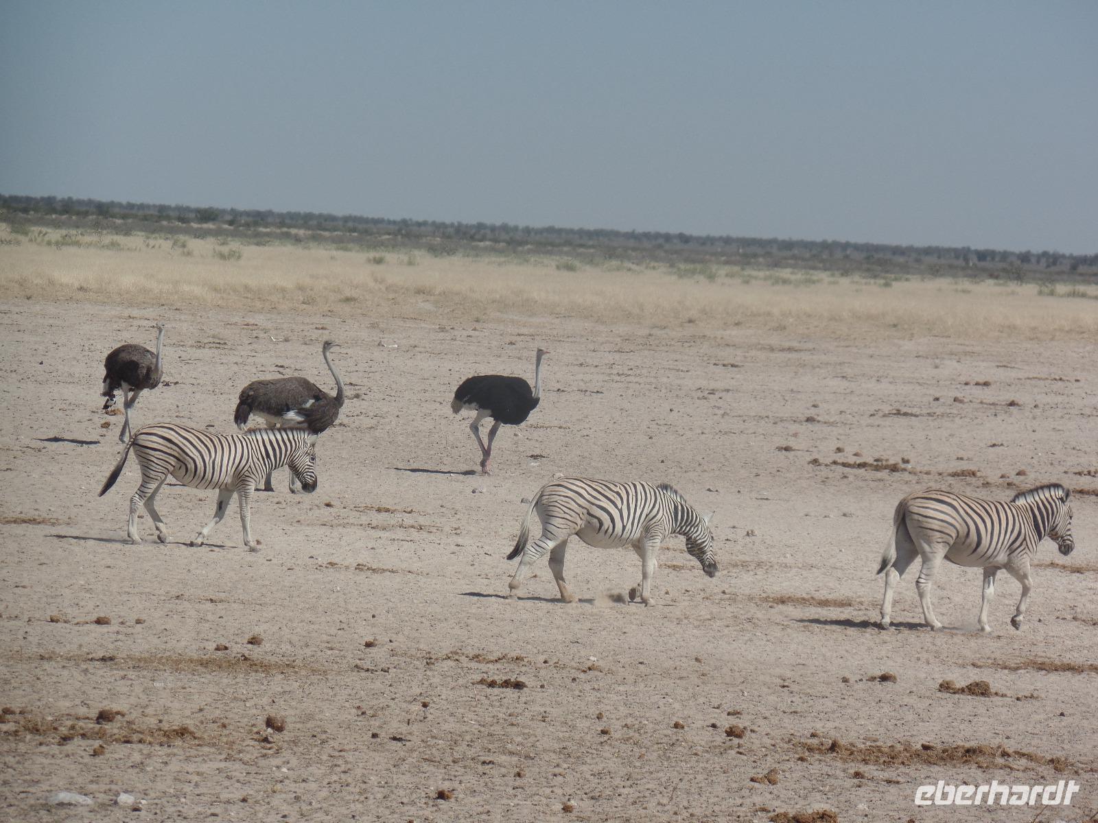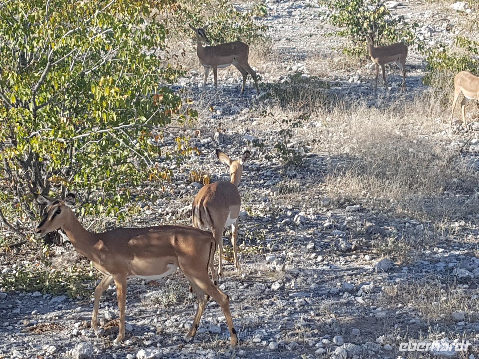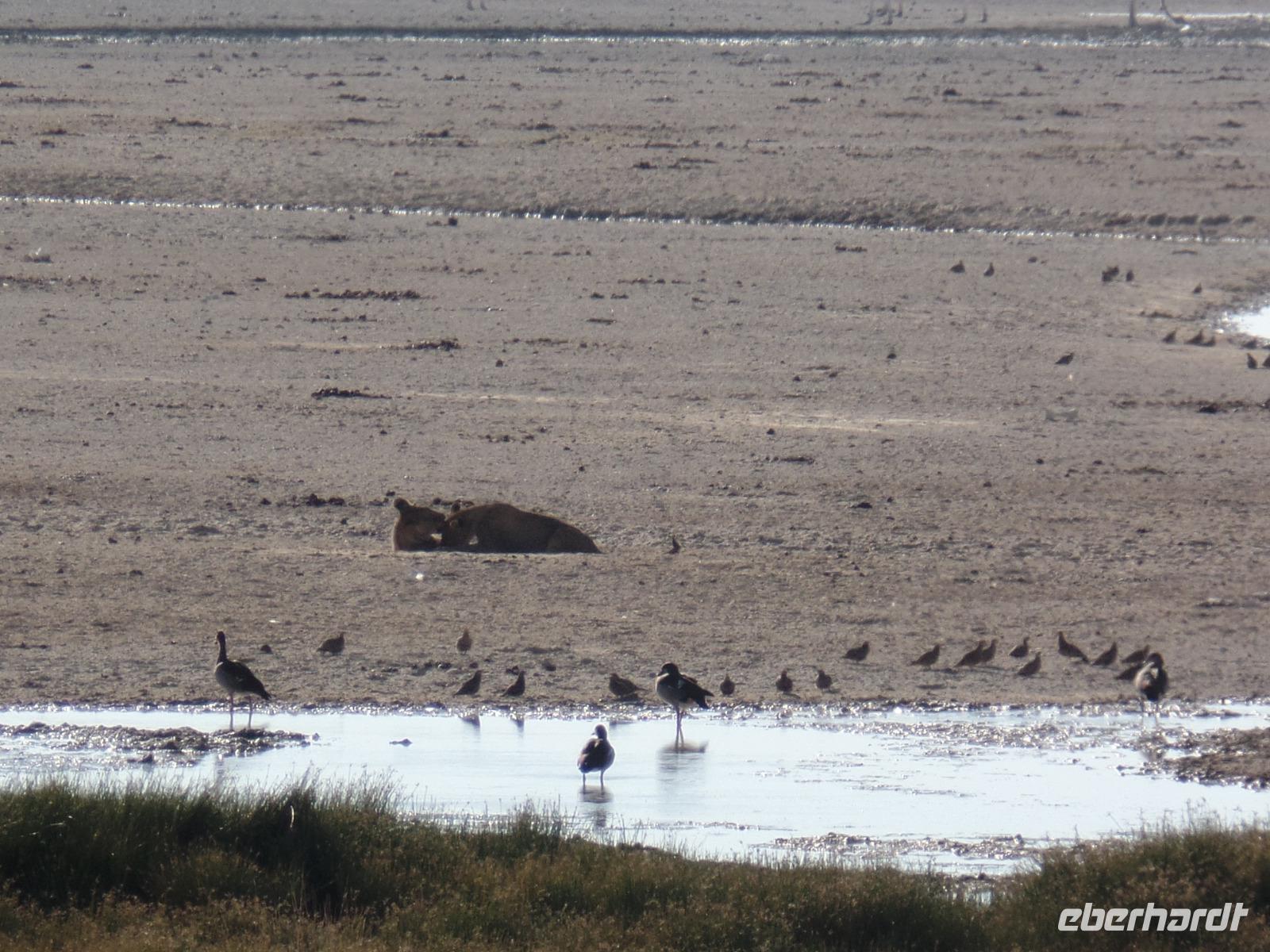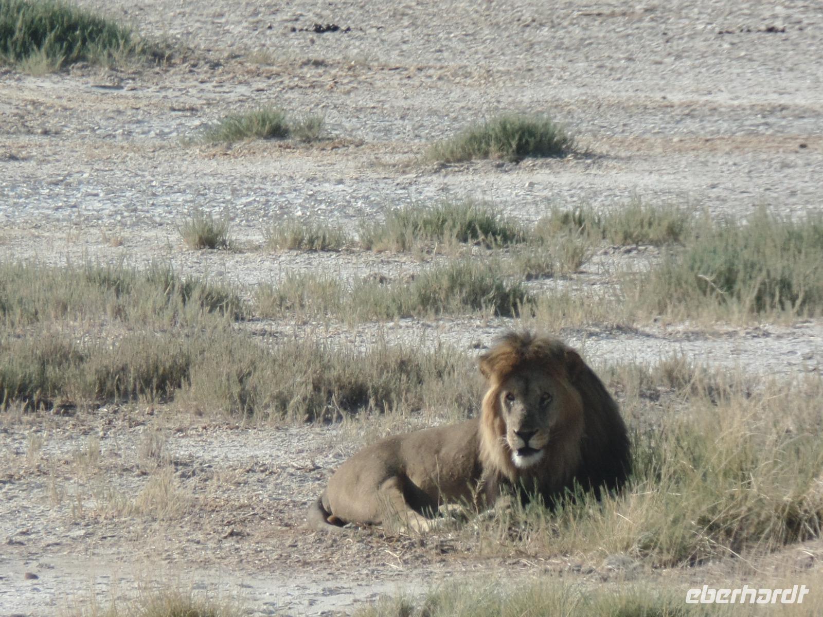 Ernst hat immer so ein Bauchgefühl und mit Hilfe auch von einer WhatsApp Gruppe wusste er manchmal, wo die besten Chancen waren und die Tiere sich aufhielten. Woran wir alle nicht glaubten war, dass wir Löwen begegnen. Doch sie waren da!! Für uns!! In Ruhe! König der Löwe!! Unsere Augen wollten es nicht glauben. Unfassbar, dass wir so etwas schönes erleben durften. Mit voller Dankbarkeit;) Wir konnten sie in Ruhe beobachten und die Zeit ging so langsam, dass wir eine Ewigkeit bei ihnen verbrachten. Es sind tolle Bilder entstanden Weiter fuhren wir zu einem Wasserloch wo ganz Afrika war. Ja, wirklich!! Wenn ich sage, ganz Afrika, meine ich: alle gemeinsam und friedlich die Giraffen, die Elefanten, die Onyx und Strauße, die Springböcke, Zebras, Gnus, der Schakal und 2 ganz lustige Warzenschweine. So friedlich müsste auch unsere Welt aussehen, wenn man die Nachrichten manchmal im Fernsehen sieht. Wunderschön!! Ab und zu kam auch ein Adler geflogen und so war die Natur in Ordnung. Und nicht nur Tiere sahen wir in Etosha, wie Elenantilope, Wasserbock. Kudu oder Schwarzgesicht-Impala wir sahen auch viele Vögel in den 2 Tagen: Sekretär, Schreiseeadler, Graureiher, Swainsonfrankolin sowie Riesentrappe und selbstverständlich den Strauß.