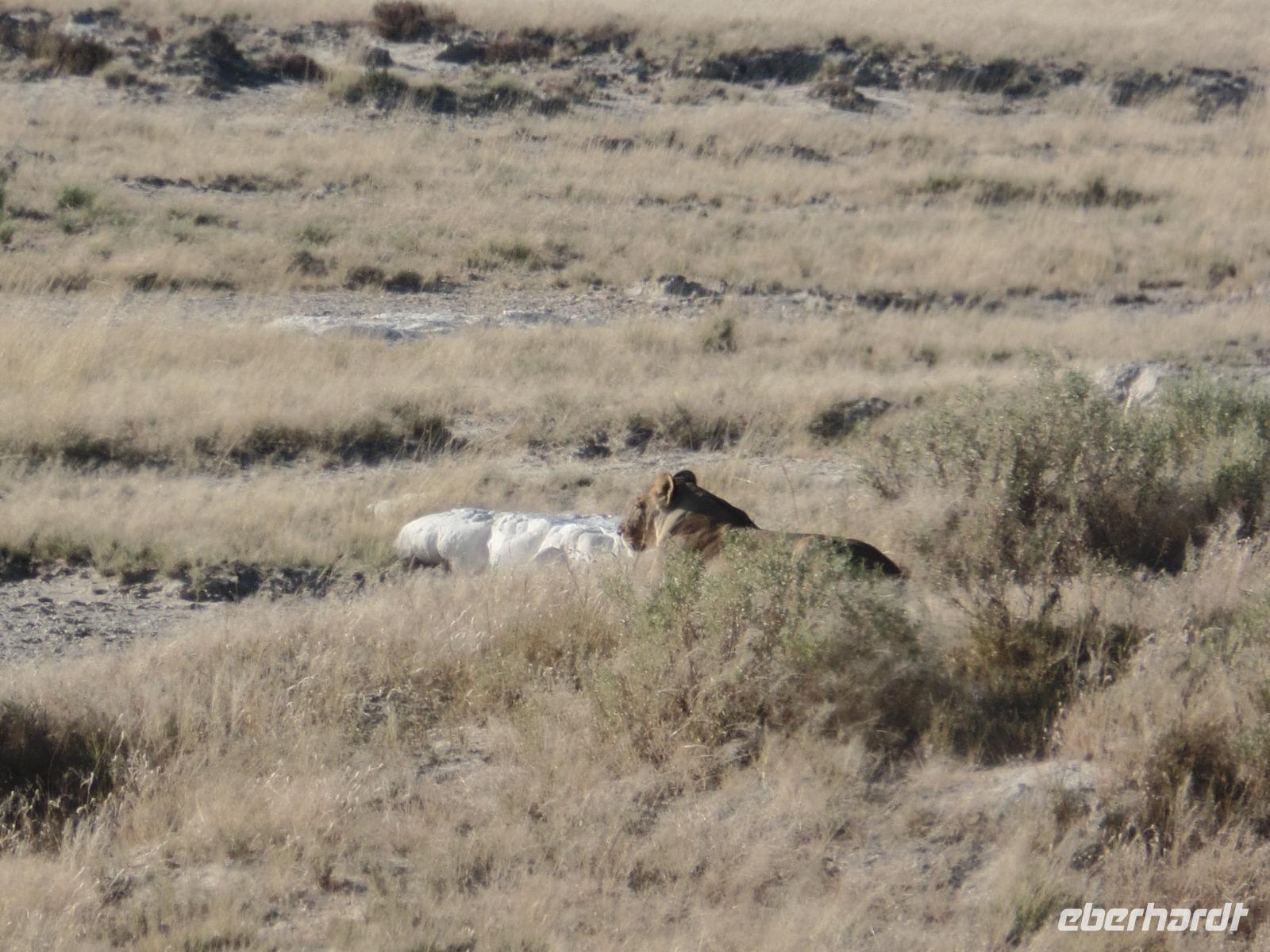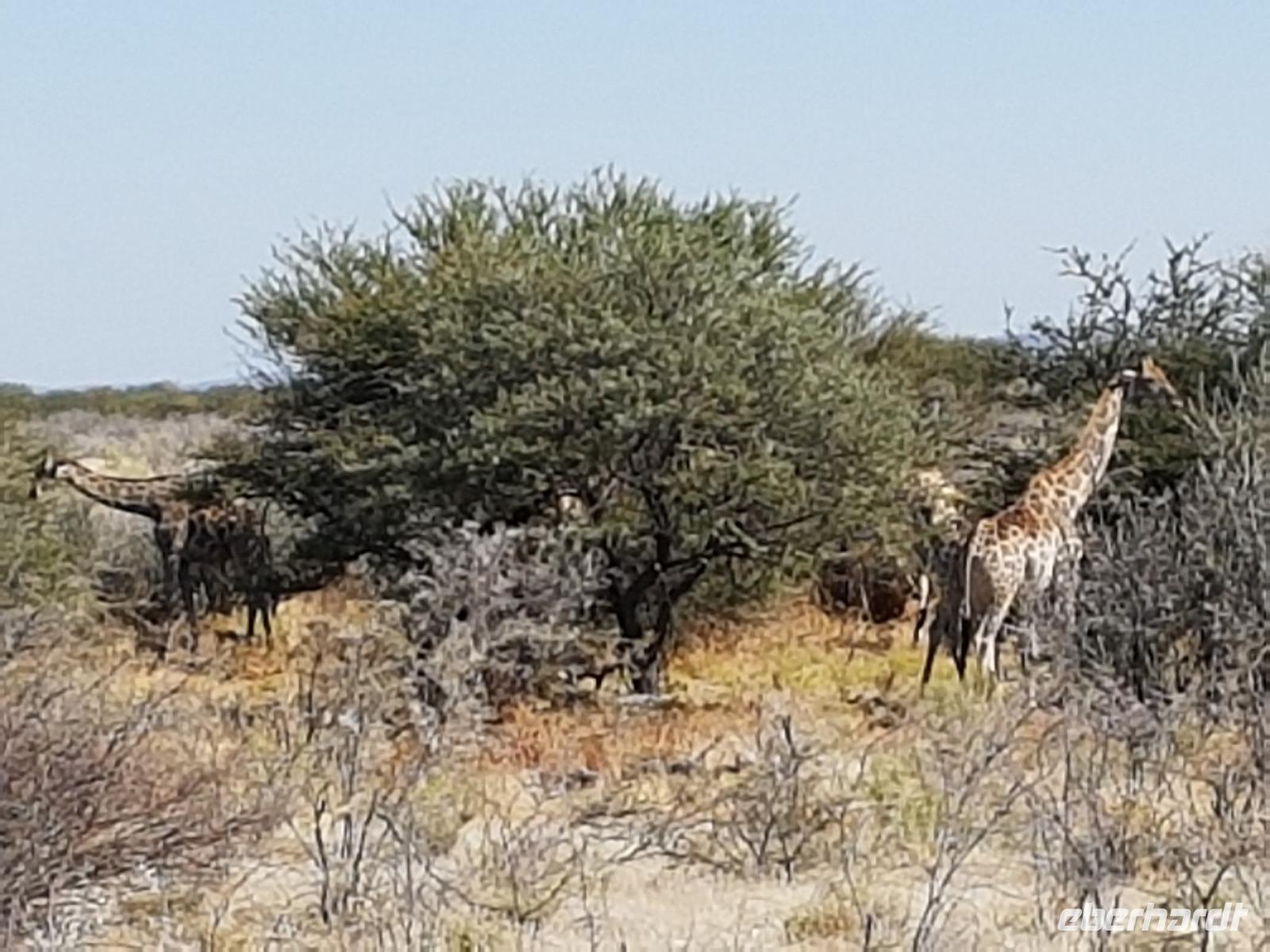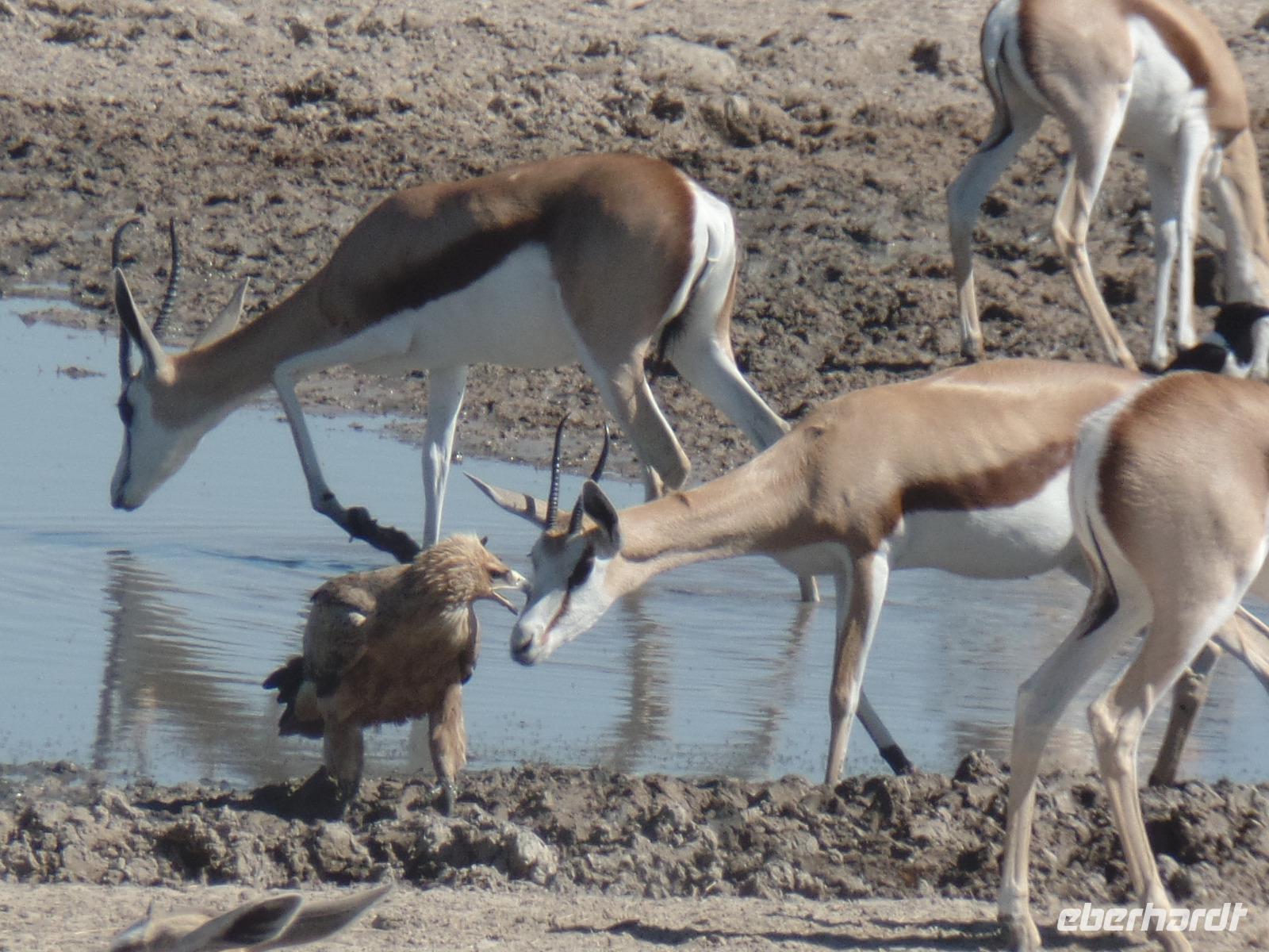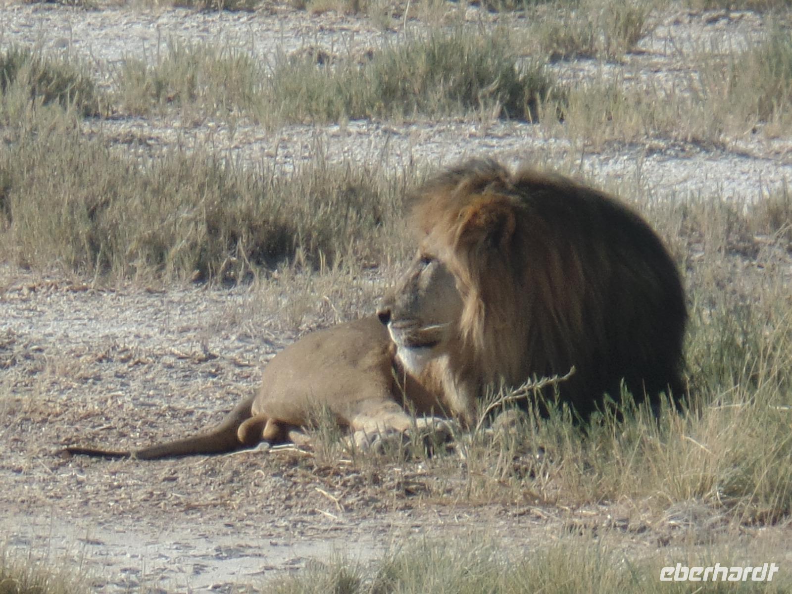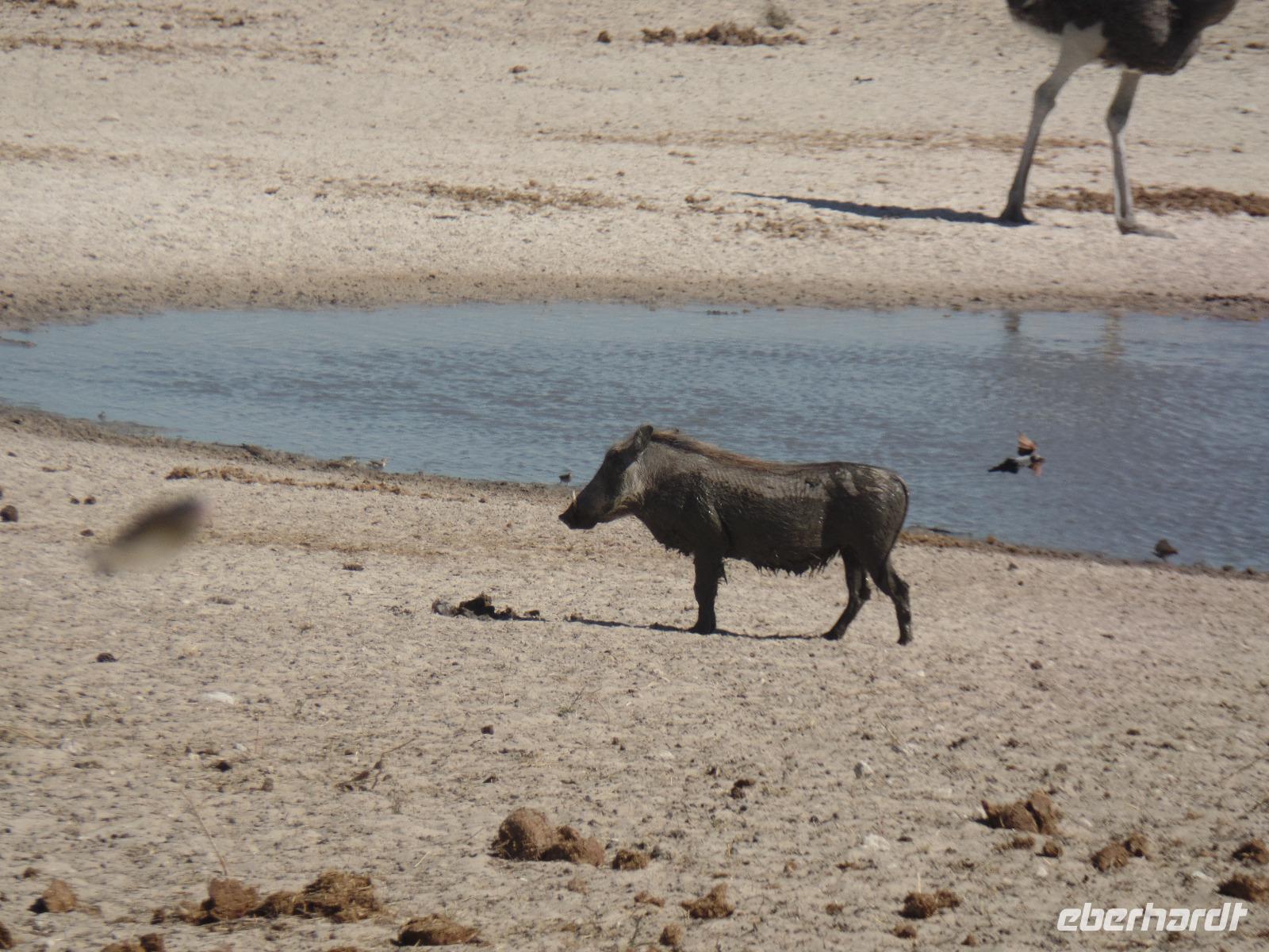 Ernst hat immer so ein Bauchgefühl und mit Hilfe auch von einer WhatsApp Gruppe wusste er manchmal, wo die besten Chancen waren und die Tiere sich aufhielten. Woran wir alle nicht glaubten war, dass wir Löwen begegnen. Doch sie waren da!! Für uns!! In Ruhe! König der Löwe!! Unsere Augen wollten es nicht glauben. Unfassbar, dass wir so etwas schönes erleben durften. Mit voller Dankbarkeit;) Wir konnten sie in Ruhe beobachten und die Zeit ging so langsam, dass wir eine Ewigkeit bei ihnen verbrachten. Es sind tolle Bilder entstanden Weiter fuhren wir zu einem Wasserloch wo ganz Afrika war. Ja, wirklich!! Wenn ich sage, ganz Afrika, meine ich: alle gemeinsam und friedlich die Giraffen, die Elefanten, die Onyx und Strauße, die Springböcke, Zebras, Gnus, der Schakal und 2 ganz lustige Warzenschweine. So friedlich müsste auch unsere Welt aussehen, wenn man die Nachrichten manchmal im Fernsehen sieht. Wunderschön!! Ab und zu kam auch ein Adler geflogen und so war die Natur in Ordnung. Und nicht nur Tiere sahen wir in Etosha, wie Elenantilope, Wasserbock. Kudu oder Schwarzgesicht-Impala wir sahen auch viele Vögel in den 2 Tagen: Sekretär, Schreiseeadler, Graureiher, Swainsonfrankolin sowie Riesentrappe und selbstverständlich den Strauß.