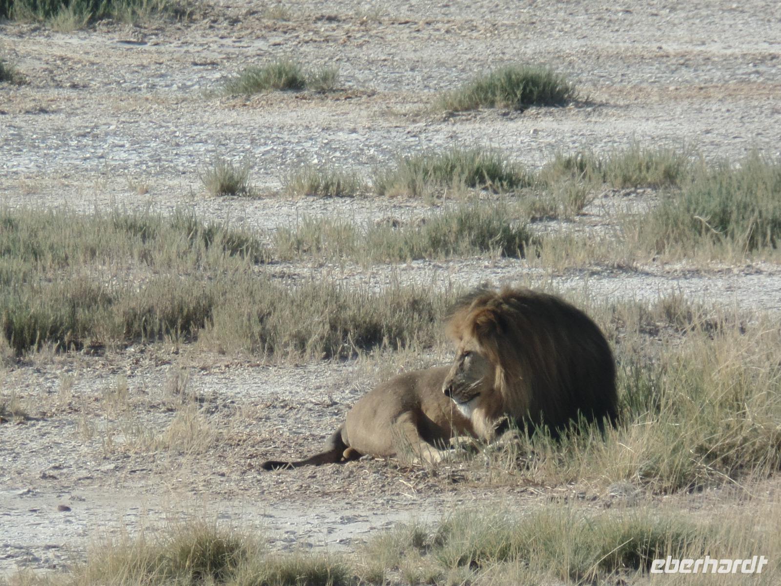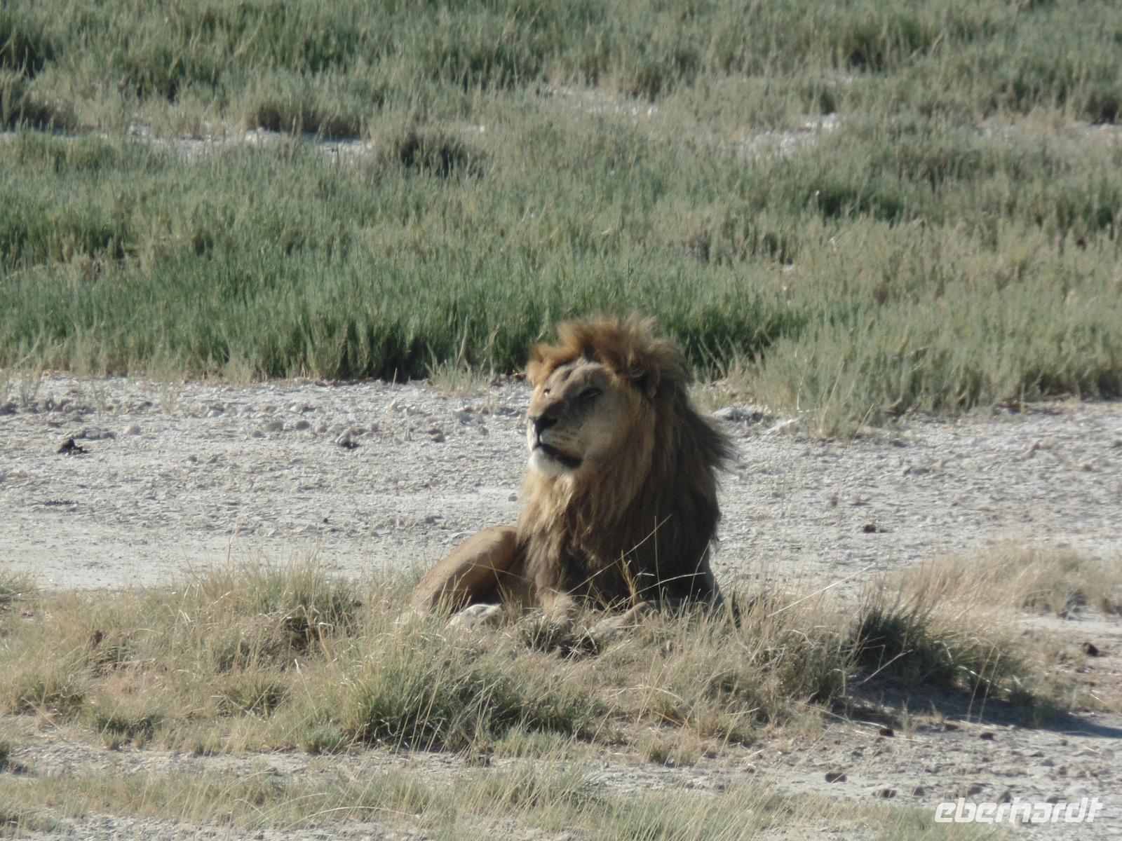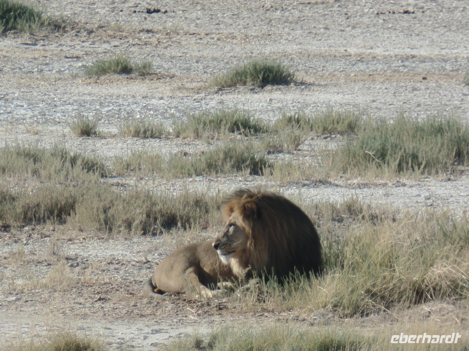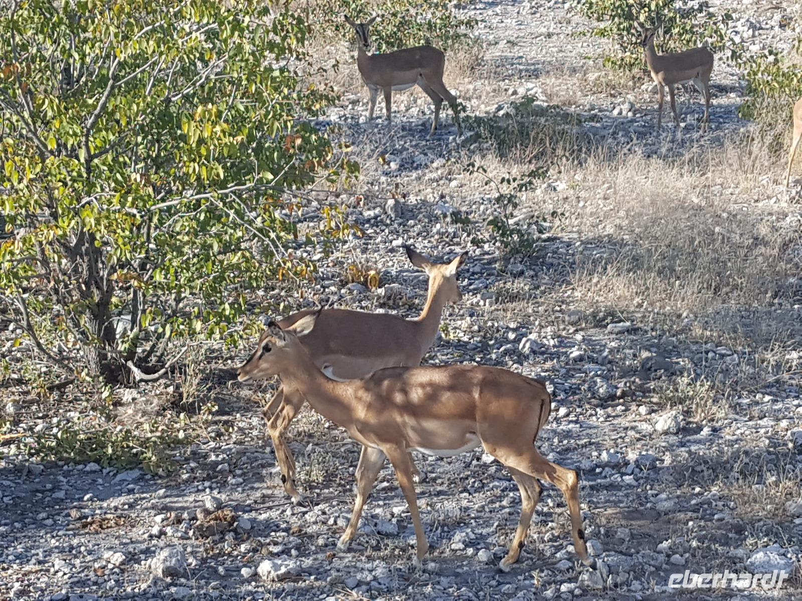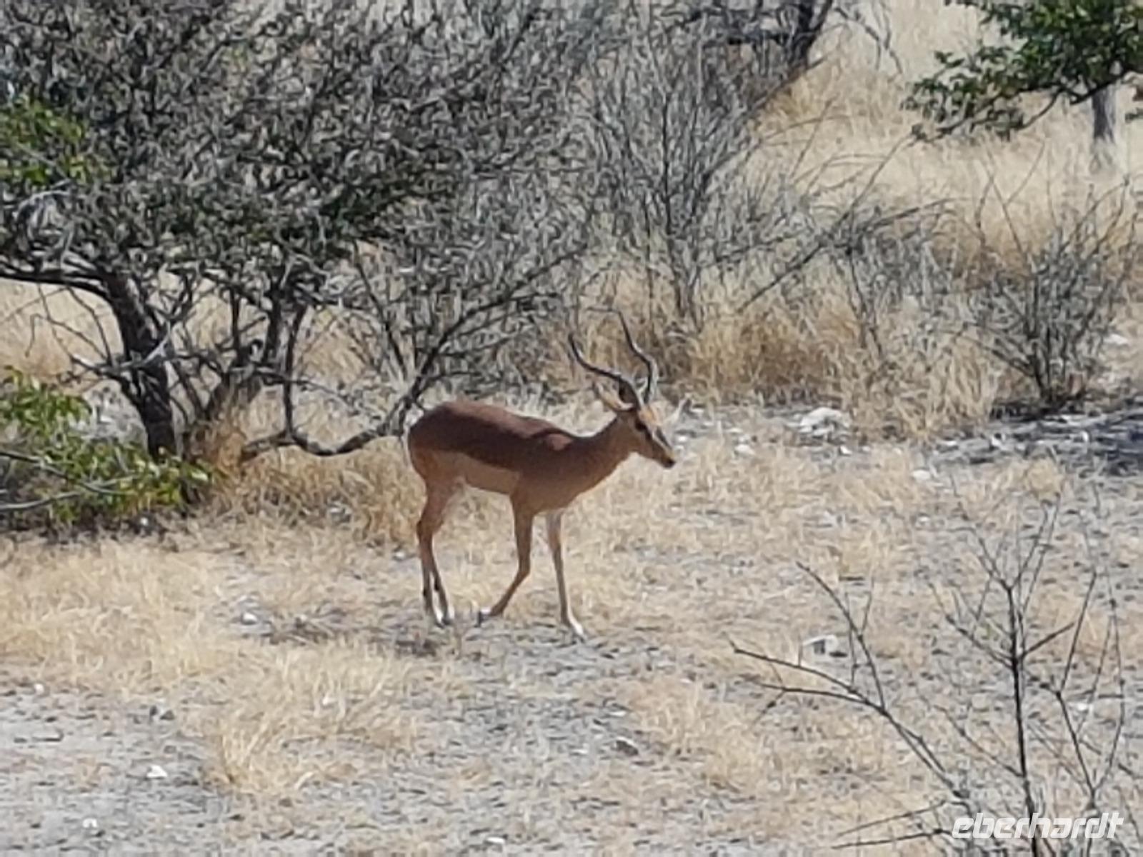 Ernst hat immer so ein Bauchgefühl und mit Hilfe auch von einer WhatsApp Gruppe wusste er manchmal, wo die besten Chancen waren und die Tiere sich aufhielten. Woran wir alle nicht glaubten war, dass wir Löwen begegnen. Doch sie waren da!! Für uns!! In Ruhe! König der Löwe!! Unsere Augen wollten es nicht glauben. Unfassbar, dass wir so etwas schönes erleben durften. Mit voller Dankbarkeit;) Wir konnten sie in Ruhe beobachten und die Zeit ging so langsam, dass wir eine Ewigkeit bei ihnen verbrachten. Es sind tolle Bilder entstanden Weiter fuhren wir zu einem Wasserloch wo ganz Afrika war. Ja, wirklich!! Wenn ich sage, ganz Afrika, meine ich: alle gemeinsam und friedlich die Giraffen, die Elefanten, die Onyx und Strauße, die Springböcke, Zebras, Gnus, der Schakal und 2 ganz lustige Warzenschweine. So friedlich müsste auch unsere Welt aussehen, wenn man die Nachrichten manchmal im Fernsehen sieht. Wunderschön!! Ab und zu kam auch ein Adler geflogen und so war die Natur in Ordnung. Und nicht nur Tiere sahen wir in Etosha, wie Elenantilope, Wasserbock. Kudu oder Schwarzgesicht-Impala wir sahen auch viele Vögel in den 2 Tagen: Sekretär, Schreiseeadler, Graureiher, Swainsonfrankolin sowie Riesentrappe und selbstverständlich den Strauß.