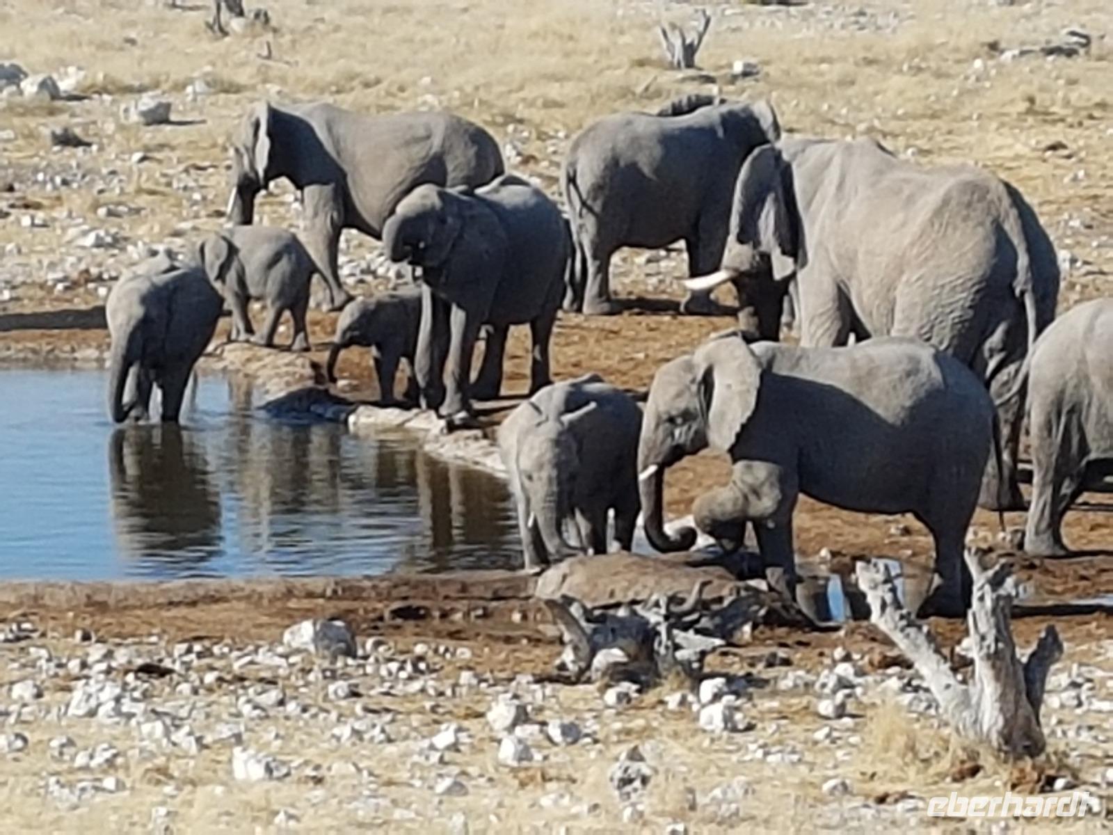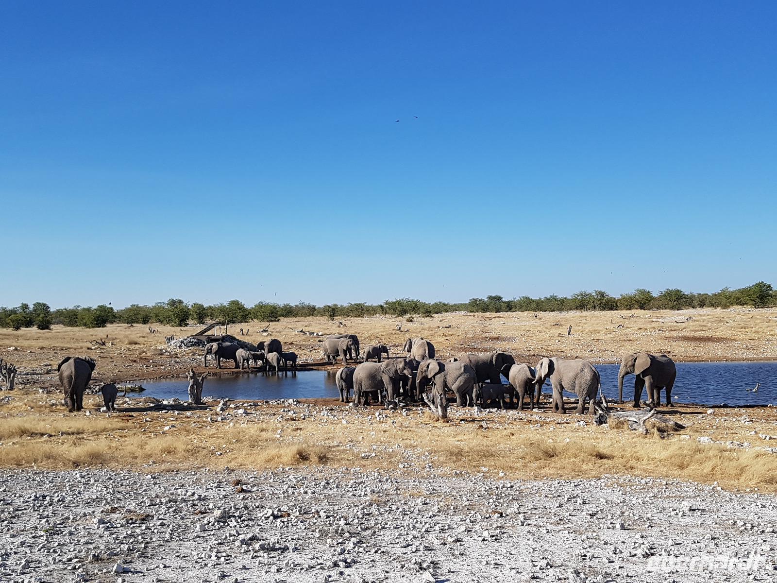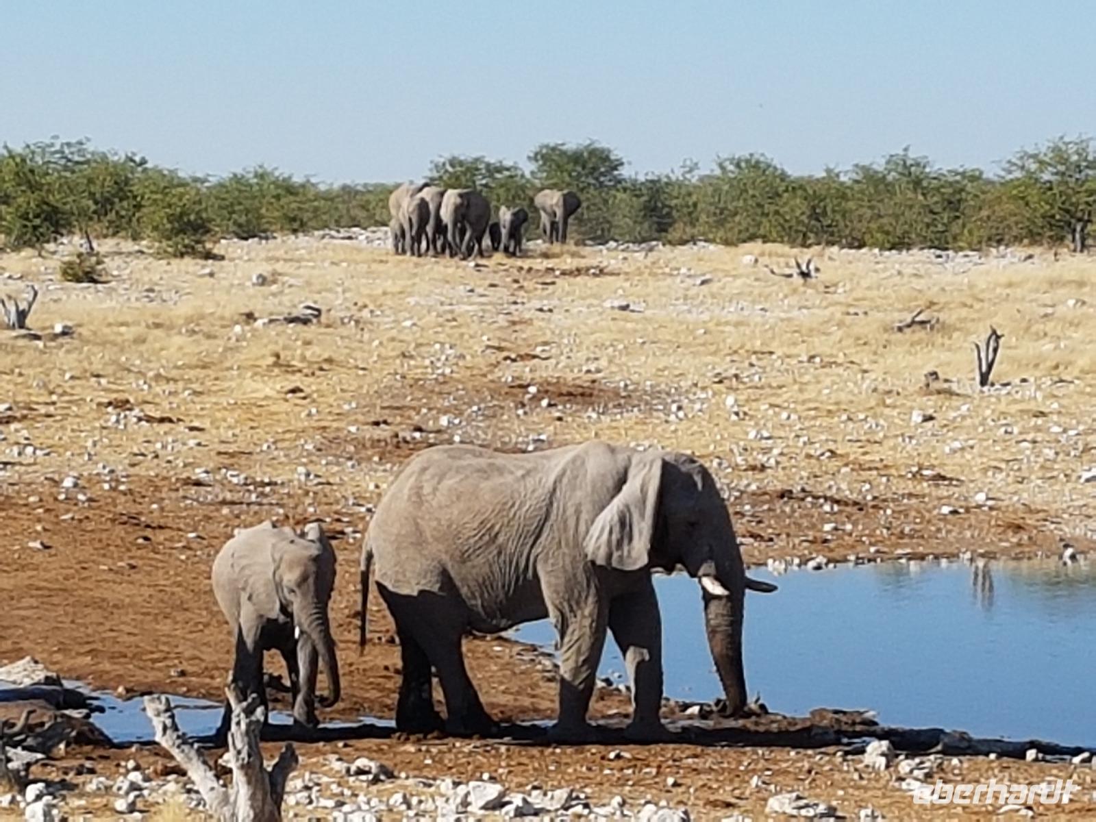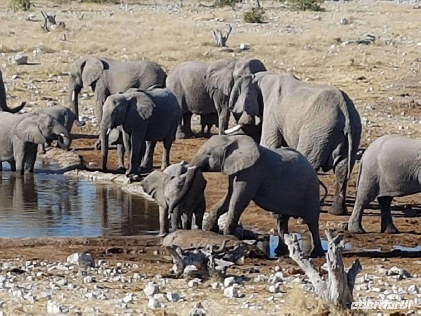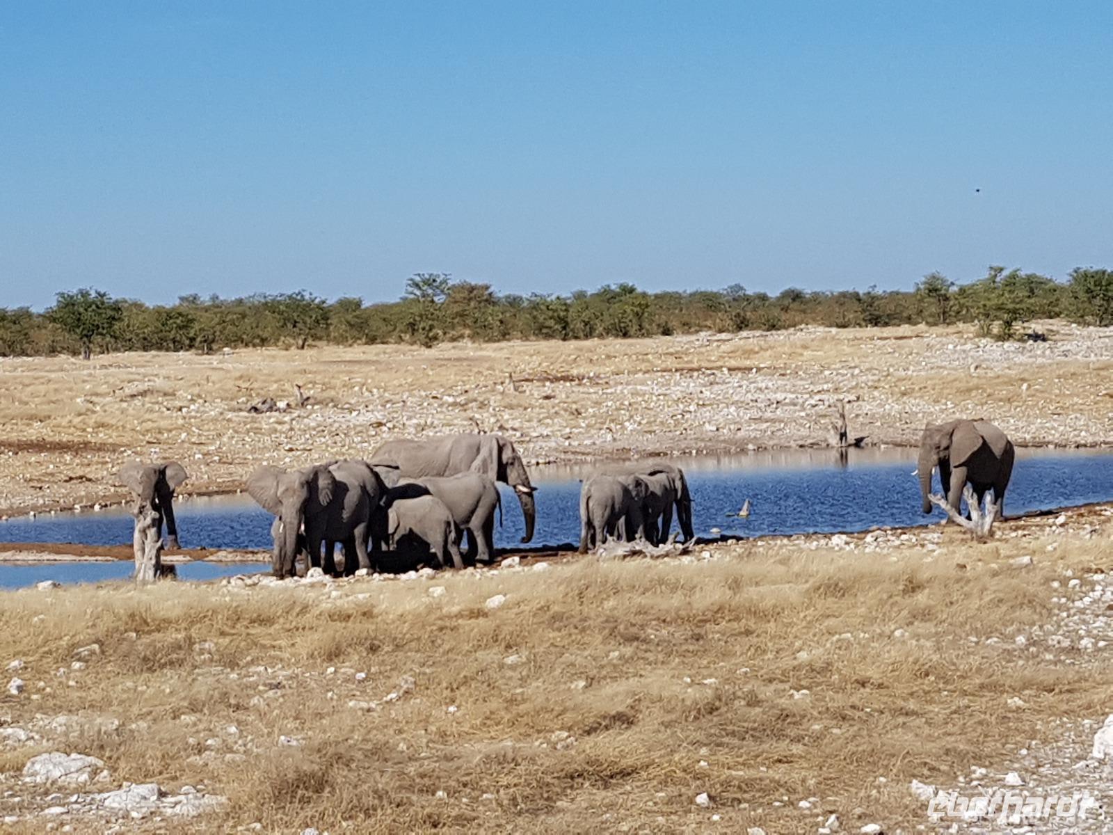 Wir sind alle bisschen aufgeregt. Heute und morgen geht unser Traum in Erfüllung. Wir werden im Etosha Nationalpark Tiere bestaunen. Die Fahrt führt durch Outio, dem Tor zum Etosha Nationalpark. Ankunft ist in einer wildromantischen Lodge, Toshari Lodge, unweit vom Eingangstor des Parks entfernt. Schon am frühen Nachmittag unternehmen wir eine erste Pirschfahrt durch den Etosha Nationalpark. Namibias berühmtester Nationalpark gehört zu den absoluten Höhepunkten unserer Reise. Typisch für den Park sind die Wasserlöcher, an denen sich Elefanten, Gnus und viele andere Tiere versammeln. Wir hatten heute Glück, da wir Strauß, Springbock, Kudu, Zebras und Giraffen sahen aber vor allem viele Elefanten und sogar einen Baby-Elefanten. So wie morgen müssen wir den Park bei Sonnenuntergang verlassen, aber der erste Eindruck unserer Pirschfahrt war grandios. Zebras sind wunderschöne Tiere, auch Onyx und Kudus. Die afrikanischen Elefanten konnten wir richtig genießen wie Sie an das Wasserloch kamen um zu trinken. Was für ein Tier! Wir hatten heute und auch morgen wieder das Glück Nashörner zu sehen. Und sogar beide! Das Spitzmaul-Nashorn sowie die Breitmail-Nashorn. Heute einfach so mitten auf der Straße (siehe Bildergalerie, um es zu glauben). Nach einem tollen afrikanischen Abendessen genossen wir wieder den Abend unter dem afrikanischen Sternenhimmel und freuten uns tierisch auf die spannenden Tiererlebnisse am nächsten Tag!