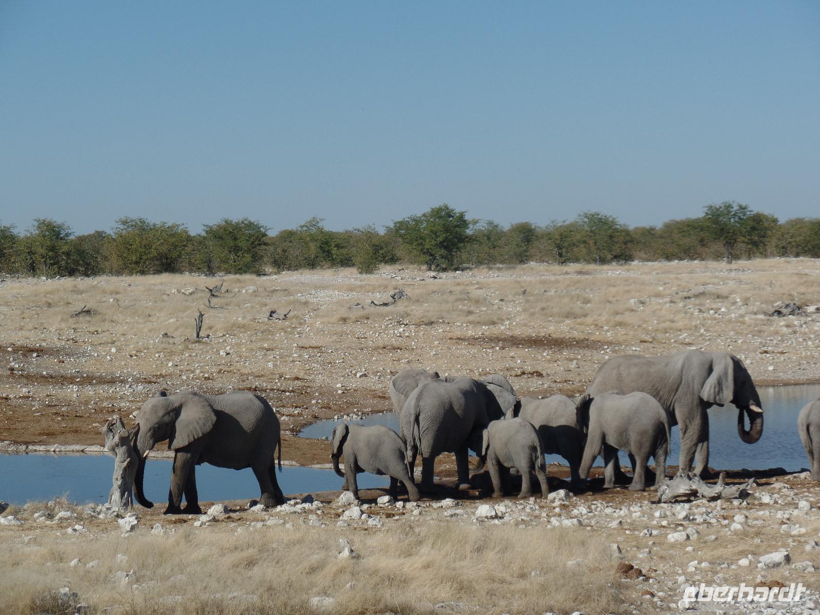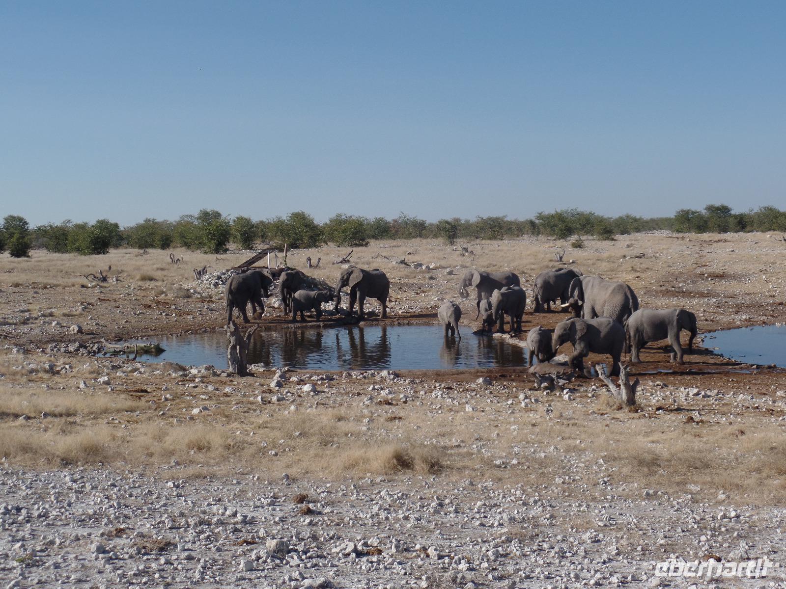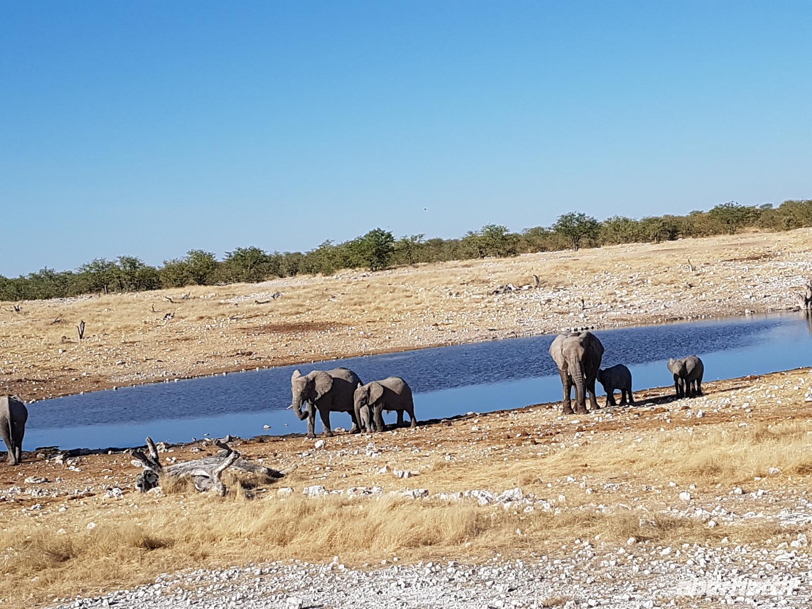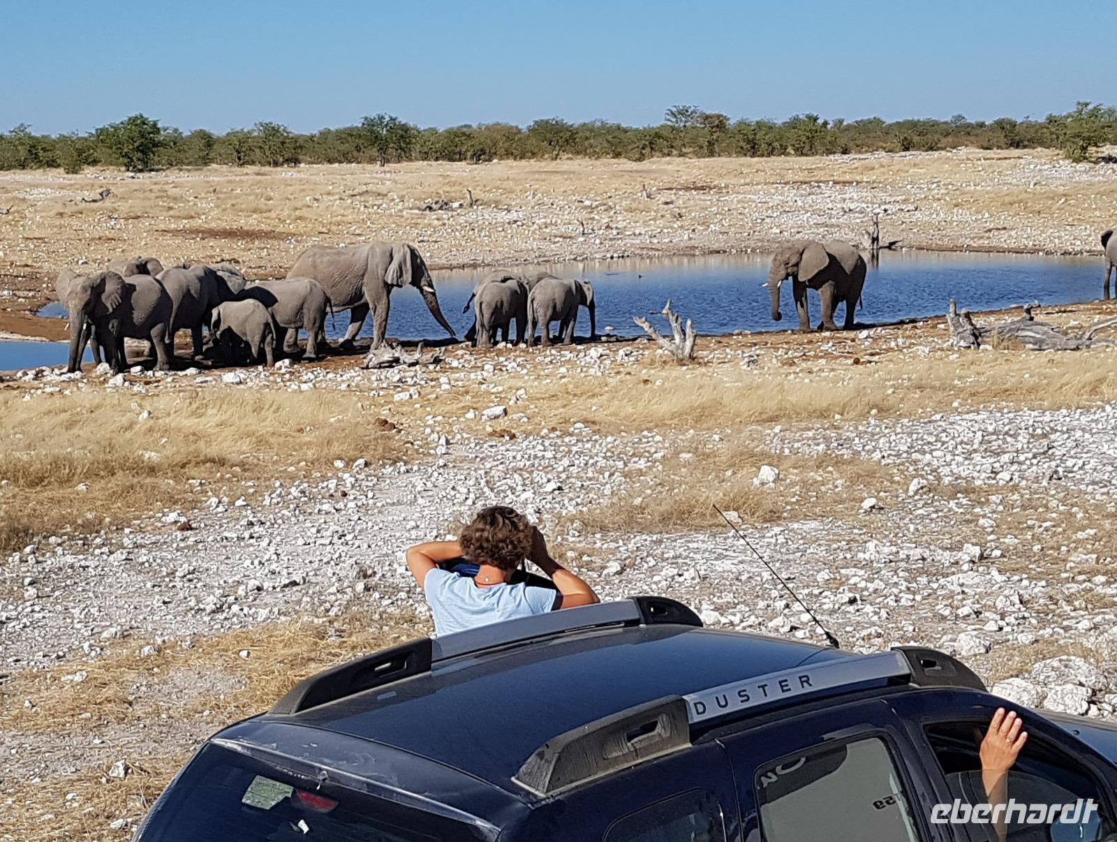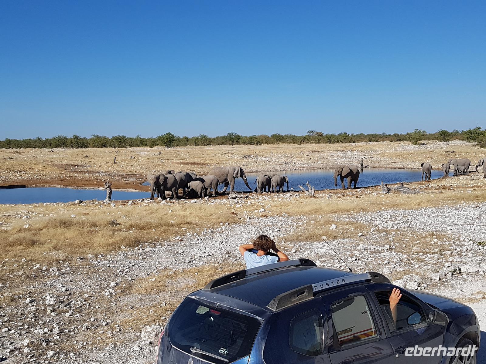 Wir sind alle bisschen aufgeregt. Heute und morgen geht unser Traum in Erfüllung. Wir werden im Etosha Nationalpark Tiere bestaunen. Die Fahrt führt durch Outio, dem Tor zum Etosha Nationalpark. Ankunft ist in einer wildromantischen Lodge, Toshari Lodge, unweit vom Eingangstor des Parks entfernt. Schon am frühen Nachmittag unternehmen wir eine erste Pirschfahrt durch den Etosha Nationalpark. Namibias berühmtester Nationalpark gehört zu den absoluten Höhepunkten unserer Reise. Typisch für den Park sind die Wasserlöcher, an denen sich Elefanten, Gnus und viele andere Tiere versammeln. Wir hatten heute Glück, da wir Strauß, Springbock, Kudu, Zebras und Giraffen sahen aber vor allem viele Elefanten und sogar einen Baby-Elefanten. So wie morgen müssen wir den Park bei Sonnenuntergang verlassen, aber der erste Eindruck unserer Pirschfahrt war grandios. Zebras sind wunderschöne Tiere, auch Onyx und Kudus. Die afrikanischen Elefanten konnten wir richtig genießen wie Sie an das Wasserloch kamen um zu trinken. Was für ein Tier! Wir hatten heute und auch morgen wieder das Glück Nashörner zu sehen. Und sogar beide! Das Spitzmaul-Nashorn sowie die Breitmail-Nashorn. Heute einfach so mitten auf der Straße (siehe Bildergalerie, um es zu glauben). Nach einem tollen afrikanischen Abendessen genossen wir wieder den Abend unter dem afrikanischen Sternenhimmel und freuten uns tierisch auf die spannenden Tiererlebnisse am nächsten Tag!