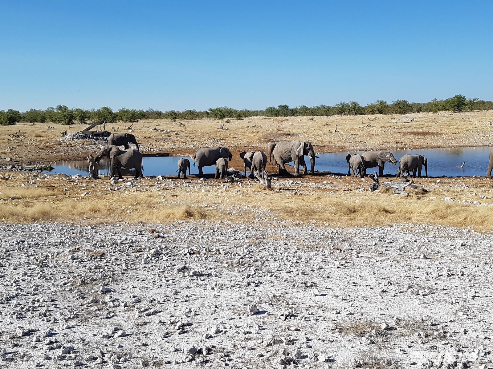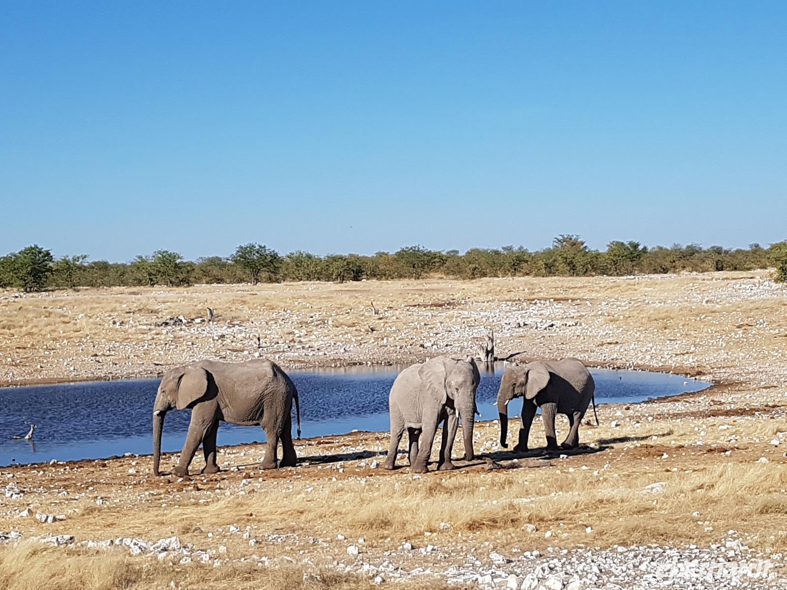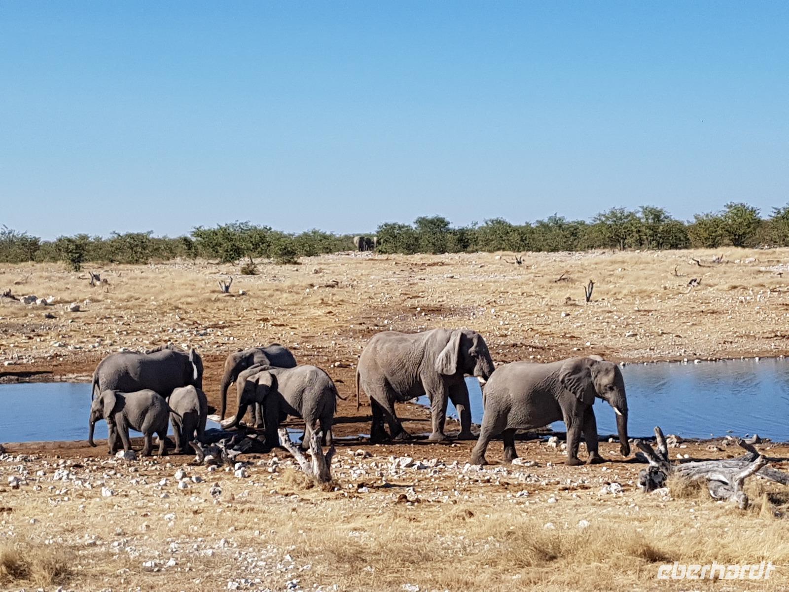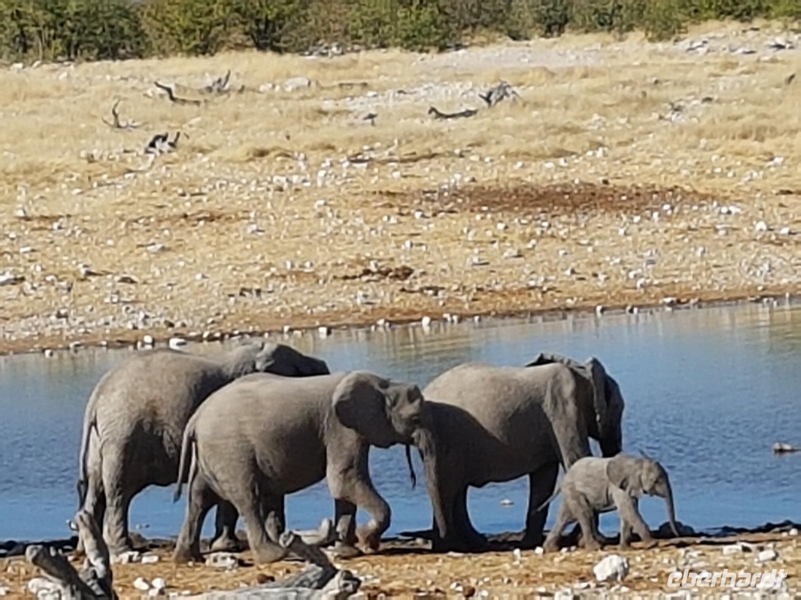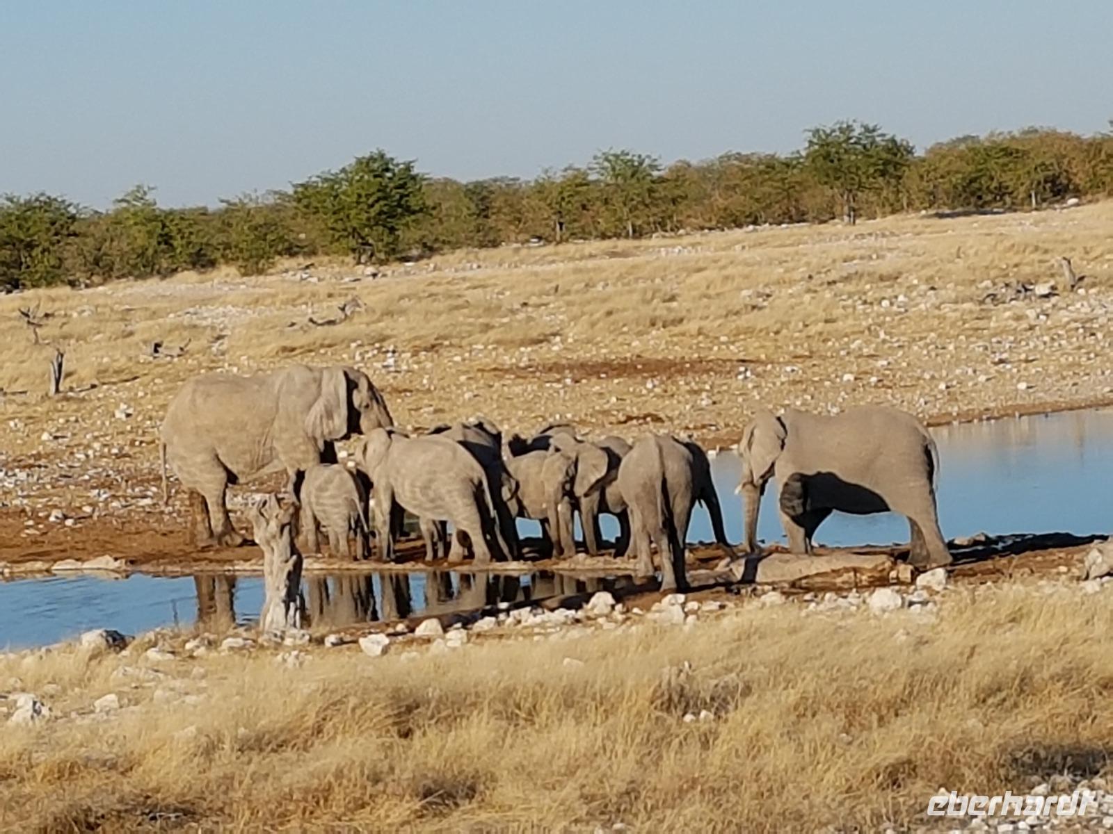 Wir sind alle bisschen aufgeregt. Heute und morgen geht unser Traum in Erfüllung. Wir werden im Etosha Nationalpark Tiere bestaunen. Die Fahrt führt durch Outio, dem Tor zum Etosha Nationalpark. Ankunft ist in einer wildromantischen Lodge, Toshari Lodge, unweit vom Eingangstor des Parks entfernt. Schon am frühen Nachmittag unternehmen wir eine erste Pirschfahrt durch den Etosha Nationalpark. Namibias berühmtester Nationalpark gehört zu den absoluten Höhepunkten unserer Reise. Typisch für den Park sind die Wasserlöcher, an denen sich Elefanten, Gnus und viele andere Tiere versammeln. Wir hatten heute Glück, da wir Strauß, Springbock, Kudu, Zebras und Giraffen sahen aber vor allem viele Elefanten und sogar einen Baby-Elefanten. So wie morgen müssen wir den Park bei Sonnenuntergang verlassen, aber der erste Eindruck unserer Pirschfahrt war grandios. Zebras sind wunderschöne Tiere, auch Onyx und Kudus. Die afrikanischen Elefanten konnten wir richtig genießen wie Sie an das Wasserloch kamen um zu trinken. Was für ein Tier! Wir hatten heute und auch morgen wieder das Glück Nashörner zu sehen. Und sogar beide! Das Spitzmaul-Nashorn sowie die Breitmail-Nashorn. Heute einfach so mitten auf der Straße (siehe Bildergalerie, um es zu glauben). Nach einem tollen afrikanischen Abendessen genossen wir wieder den Abend unter dem afrikanischen Sternenhimmel und freuten uns tierisch auf die spannenden Tiererlebnisse am nächsten Tag!