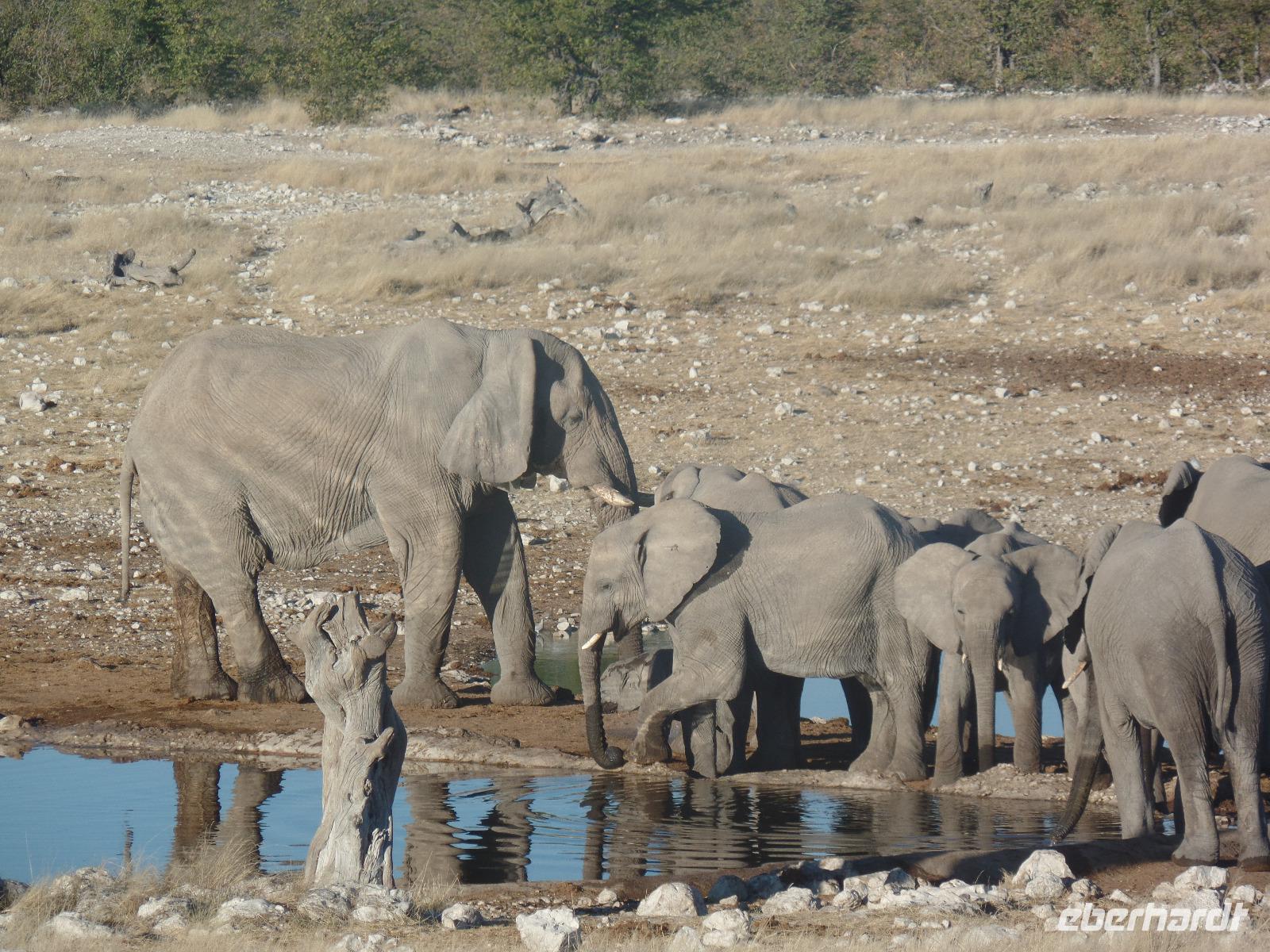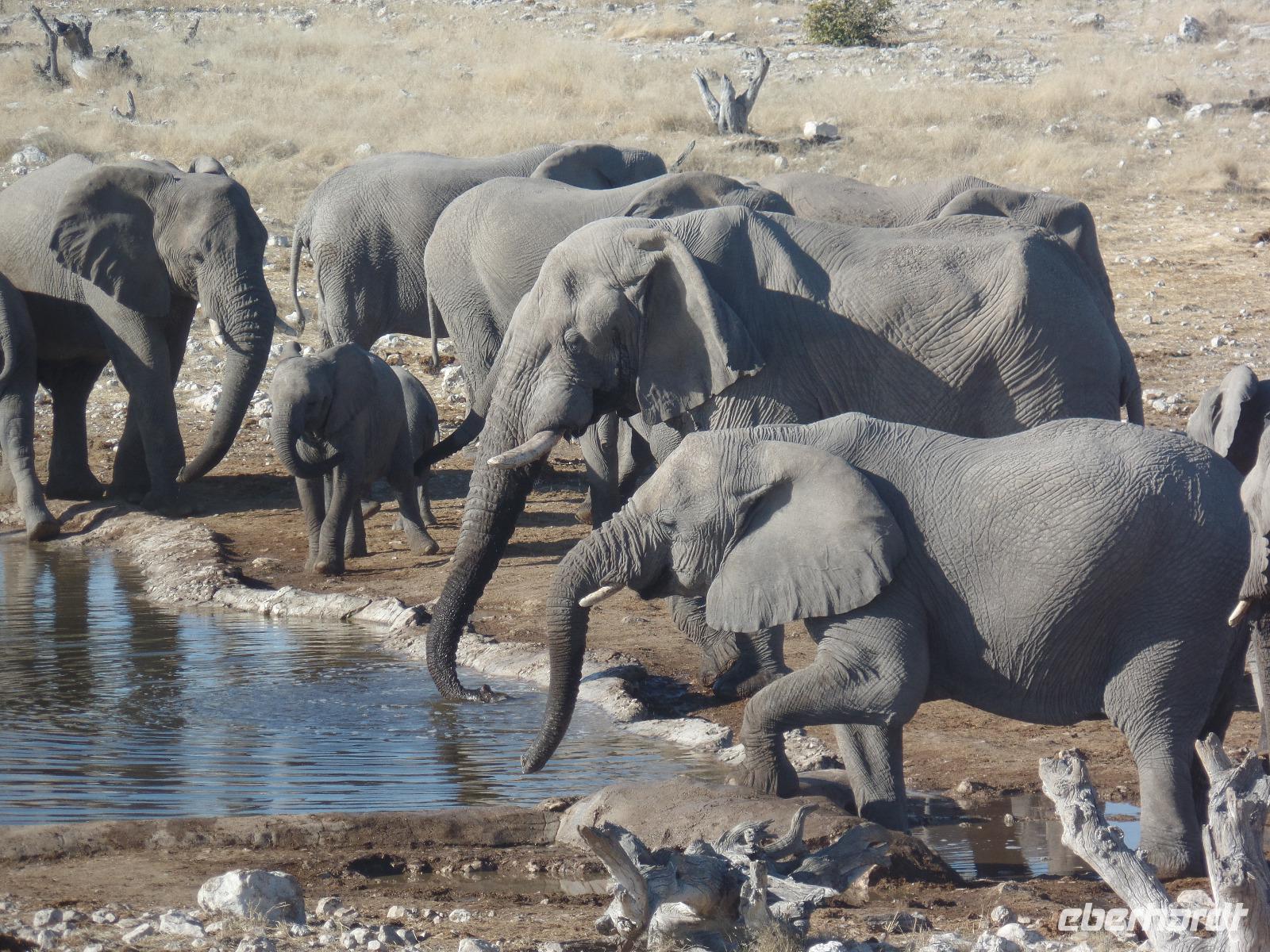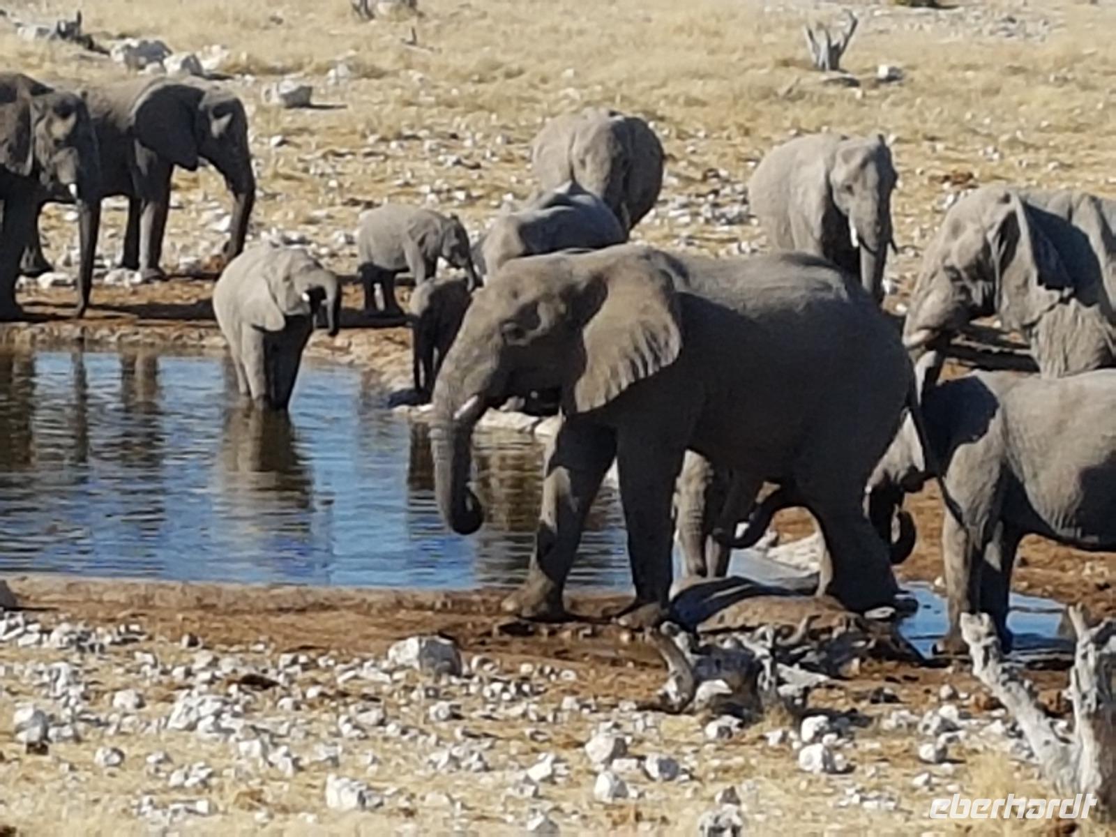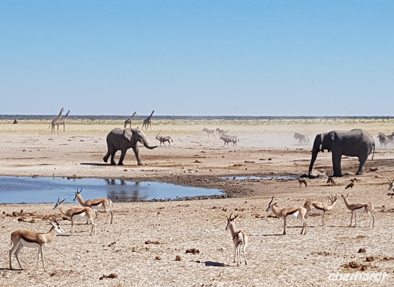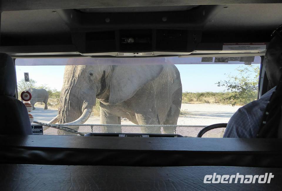 Wir sind alle bisschen aufgeregt. Heute und morgen geht unser Traum in Erfüllung. Wir werden im Etosha Nationalpark Tiere bestaunen. Die Fahrt führt durch Outio, dem Tor zum Etosha Nationalpark. Ankunft ist in einer wildromantischen Lodge, Toshari Lodge, unweit vom Eingangstor des Parks entfernt. Schon am frühen Nachmittag unternehmen wir eine erste Pirschfahrt durch den Etosha Nationalpark. Namibias berühmtester Nationalpark gehört zu den absoluten Höhepunkten unserer Reise. Typisch für den Park sind die Wasserlöcher, an denen sich Elefanten, Gnus und viele andere Tiere versammeln. Wir hatten heute Glück, da wir Strauß, Springbock, Kudu, Zebras und Giraffen sahen aber vor allem viele Elefanten und sogar einen Baby-Elefanten. So wie morgen müssen wir den Park bei Sonnenuntergang verlassen, aber der erste Eindruck unserer Pirschfahrt war grandios. Zebras sind wunderschöne Tiere, auch Onyx und Kudus. Die afrikanischen Elefanten konnten wir richtig genießen wie Sie an das Wasserloch kamen um zu trinken. Was für ein Tier! Wir hatten heute und auch morgen wieder das Glück Nashörner zu sehen. Und sogar beide! Das Spitzmaul-Nashorn sowie die Breitmail-Nashorn. Heute einfach so mitten auf der Straße (siehe Bildergalerie, um es zu glauben). Nach einem tollen afrikanischen Abendessen genossen wir wieder den Abend unter dem afrikanischen Sternenhimmel und freuten uns tierisch auf die spannenden Tiererlebnisse am nächsten Tag!