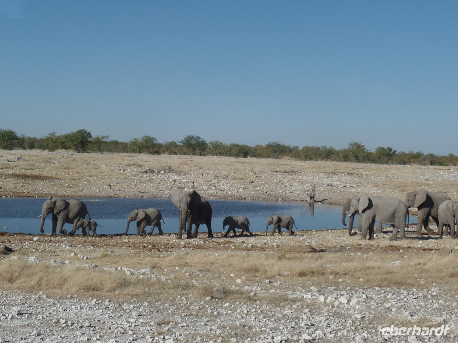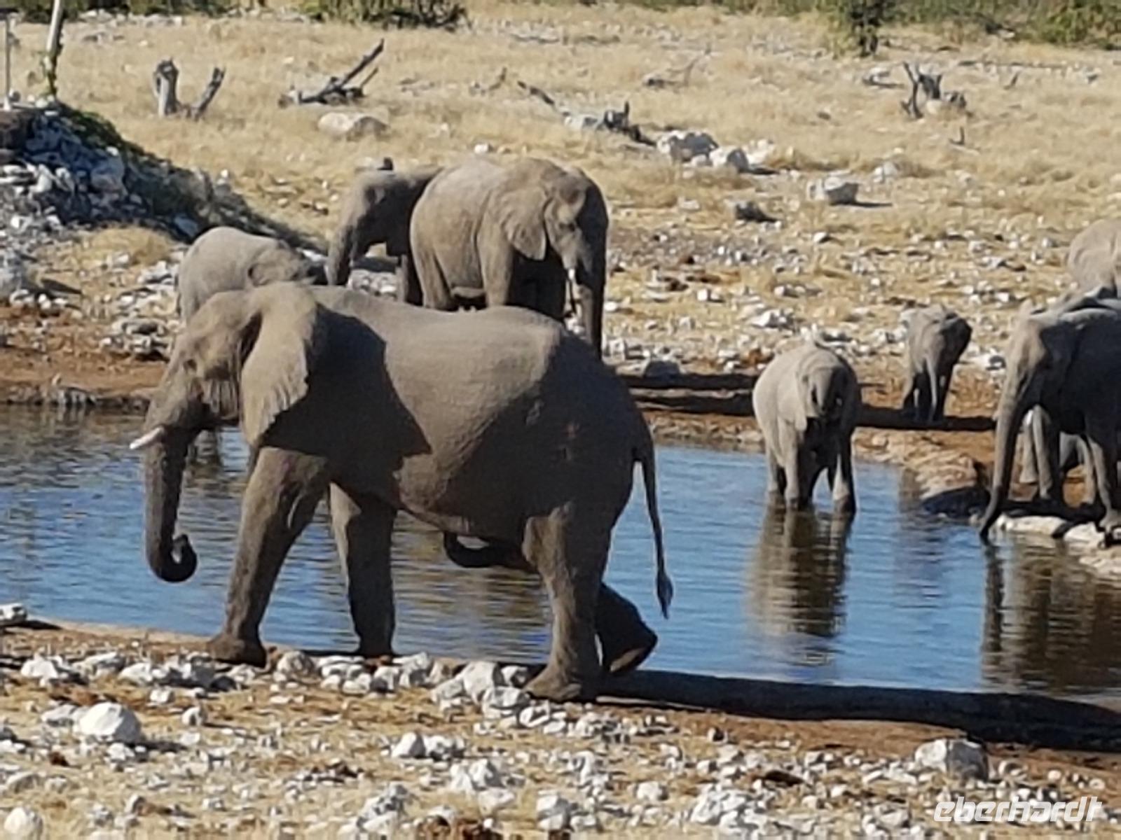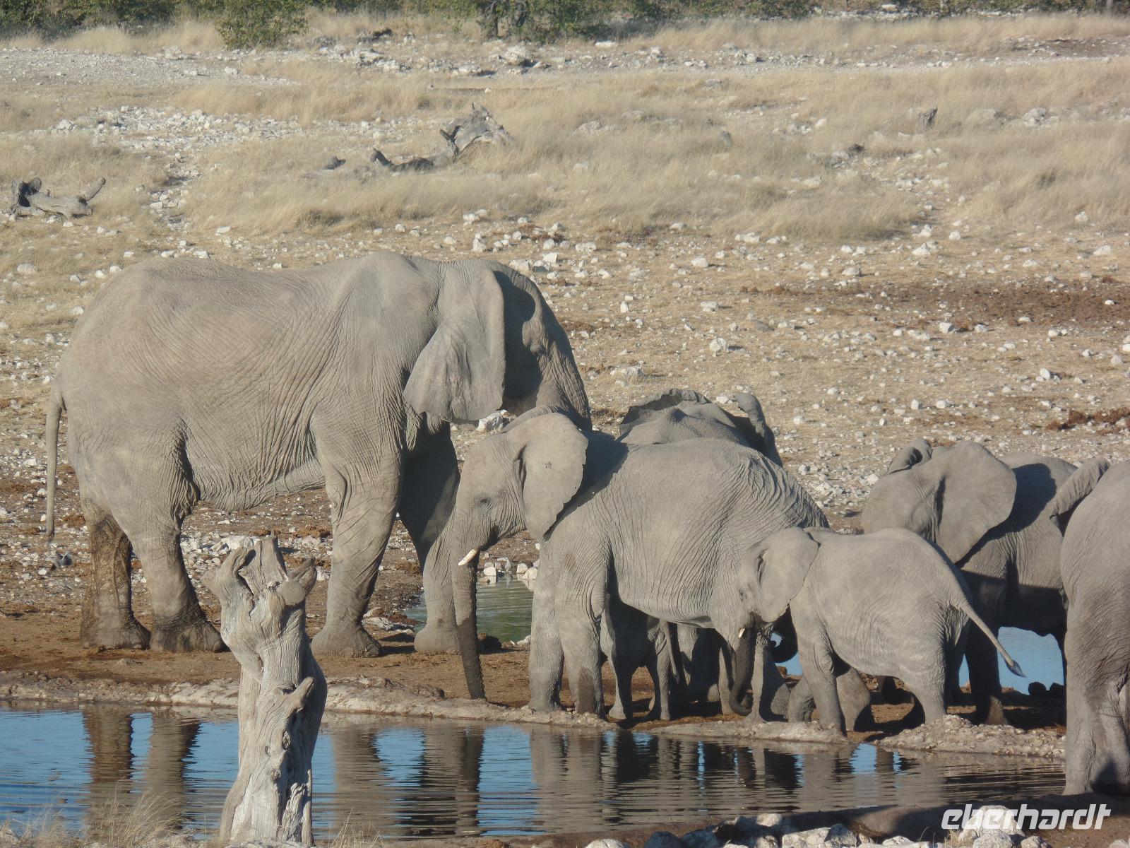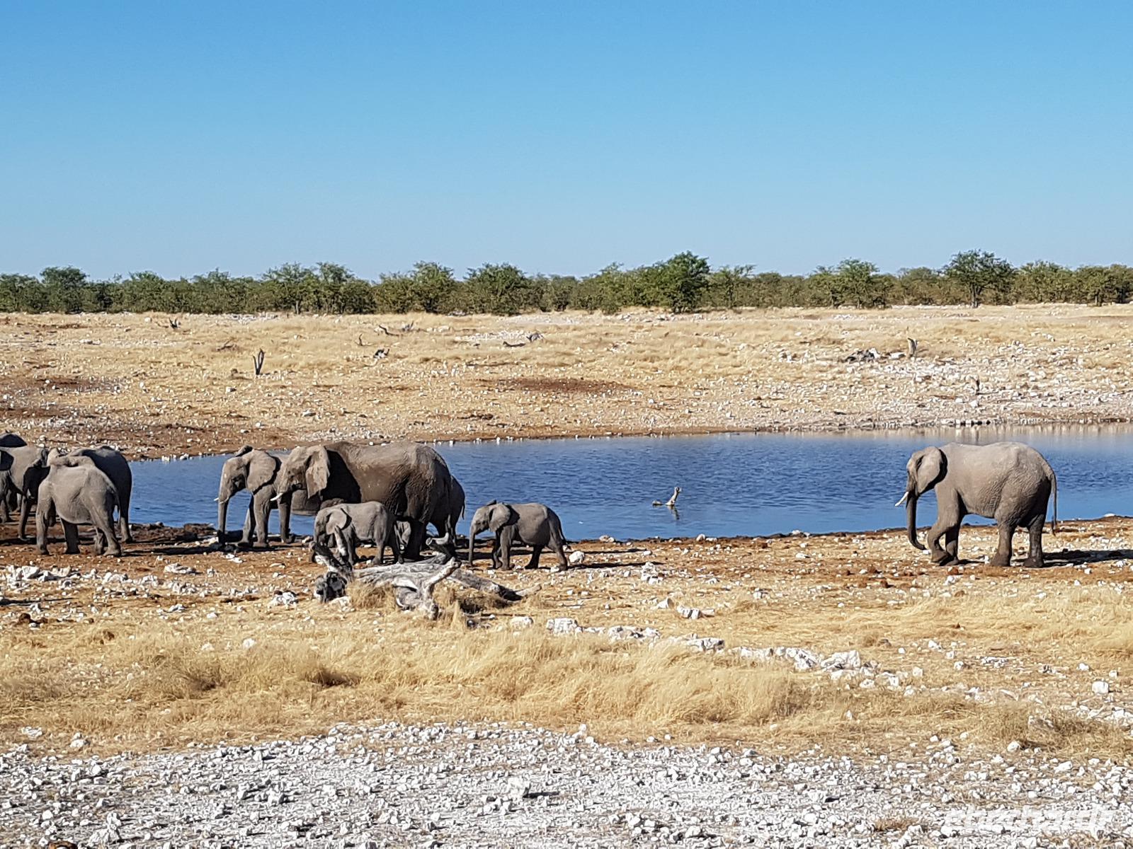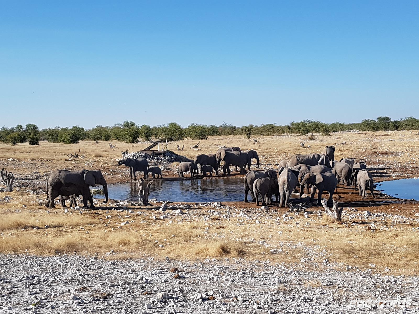 Wir sind alle bisschen aufgeregt. Heute und morgen geht unser Traum in Erfüllung. Wir werden im Etosha Nationalpark Tiere bestaunen. Die Fahrt führt durch Outio, dem Tor zum Etosha Nationalpark. Ankunft ist in einer wildromantischen Lodge, Toshari Lodge, unweit vom Eingangstor des Parks entfernt. Schon am frühen Nachmittag unternehmen wir eine erste Pirschfahrt durch den Etosha Nationalpark. Namibias berühmtester Nationalpark gehört zu den absoluten Höhepunkten unserer Reise. Typisch für den Park sind die Wasserlöcher, an denen sich Elefanten, Gnus und viele andere Tiere versammeln. Wir hatten heute Glück, da wir Strauß, Springbock, Kudu, Zebras und Giraffen sahen aber vor allem viele Elefanten und sogar einen Baby-Elefanten. So wie morgen müssen wir den Park bei Sonnenuntergang verlassen, aber der erste Eindruck unserer Pirschfahrt war grandios. Zebras sind wunderschöne Tiere, auch Onyx und Kudus. Die afrikanischen Elefanten konnten wir richtig genießen wie Sie an das Wasserloch kamen um zu trinken. Was für ein Tier! Wir hatten heute und auch morgen wieder das Glück Nashörner zu sehen. Und sogar beide! Das Spitzmaul-Nashorn sowie die Breitmail-Nashorn. Heute einfach so mitten auf der Straße (siehe Bildergalerie, um es zu glauben). Nach einem tollen afrikanischen Abendessen genossen wir wieder den Abend unter dem afrikanischen Sternenhimmel und freuten uns tierisch auf die spannenden Tiererlebnisse am nächsten Tag!