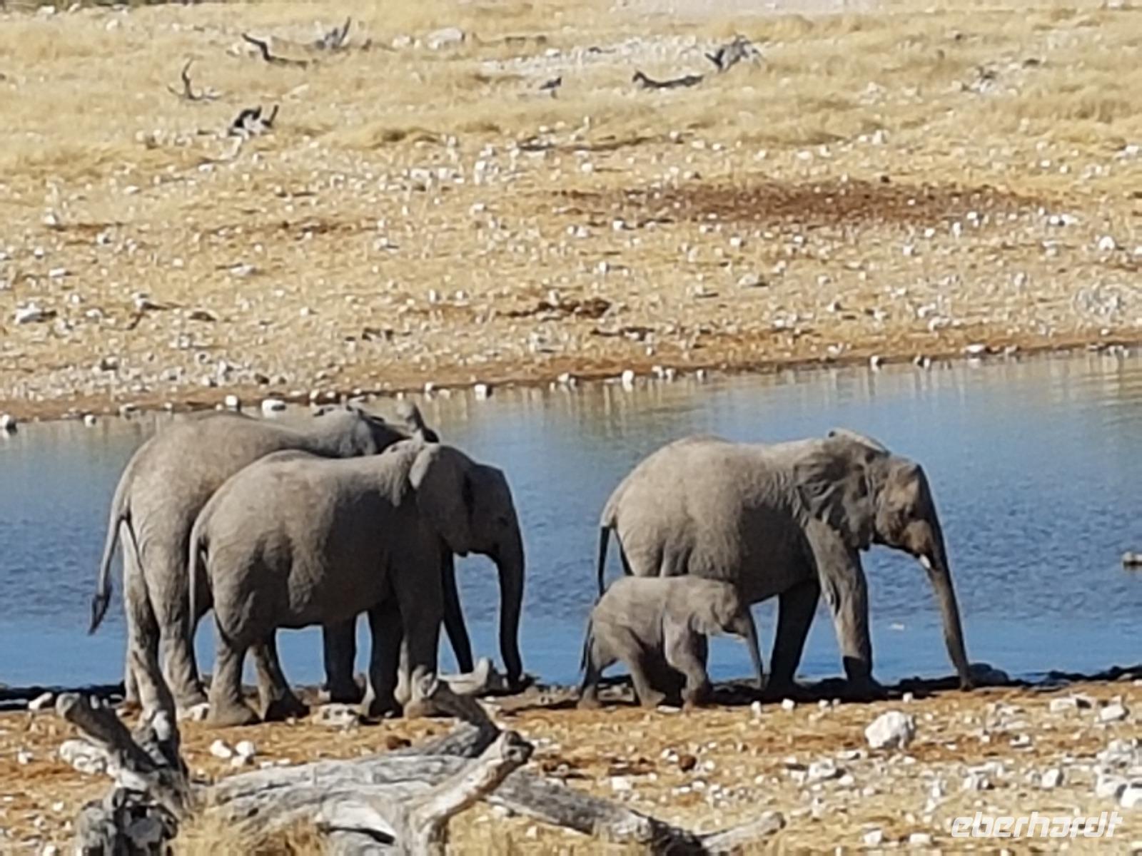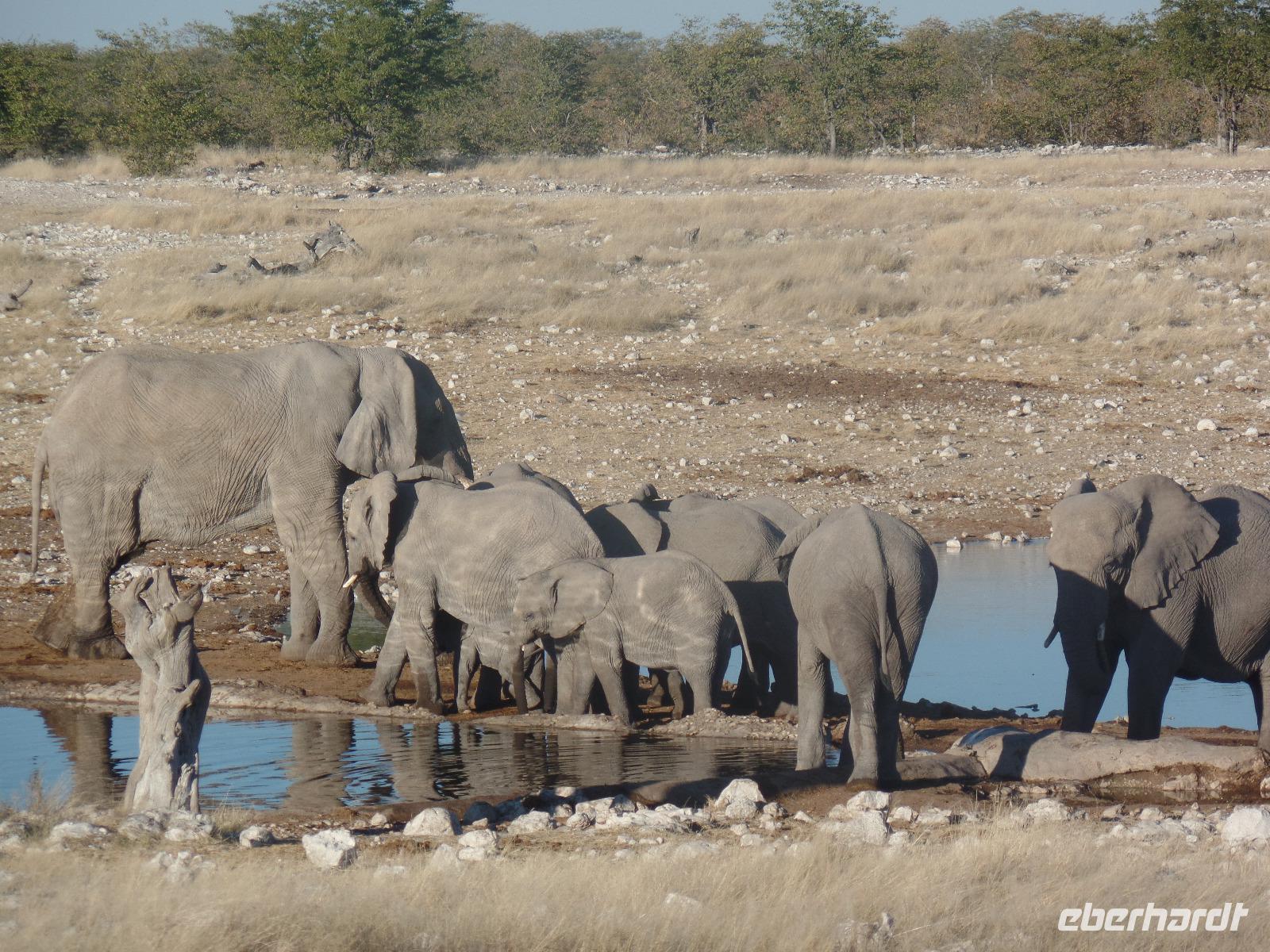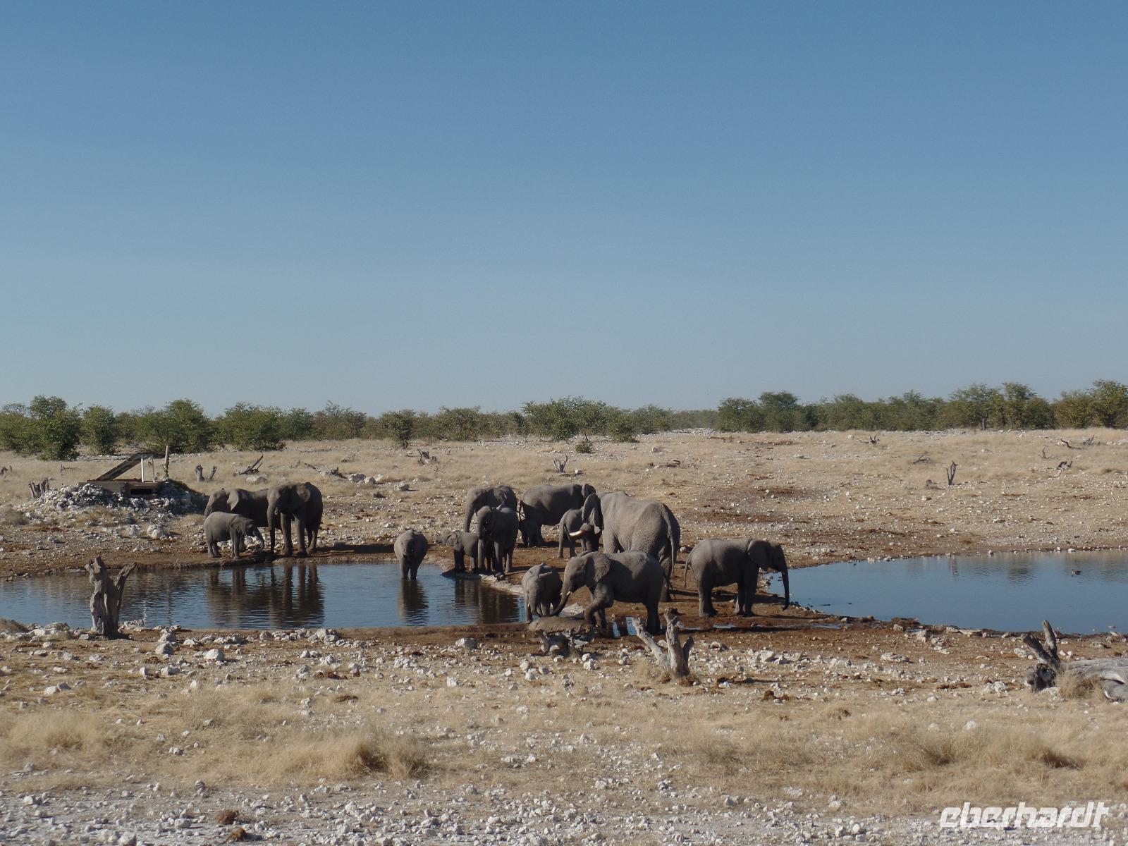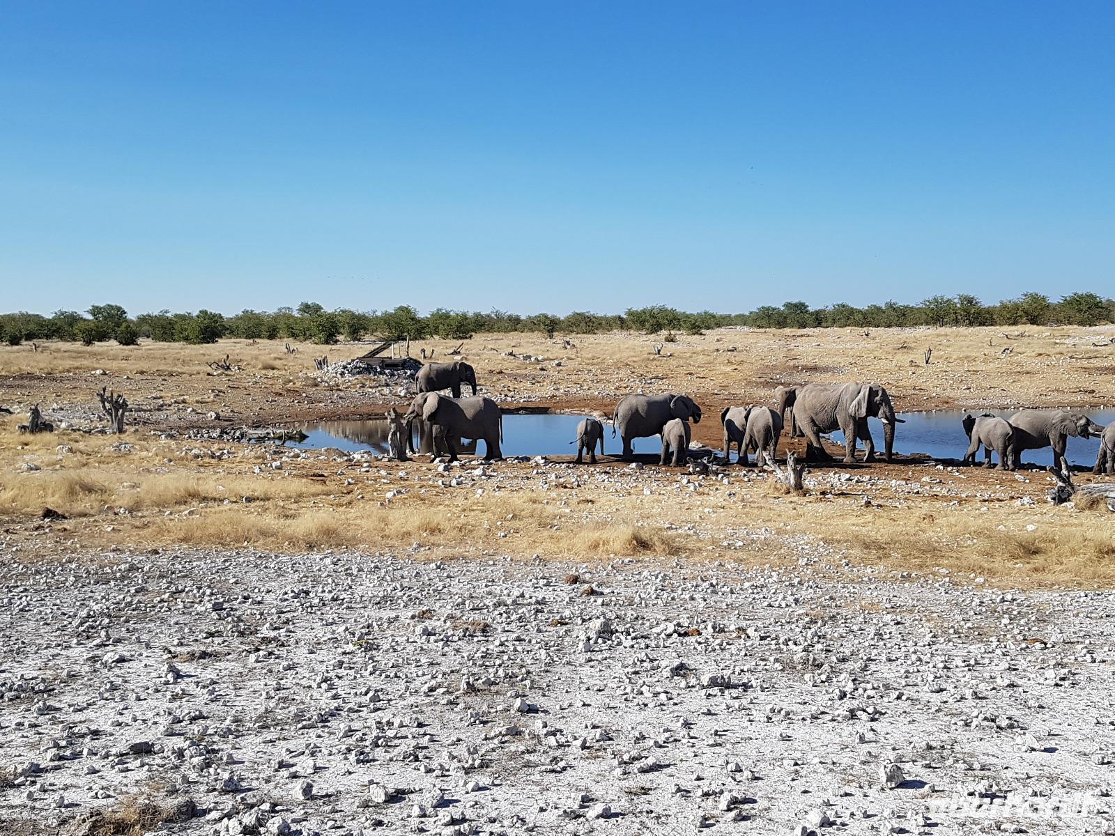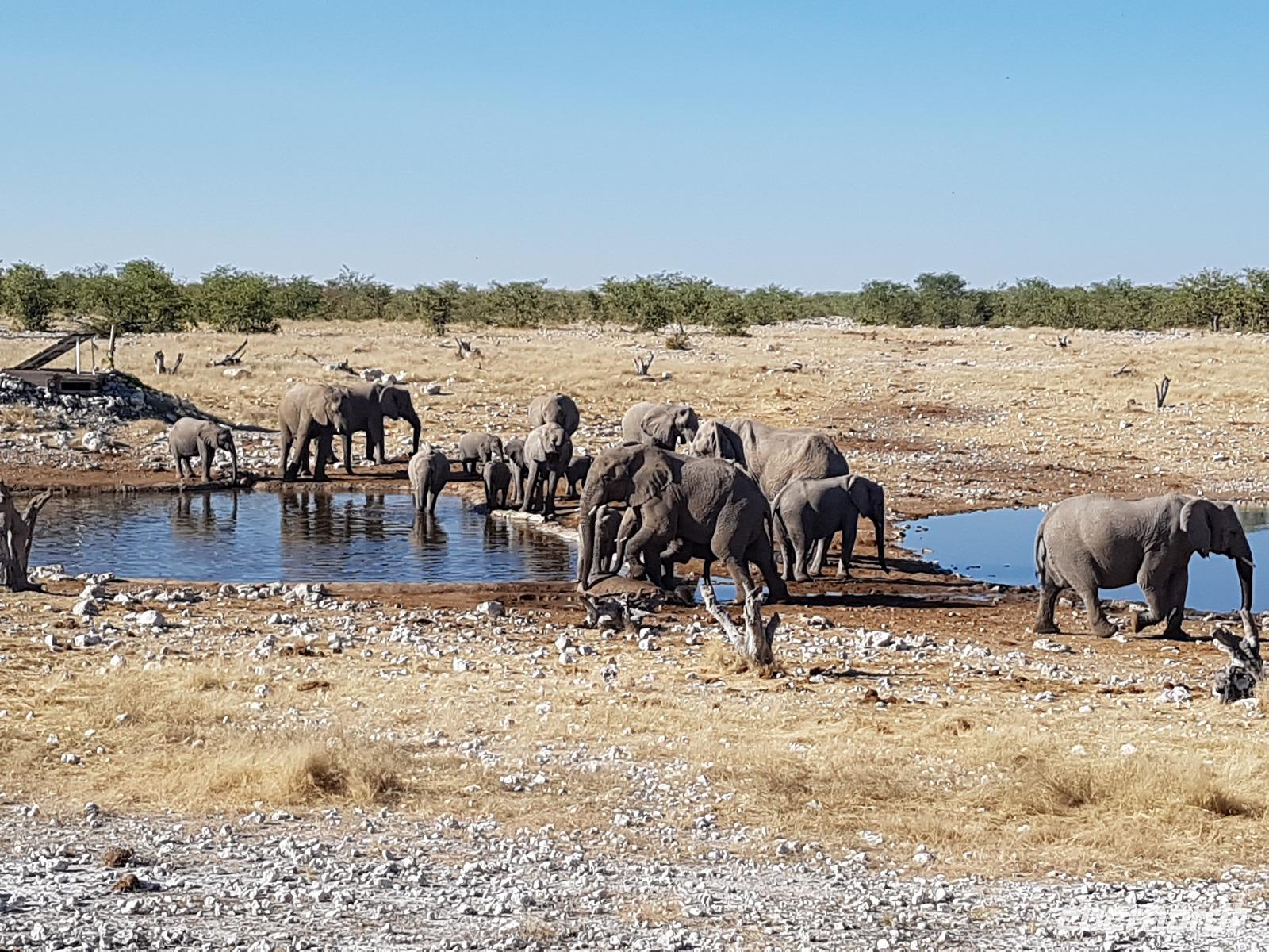 Wir sind alle bisschen aufgeregt. Heute und morgen geht unser Traum in Erfüllung. Wir werden im Etosha Nationalpark Tiere bestaunen. Die Fahrt führt durch Outio, dem Tor zum Etosha Nationalpark. Ankunft ist in einer wildromantischen Lodge, Toshari Lodge, unweit vom Eingangstor des Parks entfernt. Schon am frühen Nachmittag unternehmen wir eine erste Pirschfahrt durch den Etosha Nationalpark. Namibias berühmtester Nationalpark gehört zu den absoluten Höhepunkten unserer Reise. Typisch für den Park sind die Wasserlöcher, an denen sich Elefanten, Gnus und viele andere Tiere versammeln. Wir hatten heute Glück, da wir Strauß, Springbock, Kudu, Zebras und Giraffen sahen aber vor allem viele Elefanten und sogar einen Baby-Elefanten. So wie morgen müssen wir den Park bei Sonnenuntergang verlassen, aber der erste Eindruck unserer Pirschfahrt war grandios. Zebras sind wunderschöne Tiere, auch Onyx und Kudus. Die afrikanischen Elefanten konnten wir richtig genießen wie Sie an das Wasserloch kamen um zu trinken. Was für ein Tier! Wir hatten heute und auch morgen wieder das Glück Nashörner zu sehen. Und sogar beide! Das Spitzmaul-Nashorn sowie die Breitmail-Nashorn. Heute einfach so mitten auf der Straße (siehe Bildergalerie, um es zu glauben). Nach einem tollen afrikanischen Abendessen genossen wir wieder den Abend unter dem afrikanischen Sternenhimmel und freuten uns tierisch auf die spannenden Tiererlebnisse am nächsten Tag!