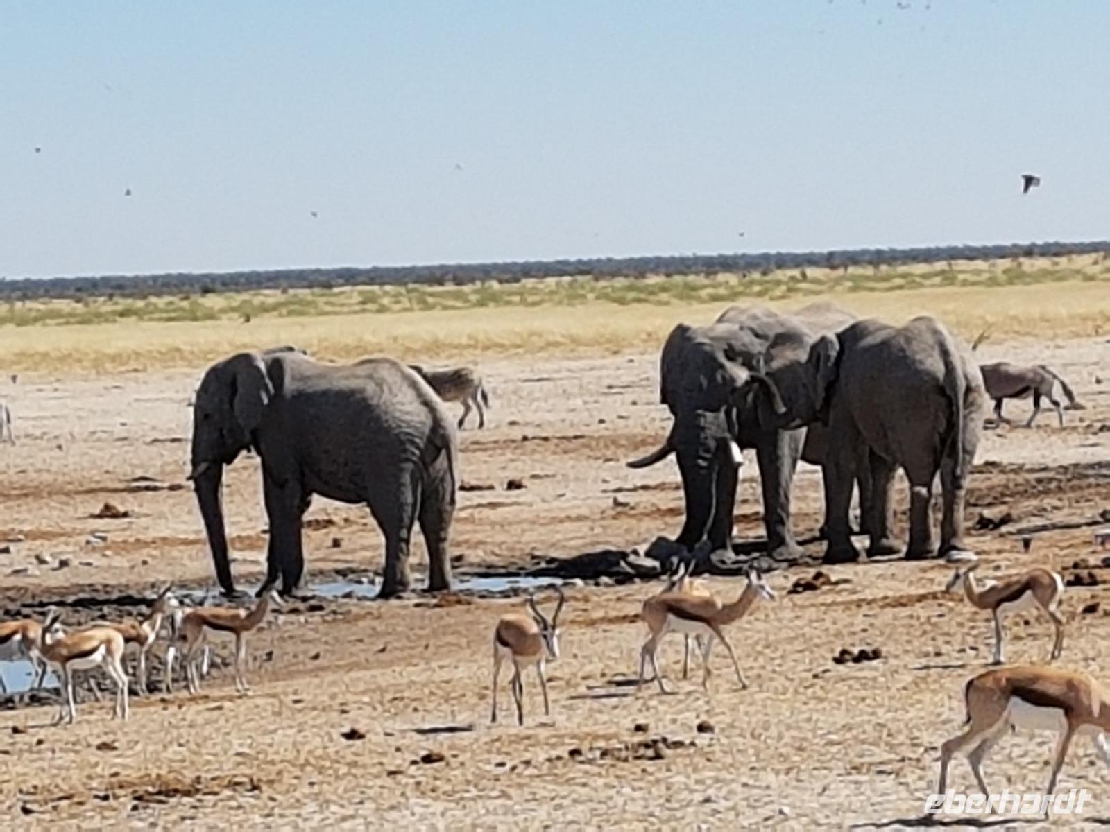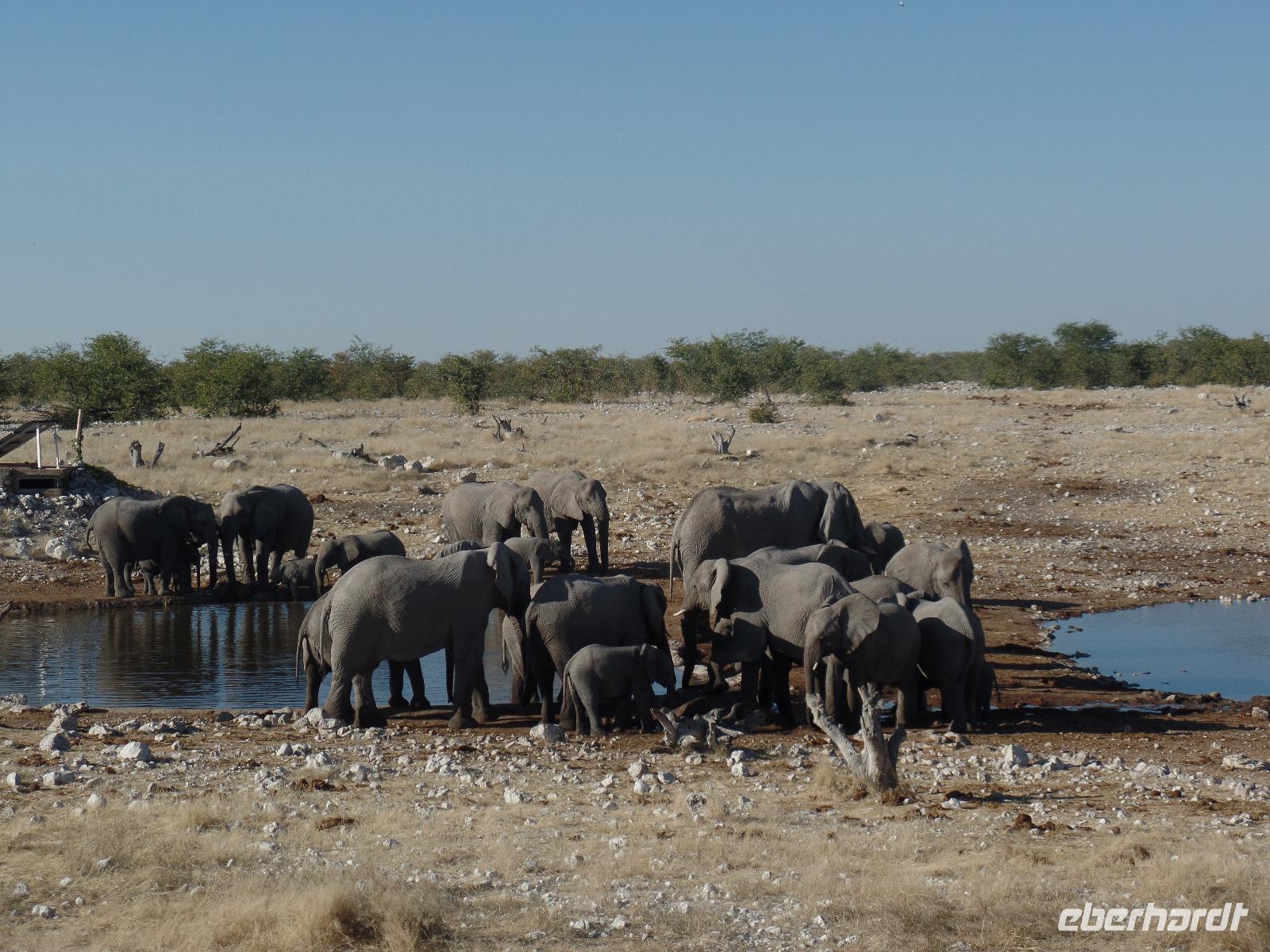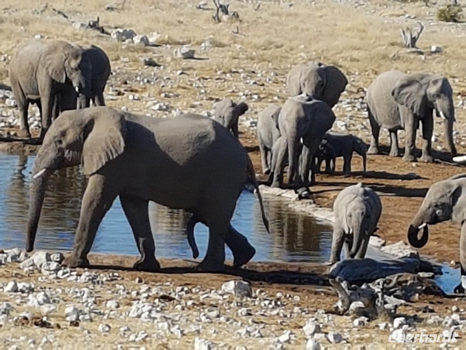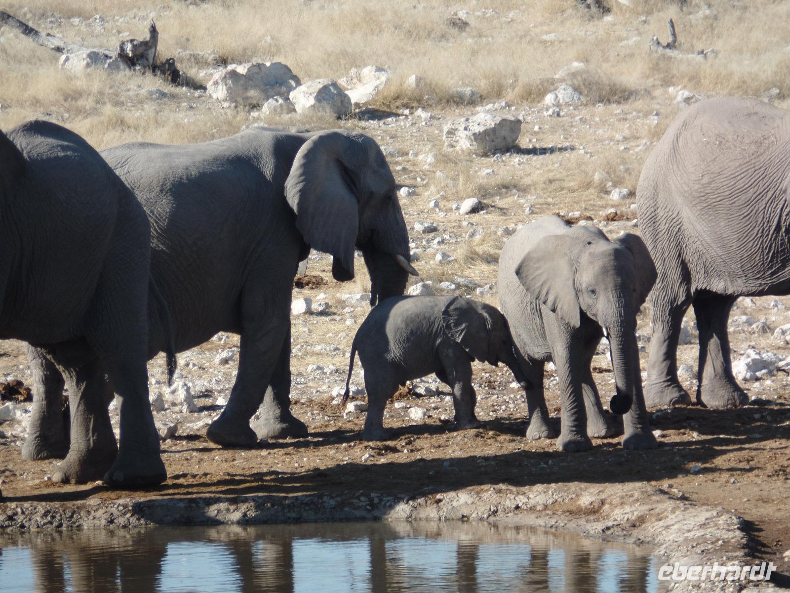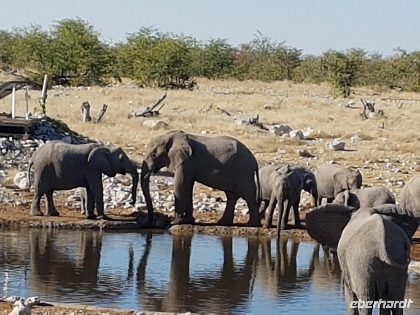 Wir sind alle bisschen aufgeregt. Heute und morgen geht unser Traum in Erfüllung. Wir werden im Etosha Nationalpark Tiere bestaunen. Die Fahrt führt durch Outio, dem Tor zum Etosha Nationalpark. Ankunft ist in einer wildromantischen Lodge, Toshari Lodge, unweit vom Eingangstor des Parks entfernt. Schon am frühen Nachmittag unternehmen wir eine erste Pirschfahrt durch den Etosha Nationalpark. Namibias berühmtester Nationalpark gehört zu den absoluten Höhepunkten unserer Reise. Typisch für den Park sind die Wasserlöcher, an denen sich Elefanten, Gnus und viele andere Tiere versammeln. Wir hatten heute Glück, da wir Strauß, Springbock, Kudu, Zebras und Giraffen sahen aber vor allem viele Elefanten und sogar einen Baby-Elefanten. So wie morgen müssen wir den Park bei Sonnenuntergang verlassen, aber der erste Eindruck unserer Pirschfahrt war grandios. Zebras sind wunderschöne Tiere, auch Onyx und Kudus. Die afrikanischen Elefanten konnten wir richtig genießen wie Sie an das Wasserloch kamen um zu trinken. Was für ein Tier! Wir hatten heute und auch morgen wieder das Glück Nashörner zu sehen. Und sogar beide! Das Spitzmaul-Nashorn sowie die Breitmail-Nashorn. Heute einfach so mitten auf der Straße (siehe Bildergalerie, um es zu glauben). Nach einem tollen afrikanischen Abendessen genossen wir wieder den Abend unter dem afrikanischen Sternenhimmel und freuten uns tierisch auf die spannenden Tiererlebnisse am nächsten Tag!