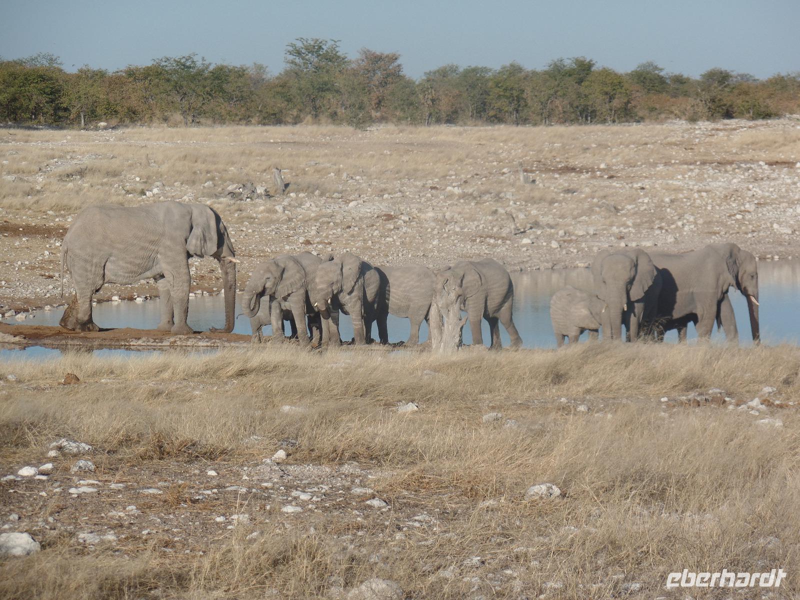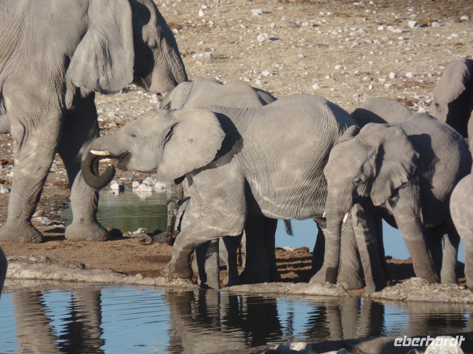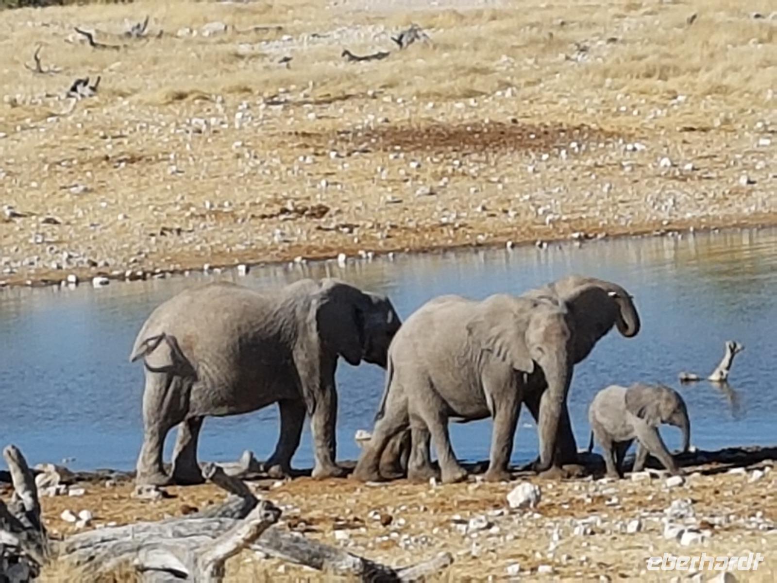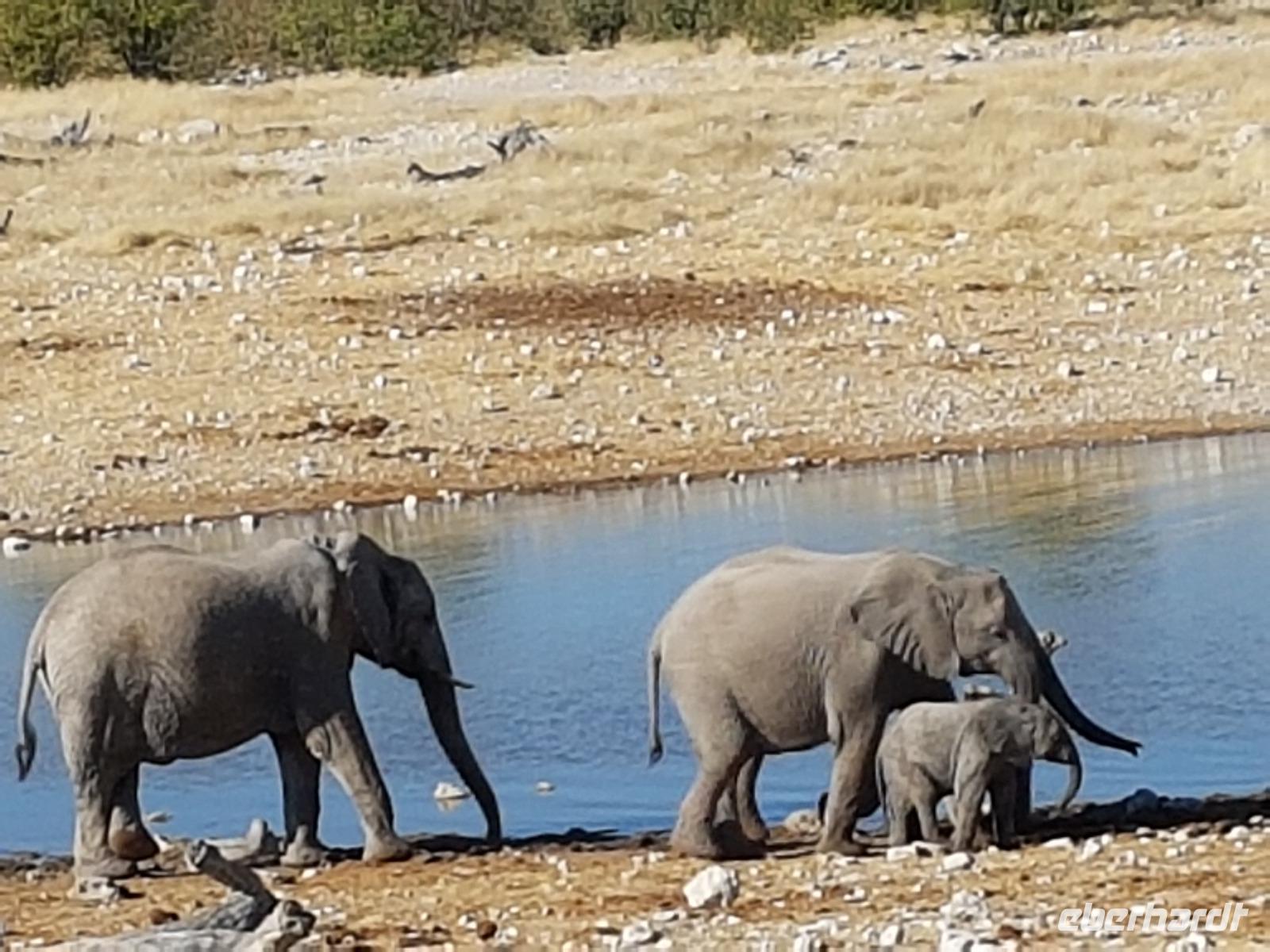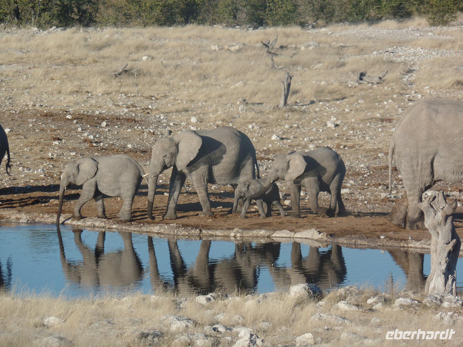 Wir sind alle bisschen aufgeregt. Heute und morgen geht unser Traum in Erfüllung. Wir werden im Etosha Nationalpark Tiere bestaunen. Die Fahrt führt durch Outio, dem Tor zum Etosha Nationalpark. Ankunft ist in einer wildromantischen Lodge, Toshari Lodge, unweit vom Eingangstor des Parks entfernt. Schon am frühen Nachmittag unternehmen wir eine erste Pirschfahrt durch den Etosha Nationalpark. Namibias berühmtester Nationalpark gehört zu den absoluten Höhepunkten unserer Reise. Typisch für den Park sind die Wasserlöcher, an denen sich Elefanten, Gnus und viele andere Tiere versammeln. Wir hatten heute Glück, da wir Strauß, Springbock, Kudu, Zebras und Giraffen sahen aber vor allem viele Elefanten und sogar einen Baby-Elefanten. So wie morgen müssen wir den Park bei Sonnenuntergang verlassen, aber der erste Eindruck unserer Pirschfahrt war grandios. Zebras sind wunderschöne Tiere, auch Onyx und Kudus. Die afrikanischen Elefanten konnten wir richtig genießen wie Sie an das Wasserloch kamen um zu trinken. Was für ein Tier! Wir hatten heute und auch morgen wieder das Glück Nashörner zu sehen. Und sogar beide! Das Spitzmaul-Nashorn sowie die Breitmail-Nashorn. Heute einfach so mitten auf der Straße (siehe Bildergalerie, um es zu glauben). Nach einem tollen afrikanischen Abendessen genossen wir wieder den Abend unter dem afrikanischen Sternenhimmel und freuten uns tierisch auf die spannenden Tiererlebnisse am nächsten Tag!