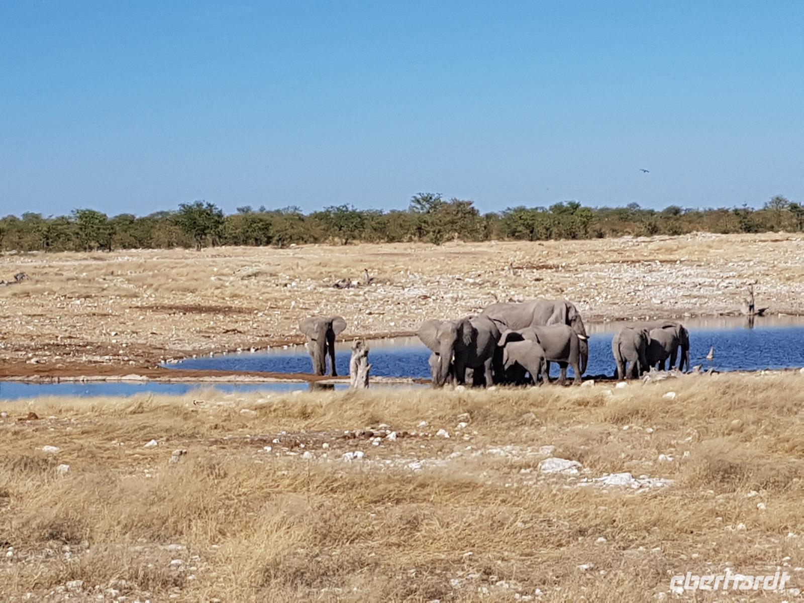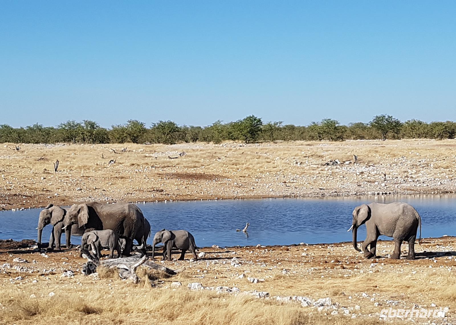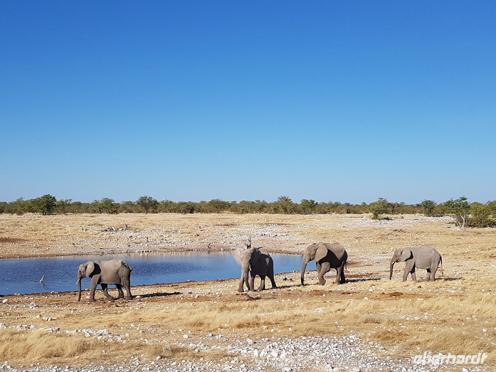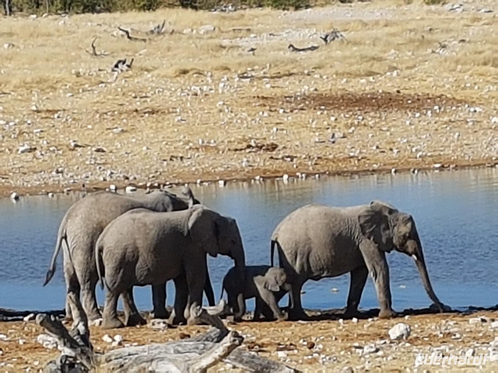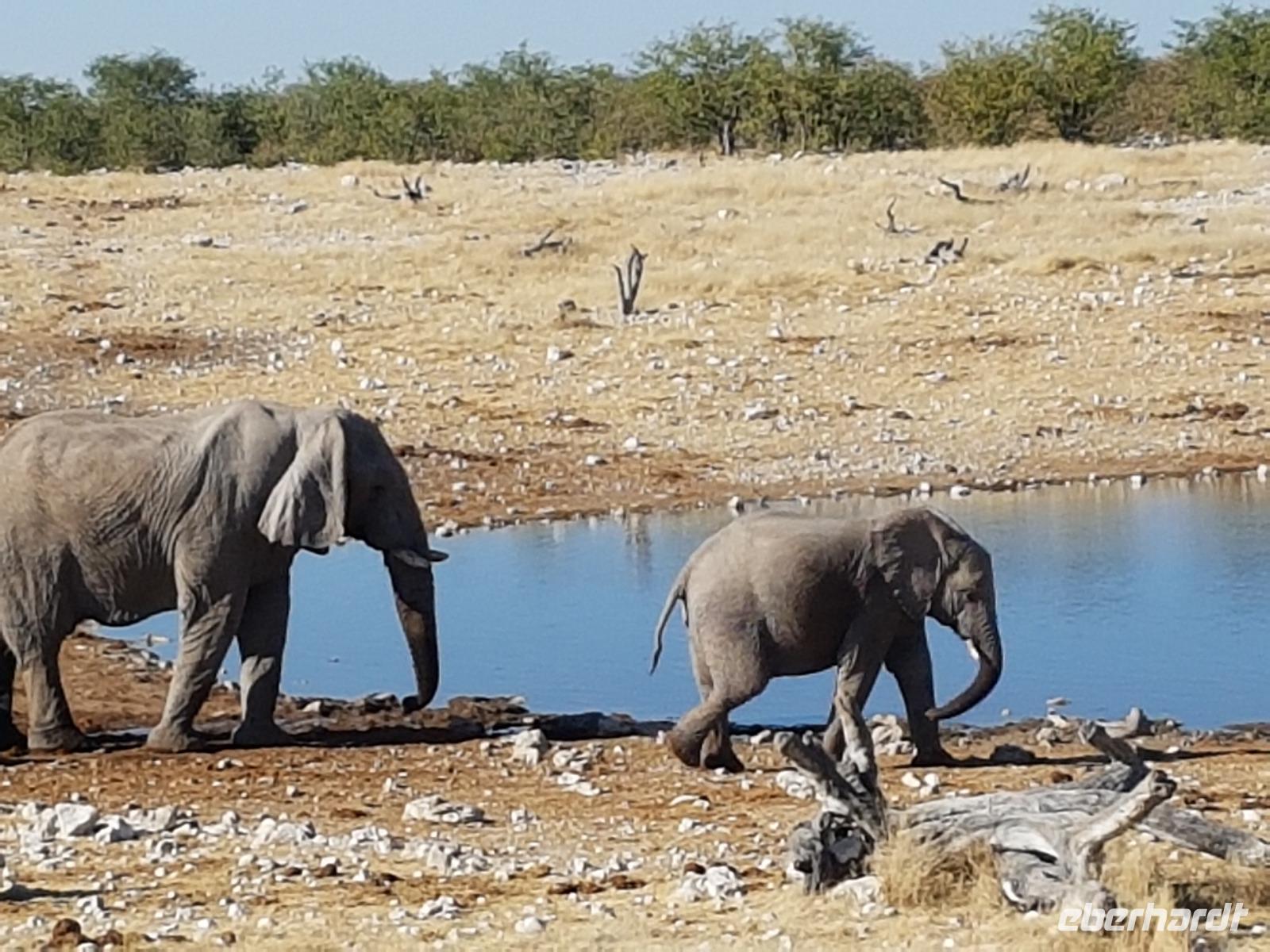 Wir sind alle bisschen aufgeregt. Heute und morgen geht unser Traum in Erfüllung. Wir werden im Etosha Nationalpark Tiere bestaunen. Die Fahrt führt durch Outio, dem Tor zum Etosha Nationalpark. Ankunft ist in einer wildromantischen Lodge, Toshari Lodge, unweit vom Eingangstor des Parks entfernt. Schon am frühen Nachmittag unternehmen wir eine erste Pirschfahrt durch den Etosha Nationalpark. Namibias berühmtester Nationalpark gehört zu den absoluten Höhepunkten unserer Reise. Typisch für den Park sind die Wasserlöcher, an denen sich Elefanten, Gnus und viele andere Tiere versammeln. Wir hatten heute Glück, da wir Strauß, Springbock, Kudu, Zebras und Giraffen sahen aber vor allem viele Elefanten und sogar einen Baby-Elefanten. So wie morgen müssen wir den Park bei Sonnenuntergang verlassen, aber der erste Eindruck unserer Pirschfahrt war grandios. Zebras sind wunderschöne Tiere, auch Onyx und Kudus. Die afrikanischen Elefanten konnten wir richtig genießen wie Sie an das Wasserloch kamen um zu trinken. Was für ein Tier! Wir hatten heute und auch morgen wieder das Glück Nashörner zu sehen. Und sogar beide! Das Spitzmaul-Nashorn sowie die Breitmail-Nashorn. Heute einfach so mitten auf der Straße (siehe Bildergalerie, um es zu glauben). Nach einem tollen afrikanischen Abendessen genossen wir wieder den Abend unter dem afrikanischen Sternenhimmel und freuten uns tierisch auf die spannenden Tiererlebnisse am nächsten Tag!