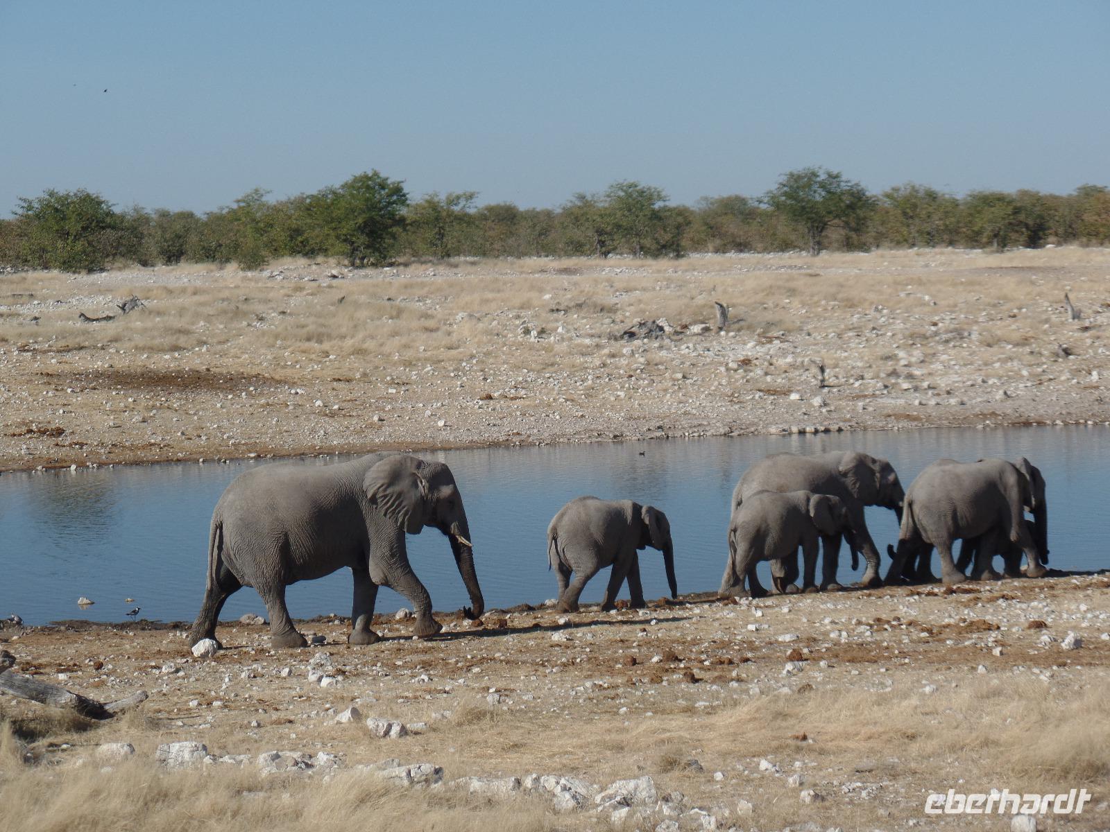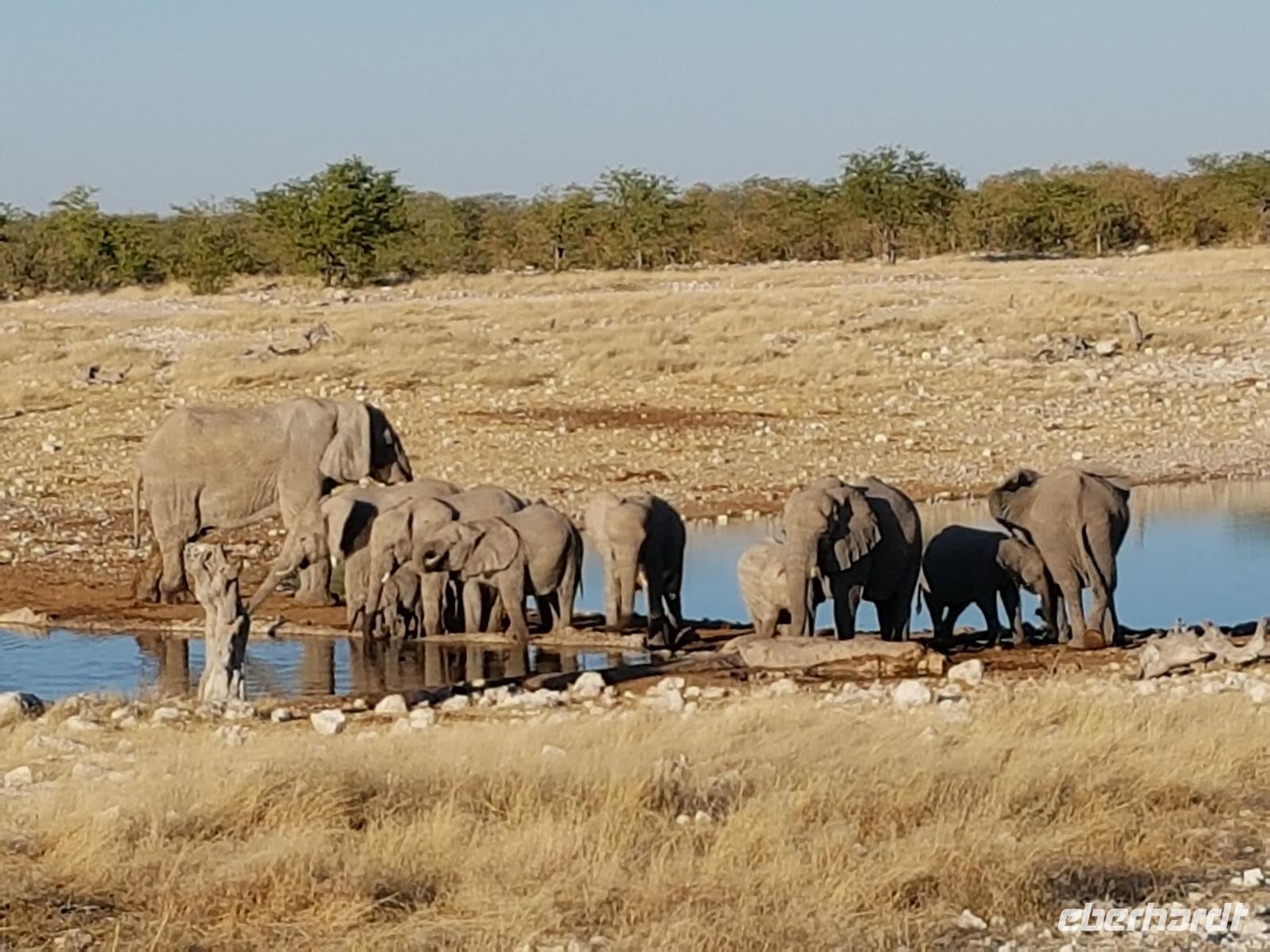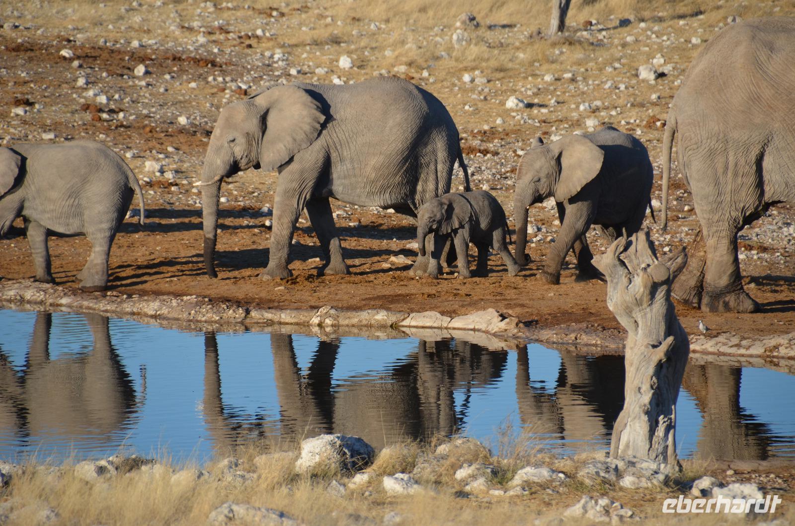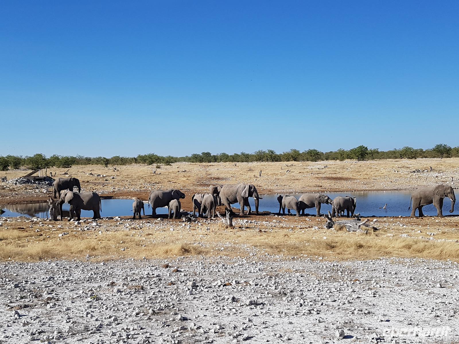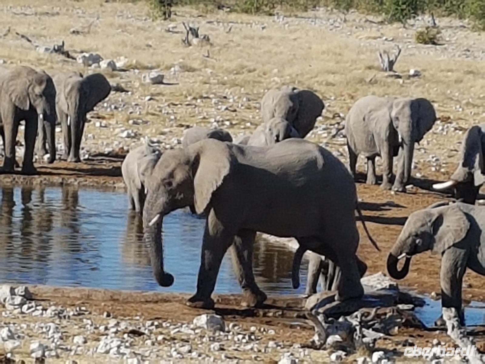 Wir sind alle bisschen aufgeregt. Heute und morgen geht unser Traum in Erfüllung. Wir werden im Etosha Nationalpark Tiere bestaunen. Die Fahrt führt durch Outio, dem Tor zum Etosha Nationalpark. Ankunft ist in einer wildromantischen Lodge, Toshari Lodge, unweit vom Eingangstor des Parks entfernt. Schon am frühen Nachmittag unternehmen wir eine erste Pirschfahrt durch den Etosha Nationalpark. Namibias berühmtester Nationalpark gehört zu den absoluten Höhepunkten unserer Reise. Typisch für den Park sind die Wasserlöcher, an denen sich Elefanten, Gnus und viele andere Tiere versammeln. Wir hatten heute Glück, da wir Strauß, Springbock, Kudu, Zebras und Giraffen sahen aber vor allem viele Elefanten und sogar einen Baby-Elefanten. So wie morgen müssen wir den Park bei Sonnenuntergang verlassen, aber der erste Eindruck unserer Pirschfahrt war grandios. Zebras sind wunderschöne Tiere, auch Onyx und Kudus. Die afrikanischen Elefanten konnten wir richtig genießen wie Sie an das Wasserloch kamen um zu trinken. Was für ein Tier! Wir hatten heute und auch morgen wieder das Glück Nashörner zu sehen. Und sogar beide! Das Spitzmaul-Nashorn sowie die Breitmail-Nashorn. Heute einfach so mitten auf der Straße (siehe Bildergalerie, um es zu glauben). Nach einem tollen afrikanischen Abendessen genossen wir wieder den Abend unter dem afrikanischen Sternenhimmel und freuten uns tierisch auf die spannenden Tiererlebnisse am nächsten Tag!