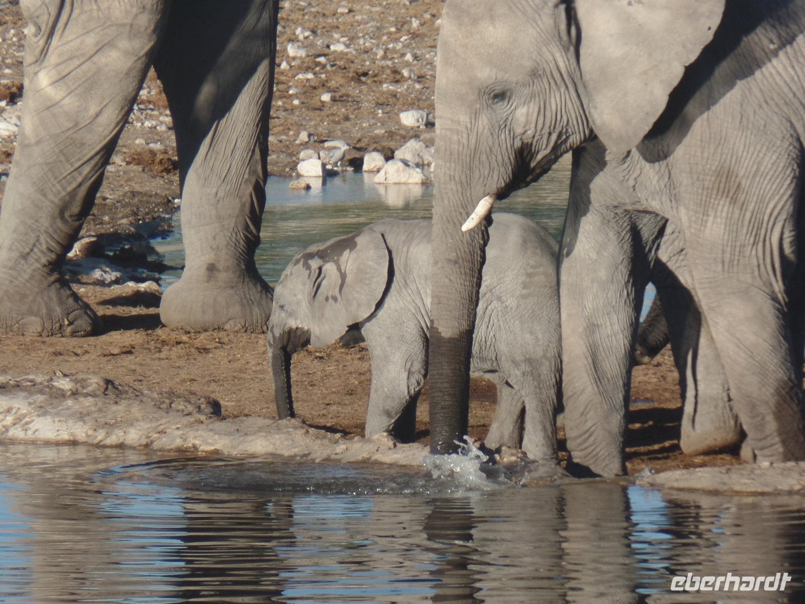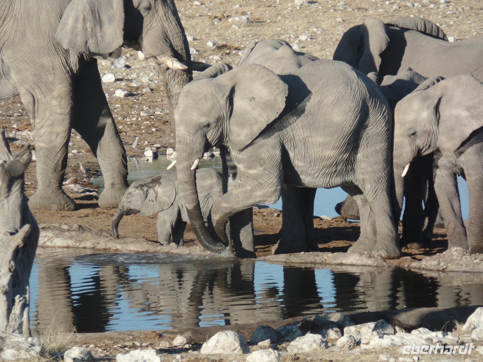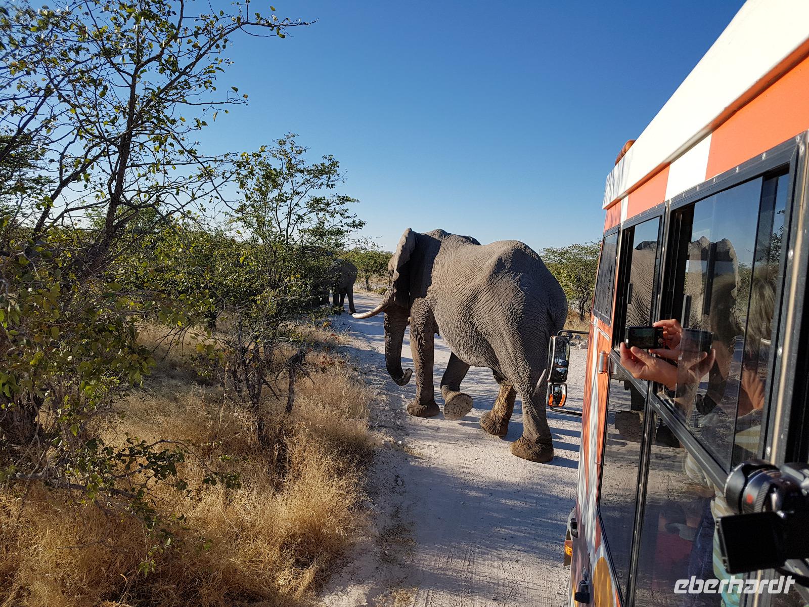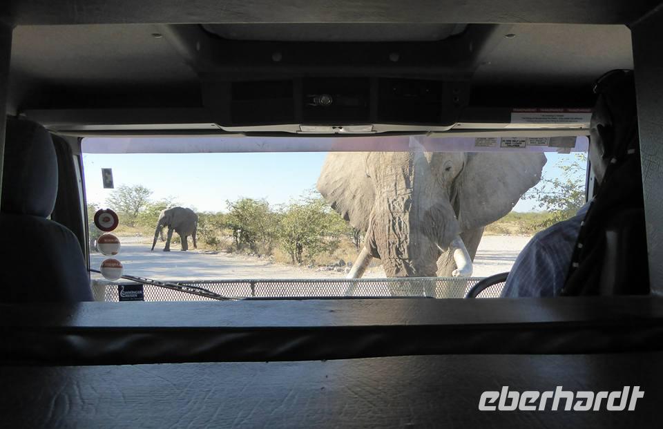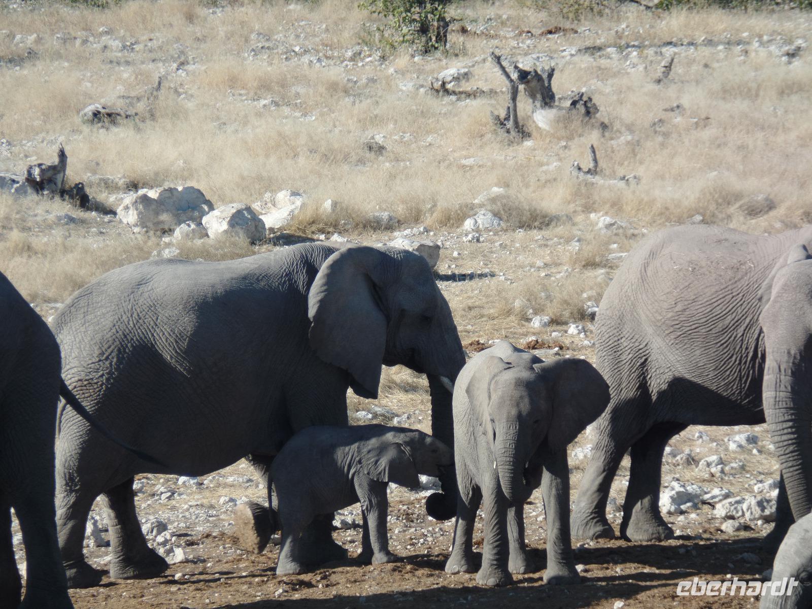 Wir sind alle bisschen aufgeregt. Heute und morgen geht unser Traum in Erfüllung. Wir werden im Etosha Nationalpark Tiere bestaunen. Die Fahrt führt durch Outio, dem Tor zum Etosha Nationalpark. Ankunft ist in einer wildromantischen Lodge, Toshari Lodge, unweit vom Eingangstor des Parks entfernt. Schon am frühen Nachmittag unternehmen wir eine erste Pirschfahrt durch den Etosha Nationalpark. Namibias berühmtester Nationalpark gehört zu den absoluten Höhepunkten unserer Reise. Typisch für den Park sind die Wasserlöcher, an denen sich Elefanten, Gnus und viele andere Tiere versammeln. Wir hatten heute Glück, da wir Strauß, Springbock, Kudu, Zebras und Giraffen sahen aber vor allem viele Elefanten und sogar einen Baby-Elefanten. So wie morgen müssen wir den Park bei Sonnenuntergang verlassen, aber der erste Eindruck unserer Pirschfahrt war grandios. Zebras sind wunderschöne Tiere, auch Onyx und Kudus. Die afrikanischen Elefanten konnten wir richtig genießen wie Sie an das Wasserloch kamen um zu trinken. Was für ein Tier! Wir hatten heute und auch morgen wieder das Glück Nashörner zu sehen. Und sogar beide! Das Spitzmaul-Nashorn sowie die Breitmail-Nashorn. Heute einfach so mitten auf der Straße (siehe Bildergalerie, um es zu glauben). Nach einem tollen afrikanischen Abendessen genossen wir wieder den Abend unter dem afrikanischen Sternenhimmel und freuten uns tierisch auf die spannenden Tiererlebnisse am nächsten Tag!