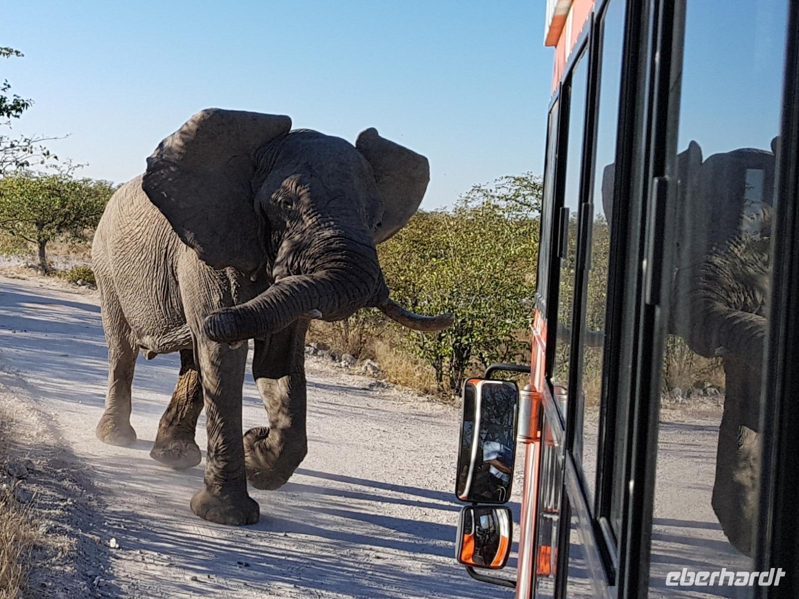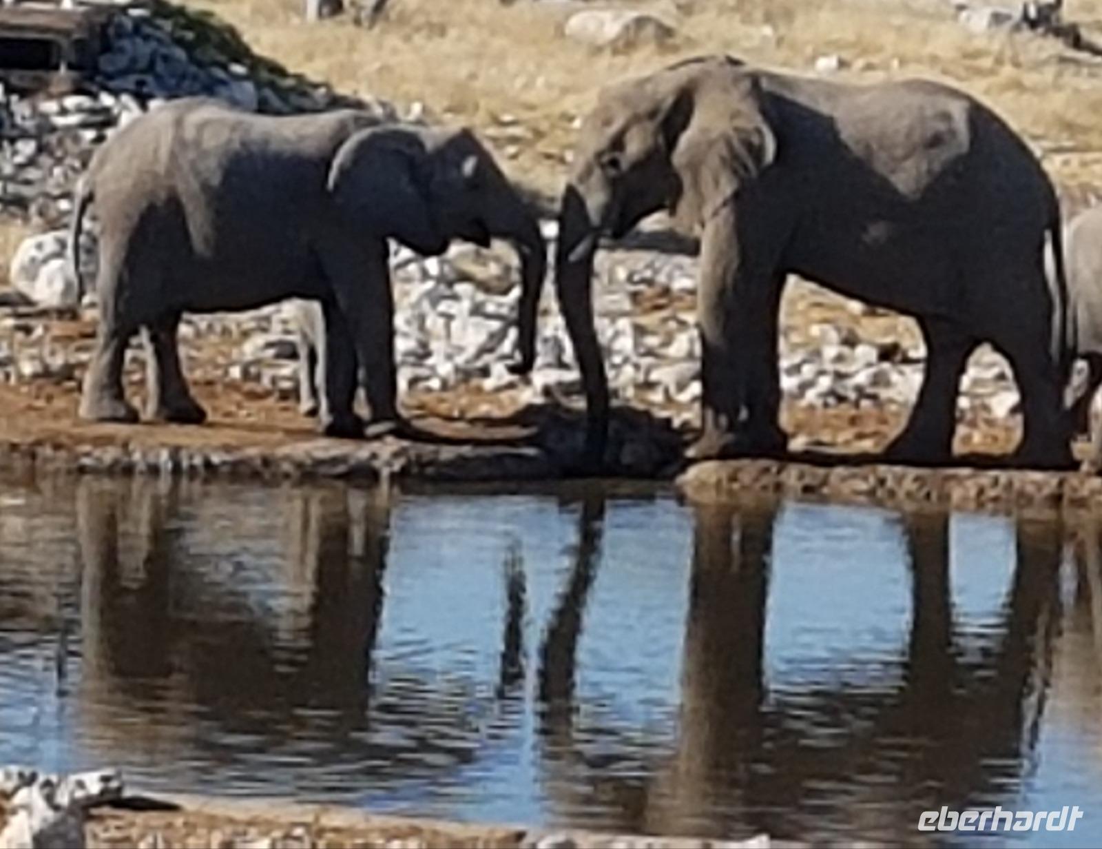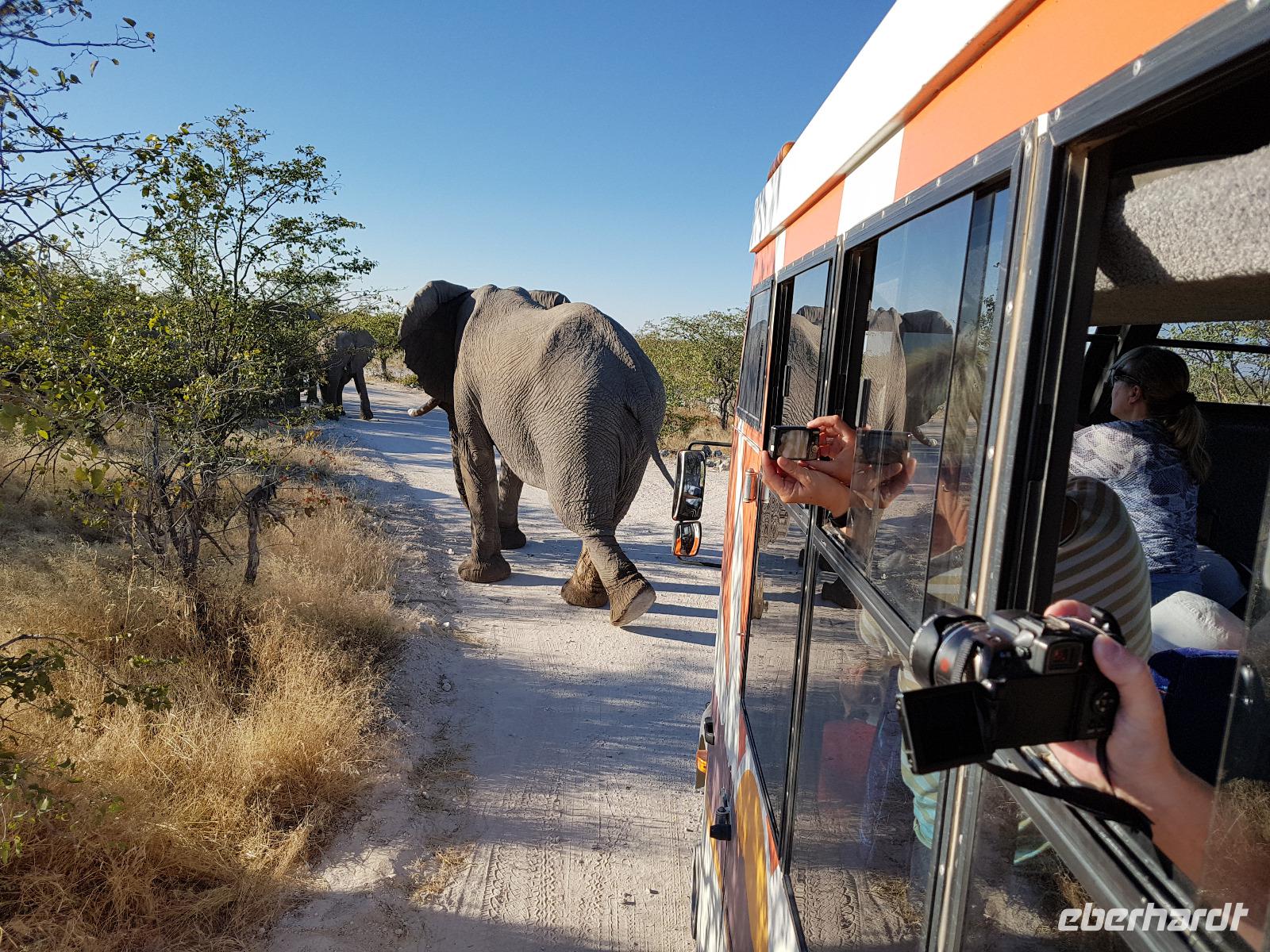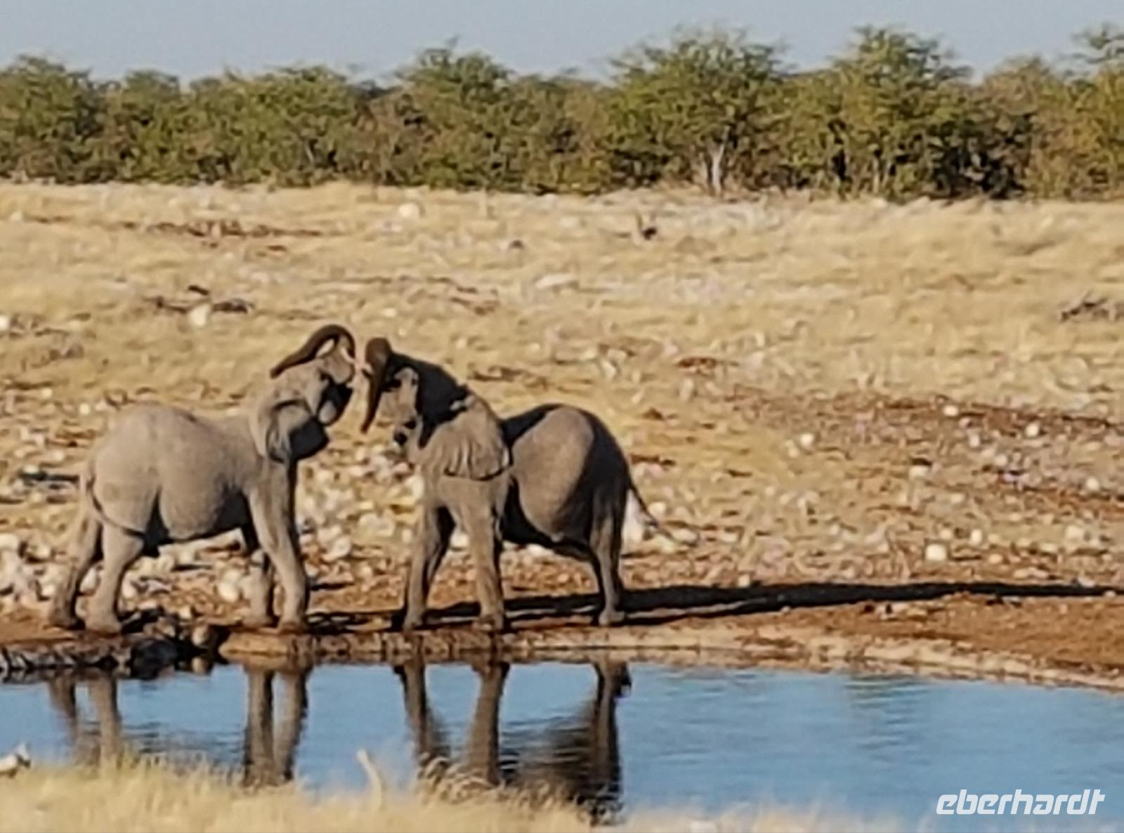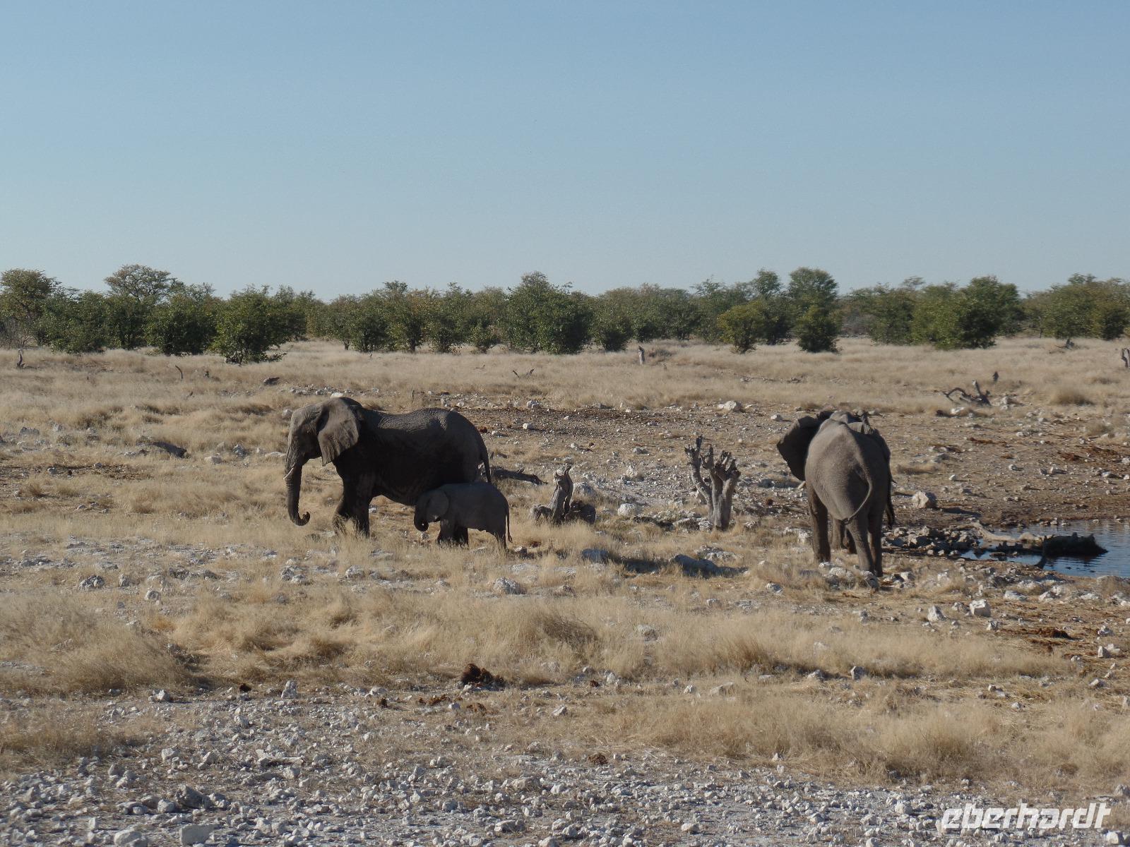 Wir sind alle bisschen aufgeregt. Heute und morgen geht unser Traum in Erfüllung. Wir werden im Etosha Nationalpark Tiere bestaunen. Die Fahrt führt durch Outio, dem Tor zum Etosha Nationalpark. Ankunft ist in einer wildromantischen Lodge, Toshari Lodge, unweit vom Eingangstor des Parks entfernt. Schon am frühen Nachmittag unternehmen wir eine erste Pirschfahrt durch den Etosha Nationalpark. Namibias berühmtester Nationalpark gehört zu den absoluten Höhepunkten unserer Reise. Typisch für den Park sind die Wasserlöcher, an denen sich Elefanten, Gnus und viele andere Tiere versammeln. Wir hatten heute Glück, da wir Strauß, Springbock, Kudu, Zebras und Giraffen sahen aber vor allem viele Elefanten und sogar einen Baby-Elefanten. So wie morgen müssen wir den Park bei Sonnenuntergang verlassen, aber der erste Eindruck unserer Pirschfahrt war grandios. Zebras sind wunderschöne Tiere, auch Onyx und Kudus. Die afrikanischen Elefanten konnten wir richtig genießen wie Sie an das Wasserloch kamen um zu trinken. Was für ein Tier! Wir hatten heute und auch morgen wieder das Glück Nashörner zu sehen. Und sogar beide! Das Spitzmaul-Nashorn sowie die Breitmail-Nashorn. Heute einfach so mitten auf der Straße (siehe Bildergalerie, um es zu glauben). Nach einem tollen afrikanischen Abendessen genossen wir wieder den Abend unter dem afrikanischen Sternenhimmel und freuten uns tierisch auf die spannenden Tiererlebnisse am nächsten Tag!