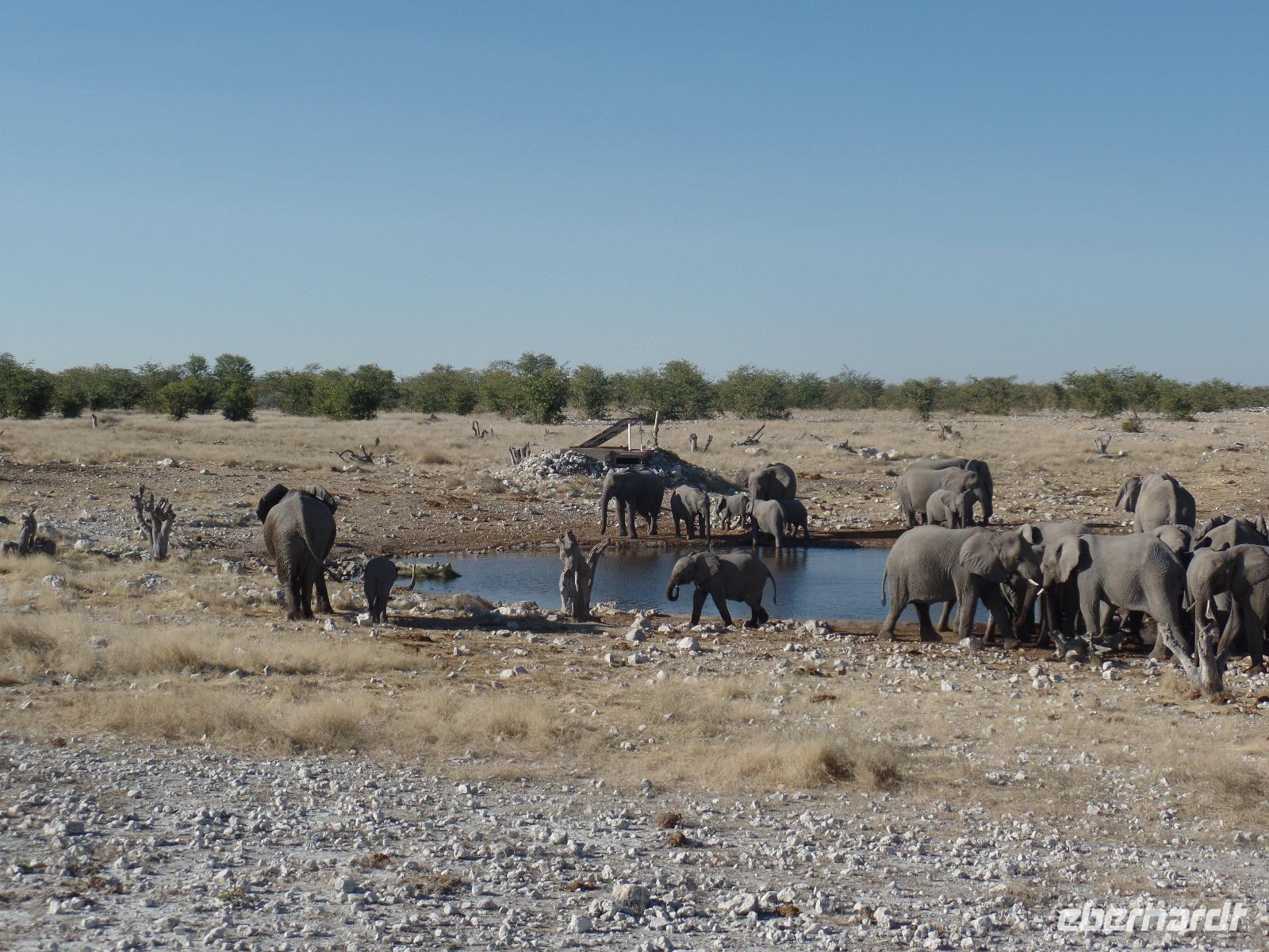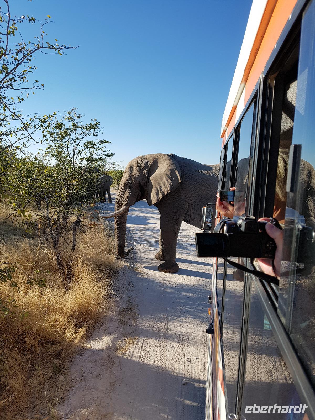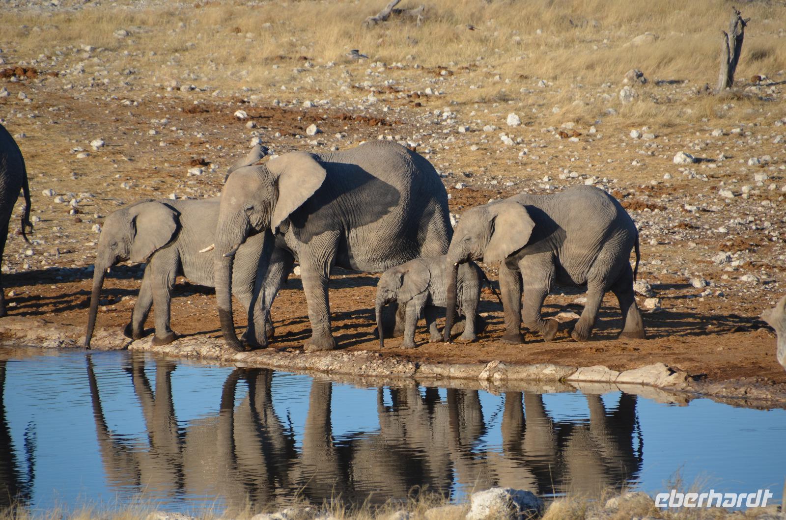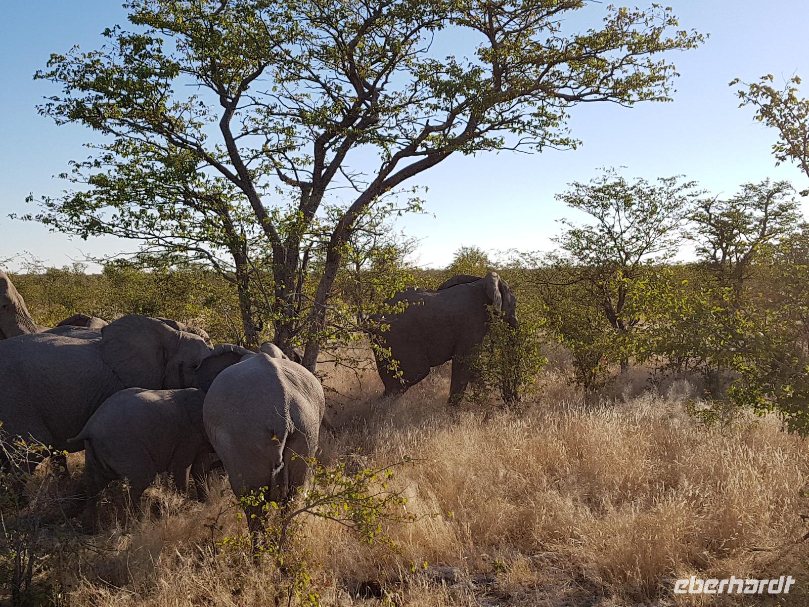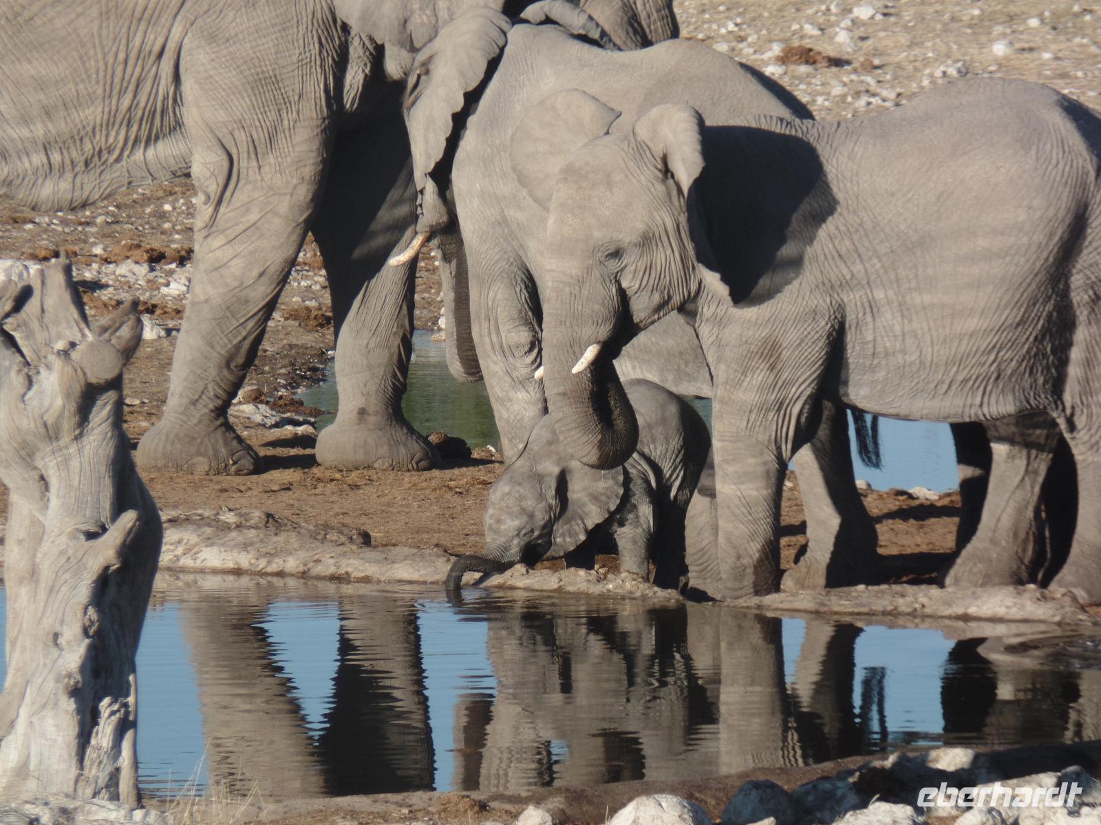 Wir sind alle bisschen aufgeregt. Heute und morgen geht unser Traum in Erfüllung. Wir werden im Etosha Nationalpark Tiere bestaunen. Die Fahrt führt durch Outio, dem Tor zum Etosha Nationalpark. Ankunft ist in einer wildromantischen Lodge, Toshari Lodge, unweit vom Eingangstor des Parks entfernt. Schon am frühen Nachmittag unternehmen wir eine erste Pirschfahrt durch den Etosha Nationalpark. Namibias berühmtester Nationalpark gehört zu den absoluten Höhepunkten unserer Reise. Typisch für den Park sind die Wasserlöcher, an denen sich Elefanten, Gnus und viele andere Tiere versammeln. Wir hatten heute Glück, da wir Strauß, Springbock, Kudu, Zebras und Giraffen sahen aber vor allem viele Elefanten und sogar einen Baby-Elefanten. So wie morgen müssen wir den Park bei Sonnenuntergang verlassen, aber der erste Eindruck unserer Pirschfahrt war grandios. Zebras sind wunderschöne Tiere, auch Onyx und Kudus. Die afrikanischen Elefanten konnten wir richtig genießen wie Sie an das Wasserloch kamen um zu trinken. Was für ein Tier! Wir hatten heute und auch morgen wieder das Glück Nashörner zu sehen. Und sogar beide! Das Spitzmaul-Nashorn sowie die Breitmail-Nashorn. Heute einfach so mitten auf der Straße (siehe Bildergalerie, um es zu glauben). Nach einem tollen afrikanischen Abendessen genossen wir wieder den Abend unter dem afrikanischen Sternenhimmel und freuten uns tierisch auf die spannenden Tiererlebnisse am nächsten Tag!