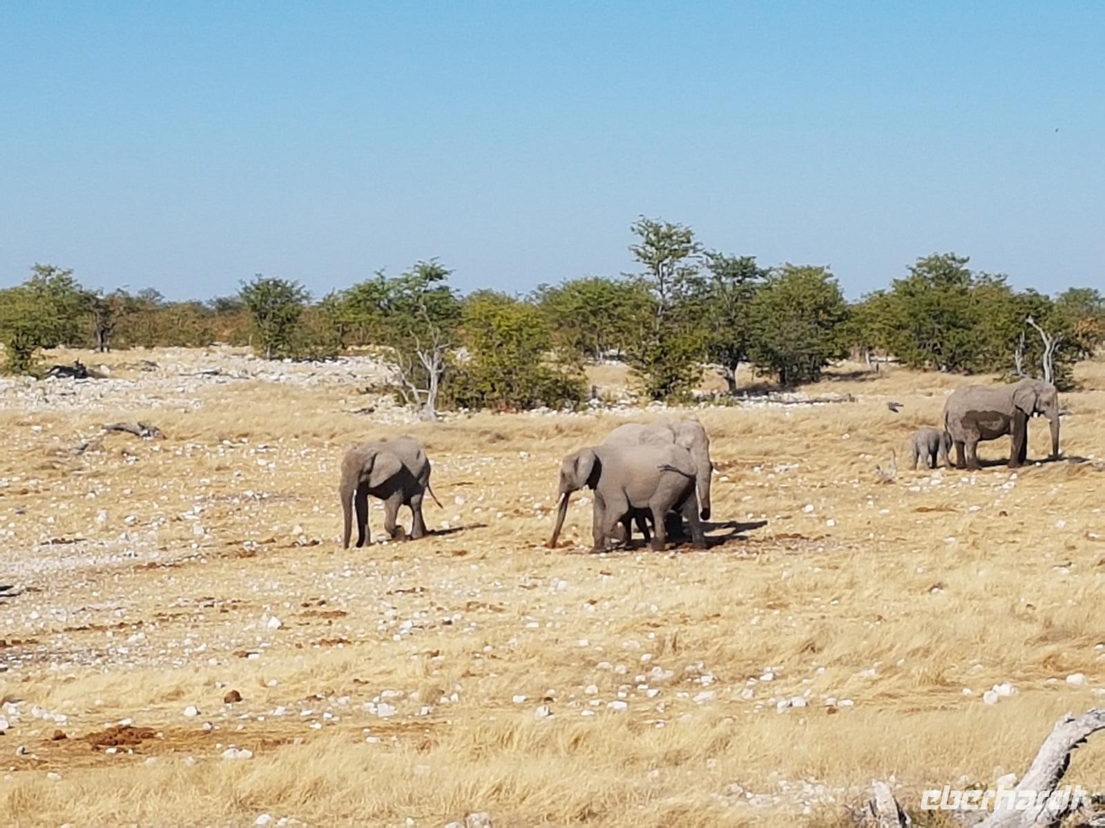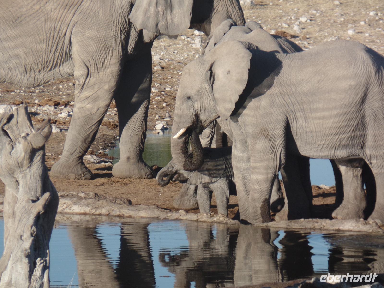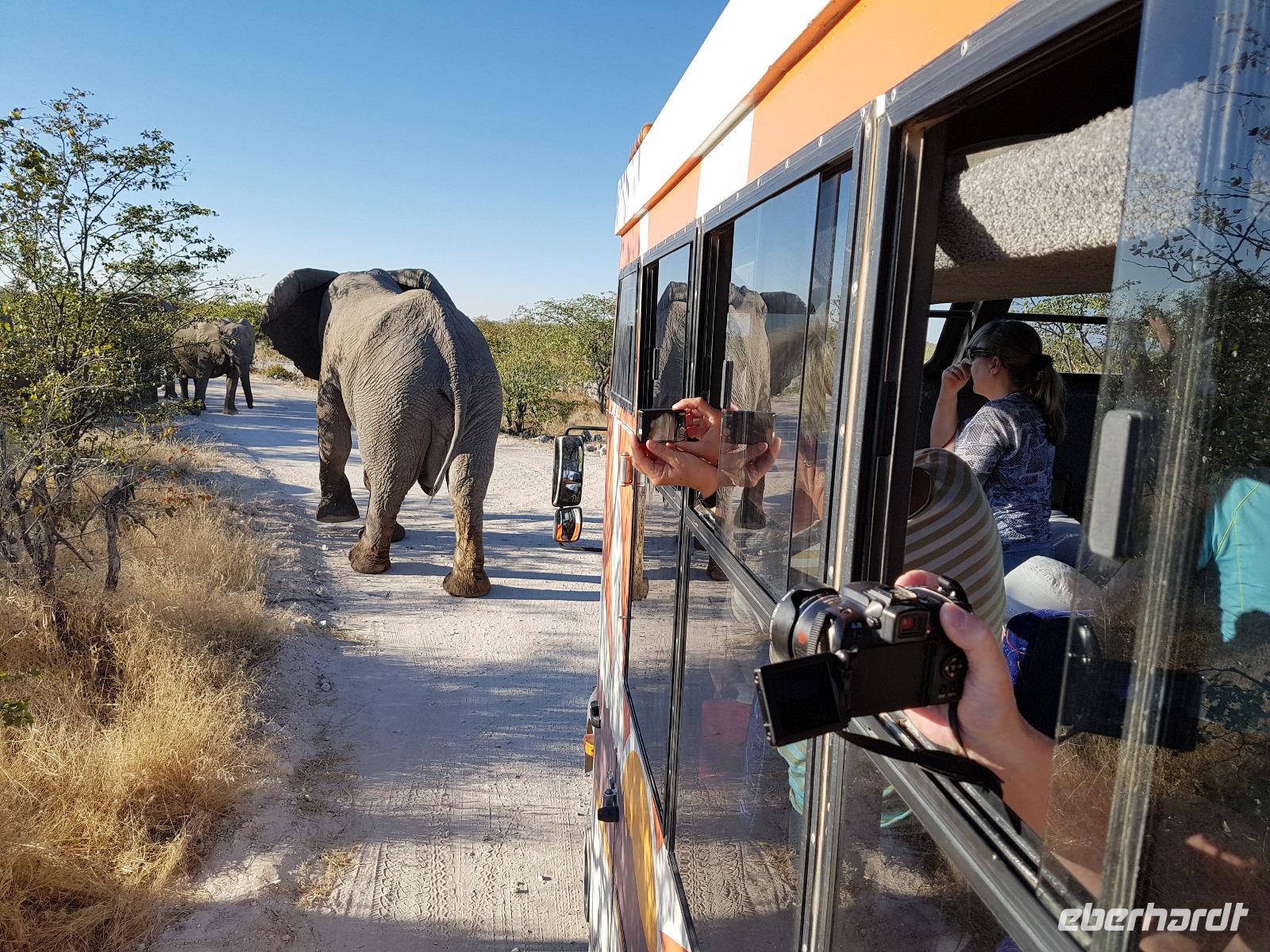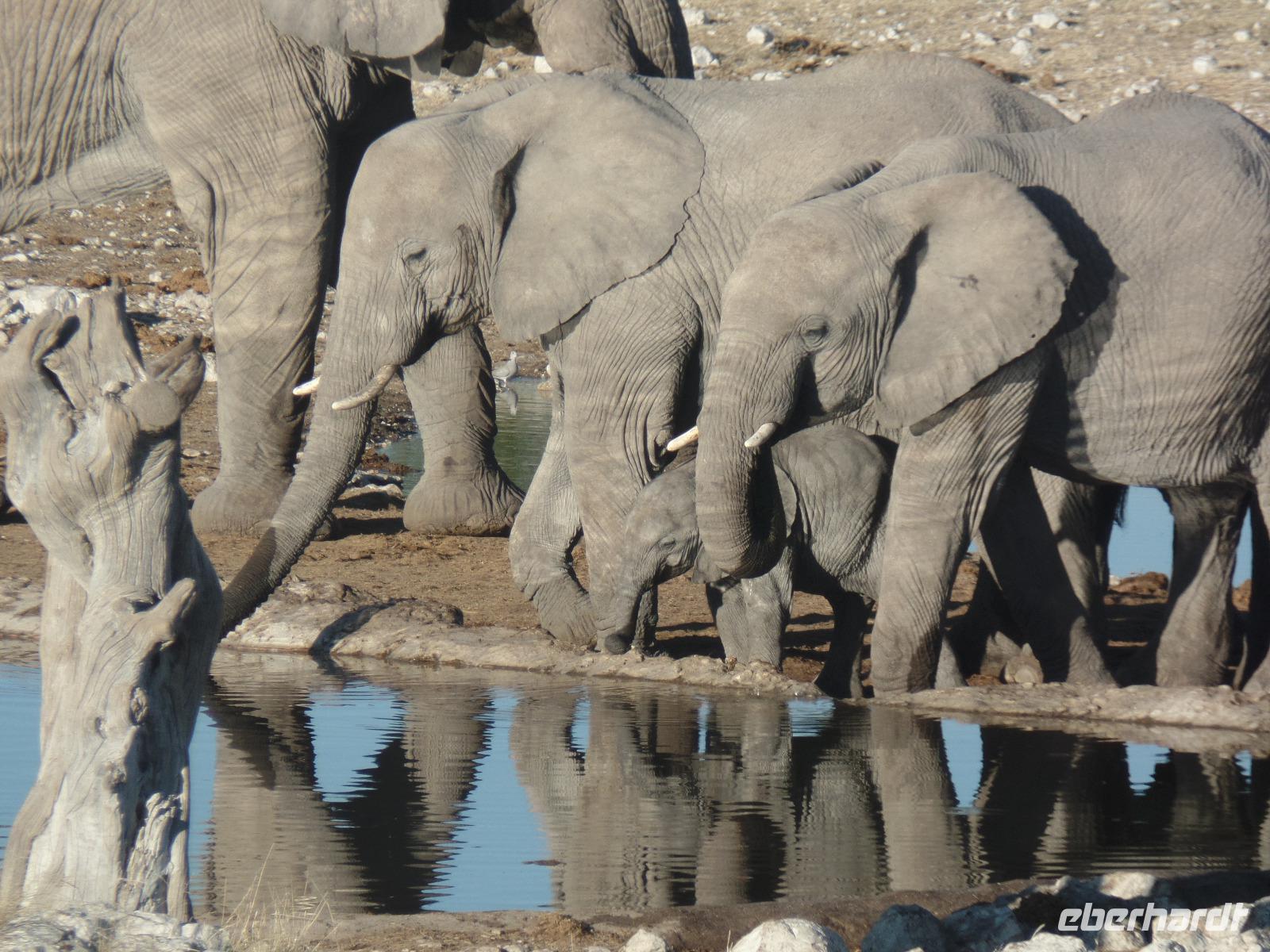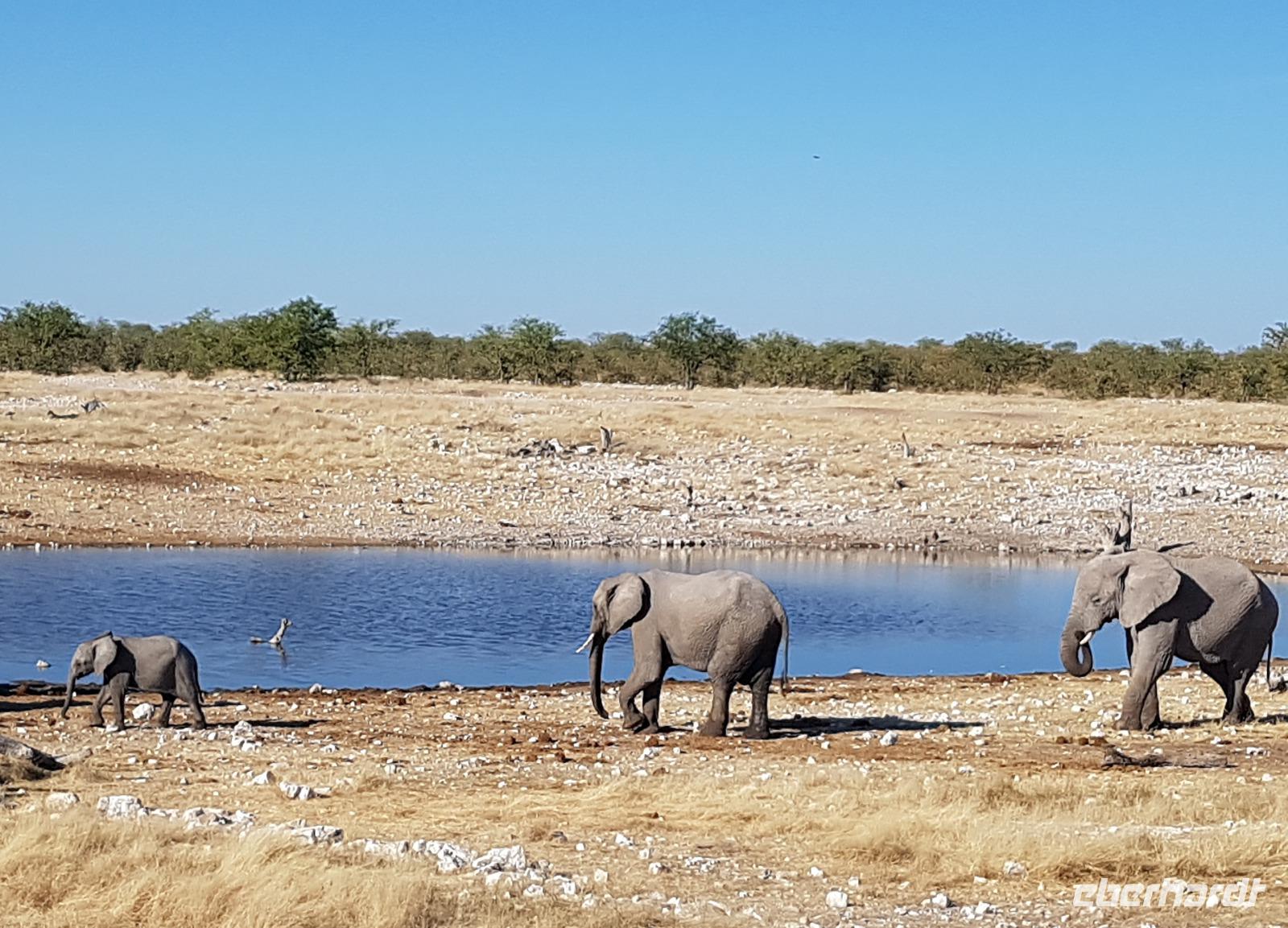 Wir sind alle bisschen aufgeregt. Heute und morgen geht unser Traum in Erfüllung. Wir werden im Etosha Nationalpark Tiere bestaunen. Die Fahrt führt durch Outio, dem Tor zum Etosha Nationalpark. Ankunft ist in einer wildromantischen Lodge, Toshari Lodge, unweit vom Eingangstor des Parks entfernt. Schon am frühen Nachmittag unternehmen wir eine erste Pirschfahrt durch den Etosha Nationalpark. Namibias berühmtester Nationalpark gehört zu den absoluten Höhepunkten unserer Reise. Typisch für den Park sind die Wasserlöcher, an denen sich Elefanten, Gnus und viele andere Tiere versammeln. Wir hatten heute Glück, da wir Strauß, Springbock, Kudu, Zebras und Giraffen sahen aber vor allem viele Elefanten und sogar einen Baby-Elefanten. So wie morgen müssen wir den Park bei Sonnenuntergang verlassen, aber der erste Eindruck unserer Pirschfahrt war grandios. Zebras sind wunderschöne Tiere, auch Onyx und Kudus. Die afrikanischen Elefanten konnten wir richtig genießen wie Sie an das Wasserloch kamen um zu trinken. Was für ein Tier! Wir hatten heute und auch morgen wieder das Glück Nashörner zu sehen. Und sogar beide! Das Spitzmaul-Nashorn sowie die Breitmail-Nashorn. Heute einfach so mitten auf der Straße (siehe Bildergalerie, um es zu glauben). Nach einem tollen afrikanischen Abendessen genossen wir wieder den Abend unter dem afrikanischen Sternenhimmel und freuten uns tierisch auf die spannenden Tiererlebnisse am nächsten Tag!
