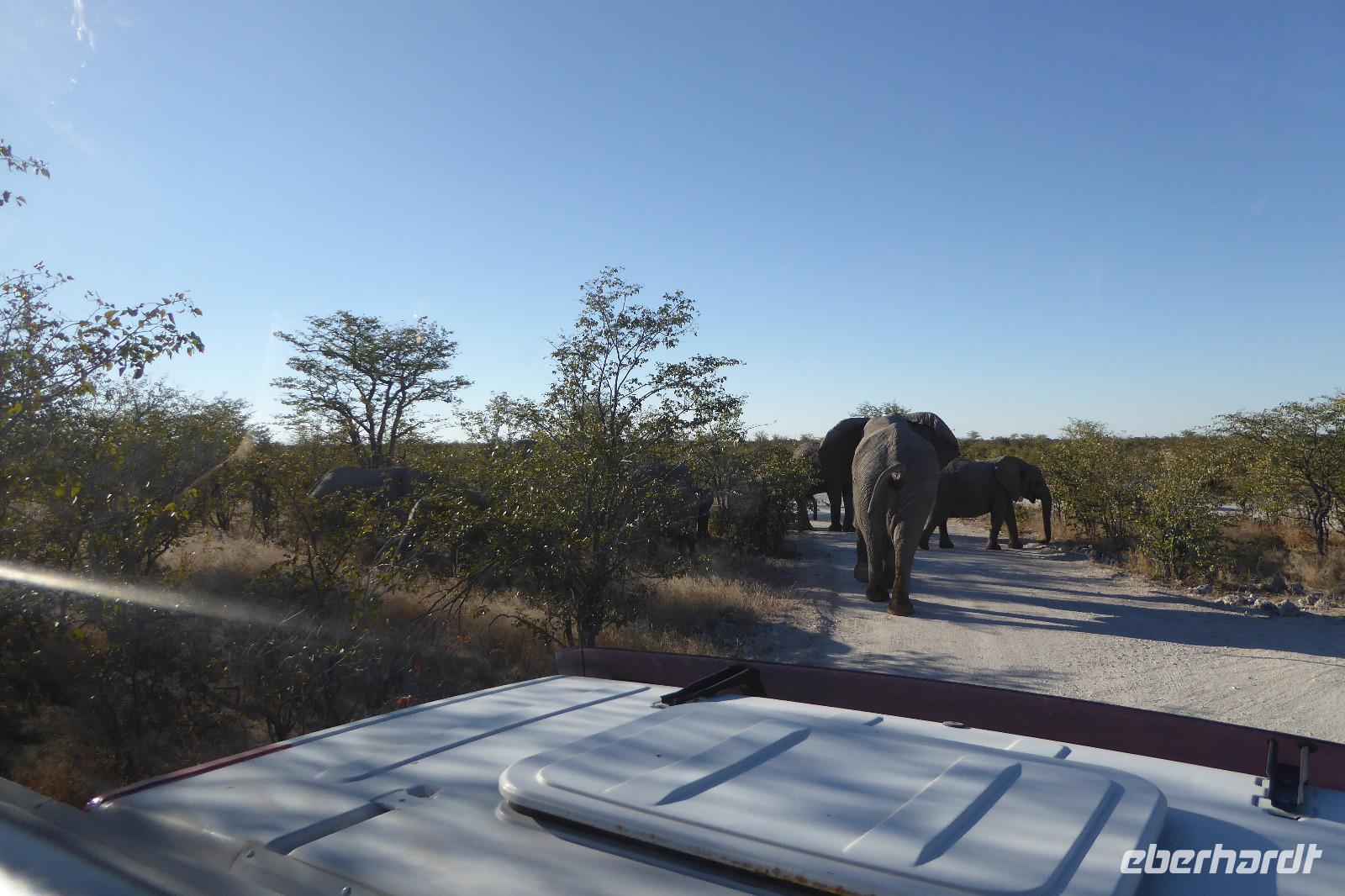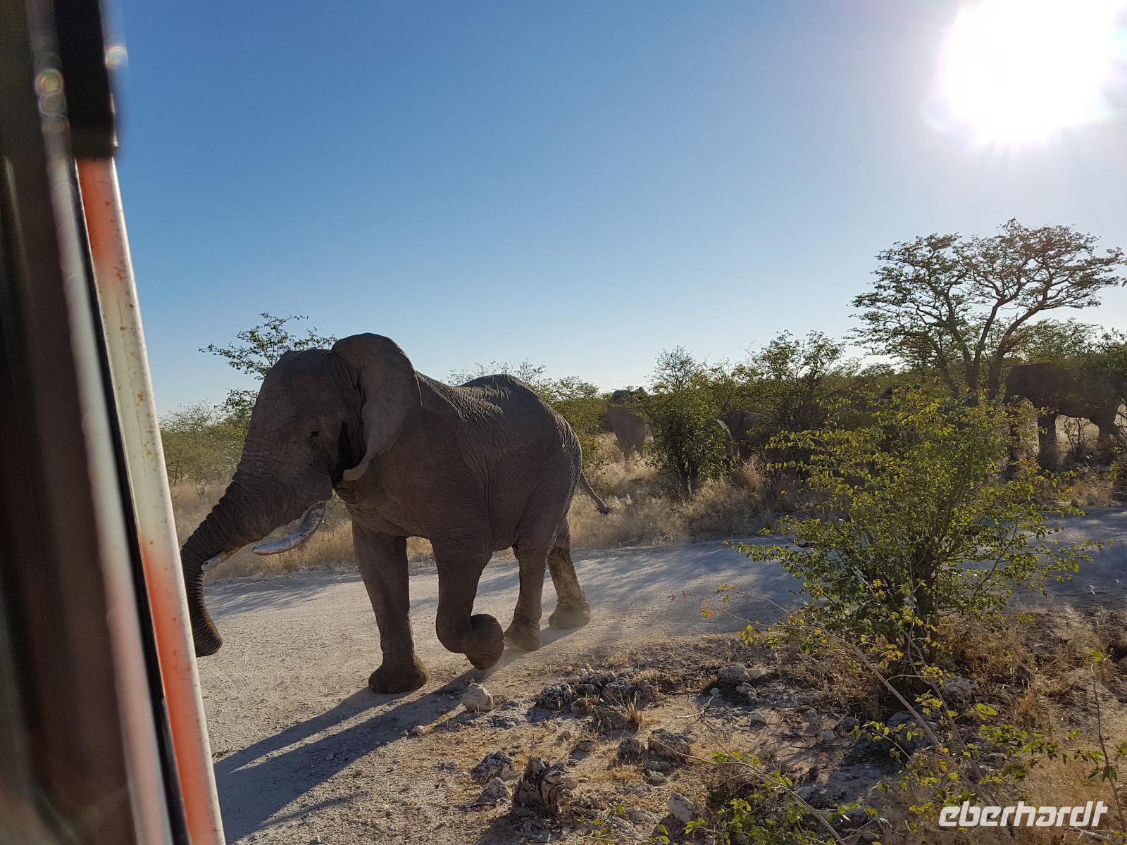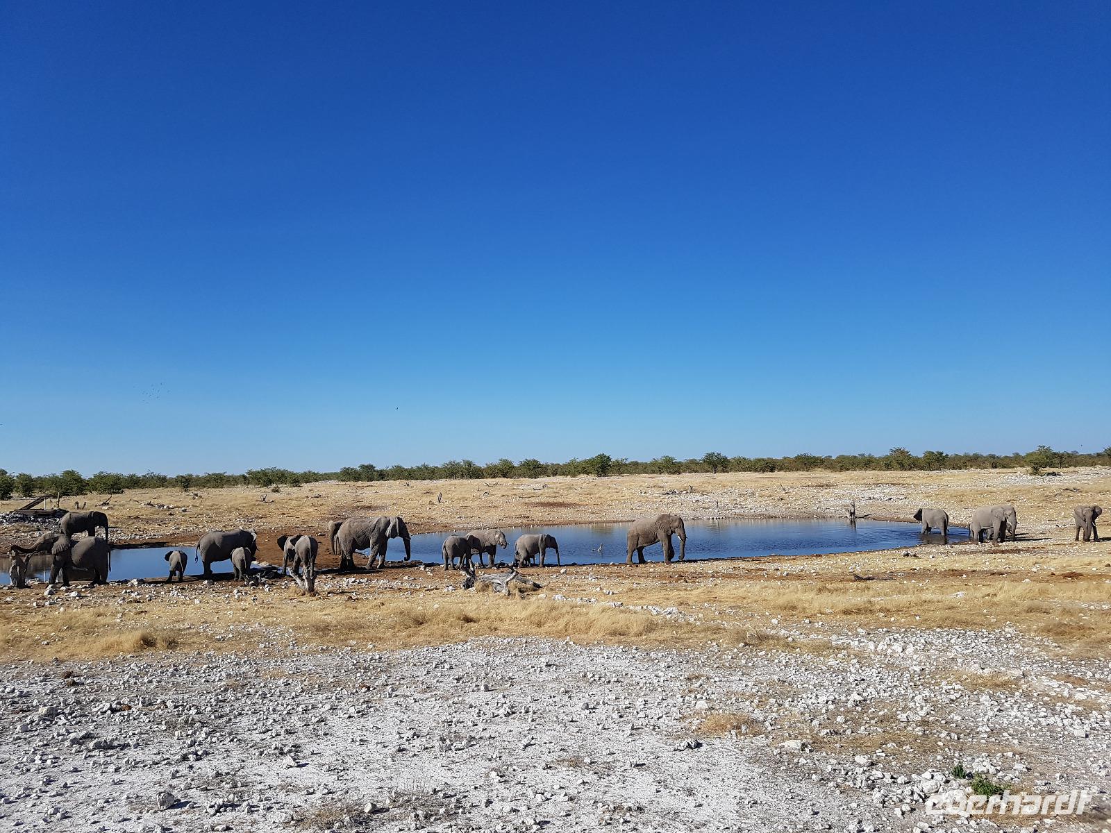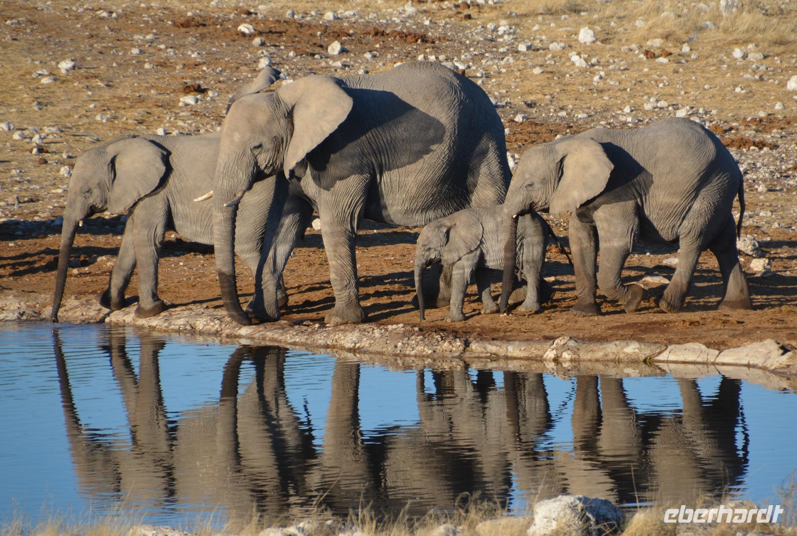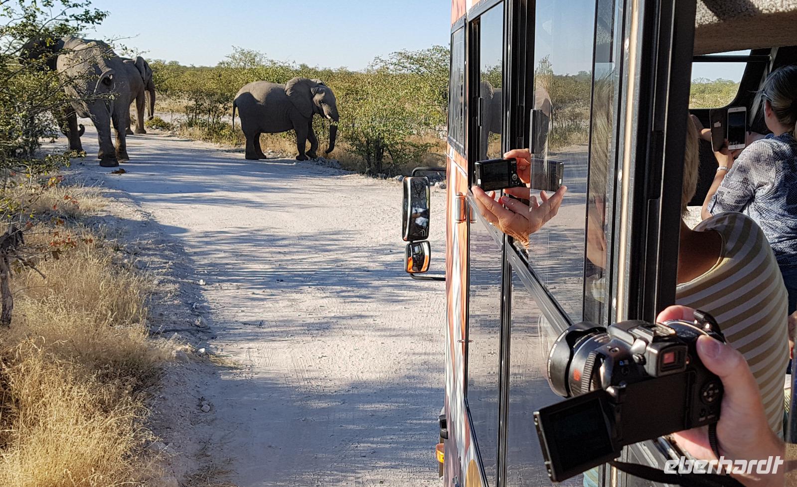 Wir sind alle bisschen aufgeregt. Heute und morgen geht unser Traum in Erfüllung. Wir werden im Etosha Nationalpark Tiere bestaunen. Die Fahrt führt durch Outio, dem Tor zum Etosha Nationalpark. Ankunft ist in einer wildromantischen Lodge, Toshari Lodge, unweit vom Eingangstor des Parks entfernt. Schon am frühen Nachmittag unternehmen wir eine erste Pirschfahrt durch den Etosha Nationalpark. Namibias berühmtester Nationalpark gehört zu den absoluten Höhepunkten unserer Reise. Typisch für den Park sind die Wasserlöcher, an denen sich Elefanten, Gnus und viele andere Tiere versammeln. Wir hatten heute Glück, da wir Strauß, Springbock, Kudu, Zebras und Giraffen sahen aber vor allem viele Elefanten und sogar einen Baby-Elefanten. So wie morgen müssen wir den Park bei Sonnenuntergang verlassen, aber der erste Eindruck unserer Pirschfahrt war grandios. Zebras sind wunderschöne Tiere, auch Onyx und Kudus. Die afrikanischen Elefanten konnten wir richtig genießen wie Sie an das Wasserloch kamen um zu trinken. Was für ein Tier! Wir hatten heute und auch morgen wieder das Glück Nashörner zu sehen. Und sogar beide! Das Spitzmaul-Nashorn sowie die Breitmail-Nashorn. Heute einfach so mitten auf der Straße (siehe Bildergalerie, um es zu glauben). Nach einem tollen afrikanischen Abendessen genossen wir wieder den Abend unter dem afrikanischen Sternenhimmel und freuten uns tierisch auf die spannenden Tiererlebnisse am nächsten Tag!