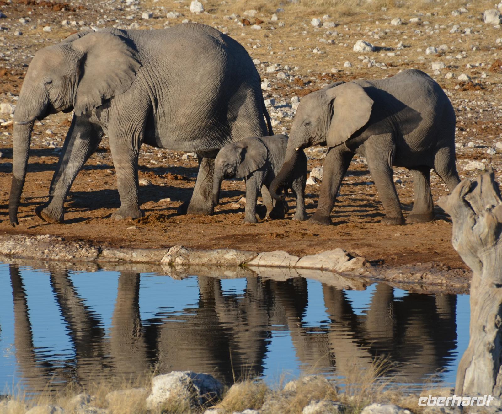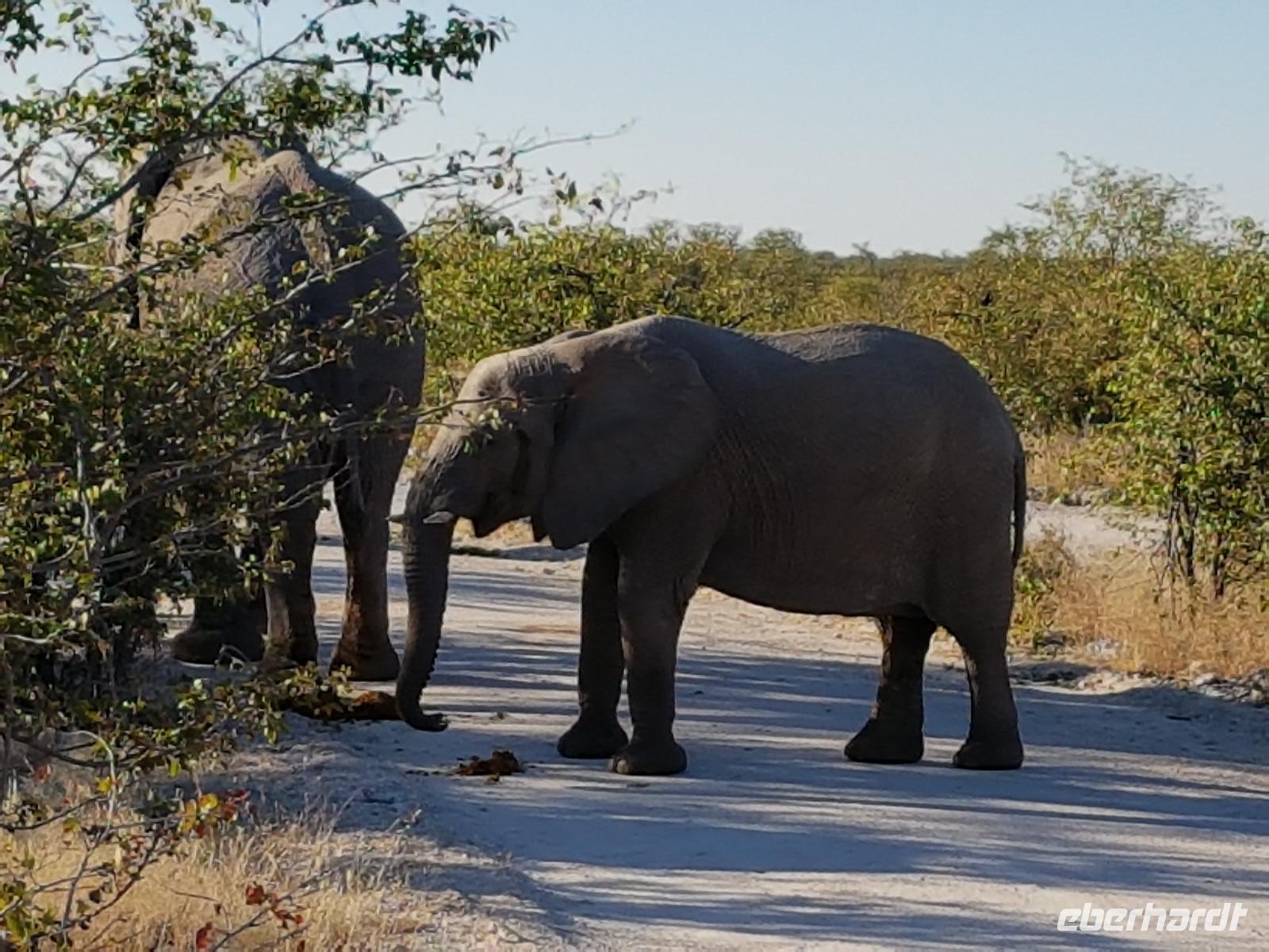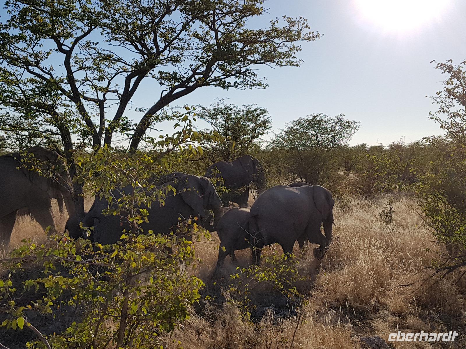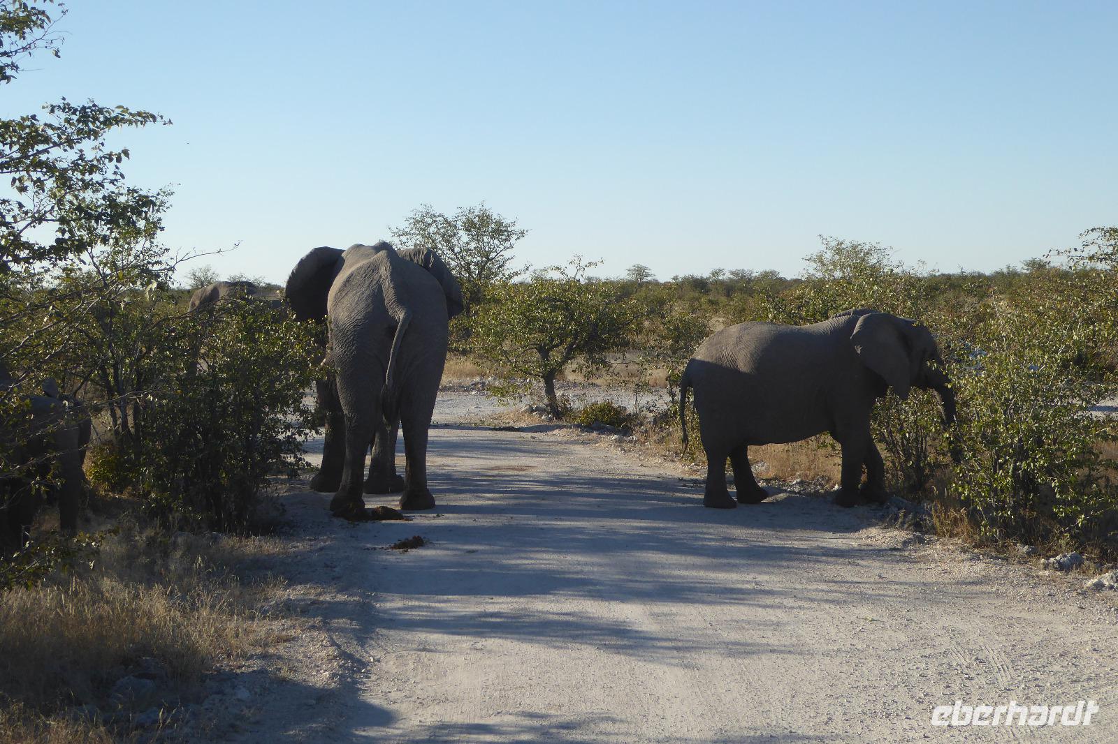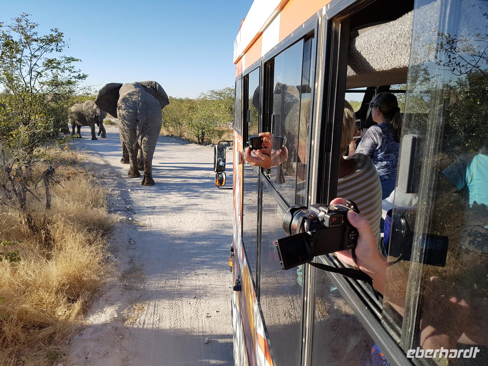 Wir sind alle bisschen aufgeregt. Heute und morgen geht unser Traum in Erfüllung. Wir werden im Etosha Nationalpark Tiere bestaunen. Die Fahrt führt durch Outio, dem Tor zum Etosha Nationalpark. Ankunft ist in einer wildromantischen Lodge, Toshari Lodge, unweit vom Eingangstor des Parks entfernt. Schon am frühen Nachmittag unternehmen wir eine erste Pirschfahrt durch den Etosha Nationalpark. Namibias berühmtester Nationalpark gehört zu den absoluten Höhepunkten unserer Reise. Typisch für den Park sind die Wasserlöcher, an denen sich Elefanten, Gnus und viele andere Tiere versammeln. Wir hatten heute Glück, da wir Strauß, Springbock, Kudu, Zebras und Giraffen sahen aber vor allem viele Elefanten und sogar einen Baby-Elefanten. So wie morgen müssen wir den Park bei Sonnenuntergang verlassen, aber der erste Eindruck unserer Pirschfahrt war grandios. Zebras sind wunderschöne Tiere, auch Onyx und Kudus. Die afrikanischen Elefanten konnten wir richtig genießen wie Sie an das Wasserloch kamen um zu trinken. Was für ein Tier! Wir hatten heute und auch morgen wieder das Glück Nashörner zu sehen. Und sogar beide! Das Spitzmaul-Nashorn sowie die Breitmail-Nashorn. Heute einfach so mitten auf der Straße (siehe Bildergalerie, um es zu glauben). Nach einem tollen afrikanischen Abendessen genossen wir wieder den Abend unter dem afrikanischen Sternenhimmel und freuten uns tierisch auf die spannenden Tiererlebnisse am nächsten Tag!