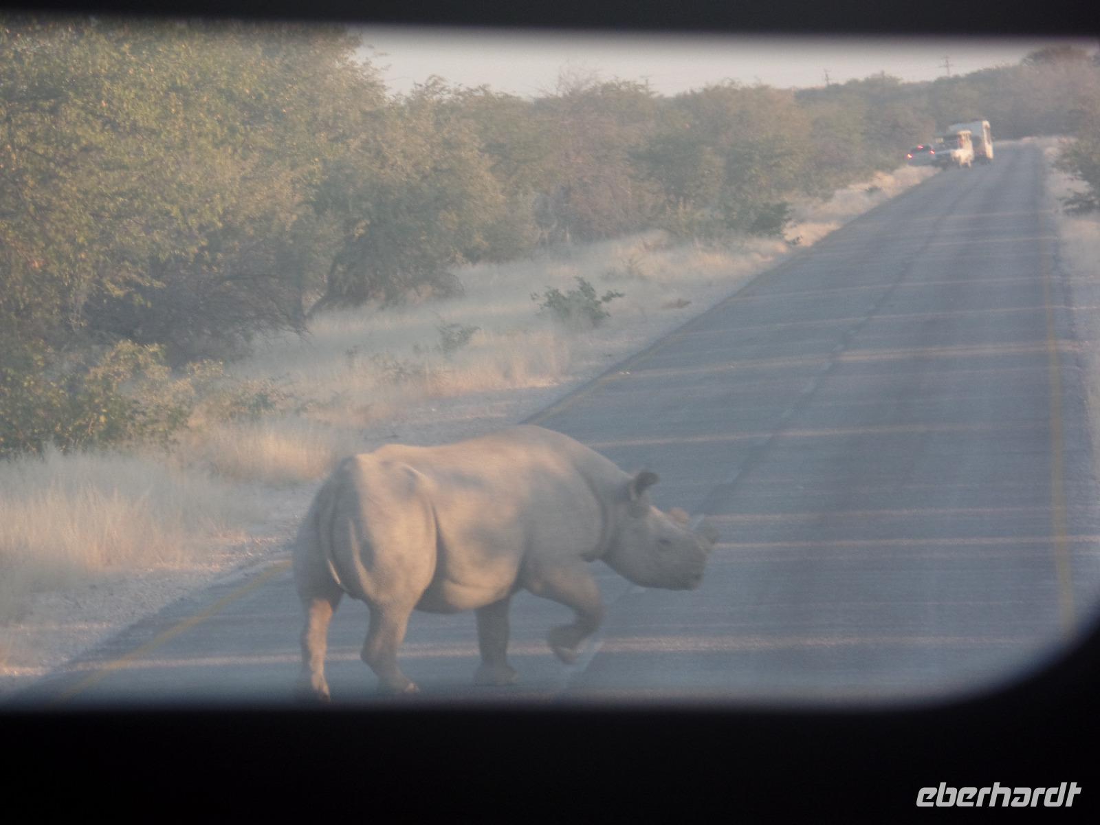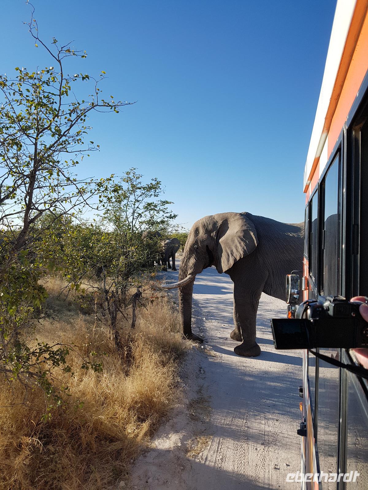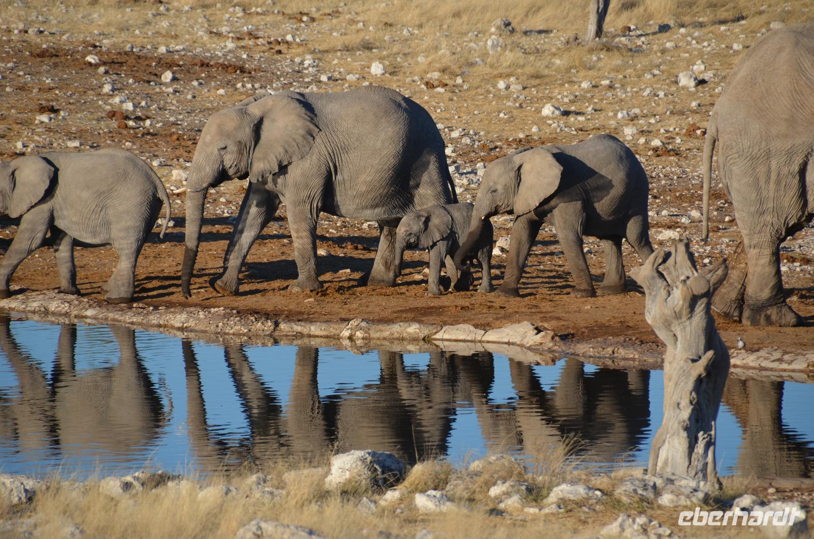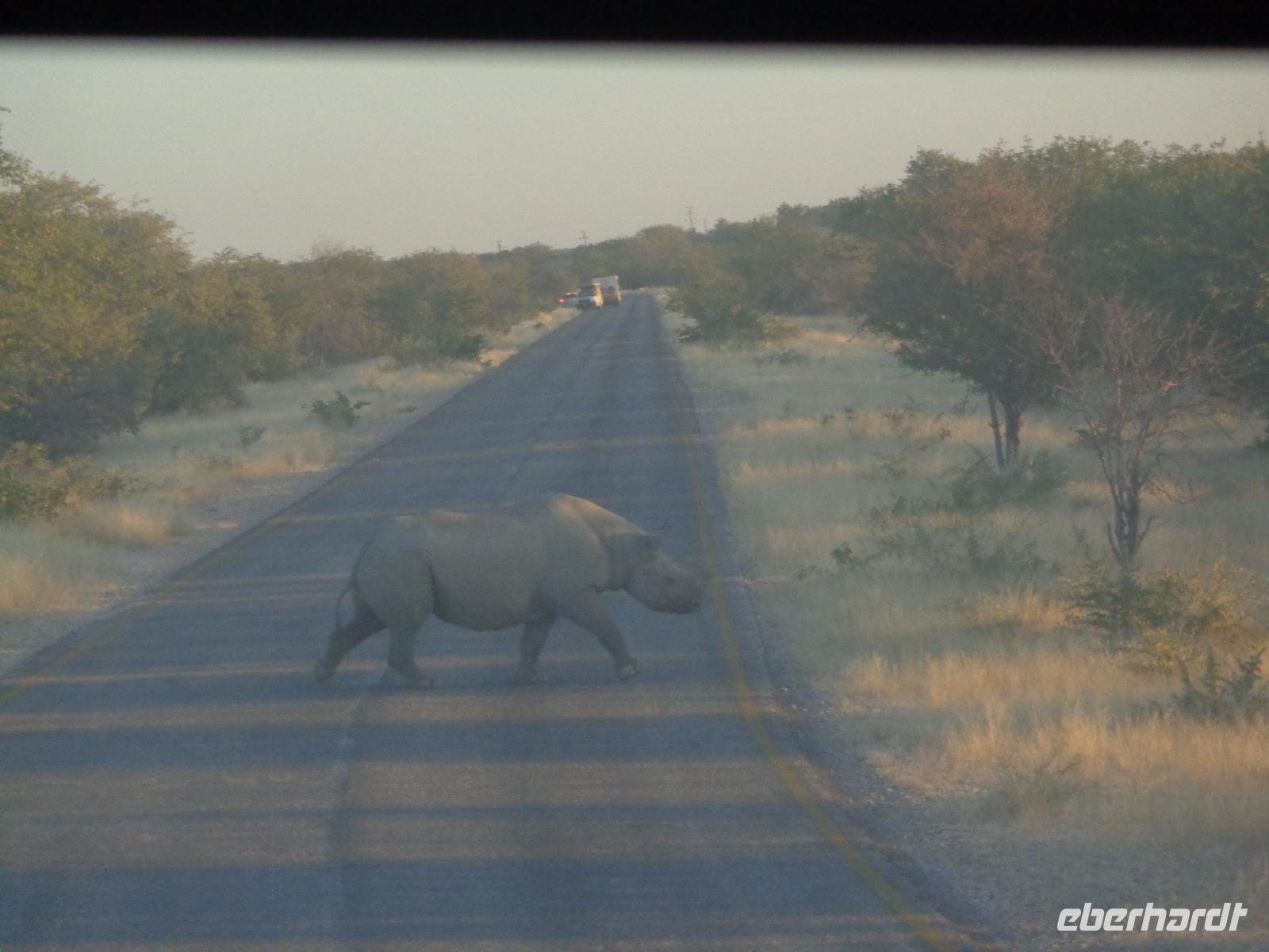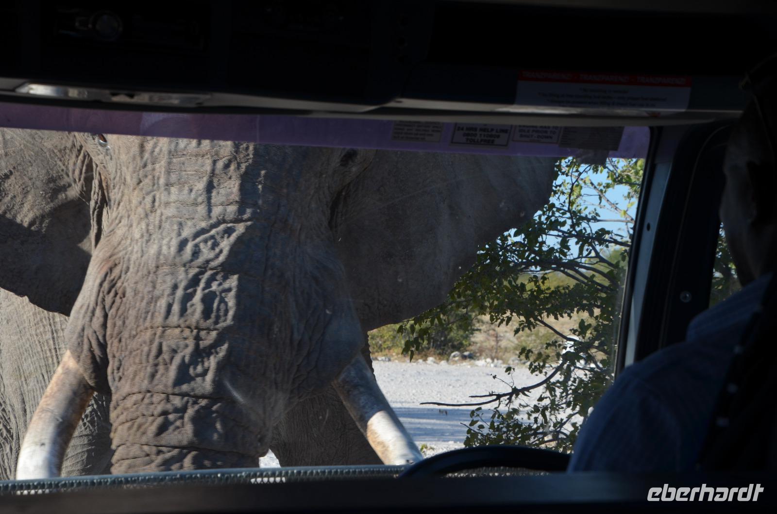 Wir sind alle bisschen aufgeregt. Heute und morgen geht unser Traum in Erfüllung. Wir werden im Etosha Nationalpark Tiere bestaunen. Die Fahrt führt durch Outio, dem Tor zum Etosha Nationalpark. Ankunft ist in einer wildromantischen Lodge, Toshari Lodge, unweit vom Eingangstor des Parks entfernt. Schon am frühen Nachmittag unternehmen wir eine erste Pirschfahrt durch den Etosha Nationalpark. Namibias berühmtester Nationalpark gehört zu den absoluten Höhepunkten unserer Reise. Typisch für den Park sind die Wasserlöcher, an denen sich Elefanten, Gnus und viele andere Tiere versammeln. Wir hatten heute Glück, da wir Strauß, Springbock, Kudu, Zebras und Giraffen sahen aber vor allem viele Elefanten und sogar einen Baby-Elefanten. So wie morgen müssen wir den Park bei Sonnenuntergang verlassen, aber der erste Eindruck unserer Pirschfahrt war grandios. Zebras sind wunderschöne Tiere, auch Onyx und Kudus. Die afrikanischen Elefanten konnten wir richtig genießen wie Sie an das Wasserloch kamen um zu trinken. Was für ein Tier! Wir hatten heute und auch morgen wieder das Glück Nashörner zu sehen. Und sogar beide! Das Spitzmaul-Nashorn sowie die Breitmail-Nashorn. Heute einfach so mitten auf der Straße (siehe Bildergalerie, um es zu glauben). Nach einem tollen afrikanischen Abendessen genossen wir wieder den Abend unter dem afrikanischen Sternenhimmel und freuten uns tierisch auf die spannenden Tiererlebnisse am nächsten Tag!