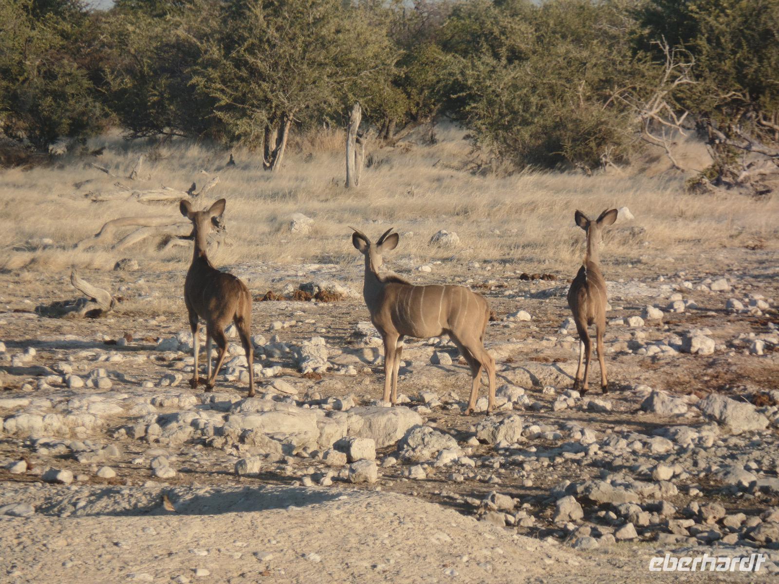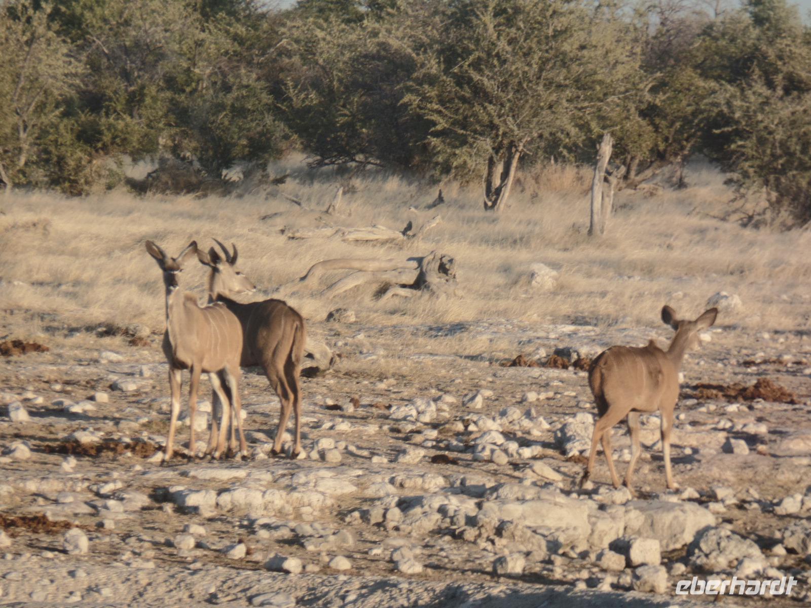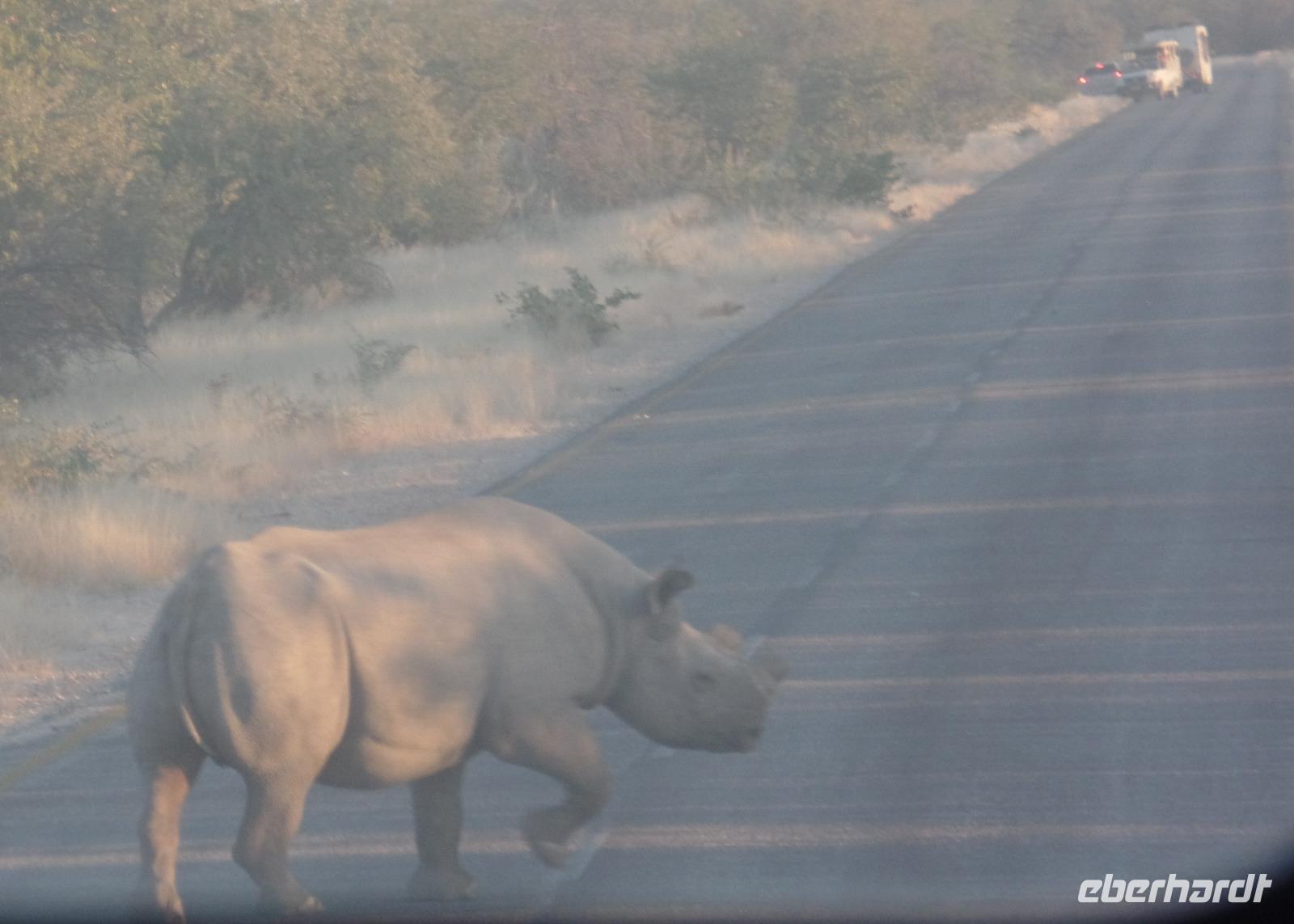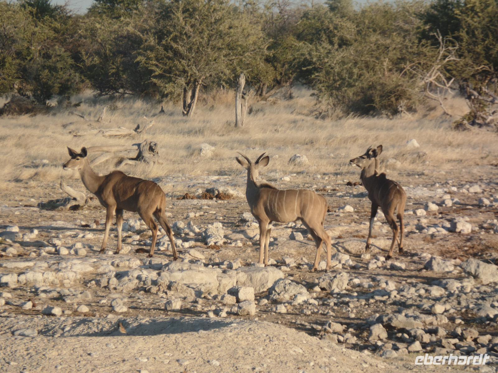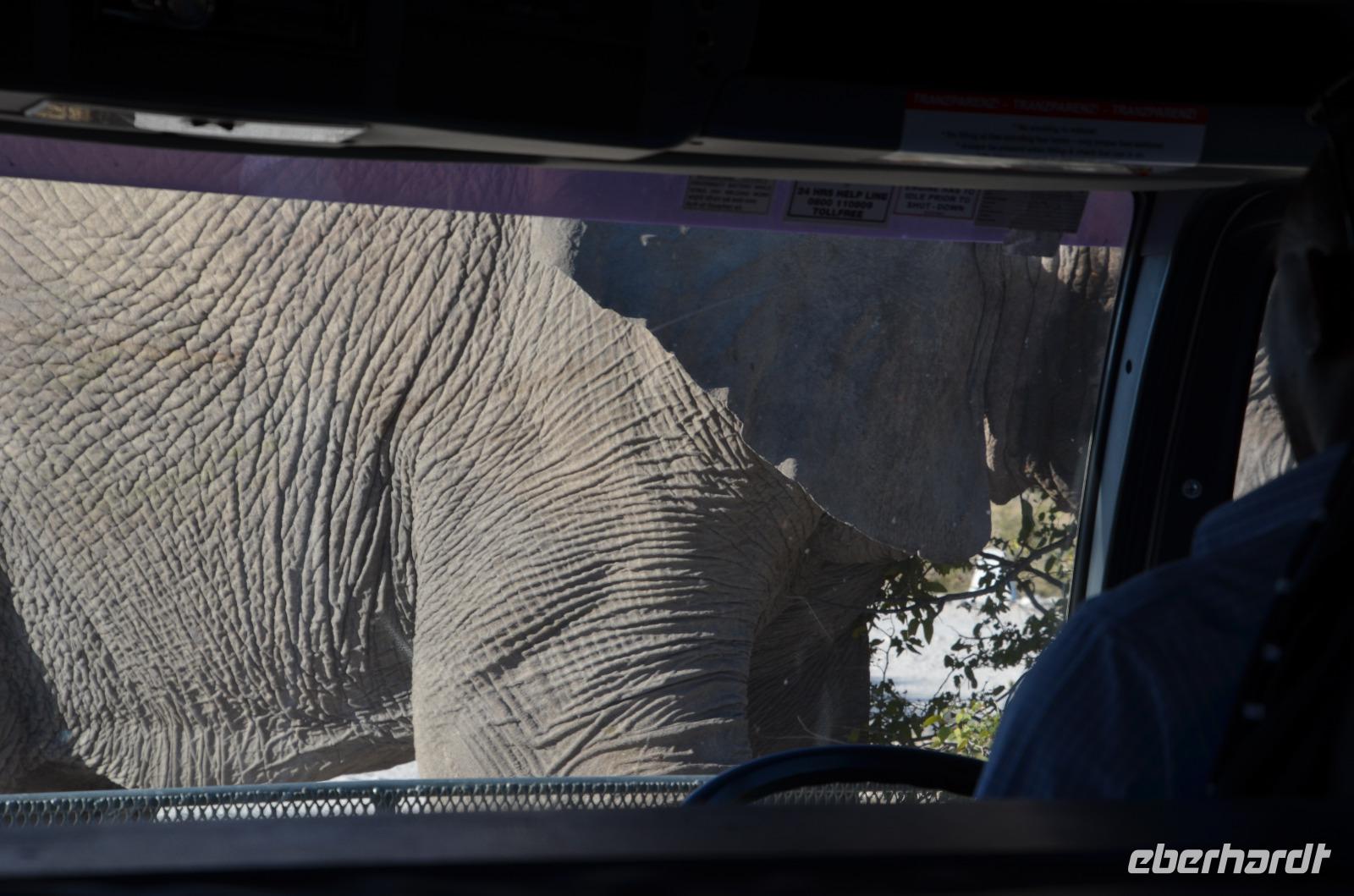 Wir sind alle bisschen aufgeregt. Heute und morgen geht unser Traum in Erfüllung. Wir werden im Etosha Nationalpark Tiere bestaunen. Die Fahrt führt durch Outio, dem Tor zum Etosha Nationalpark. Ankunft ist in einer wildromantischen Lodge, Toshari Lodge, unweit vom Eingangstor des Parks entfernt. Schon am frühen Nachmittag unternehmen wir eine erste Pirschfahrt durch den Etosha Nationalpark. Namibias berühmtester Nationalpark gehört zu den absoluten Höhepunkten unserer Reise. Typisch für den Park sind die Wasserlöcher, an denen sich Elefanten, Gnus und viele andere Tiere versammeln. Wir hatten heute Glück, da wir Strauß, Springbock, Kudu, Zebras und Giraffen sahen aber vor allem viele Elefanten und sogar einen Baby-Elefanten. So wie morgen müssen wir den Park bei Sonnenuntergang verlassen, aber der erste Eindruck unserer Pirschfahrt war grandios. Zebras sind wunderschöne Tiere, auch Onyx und Kudus. Die afrikanischen Elefanten konnten wir richtig genießen wie Sie an das Wasserloch kamen um zu trinken. Was für ein Tier! Wir hatten heute und auch morgen wieder das Glück Nashörner zu sehen. Und sogar beide! Das Spitzmaul-Nashorn sowie die Breitmail-Nashorn. Heute einfach so mitten auf der Straße (siehe Bildergalerie, um es zu glauben). Nach einem tollen afrikanischen Abendessen genossen wir wieder den Abend unter dem afrikanischen Sternenhimmel und freuten uns tierisch auf die spannenden Tiererlebnisse am nächsten Tag!