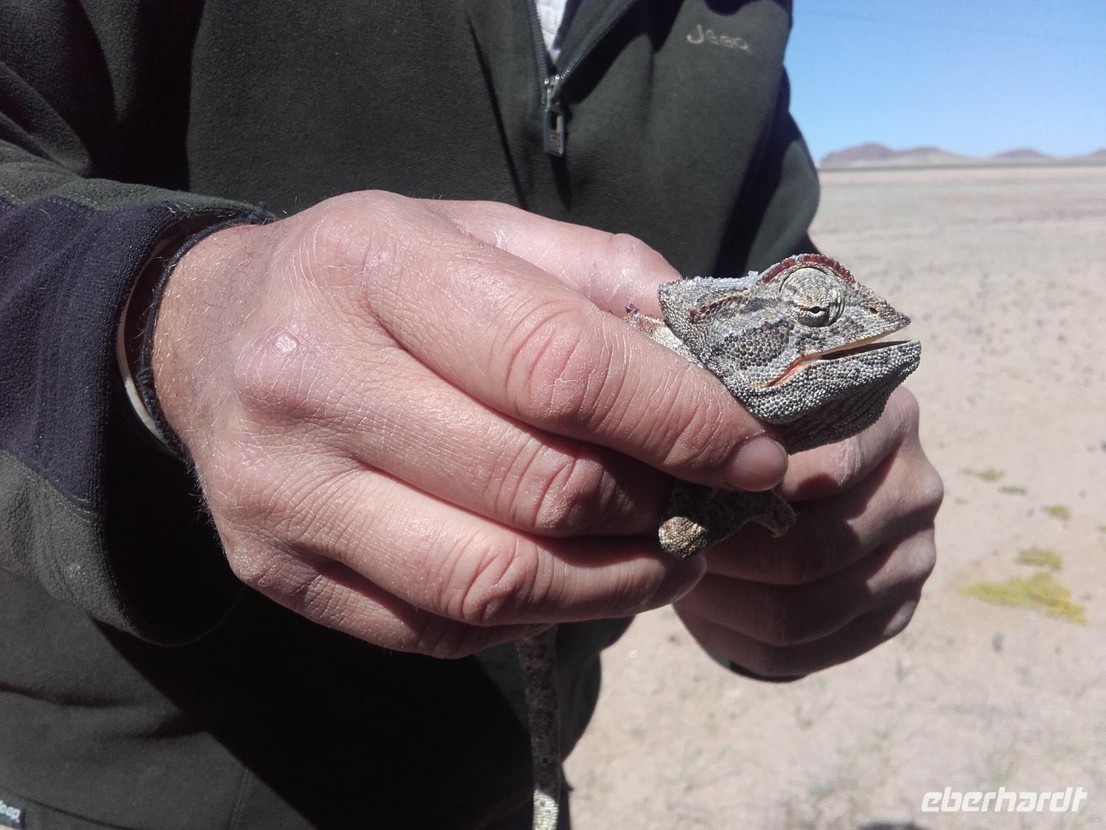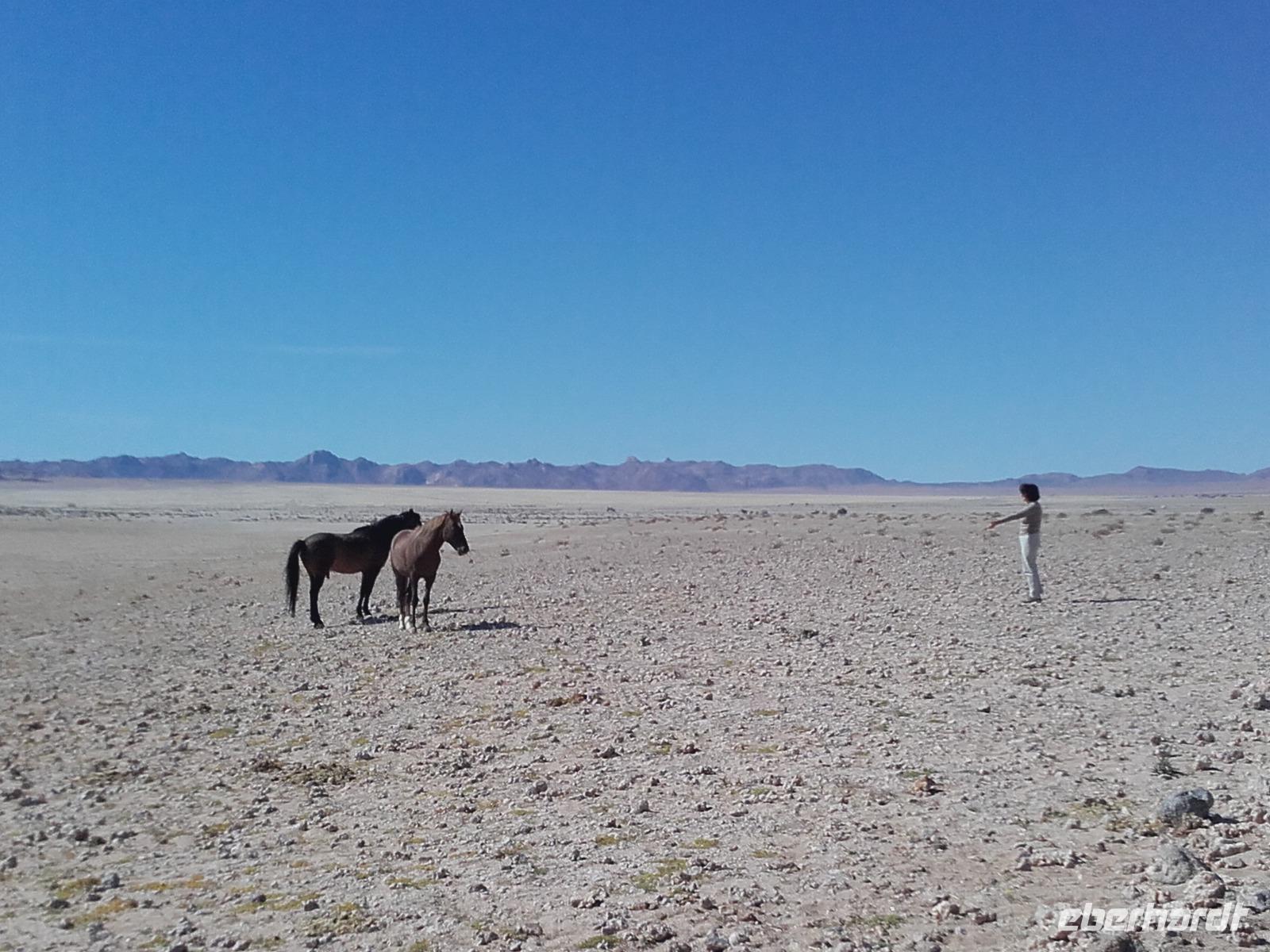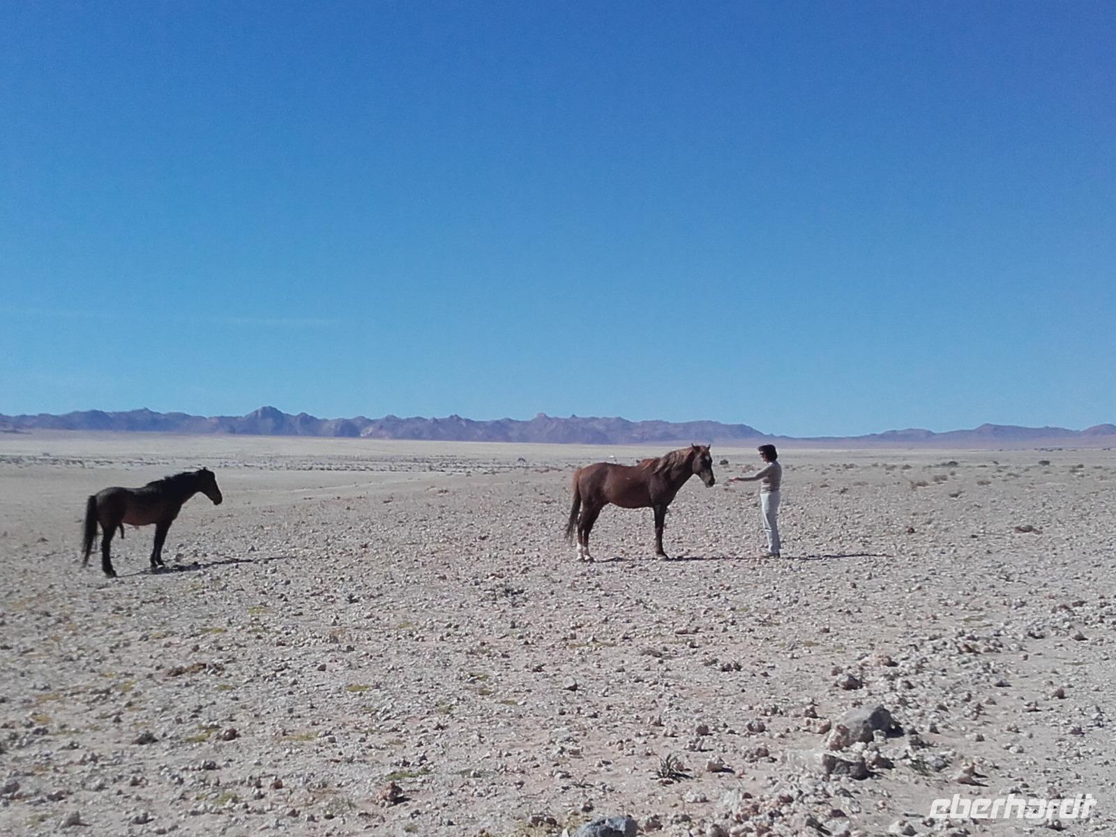 Durch die Wüste geht es an den Atlantik. Wir lernen die guten und die bösen Termiten kennen. Die Grasschneider-Bösewichte treiben die Verwüstung voran, die guten Termiten sparen wir uns noch auf für später. In der Wüste gibt es noch mehr Bewohner. Zum einen welche, die direkt aus der Urzeit zu uns gekrabbelt zu sein scheinen, wie das Namaqua-Chamäleon, für das Henner schon mal eine Vollbremsung mit seinem Truck vollführt, um uns den sympathischen Kollegen mit der langen Zunge aus der Nähe zeigen zu können. Und dann gibt es da noch die „Zugereisten", über deren Herkunft mehrere Geschichten kursieren. Wir kaufen die, dass beim Beschuss eines englischen Armeelagers die dazugehörigen Pferde Reißaus genommen haben und seither als die Wildpferde von Aus ein anmutiger Hingucker in der Namib-Wüste sind. Wir freuen uns über den ersten Hengst, den wir mit dem Fernglas entdecken, und dann kann am Wasserloch von Garub selbst Henner seinen Augen kaum trauen: die ganze Herde von fast siebzig Tieren hat sich hier versammelt!