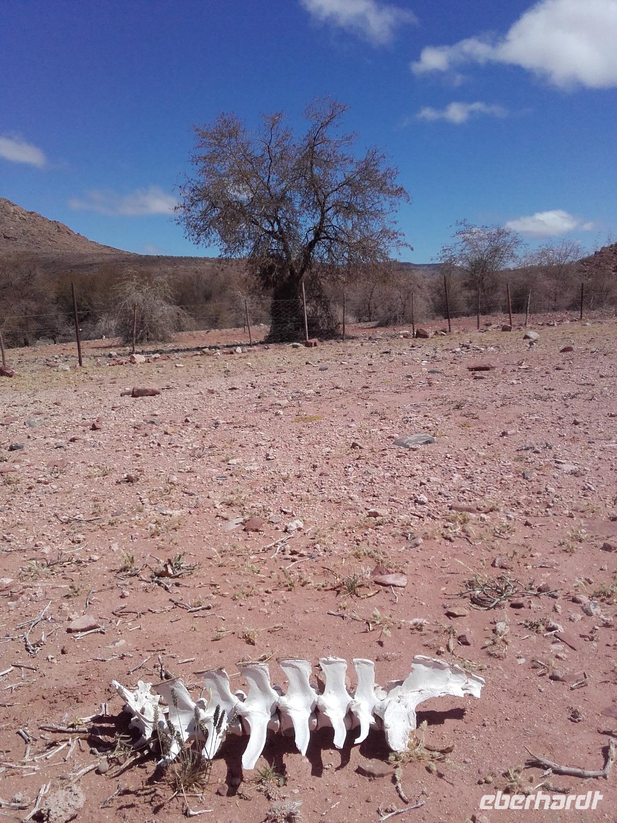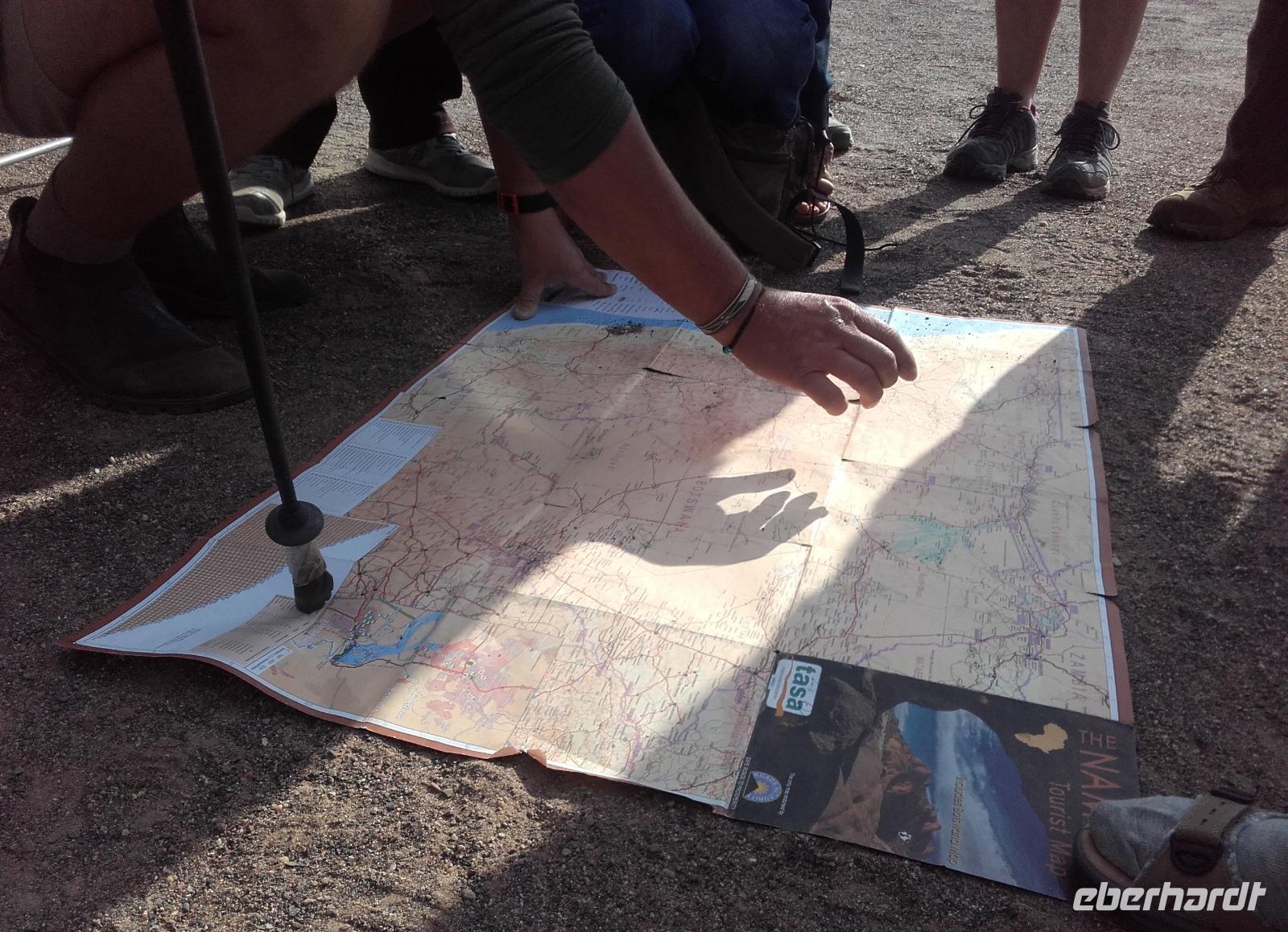Was genau, das zeigt uns Henner erst einmal auf einer Karte und gibt uns eine kleine Einführung, wer neben den schicken Vierbeinern denn eigentlich so an menschlichen Zweibeinern mit ihren unterschiedlichen Sprachen und Kulturen in Namibia lebt. In jedem Fall leben hier sehr findige Menschen, die mit lokalen Kniffen und Tricks dem Boden ihre Lebensgrundlage abringen. Interessant finden wir die Zaun- und Weidesysteme im Schachbrettmuster und Henners Geschichten über die Trichterjagd in Helikoptern auf den Wildfarmen.