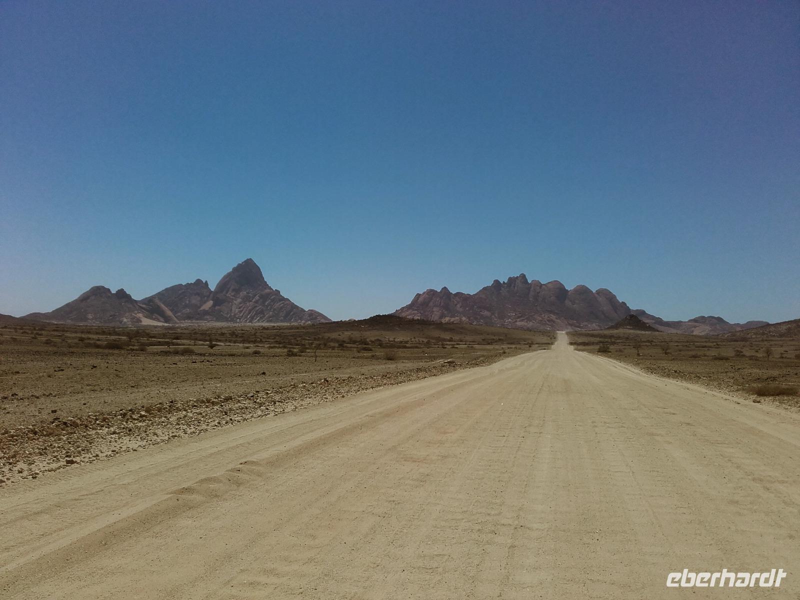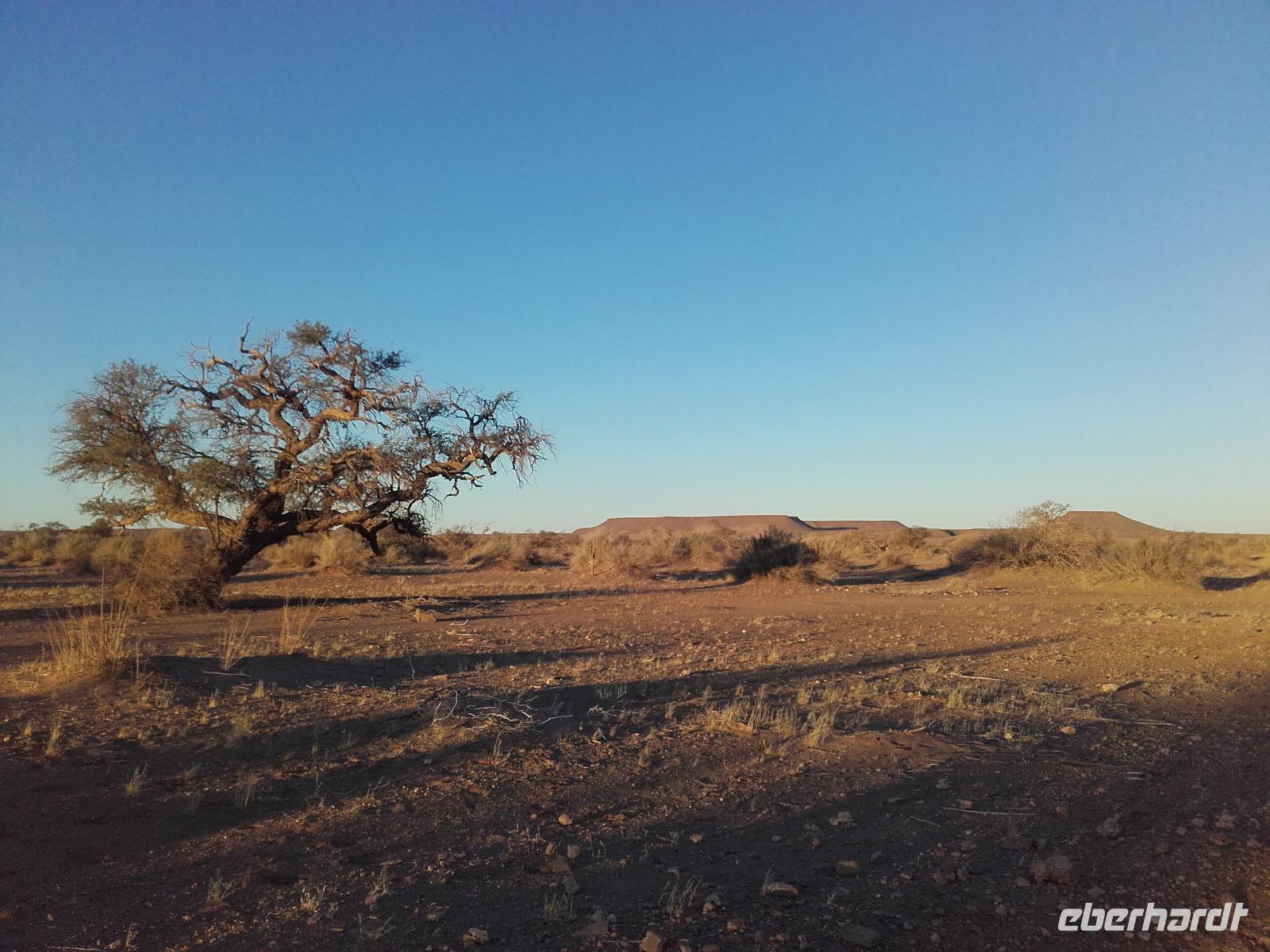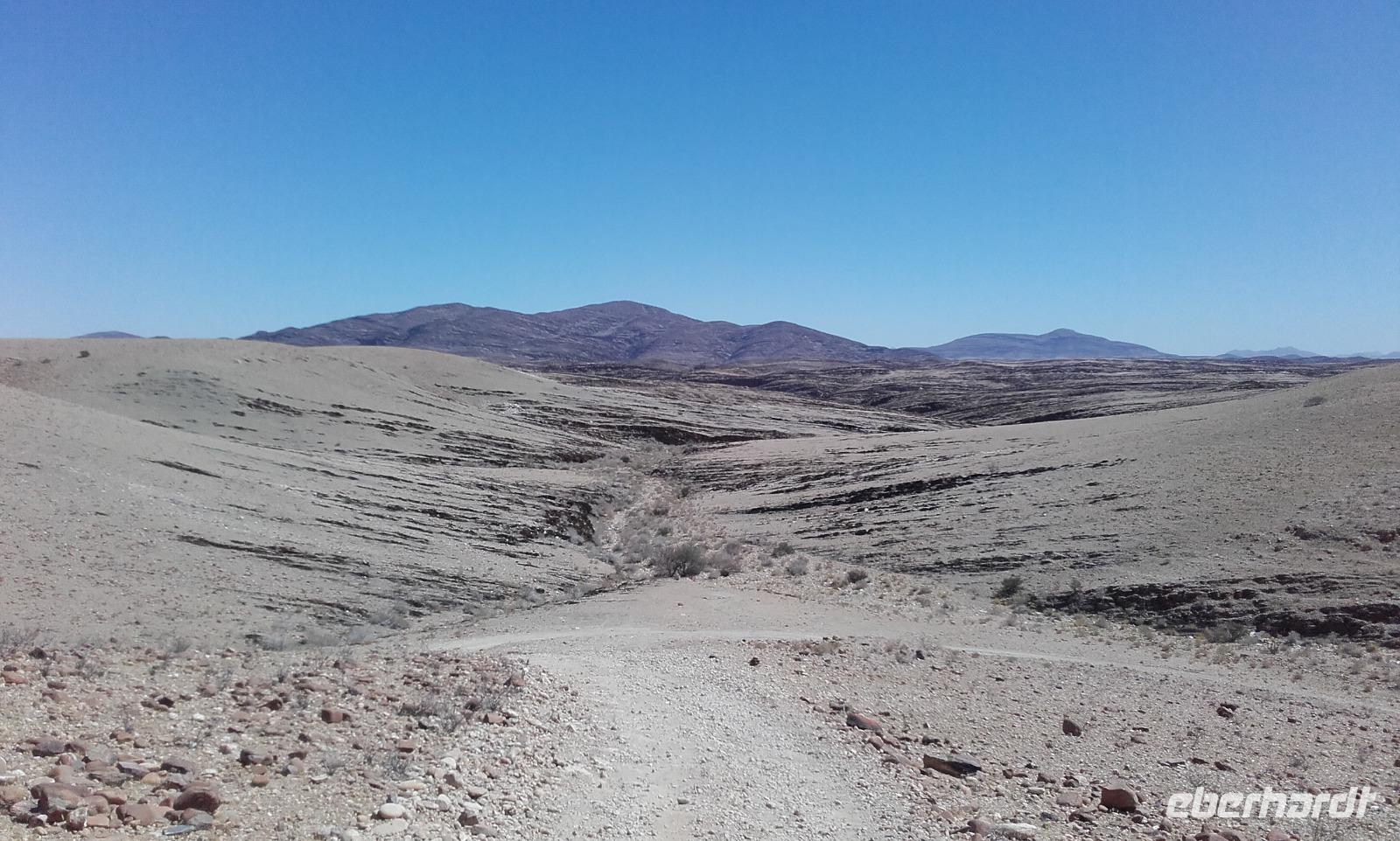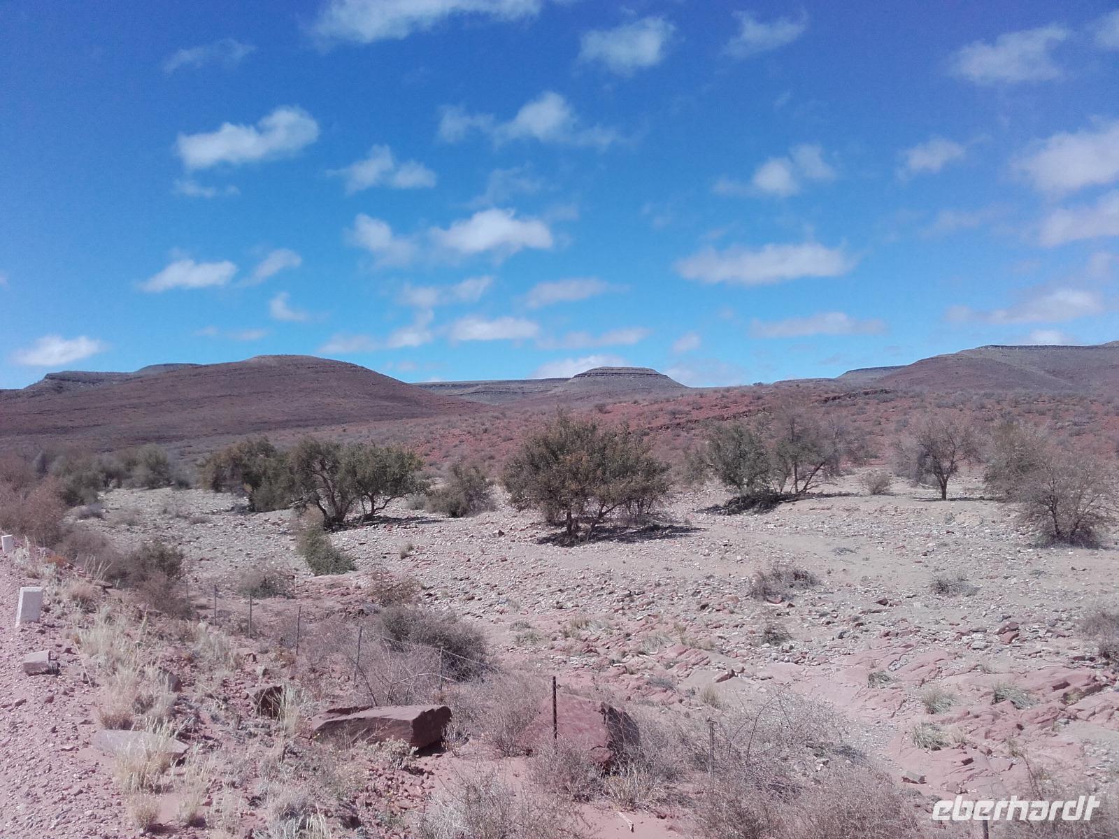 Gemütlich zuckeln wir über den Zarishoogte Pass, und da wir heute Zeit haben, laufen wir zwischendurch 10.000 Schritte mal selbst. Wir sind schon so richtig schön in unserem Rhythmus drin und laufen nur noch bis zu diesem Hügel, und bis zum nächsten noch, und oh, was sich wohl hinter dem Nächsten verbirgt und... na gut, Henner, steigen wir eben ein, es gibt ja mal wieder dringende Anschlusstermine: Relaxen in den Desert Hills! Dieses neue Schmuckstück der namibischen Lodge-Szene kann sich wirklich sehen lassen und was noch nicht so ganz fertig und rund läuft, wird von der Herzlichkeit der Mitarbeiter abgefedert, hier sind wir gerne „Versuchskaninchen".