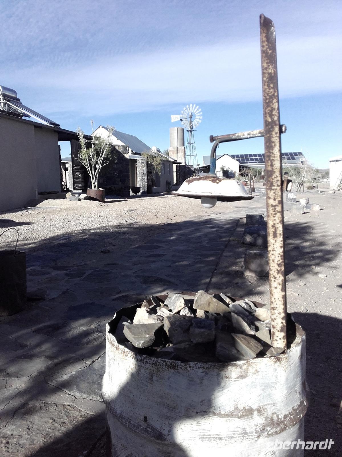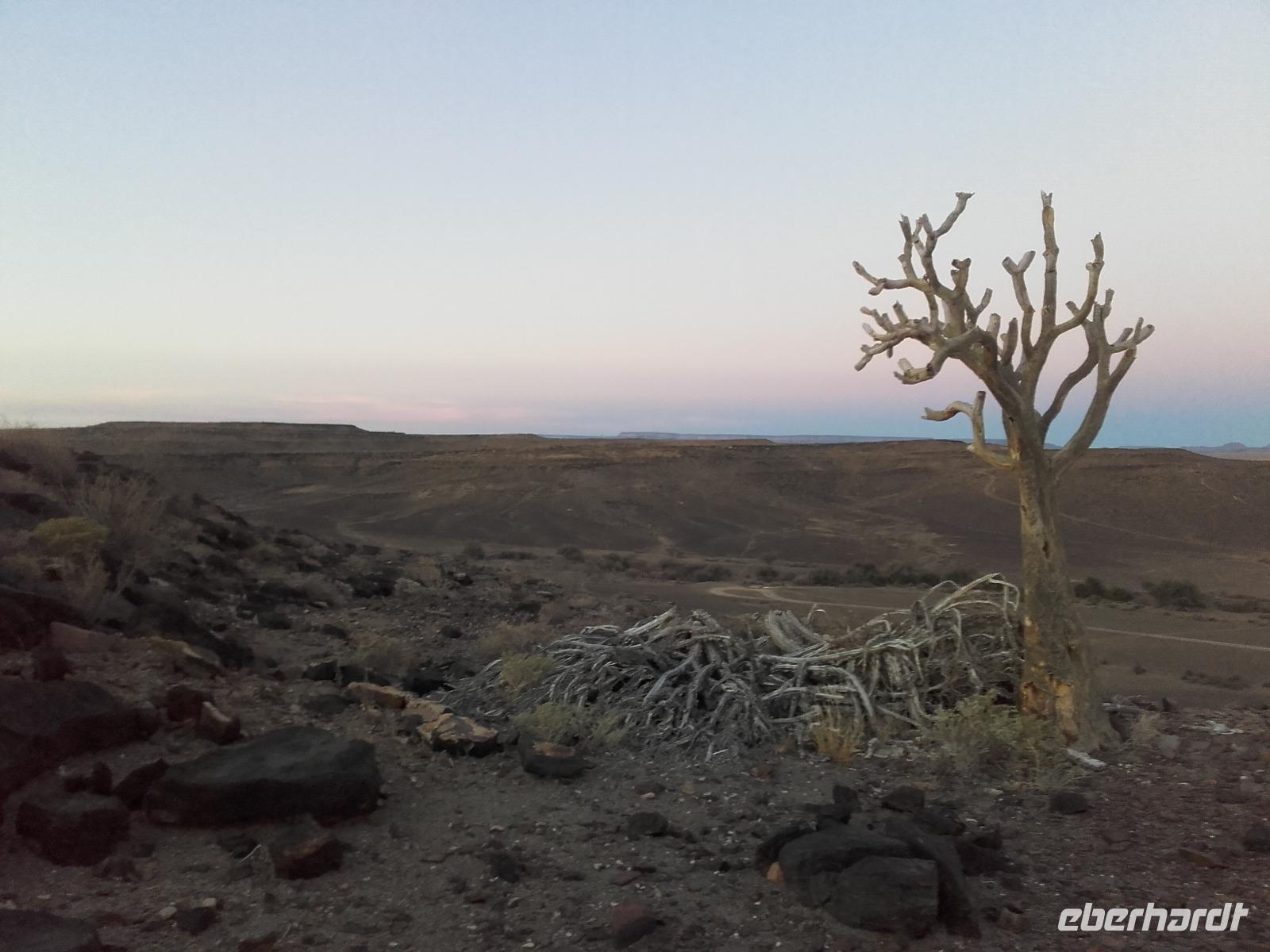 Den Nachmittag lassen wir gediegen angehen. Wir verwöhnen unsere Gaumen im lauscheligen Garten des Canyon Roadhouse und plaudern mit Eberhardt-Kollegen, die gerade auf ihrer Fahrt nach Südafrika „hereinschneien", so klein ist die Welt! In der Naute-Destillerie stärken wir uns mit Dattelschnaps und Kaffee und machen uns dann auf zur nächsten kuriosen Unterkunft unserer Reise. Frickie und seine Frau haben eine ehemalige Kalkbrennerei liebevoll zum Unterwegs-Zuhause für Abenteurer mit Geschmack umgebaut. Frickie zeigt uns seine akribisch gehegte Sammlung von Lebendigen Steinen: die sukkulenten Lithops sind Meister der Anpassung und faszinieren Wissenschaftler weltweit. Mit seinem burischem Charme lässt sich Frickie Löcher in den Bauch fragen und steckt mit seiner Begeisterung für die Pflanzen einfach an. Wir verquatschen uns so sehr mit ihm, dass wir uns schon wieder fast beeilen müssen, um pünktlich zur Eisenbahnbrücke zu unserem abendlichen Date mit der namibschen Sonne zu kommen :) Wie gut, dass heute kein Zug vorbeifährt, so genießen wir die Farbspiele der Dämmerung ganz für uns alleine, bevor wir uns von Frickies Frau an einer festlichen Tafel kulinarisch verhätscheln lassen. Henner sorgt mit seinen Geschichten zum südlichen Sternenhimmel dann noch für einen restlos romantischen Abschluss des Tages. Ja, ist denn heute Weihnachten?