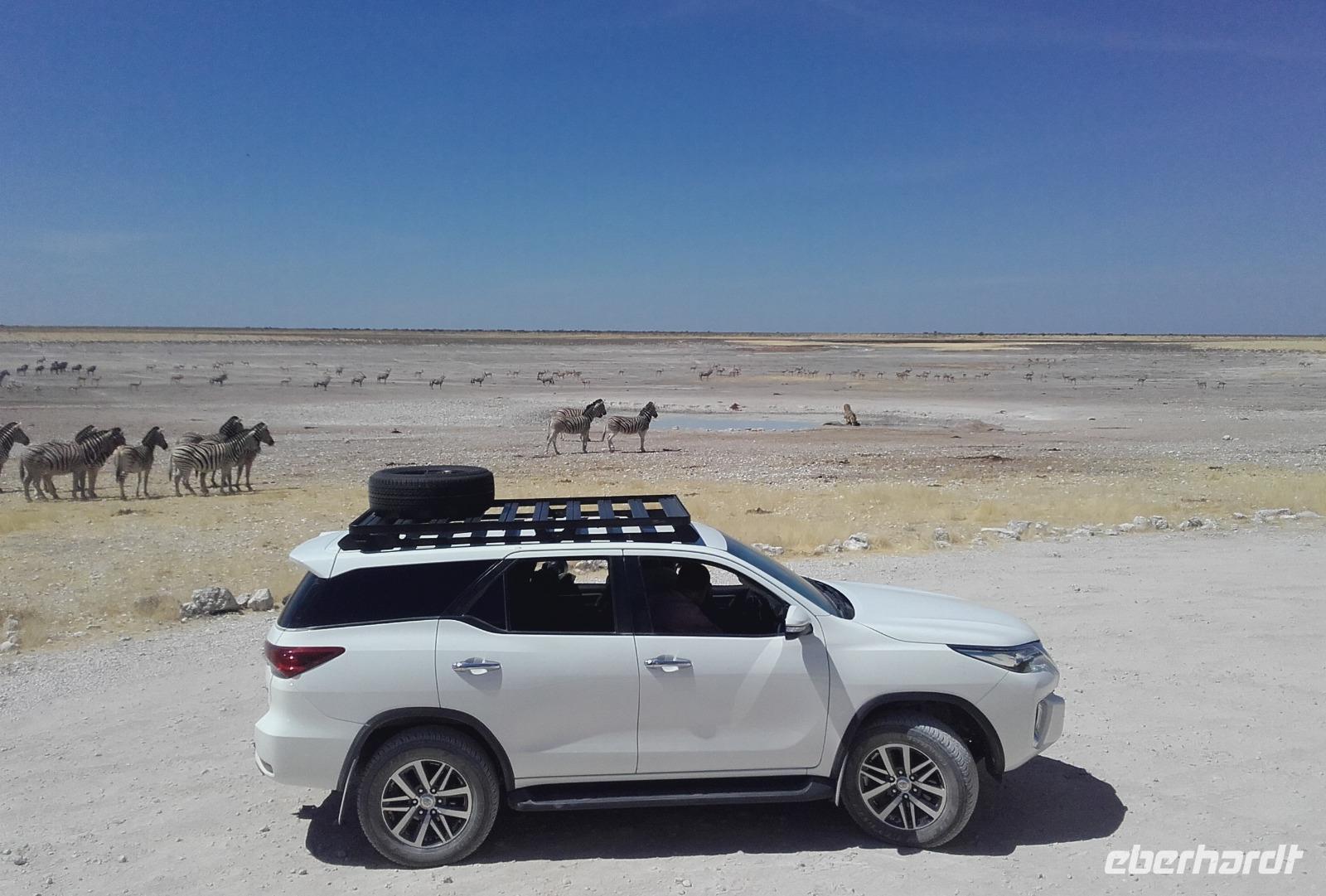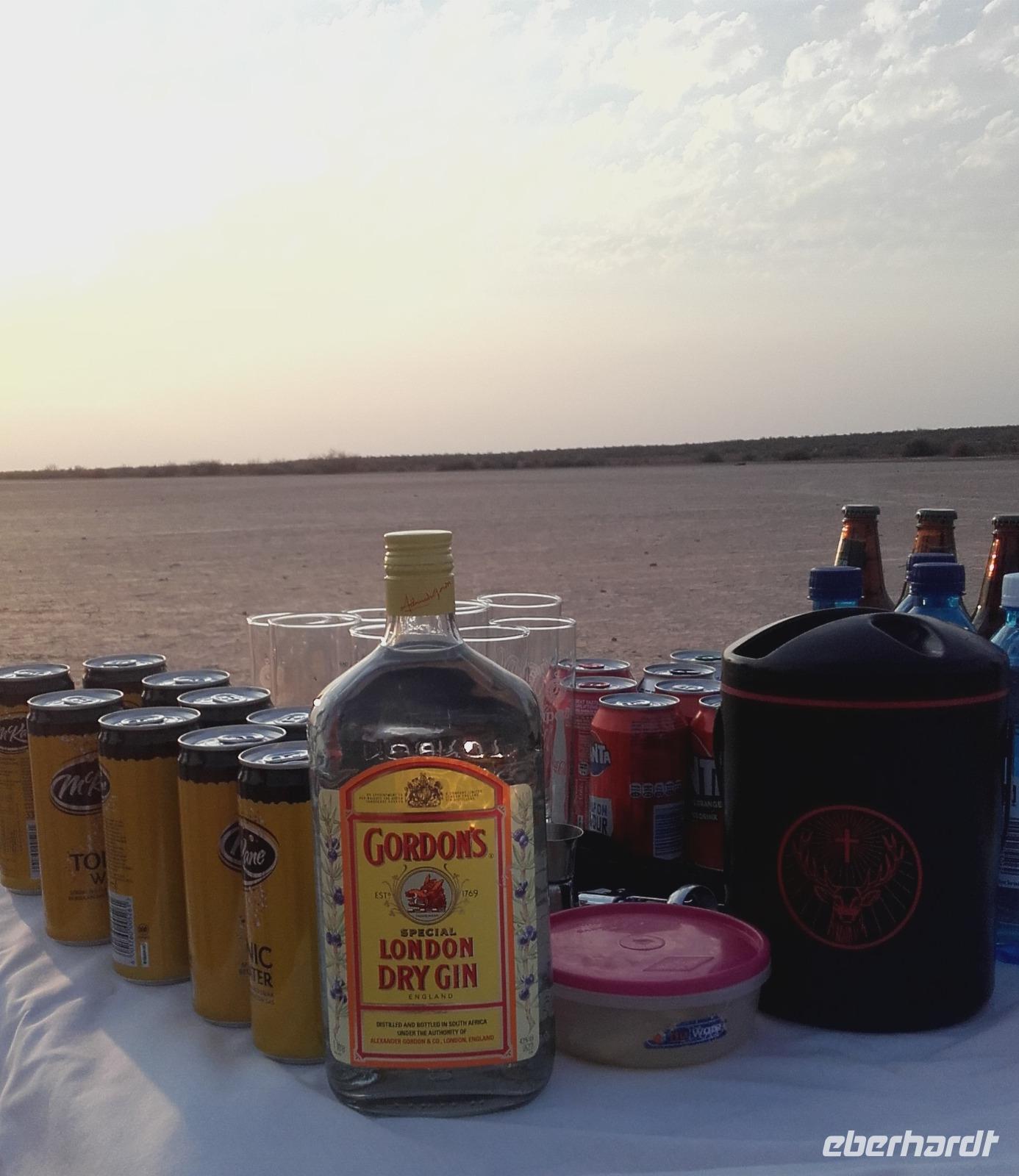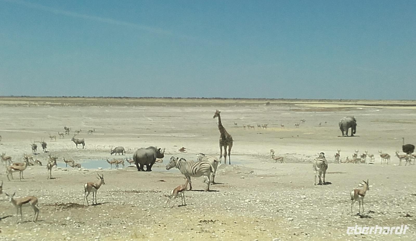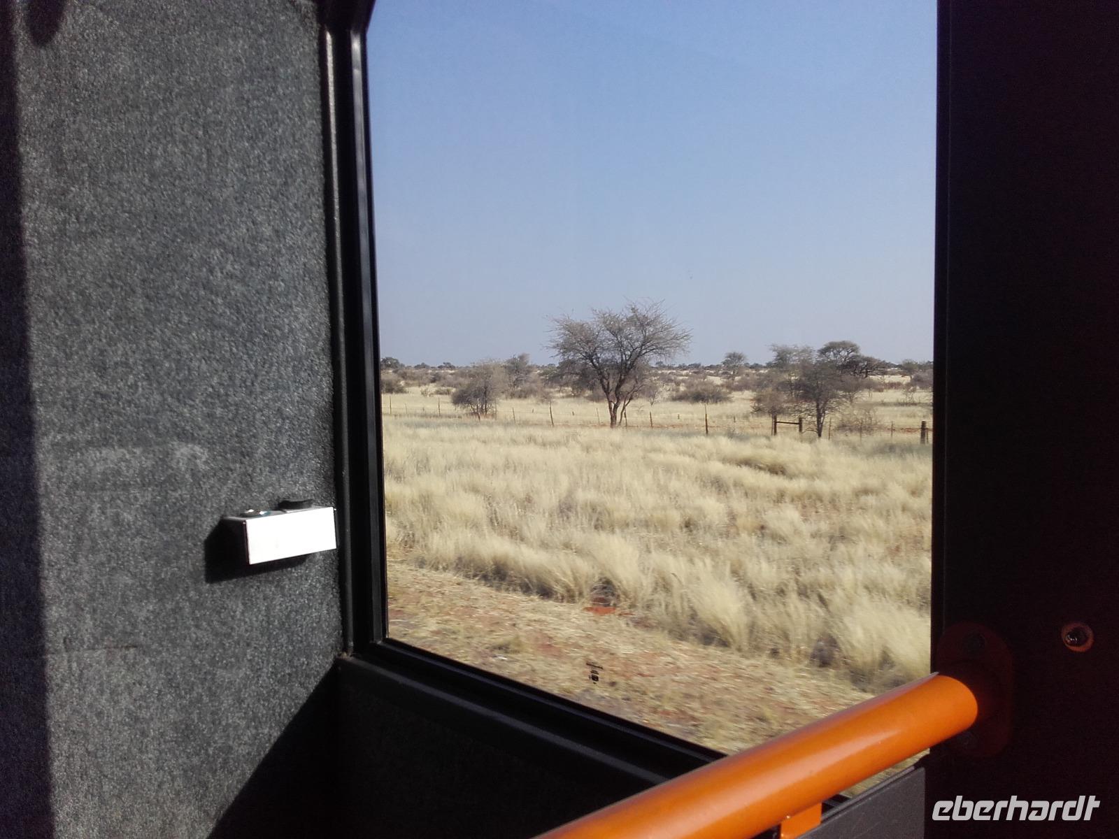 Noch schnell ein paar Geldscheine getauscht und in Adapter und Snacks investiert und schon sind wir mittendrin in unserem Namibia-Abenteuer. Wir lassen die Hauptstadt links liegen und ruckeln in unserem Truck der Kalahari-Wüste entgegen. An die rumpumpeligen Pisten müssen wir uns hier erst noch gewöhnen, aber dank eines ausgeklügelten Sitzplatzrotationsverfahrens werden wir schon noch Freunde werden: der Truck, die Pisten und wir. Die direkte Weiterfahrt ohne Siesta bereuen wir nicht, tauchen wir doch direkt ein in Henners Geschichten, in lokale Geschichten am Wegesrand, in die Geschichte der ganzen Nation und nach vier Stunden Fahrt vergessen wir fast im Hotel einzuchecken, denn uns begrüßt ein Nashorn am Wasserloch! Kann es besser beginnen?