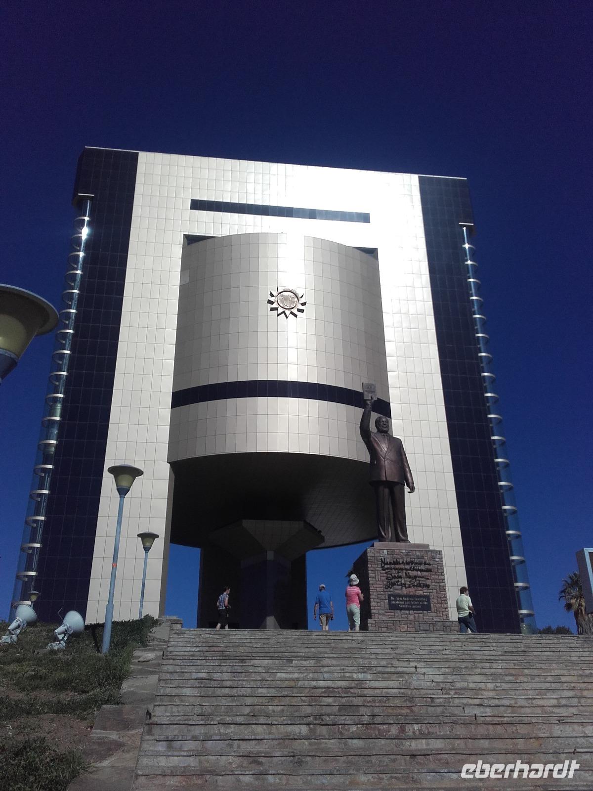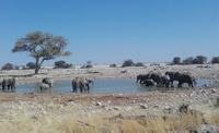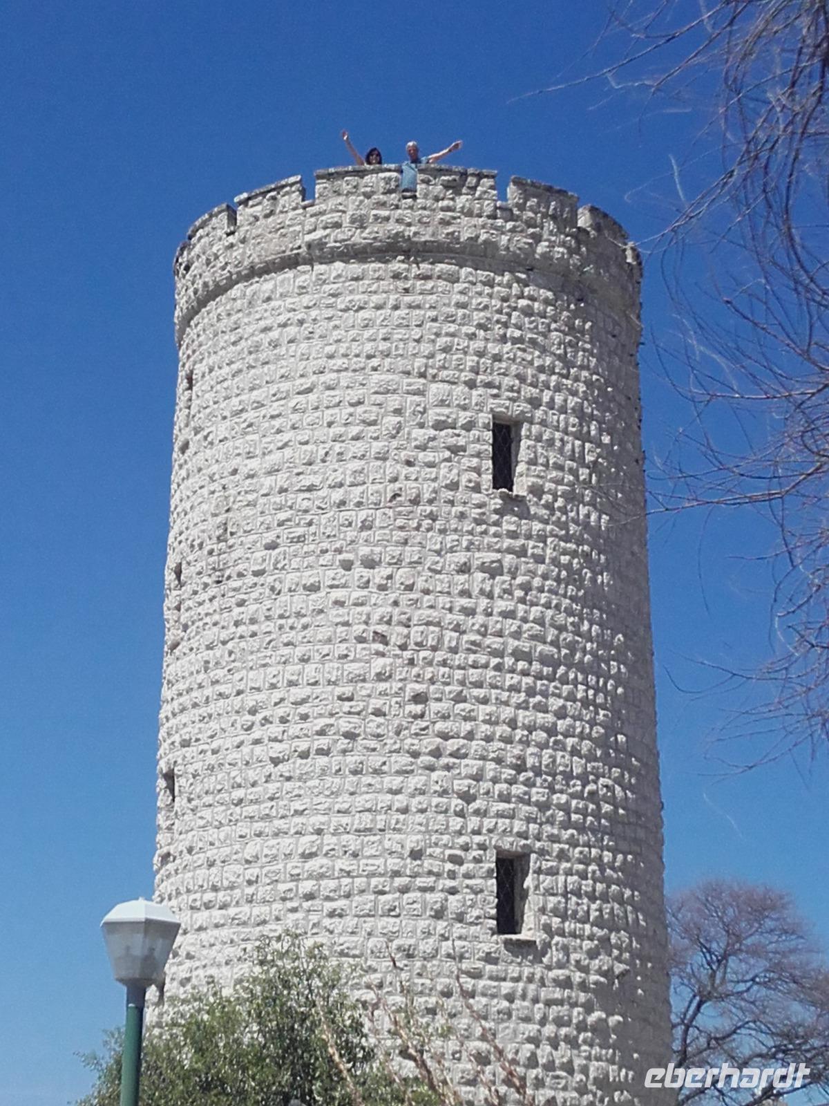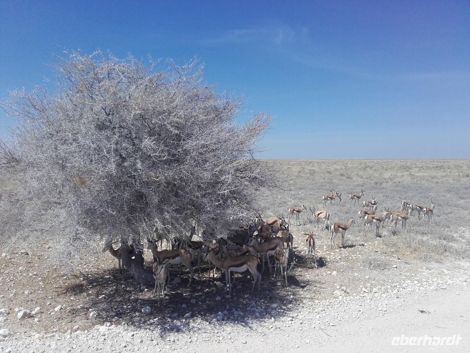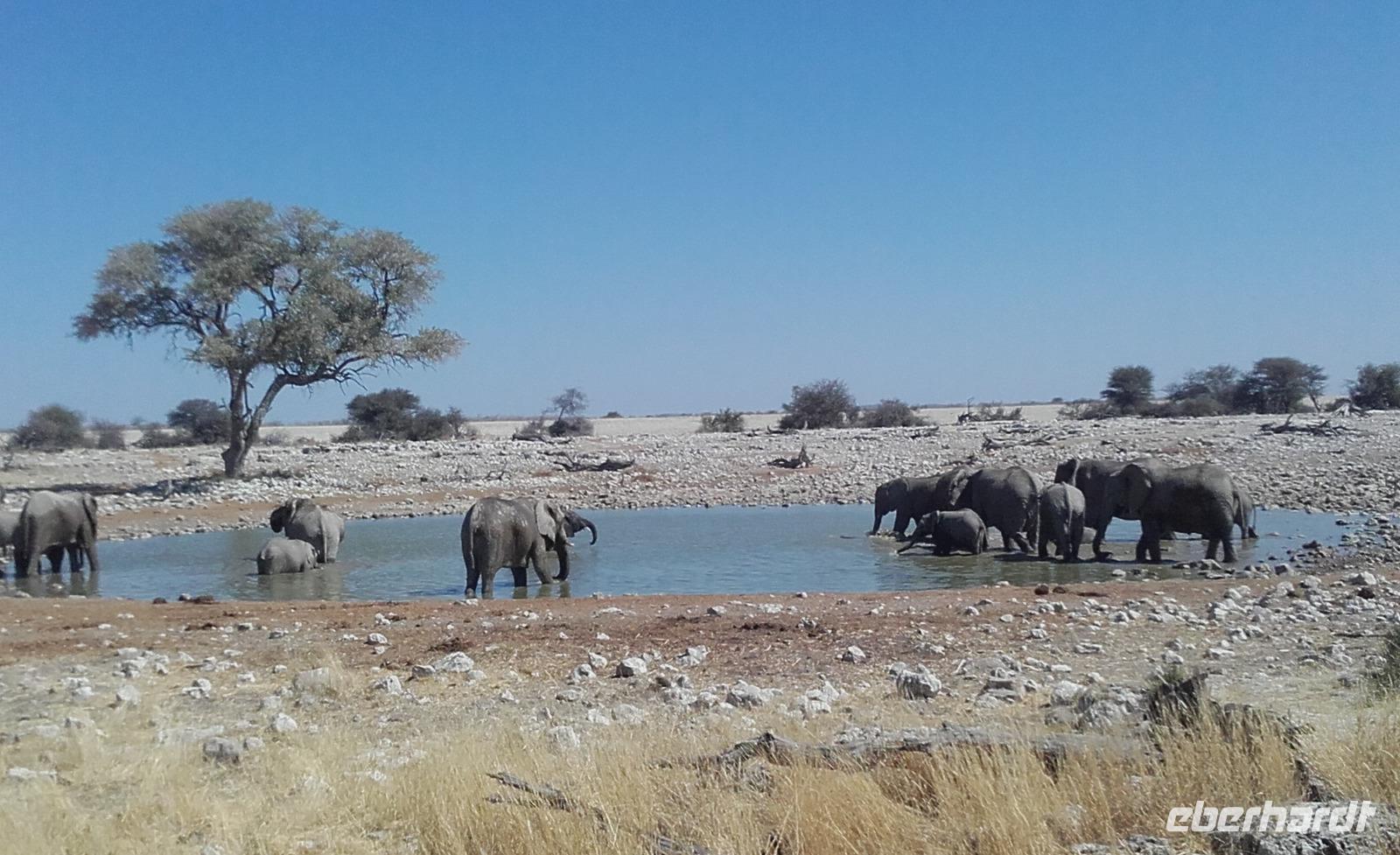 Noch schnell ein paar Geldscheine getauscht und in Adapter und Snacks investiert und schon sind wir mittendrin in unserem Namibia-Abenteuer. Wir lassen die Hauptstadt links liegen und ruckeln in unserem Truck der Kalahari-Wüste entgegen. An die rumpumpeligen Pisten müssen wir uns hier erst noch gewöhnen, aber dank eines ausgeklügelten Sitzplatzrotationsverfahrens werden wir schon noch Freunde werden: der Truck, die Pisten und wir. Die direkte Weiterfahrt ohne Siesta bereuen wir nicht, tauchen wir doch direkt ein in Henners Geschichten, in lokale Geschichten am Wegesrand, in die Geschichte der ganzen Nation und nach vier Stunden Fahrt vergessen wir fast im Hotel einzuchecken, denn uns begrüßt ein Nashorn am Wasserloch! Kann es besser beginnen?
