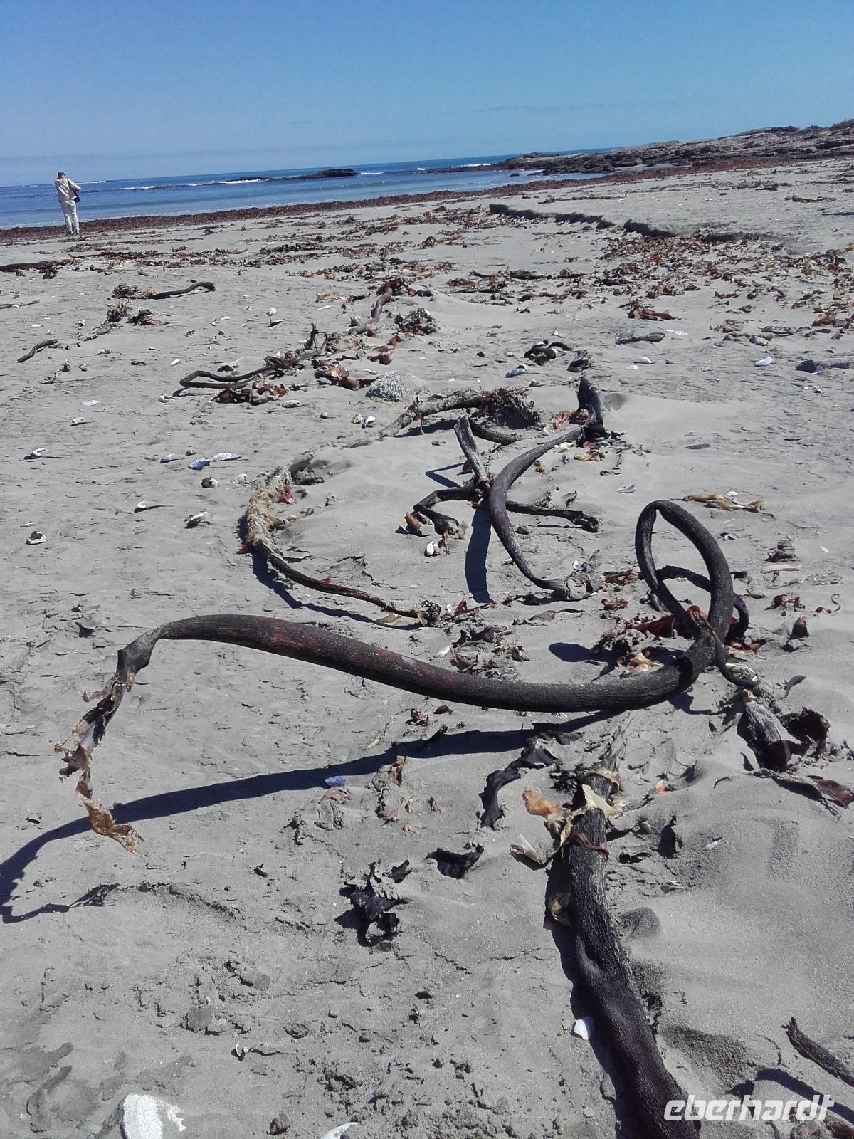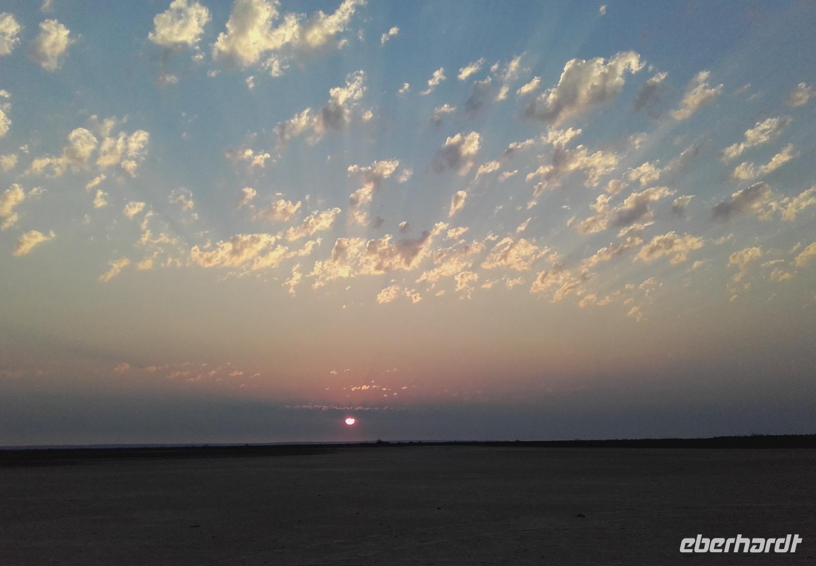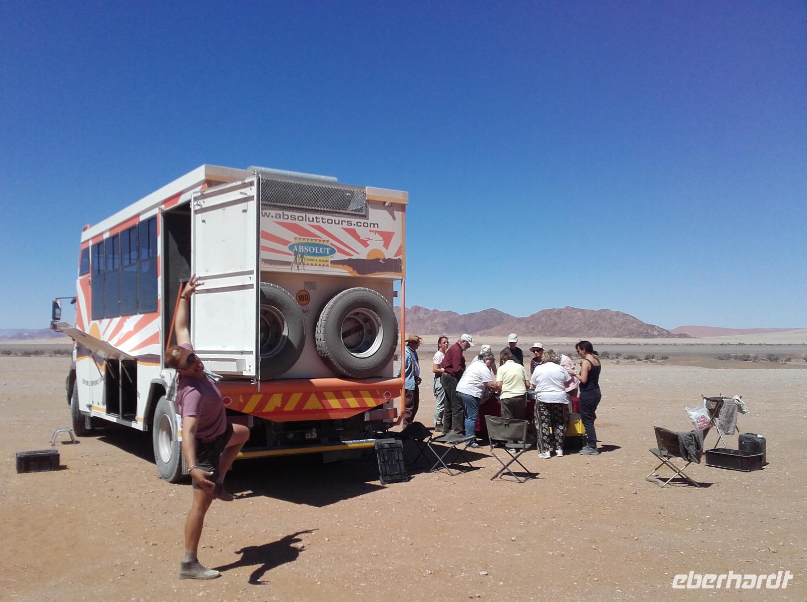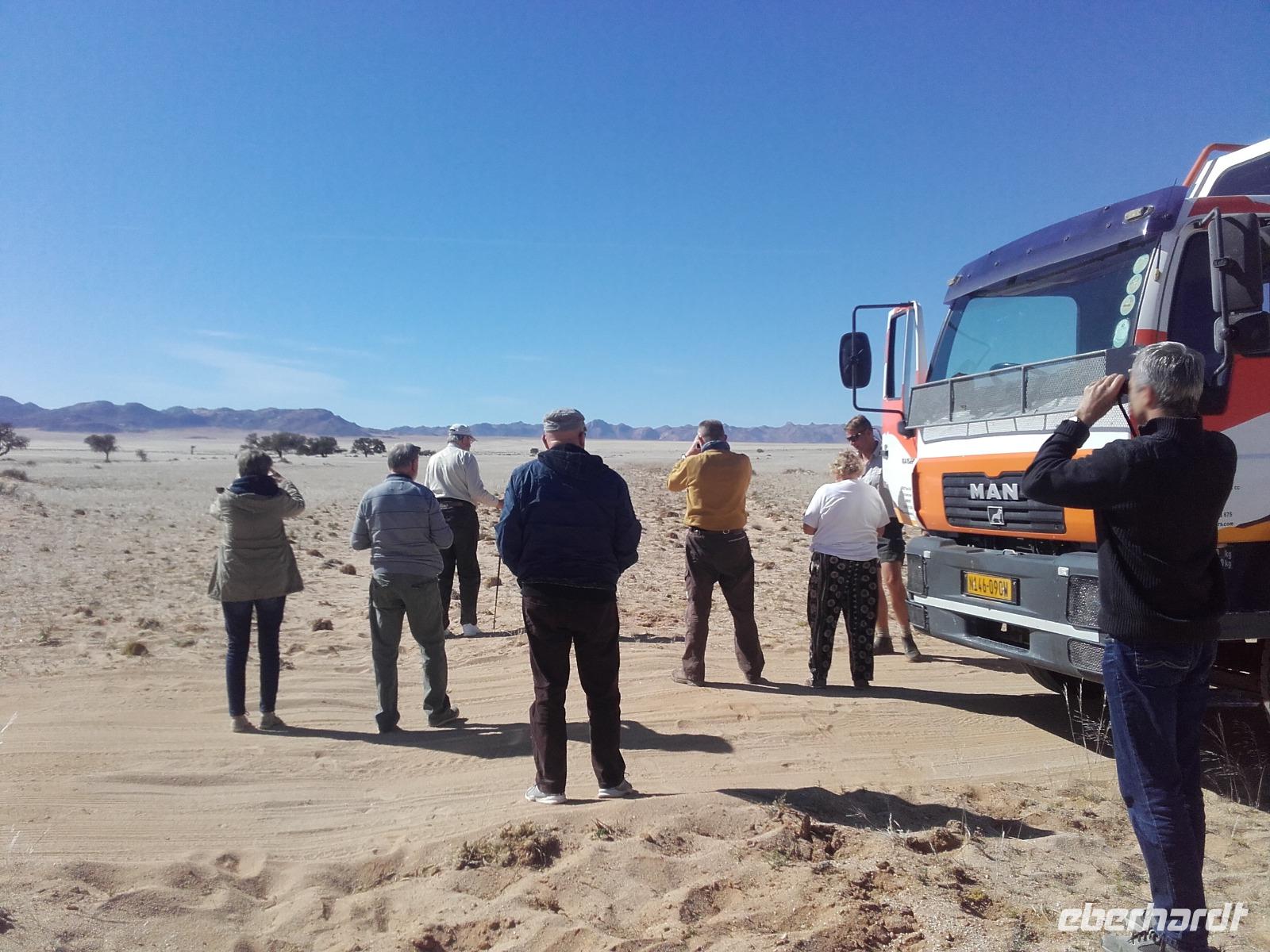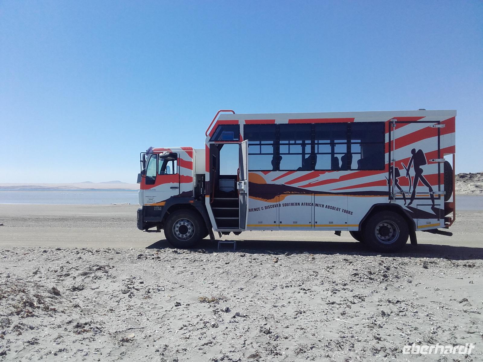 Aus der Wüste wollen wir zurück an die Küste. Dafür geht es erneut über den Wendekreis des Steinbocks, wir nähern uns dem nördlichen Teil unserer Reise. Das mit dem „Wir wollen raus aus der Wüste" ist gar nicht so leicht, denn diese zieht sich tatsächlich bis vor an die Küste und verschwimmt übergangslos zu was man einen Sandstand nennen würde. Also wird es ein rumpumpeliger Fahrtag, damit unser Truck auch mal wieder auf seine Kosten kommt.