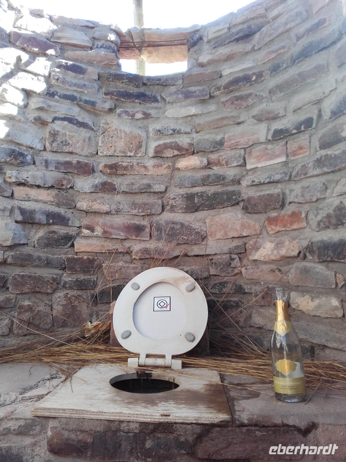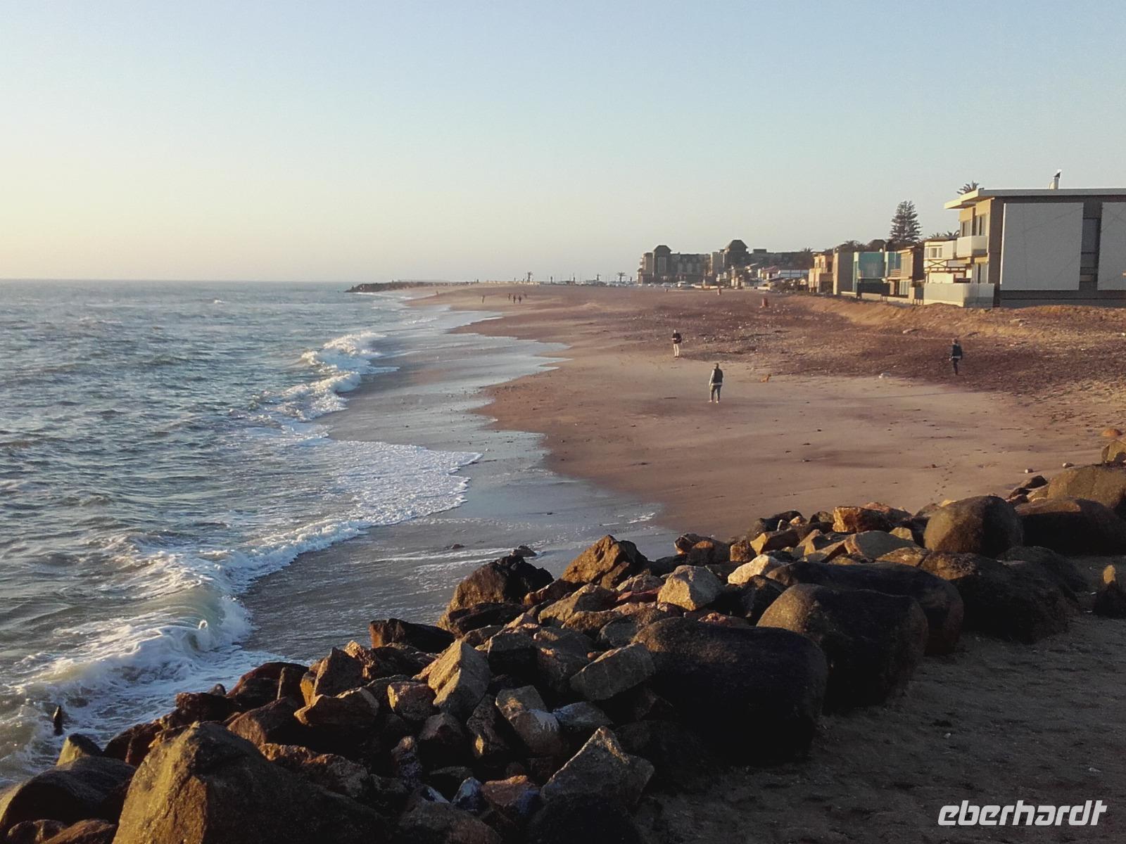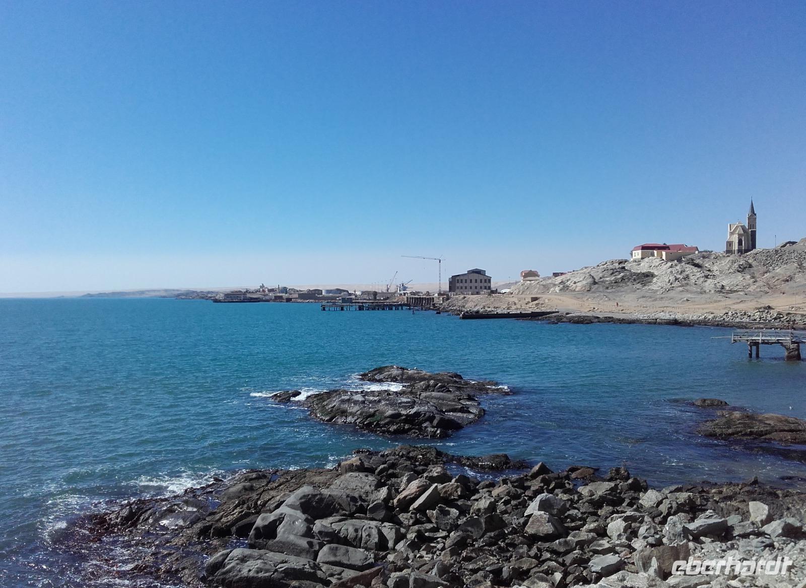 Und was ist für die hervorragende Laune von Reisegruppen überlebenswichtig? Eine gute Verteilung von Toilettenstops über den Tag. Gar nicht so leicht heute! Kilometerlang gibt es nichts und dann biegt Henner plötzlich links ab und entschädigt uns mit dem schönsten Toiletten-Stopp der Reise! Inmitten von Staub und Sand steht ein Holzverschlag. Ein Campingplatz soll das sein. Und tatsächlich unter Felsvorsprüngen gibt es gemütliche Picknicktische und wer noch ein Stückchen weiterklettert erhascht auf der anderen Seite wunderschöne Ausblicke auf die weite Ebene. Als der Entdeckerdrang und alle anderen Bedürfnisse gestillt sind, zuckeln wir weiter und fahren an Walvis Bay vorbei bis nach Swakopmund.