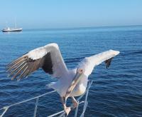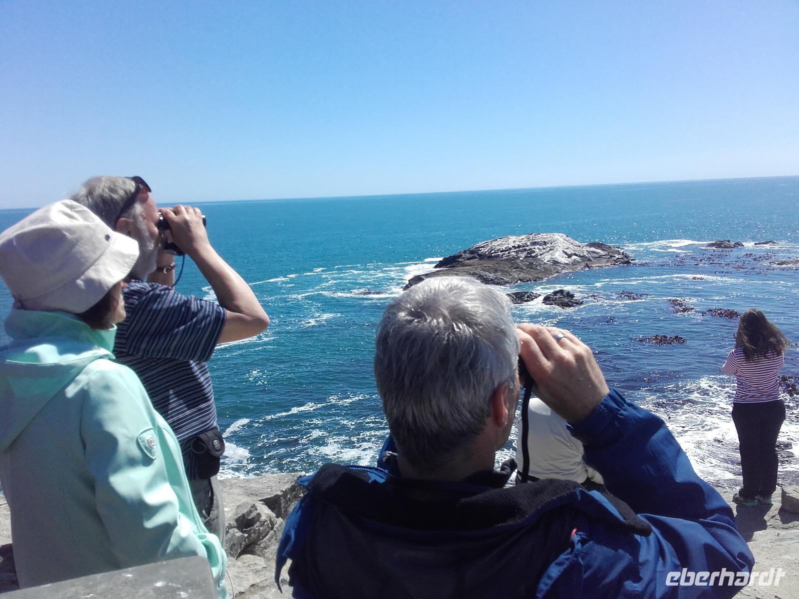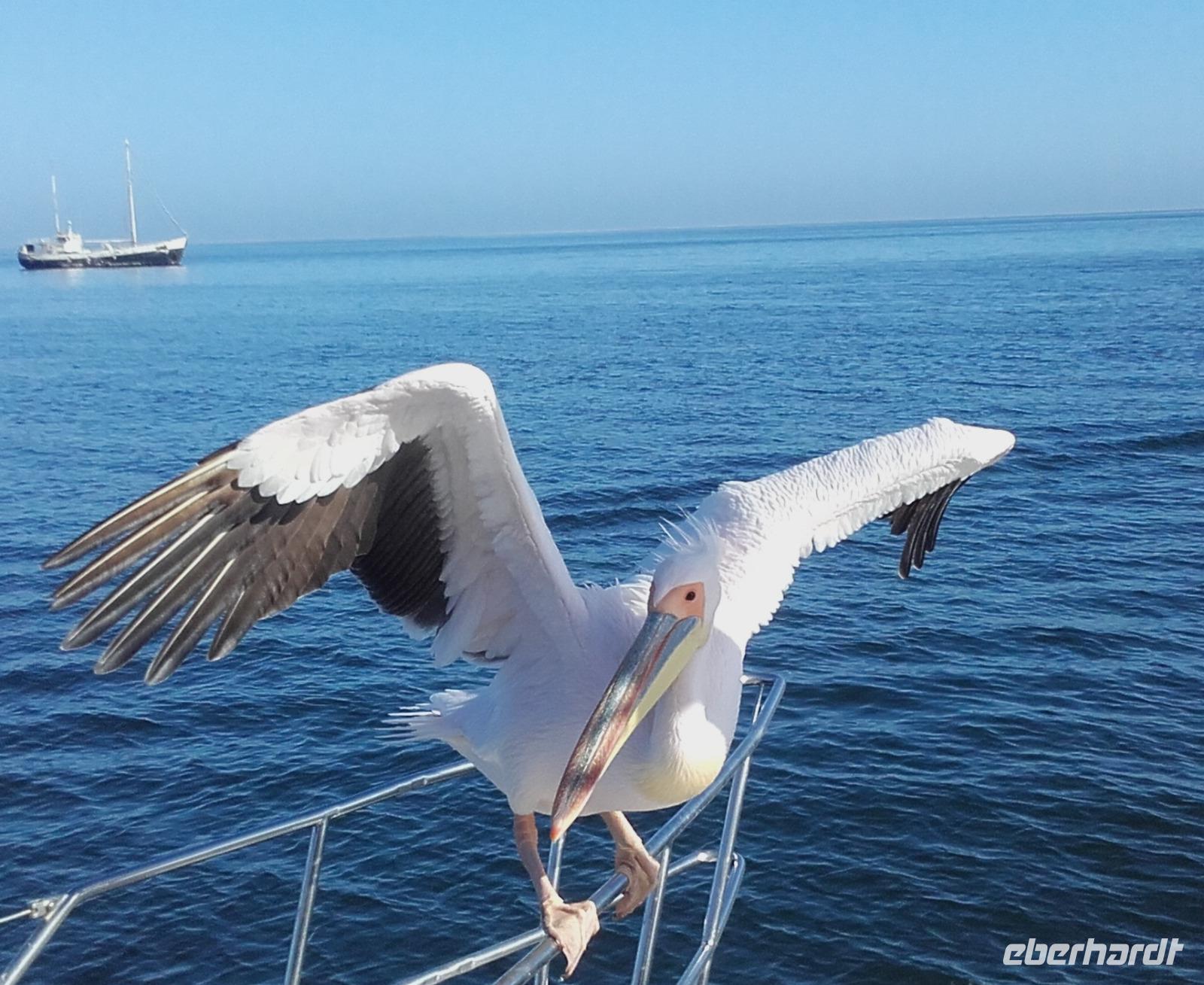 Zum zweiten Mal an der namibischen Küste, da wollen wir es jetzt aber genau wissen und endlich auch mal in See stechen! Schon das üppige Frühstück mit Sekt in unserem Hotel lässt vermuten: es wird ein genussvoller Tag heute. Das Wetter könnte schöner nicht sein, bei bestem Sonnenschein freunden wir uns mit Pelikan Lady Gaga an, genießen das Brüllkonzert der Ohrenrobbenkolonie und erhaschen dann sogar ein paar Blicke auf Walflossen. Gigantisch!