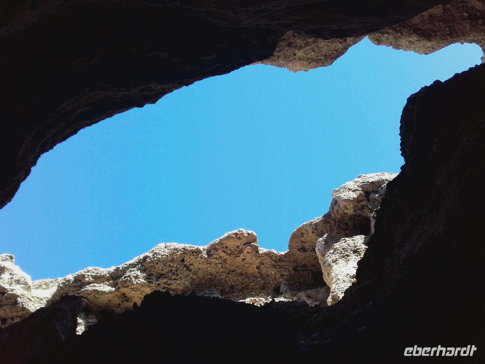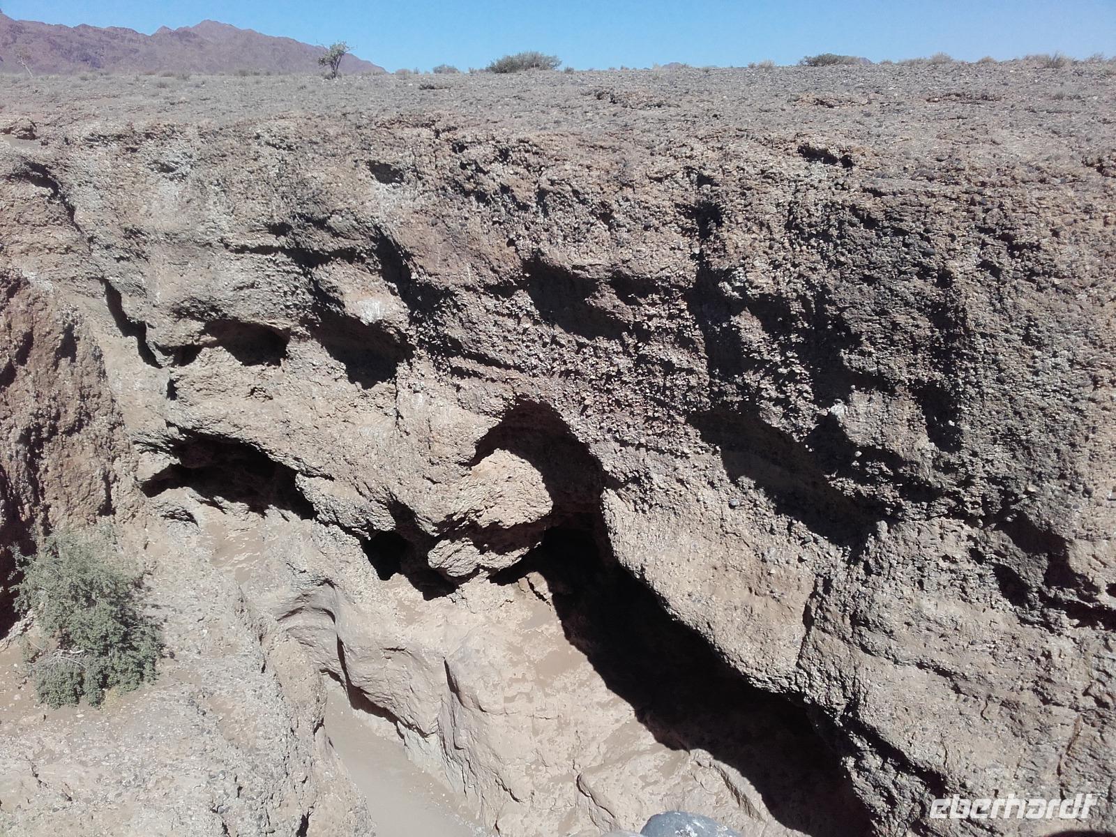 Nachmittags steigen wir in den Sesriem-Canyon hinab. Hier erlebt unser Henner seinen magischen Moment des Tages: Egal, wie oft er schon hier war, über sich den schmalen Spalt im Boden zu sehen und gleichzeitig in einem breiten Canyon wandern zu gehen, beeindruckt ihn jedes Mal aufs Neue.