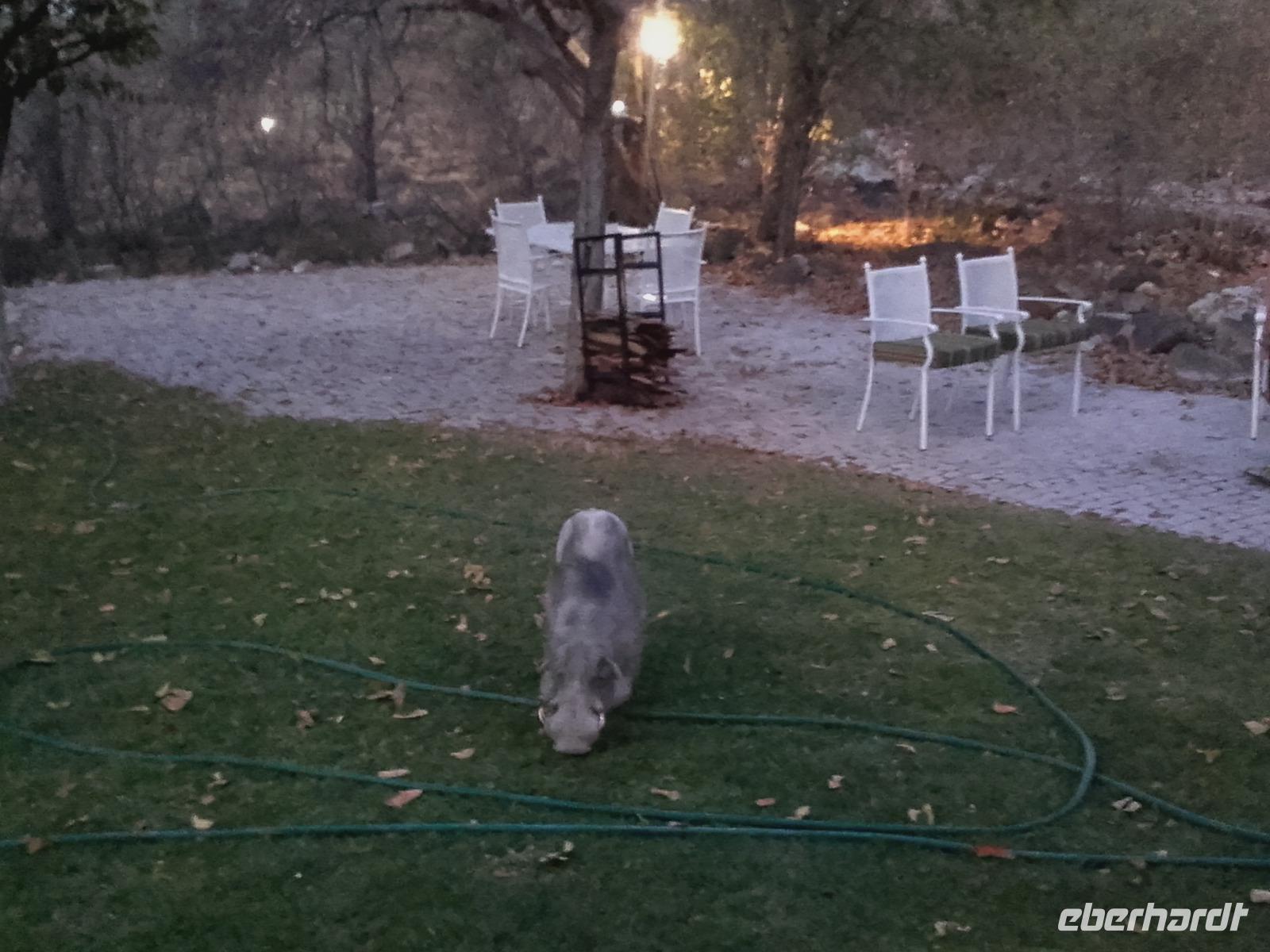 Wie das mit dem hiesigen glücklich und zufrieden sein so in der Realität funktioniert, dazu erzählt uns Farmer Guido beim gemeinsamen Sundowner so einiges. Gespannt lauschen wir seinen Geschichten, wie er mit den Dürren und der Abgeschiedenheit, mit nicht mehr funktionierender Rinderzucht, Wildtieren, Gästefarm und Home Schooling hin und her jongliert, um sich und seinen Kindern eine gute Gegenwart und Zukunft zu ermöglichen. Er scheint aber guter Dinge zu sein und es macht einfach Spaß, den Abend mit ihm und seinen charmanten Praktikantinnen aus Deutschland zu verbringen. Über die Generationen hinweg tauschen wir uns aus: passionierte Weltenbummler unter sich und der namibischen Abenddämmerung. Herrlich!