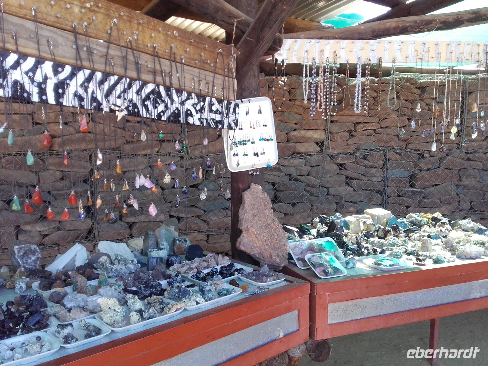 Von der Küste geht es weiter nördlich mitten hinein ins Damaraland. Was uns Henner zu Beginn der Reise auf der Karte zeigte, schauen wir uns jetzt direkt vor Ort an. Bereits beim ersten Zwischenstopp spüren wir die kulturelle Vielfalt Namibias: Die verschiedenen Völker des Landes sind so unterschiedlich, bunt und schön, wie die Mineralien, Kunsthandwerk- und Schmuchstücke, die uns auf einem Herero-Markt mit angenehmem Eifer angeboten werden.