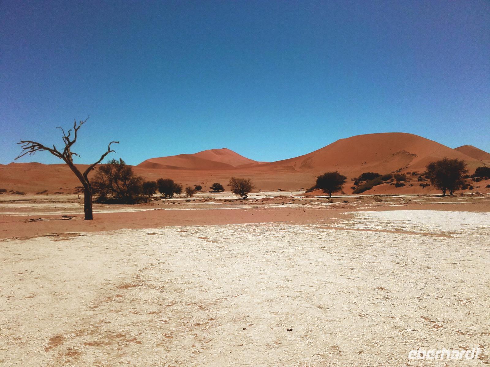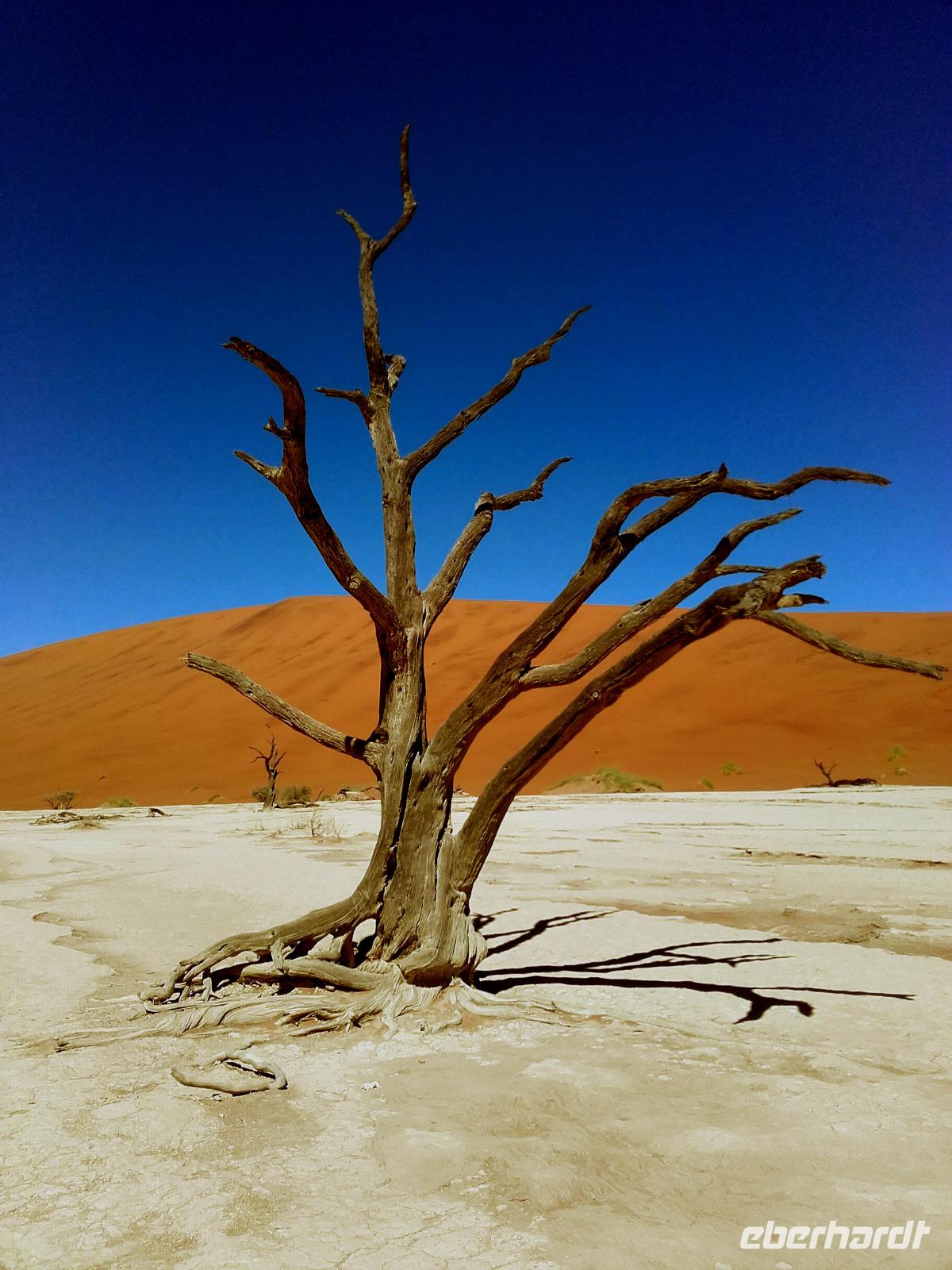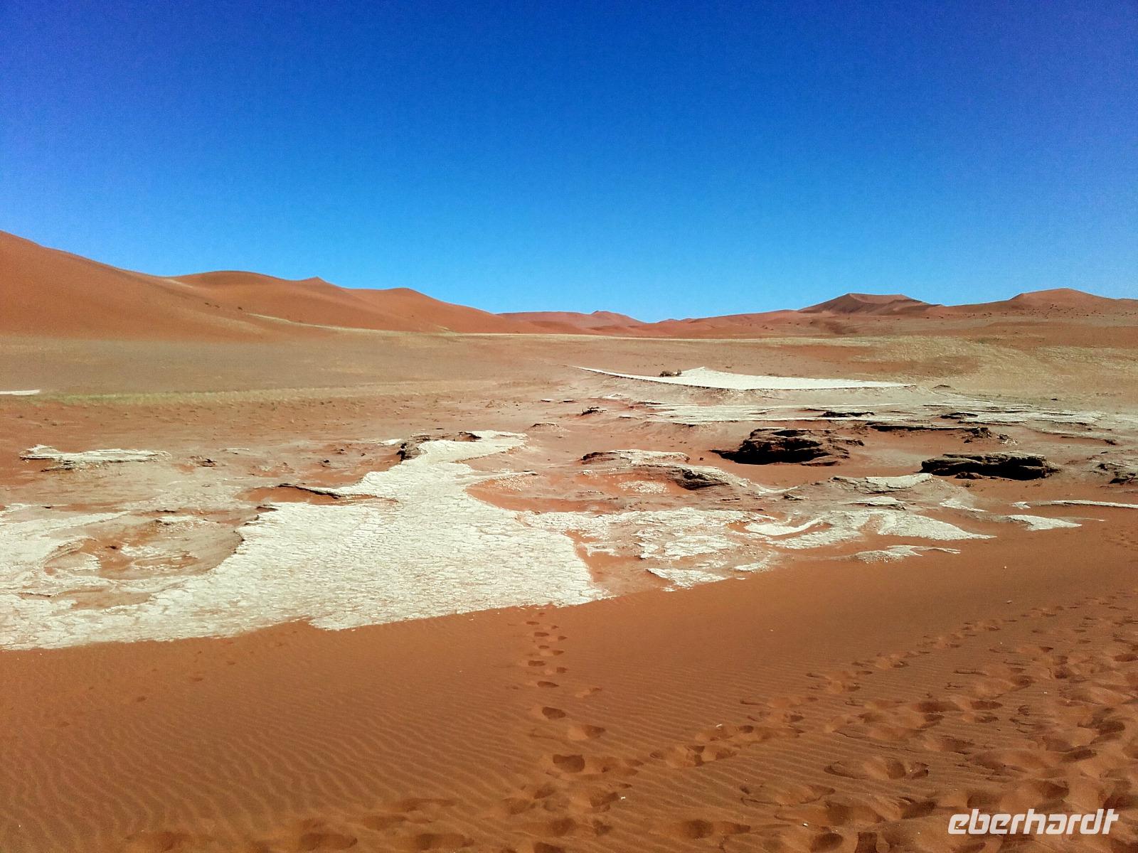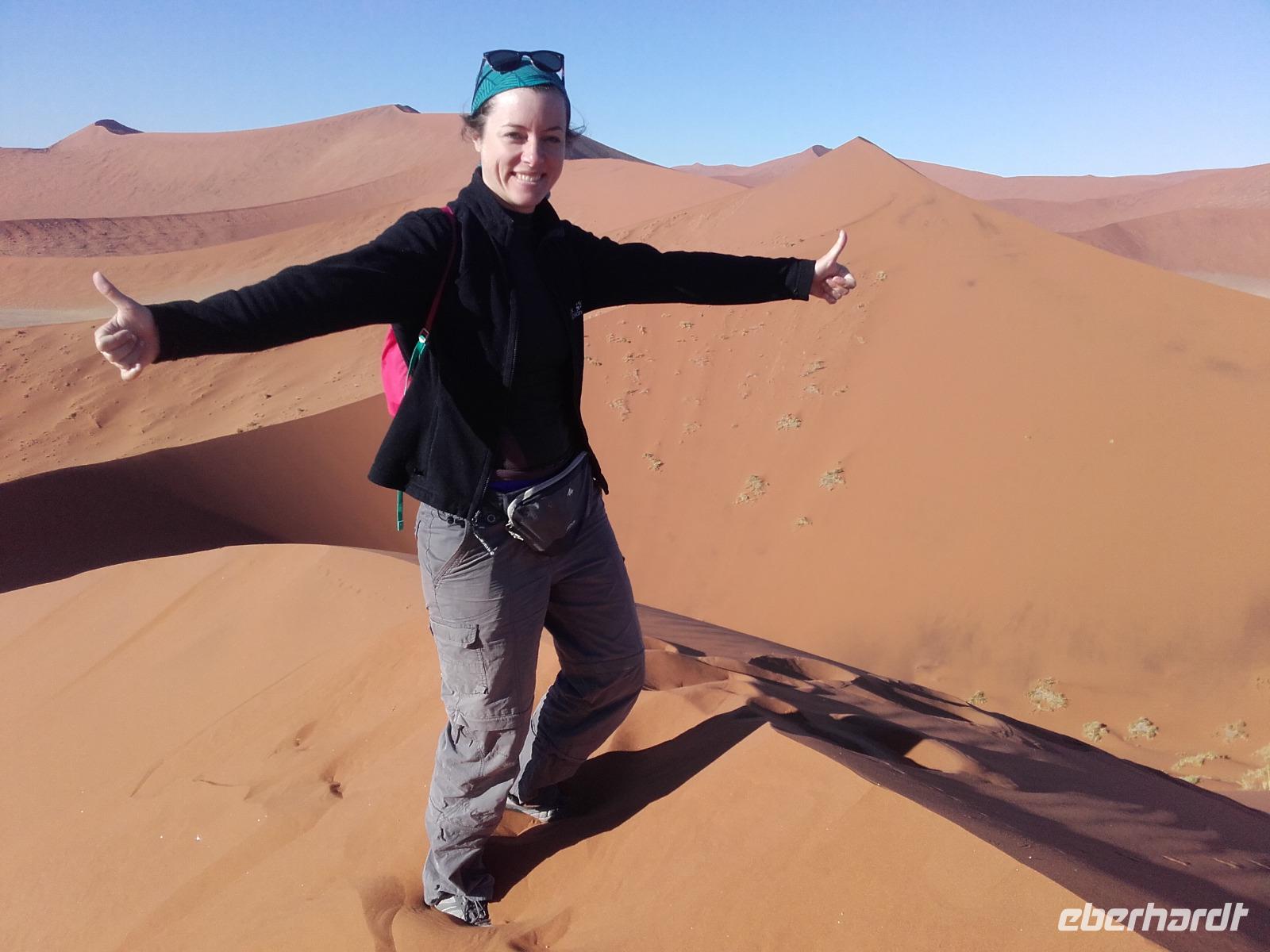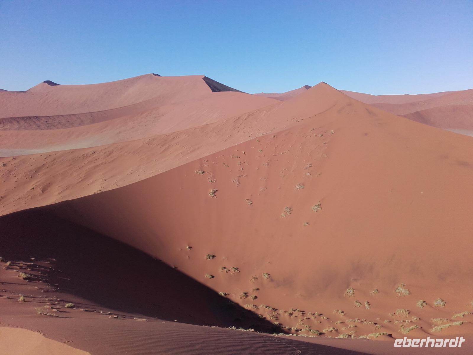 Heute sind wir frühe Vögel. Kurz einen Kaffee geschlürft und dann machen wir uns bei Sonnenaufgang auf zu einem weiteren Höhepunkt unserer Reise: der Namib-Naukluft Nationalpark mit seinen roten Dünen wartet auf uns. Nach ersten Fotostopps wollen wir es dann richtig wissen. Wir erklimmen die Düne 45, jeder so hoch, weit und schnell wie er möchte. Und jeder erlebt hier seinen eigenen magischen Moment. Wenn die gewaltigen Sandmassen unter den Füßen und in den Schuhen kribbeln, wenn neben einem 100 Meter tief die Düne abfällt, nur um dann so weit das Auge reicht, sich mit weiteren bis zu fast 400 Meter hohen Dünen zu vereinen, wenn man diese Millionen von Jahren spürt, dann ist das einfach unglaublich. Dann möchte man einfach die ganze Welt umarmen. Erstaunlich, dass die Dünen so viele Jahre erhalten bleiben, wenn jeder nach dem Hinunterpurzeln so viele Kilo Sand aus seinen Schuhen herausklopft wie wir, dann dürfte nächstes Jahr die Düne eigentlich abgetragen sein...