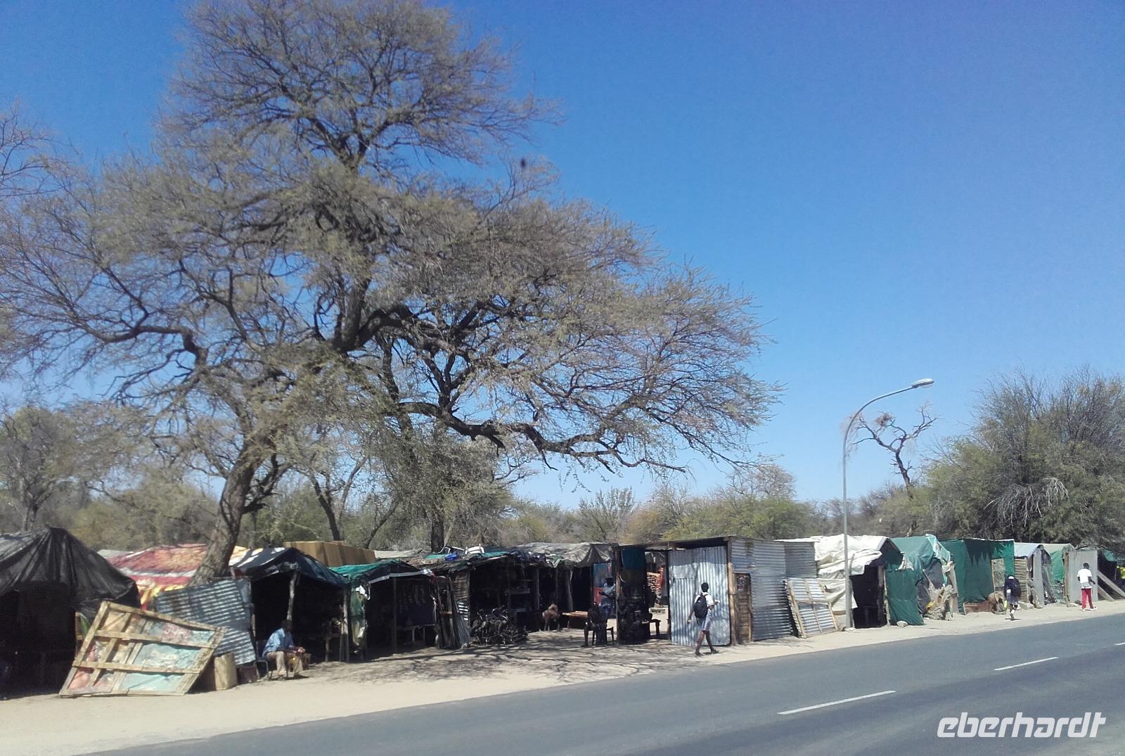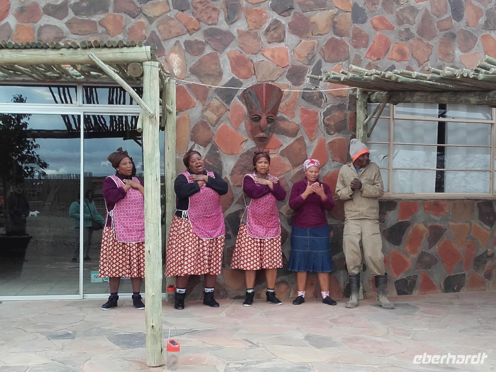 Nachdem wir uns gestern so gut mit den Deutschsprachigen der Farm angefreundet haben, haben heute andere Sprachen ihren großen Auftritt: die guten Feen aus Guidos Küche präsentieren uns mit viel Freude (man kann gar nicht sagen, wen sie mit ihrem Gesang mehr bespaßen wollen, uns als ihre Gäste oder sich selbst...) die Klicklaute ihrer Muttersprache. Nach diesem kulturellen Appetitshappen zum Start in den Tag stürzen wir uns gleich in weiteres lokales Getümmel: beim Einkaufen in Maltahöhe vergnügen wir uns ein Weilchen auf dem wuseligen Dorfplatz, wo gegrillt und das neuste Geplauder ausgetauscht wird. Hier geht so einiges ab, denn man kann ihn zwar vielleicht schon sehen, aber wir sind ja hier nicht etwa am Ar... der Welt oder so.