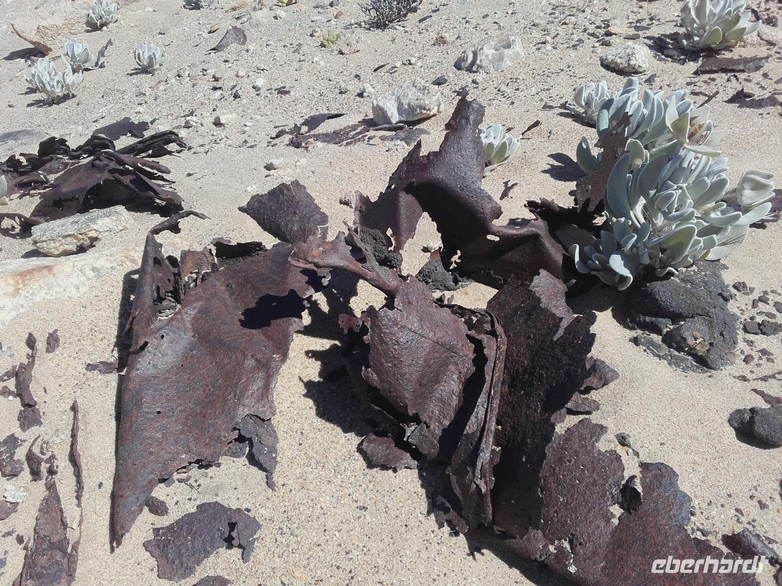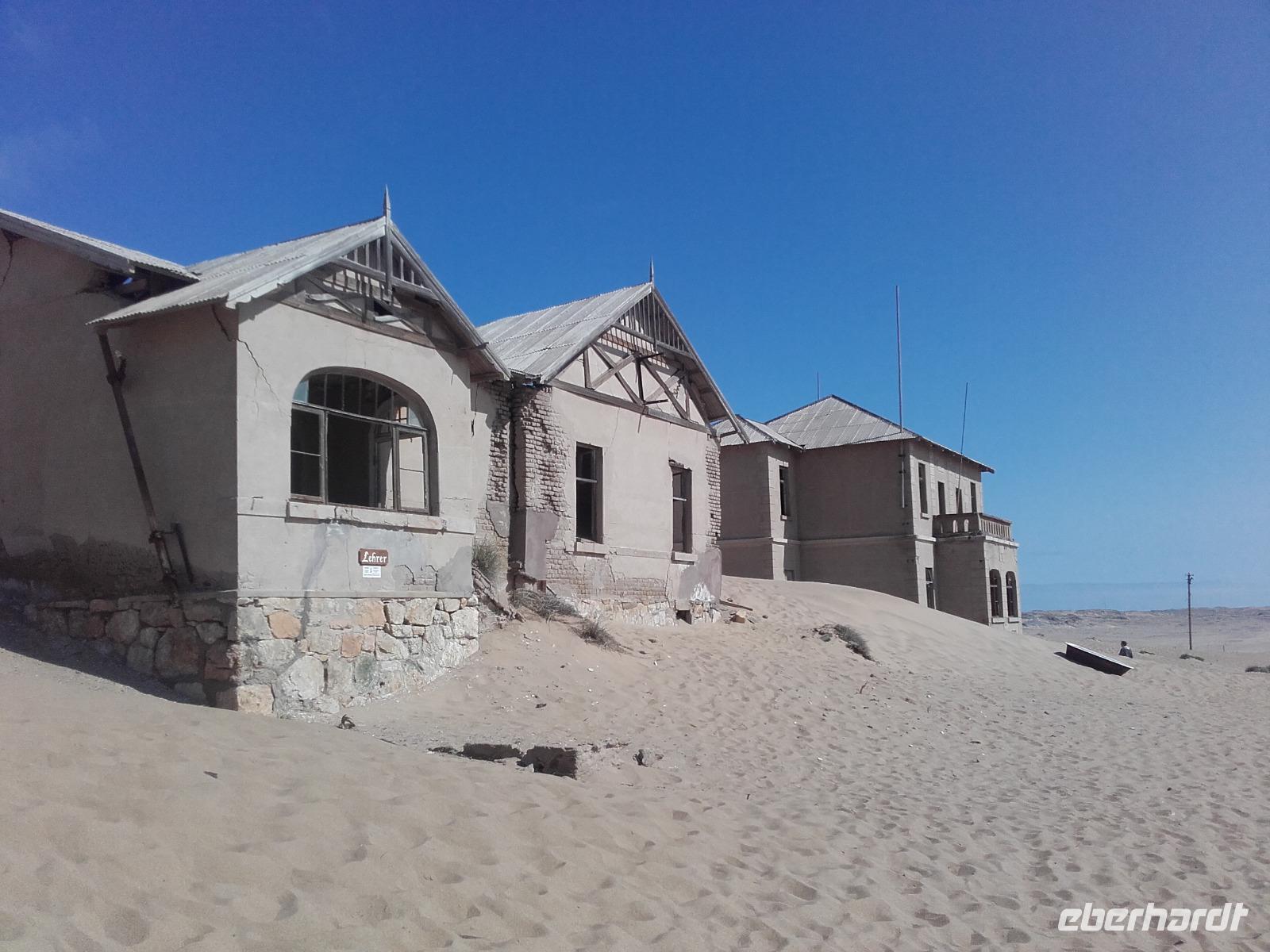 Interessant finden wir die Geographie der Arbeiterstadt Walvis Bay. Zwischen Dünen und Meer haben sich viele kleine dunkelgraue „Schuhkartons" angesiedelt, auch die Gärten der Häuschen bestehen nur aus Sand. Auf dem Wasser sehen wir Ölplattformen wie Schiffe vor Anker liegen. Mit Schleppern wurden sie aus Angola hergebracht, wie uns Henner erzählt. Acht Stück werden in Reihe gebracht, damit eine einzige Wachmannschaft vor Ort ausharren kann, bis der Ölpreis wieder eine Bohrung ausreichend rentabel macht.