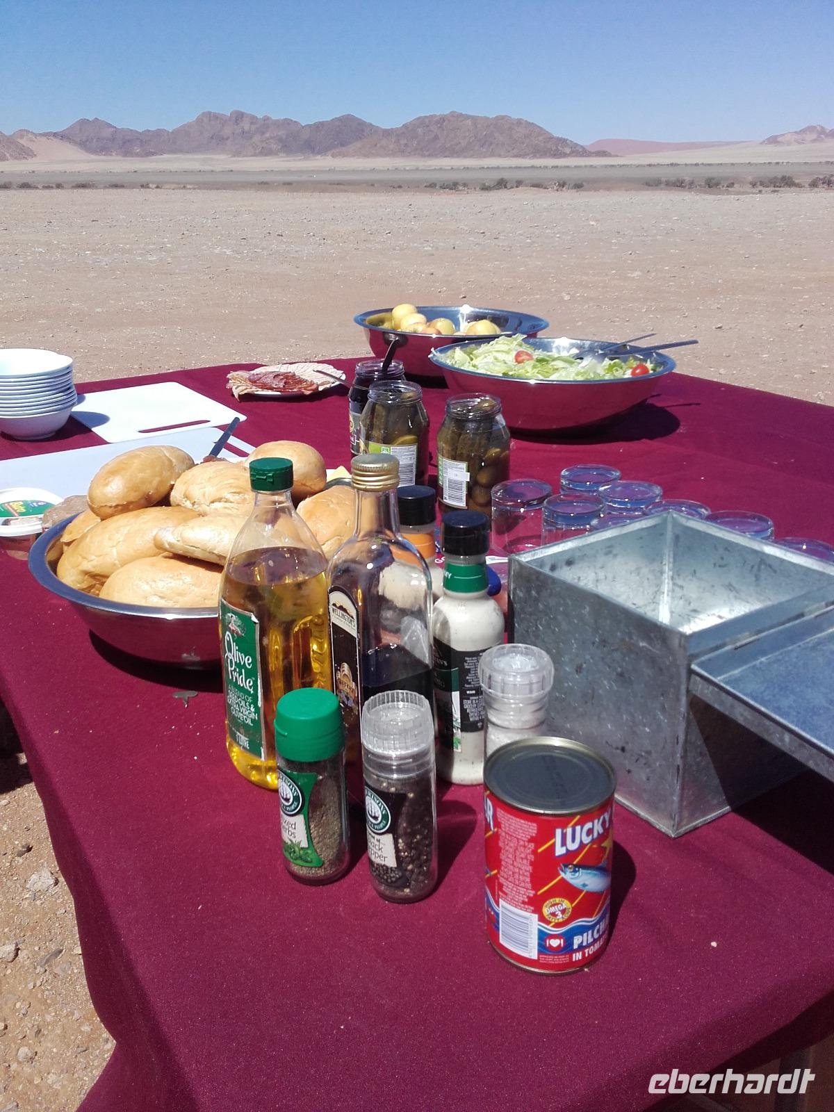 Und sie wirkt immer. Ganz egal, ob man neugierig-unternehmungslustig umherhüpft, um möglichst alles zu erkunden - die fotogenen abgestorbenen Bäume im Dead Vlei zum Beispiel - oder ob man sich einfach ein Stündchen unter einen Kameldornbusch verkrümelt und dabei die Natur meditativ in sich aufsaugt, kleine Krabbeltierchen wie den Nebeltrinker-Käfer beobachtet, der sich mit seinen zurückgebildeten Flügeln perfekt an das Atmen unterm Sand angepasst hat, oder vielleicht an die deutschen Geologen denkt, die in der Wüste gelebt haben. Wirkungsvoll finden wir auch unser selbst geschnippeltes Picknick, für das Henner uns ein lauscheliges Plätzchen an der Düne 1 auskundschaftet. Wie gut auf einmal so ein simples Käsebrot schmecken kann!