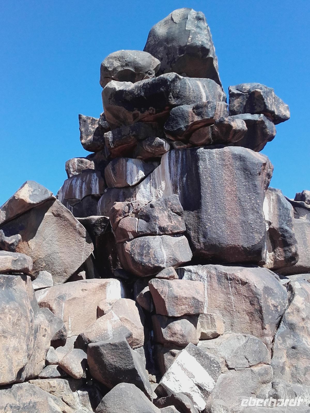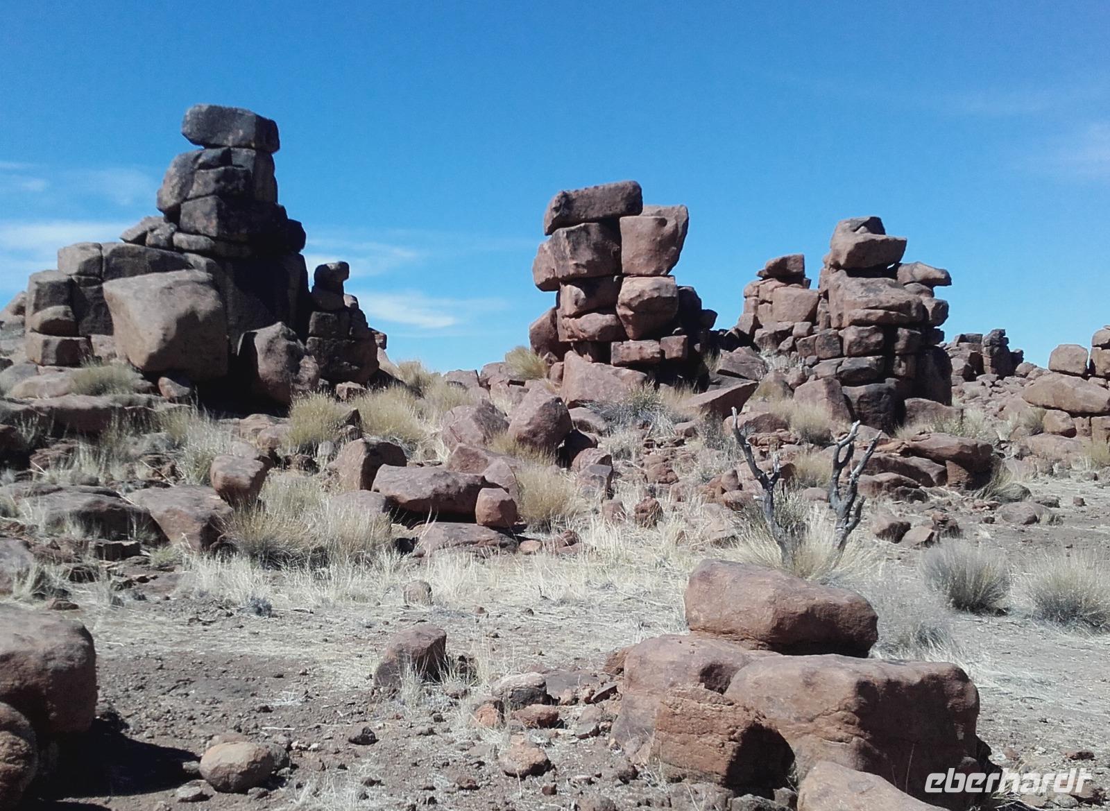 Am Brukkaros Vulkanberg vorbei fahren wir zum Köcherbaumwald. Die flachwurzelnden Aloes halten sich am subvulkanischen Doleritgestein fest, welches beim von Magmenaufstieg begleitetem Auseinanderbrechen des Urkontinents Gondwana entstand. Besonders niedlich finden wir die kleinen Klippschliefer, die so gar nicht scheu sind, dass wir aufpassen müssen, nicht über sie zu stolpern. Das mit dem Doleritgestein schauen wir uns im Giant's Playground noch einmal genauer an. Sind die aufeinandergetürmten Formationen hier wohl durch Verwitterung oder durch spielende Riesen entstanden? Jeder darf sich seine Lieblingsgeschichte dazu aussuchen.