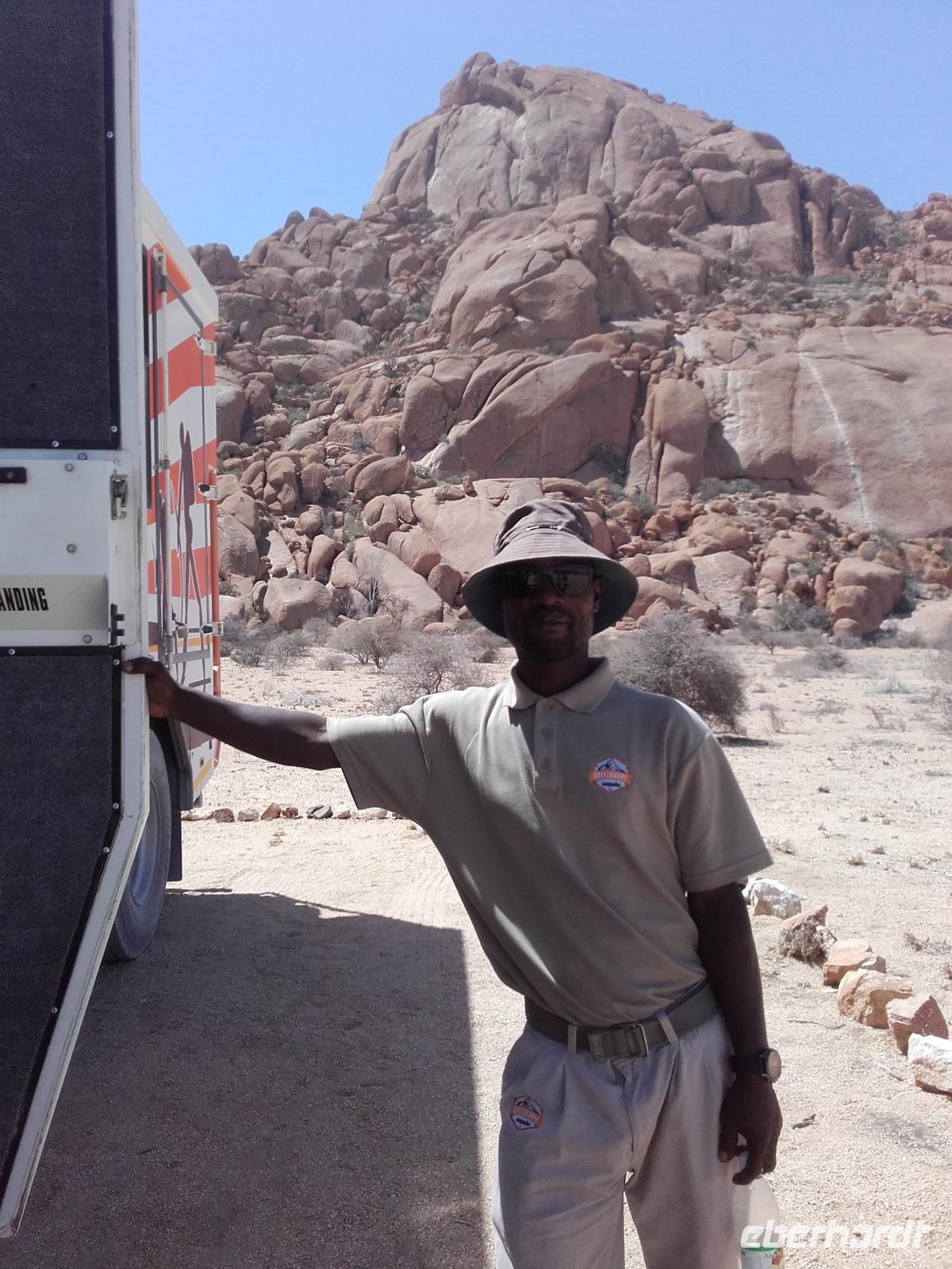 Die nehmen wir uns auch erst mal, um unseren Fahrer und Reiseleiter, unser Mädchen für alles, einfach unseren Mann für Namibia kennen zu lernen: Goeie dag, lieber Henner!