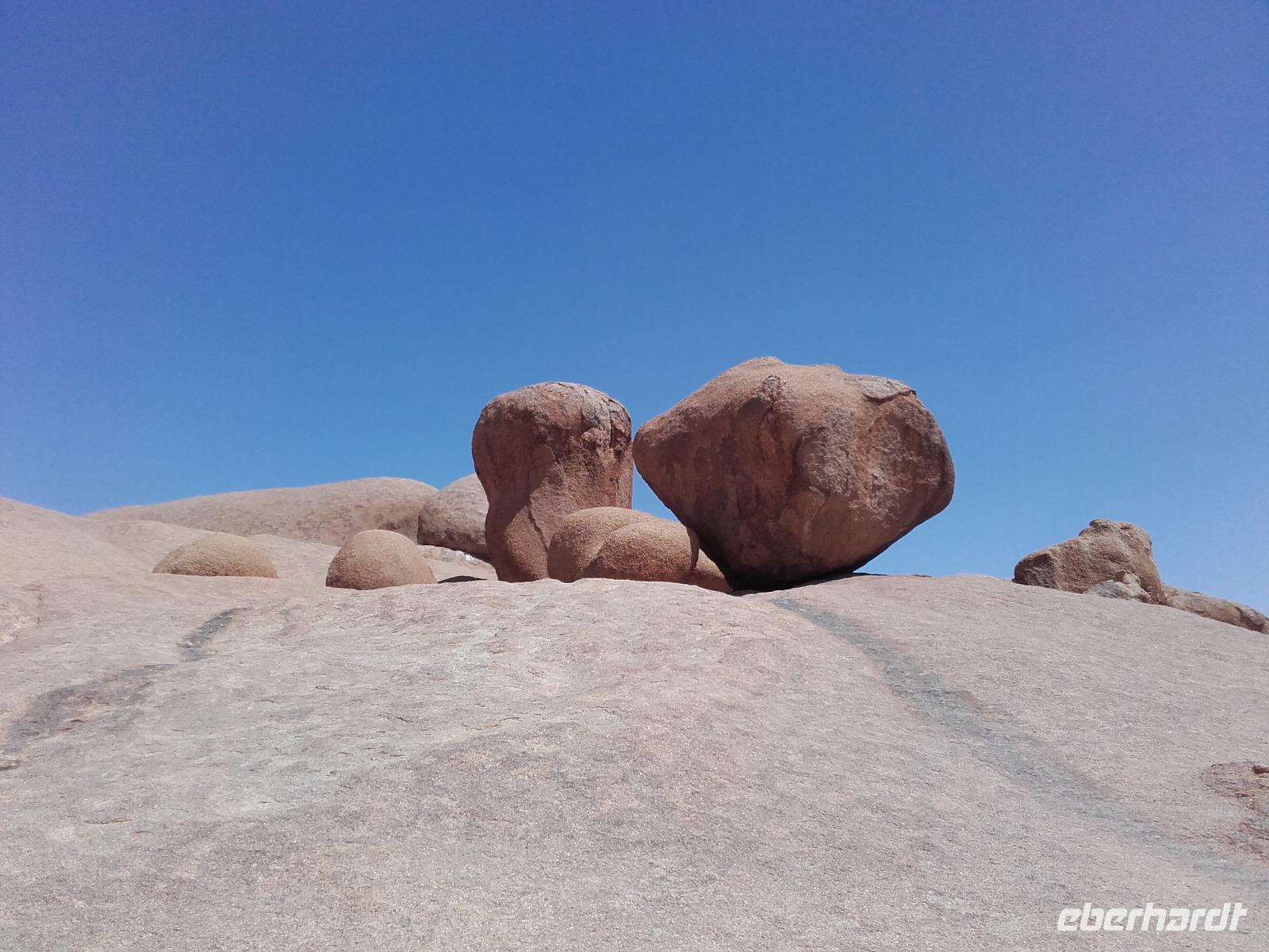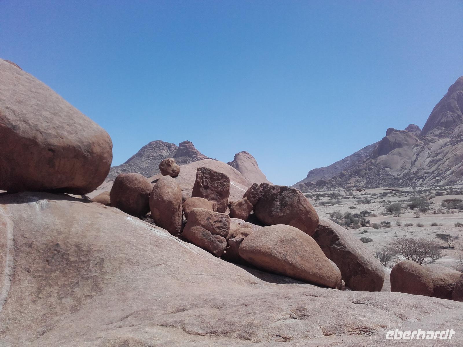 Bei der Spitzkoppe nehmen wir uns Zeit, tiefer einzusteigen. Ein lokaler Damara-Guide zeigt uns mit Stolz seine Heimat, samt der Namibischen Giftwolfsmilch (Euphorbia virosa), mit dessen Milch die Buschleute ihre Giftpfeile bestrichen. Oryxe und Nashörner freuen sich über die nahrungsspaltende Eigenschaft des Giftes, aber wir halten heute vorsichtshalber lieber Abstand. Damit eben jener im Sinne des Denkmalschutzes respektvoll eingehalten wird, dürfen sich Gäste und Wanderer nur in Begleitung von Einheimischen den Felsmalereien von Spitzkoppe nähern. Wir lernen einiges über die pragmatische Symbolik der Malereien. Die nomadischen San zogen in einem heute mehrere Staaten wie Botswana und Simbabwe umfassenden Gebiet umher und brauchten bis zu vier Jahre, bis sie an ein und denselben Ort zurückkehrten. Die Felsmalereien zuvor dagewesener Gruppen gaben ihnen dabei Auskunft über Wasserlöcher, Beutetiere und Ähnliches. Die viehhaltenden Khoi Khoi wollten sich von den jagenden und sammelnden Buschleuten abgegrenzt wissen, ein wichtiges kulturelles Element lässt jedoch gemeinsame historische Ursprünge vermuten: alle Khoisan-Sprachen, zu denen auch Nama und Damara gehören, verwenden Klicklaute, die in anderen afrikanischen Sprachfamilien nicht auftauchen. Mit unserem Muttersprachler üben wir die vier Laute einmal durch und kraxeln anschließend klickenderweise durch die beeindruckende Felsenwelt der Spitzkoppe.